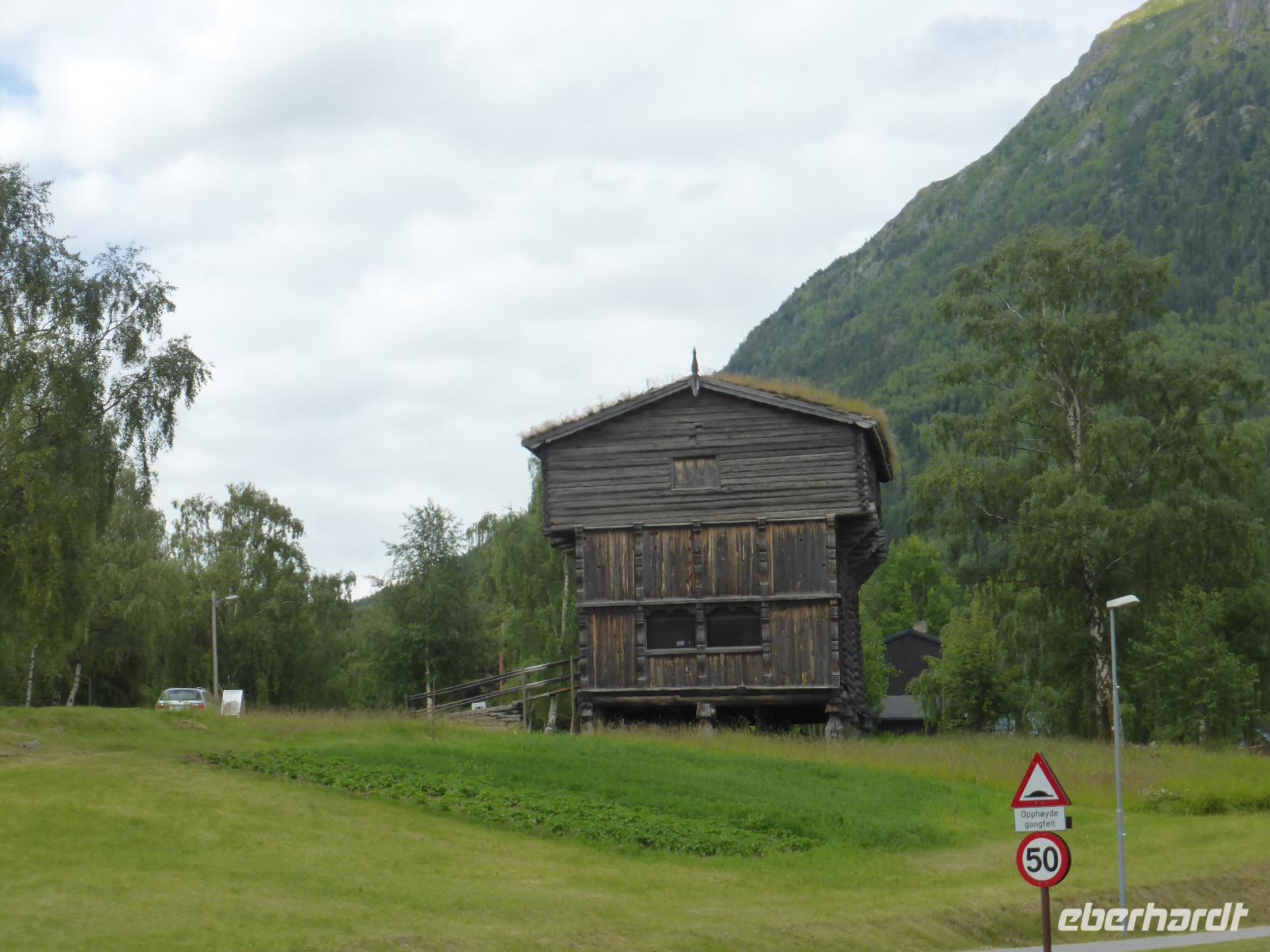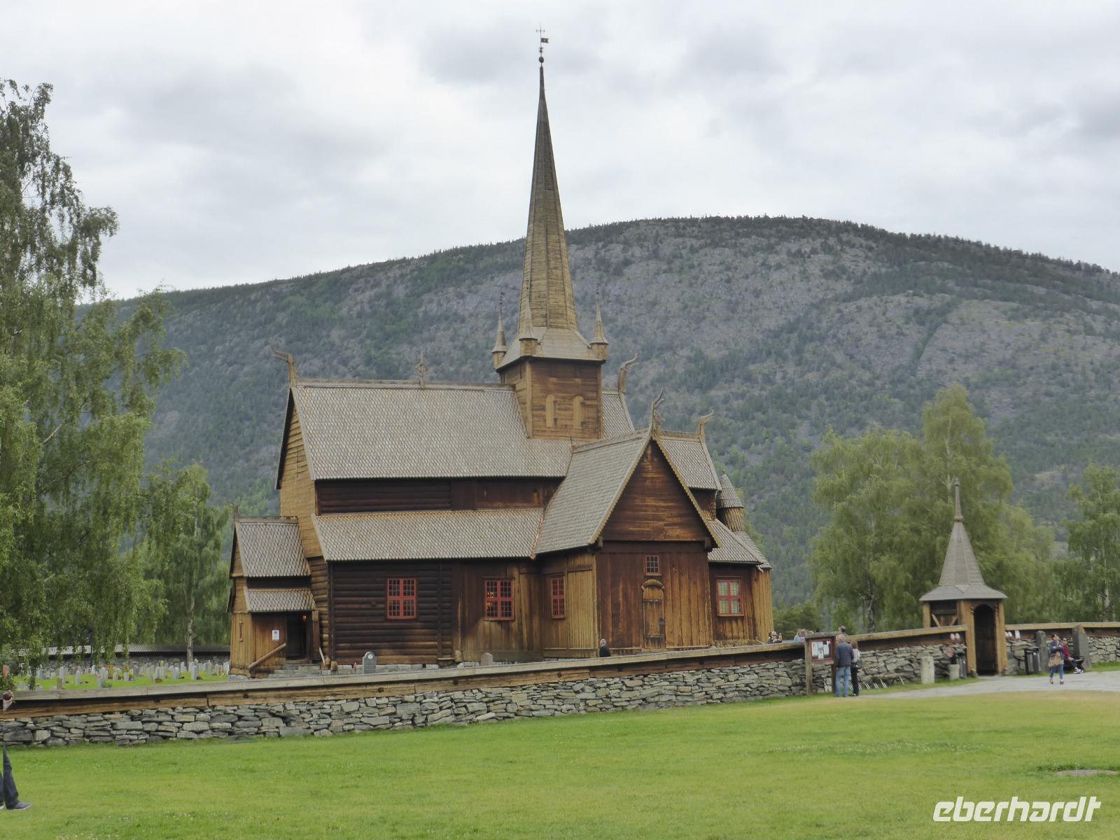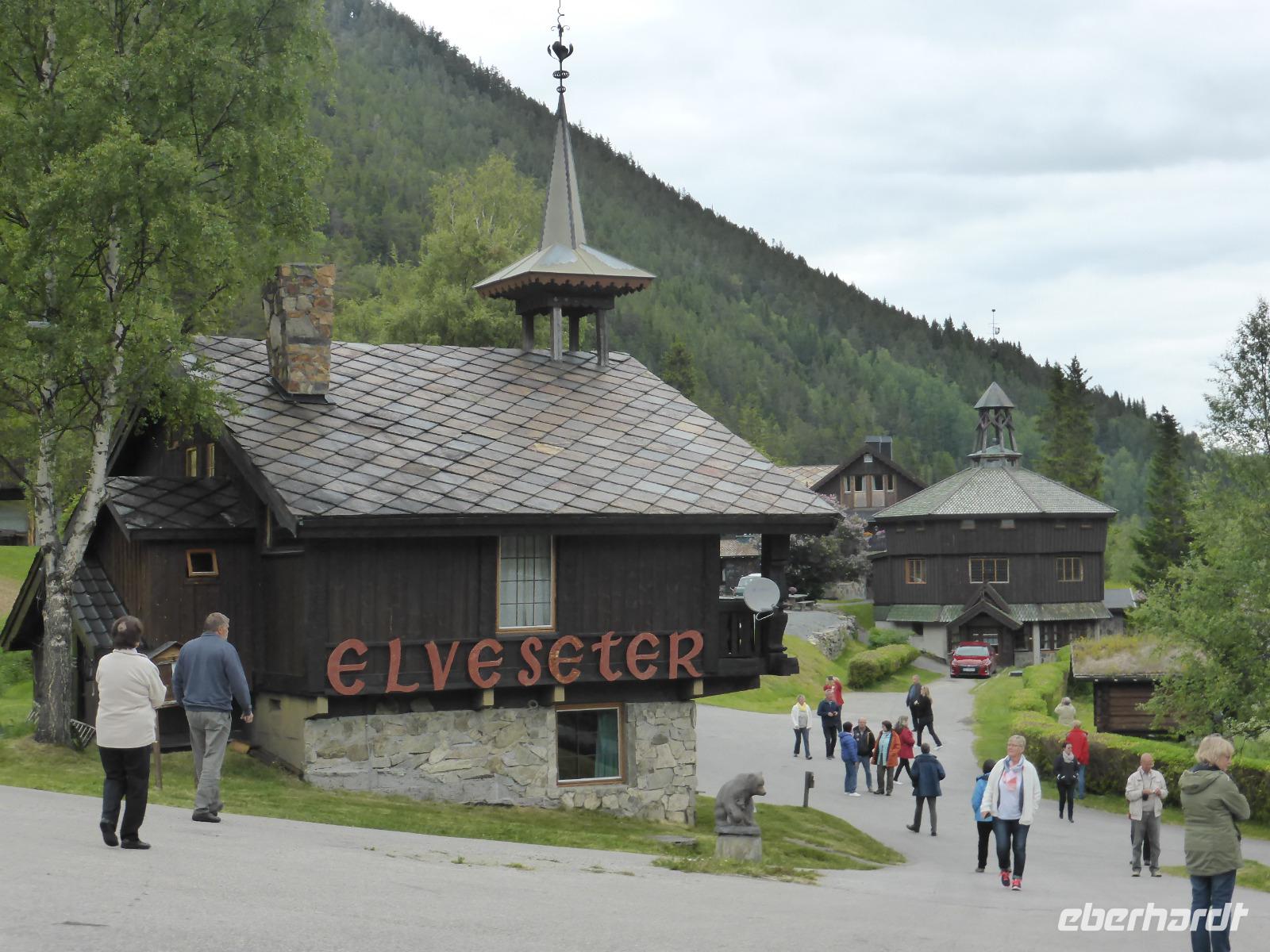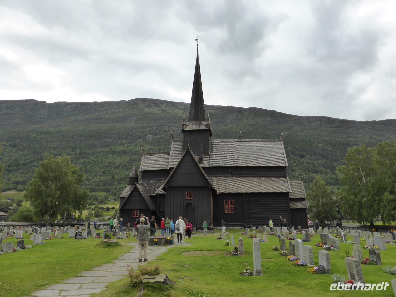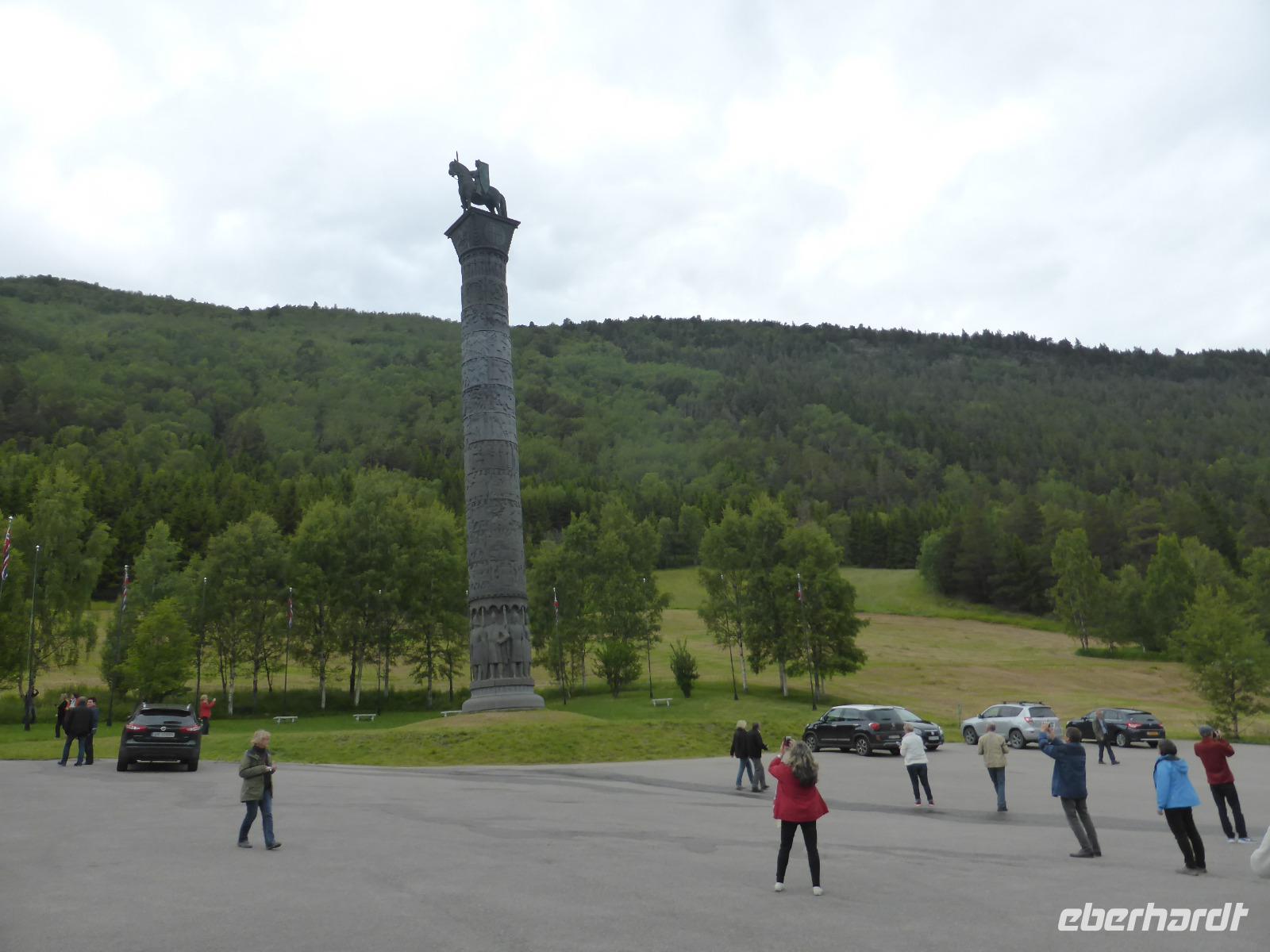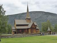 Beim Blick aus dem Fenster lockten die umliegenden Berge. Zunächst fuhren wir auf dem unbefestigten Steinweg zurück zur Asphaltstraße und von dort zum Elveseter Hotel. Kurz davor sahen wir unseren ersten Elch! Er blieb eine Weile auf der Lichtung stehen, so dass wir in in aller Ruhe fotografieren konnten. Anschließend hielten wir am Elveseter Hotel, direkt neben der ca. 30 Meter hohen Saga-Granitsäule. Auf ihr ist die Geschichte Norwegens von der Reichsbildung im Jahre 872 bis zur Reichsversammlung im Jahre 1814 dargestellt. Entlang des Bøverdalen ging es nach Lom. Hier steht eine der am besten erhaltenen Stabkirchen Norwegens, welche wir bei einer sehr interessanten Führung mit Lars kennenlernen durften. Sie ist ca. 800 Jahre alt und beheimatet die größte Gemäldesammlung aller norwegischen Kirchen. Anschließend hatten wir in Lom Freizeit und fuhren danach durch das Otta-Tal in Richtung Geiranger. Unterwegs sahen wir einen weiteren Elch! Auch dieses Mal hatten wir genug Zeit, ihn zu fotografieren. An den Dønfoss-Stromschnellen hielten wir ein letztes Mal im Otta-Tal, um uns den traumhaft schönen Campingplatz mit großem Außenpool am Otta-Fluss anzusehen.