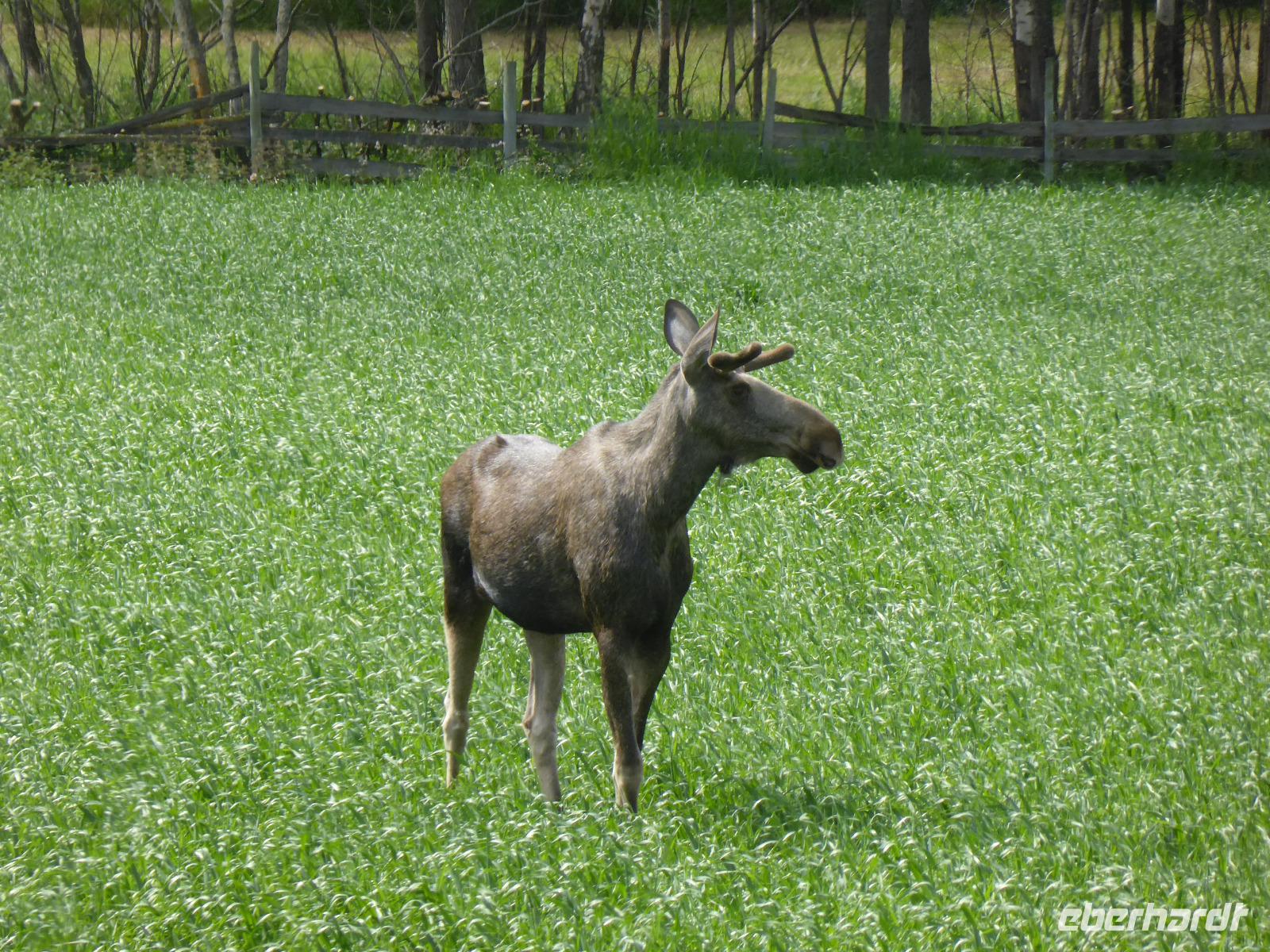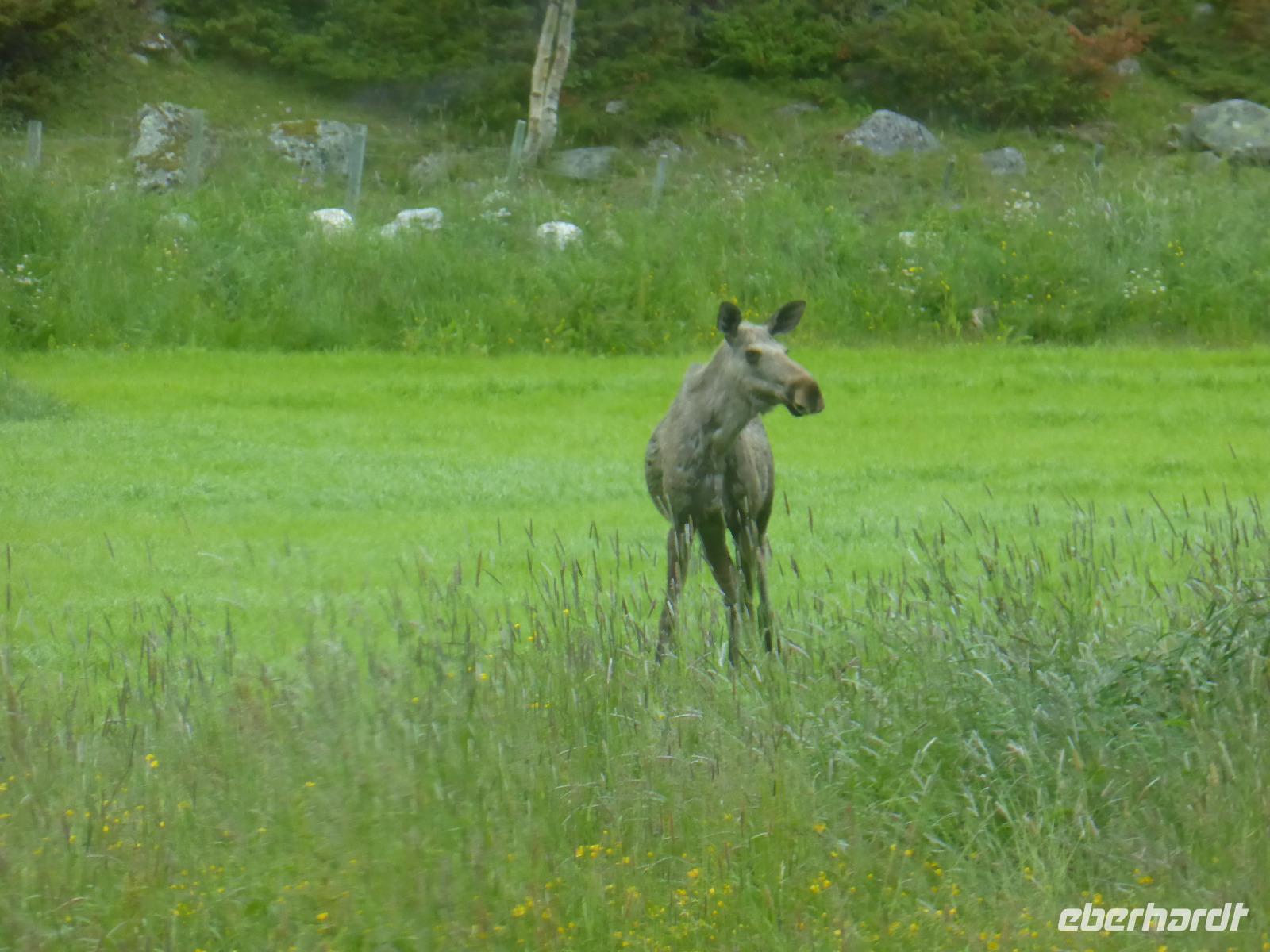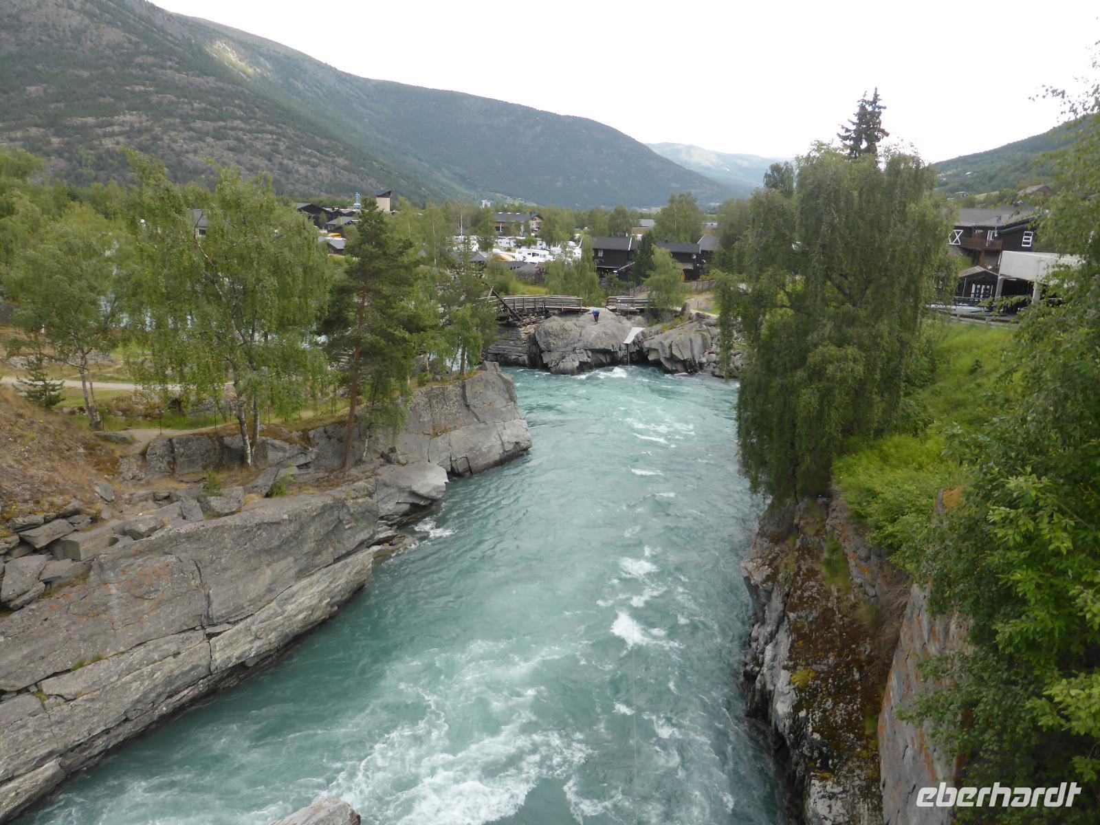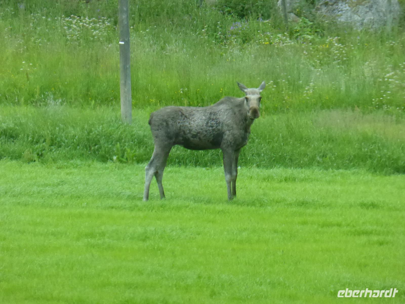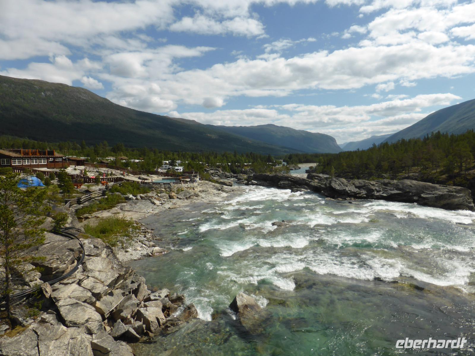 Beim Blick aus dem Fenster lockten die umliegenden Berge. Zunächst fuhren wir auf dem unbefestigten Steinweg zurück zur Asphaltstraße und von dort zum Elveseter Hotel. Kurz davor sahen wir unseren ersten Elch! Er blieb eine Weile auf der Lichtung stehen, so dass wir in in aller Ruhe fotografieren konnten. Anschließend hielten wir am Elveseter Hotel, direkt neben der ca. 30 Meter hohen Saga-Granitsäule. Auf ihr ist die Geschichte Norwegens von der Reichsbildung im Jahre 872 bis zur Reichsversammlung im Jahre 1814 dargestellt. Entlang des Bøverdalen ging es nach Lom. Hier steht eine der am besten erhaltenen Stabkirchen Norwegens, welche wir bei einer sehr interessanten Führung mit Lars kennenlernen durften. Sie ist ca. 800 Jahre alt und beheimatet die größte Gemäldesammlung aller norwegischen Kirchen. Anschließend hatten wir in Lom Freizeit und fuhren danach durch das Otta-Tal in Richtung Geiranger. Unterwegs sahen wir einen weiteren Elch! Auch dieses Mal hatten wir genug Zeit, ihn zu fotografieren. An den Dønfoss-Stromschnellen hielten wir ein letztes Mal im Otta-Tal, um uns den traumhaft schönen Campingplatz mit großem Außenpool am Otta-Fluss anzusehen.