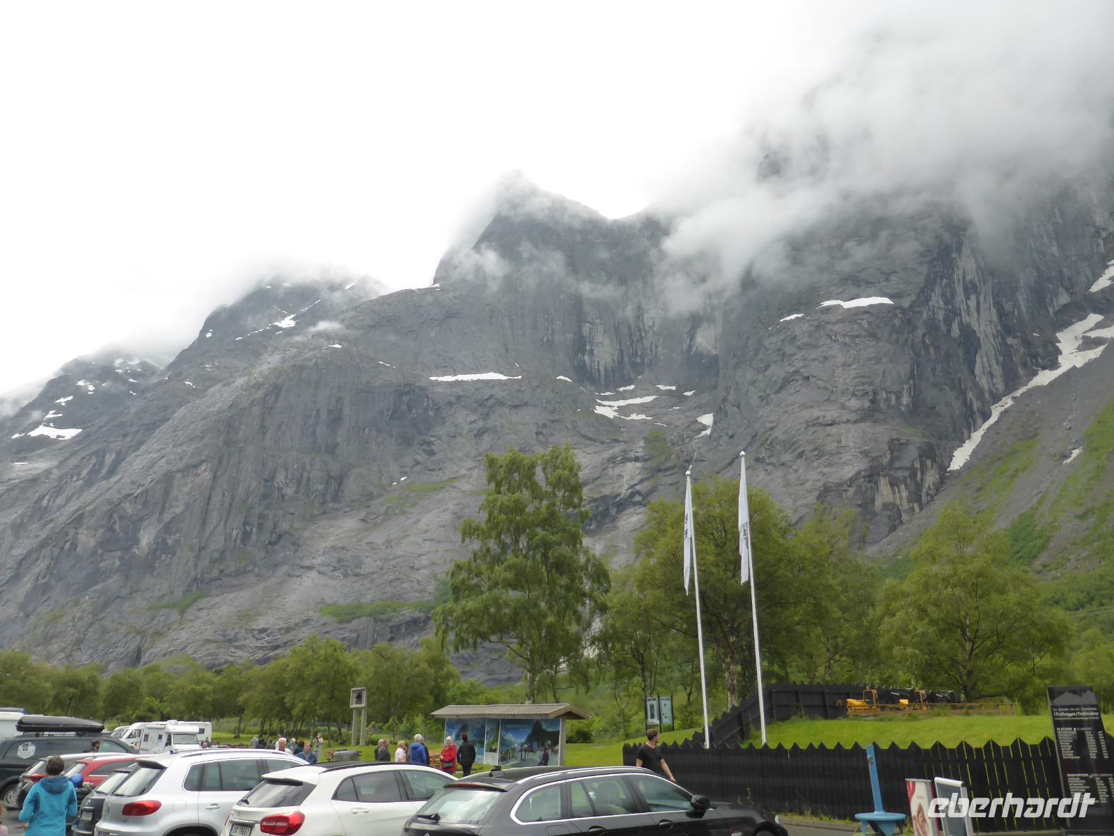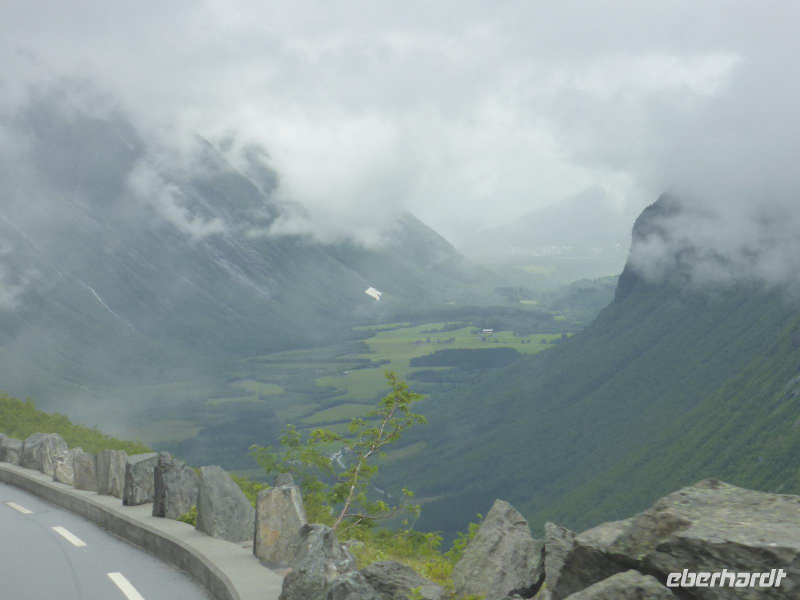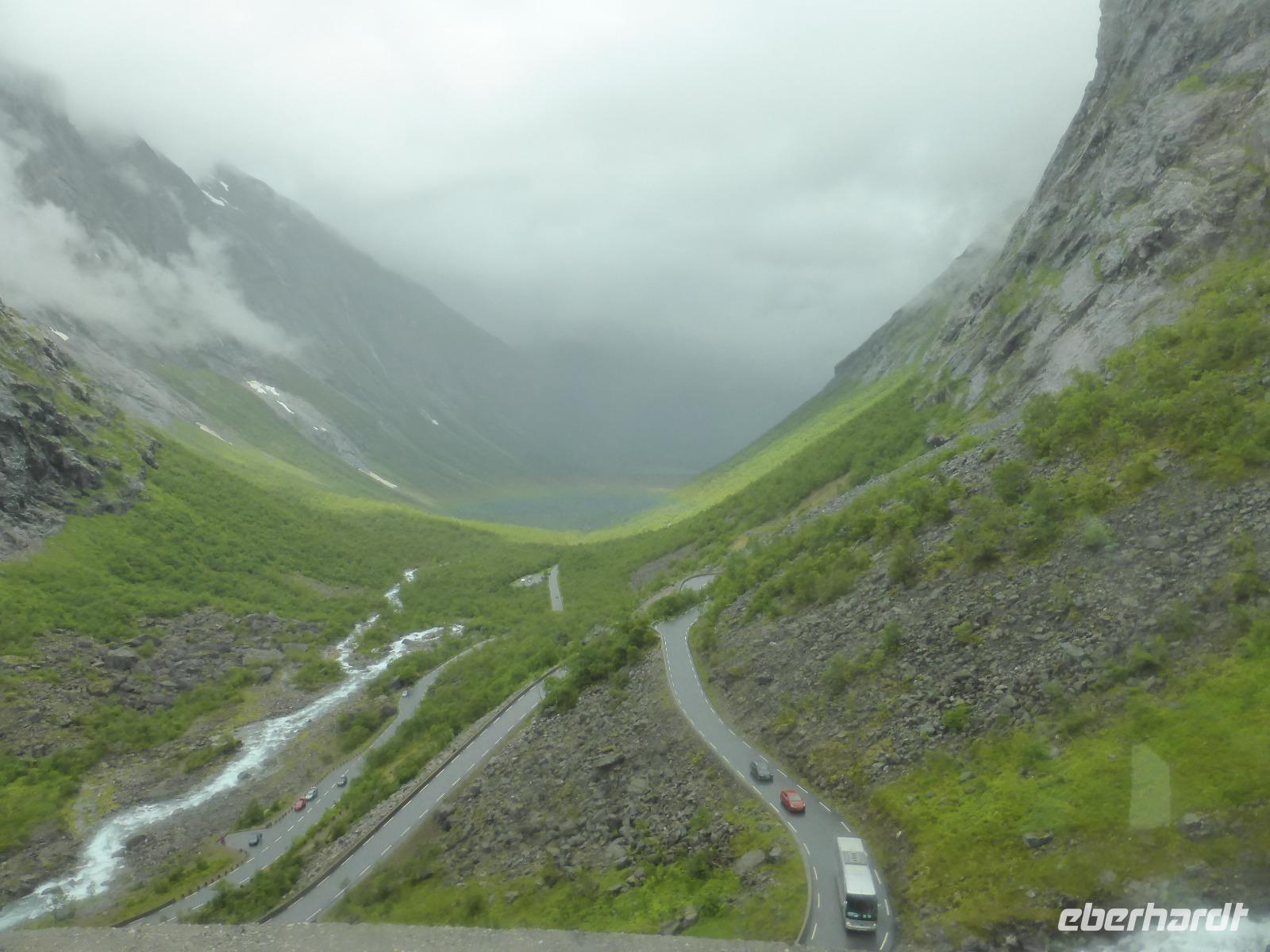 Am Morgen fuhren wir über unzählige Kehren die „Adlerstraße" hinauf bis zum Aussichtspunkt „Oernesvingen". Von da hatten wir einen tollen Blick auf den Geirangerfjord. Leider regnete es und aufziehende Nebelwolken versperrten uns die Sicht. Anschließend ging es nach Eidsdal und von dort mit der Fähre nach Linge. An den Gudbrandsjuvet-Stromschnellen legten wir unseren nächsten Halt ein und auf der Passhöhe an der Grenze der Norddal- zur Rauma-Kommune hielten wir für einen Fotostopp. Es regnete leider immer noch, als wir am Besucherzentrum des Trollstiegen ankamen. Die Sicht war sehr schlecht und erst kurz vor unserer Abfahrt riss die Wolkendecke ein wenig auf.