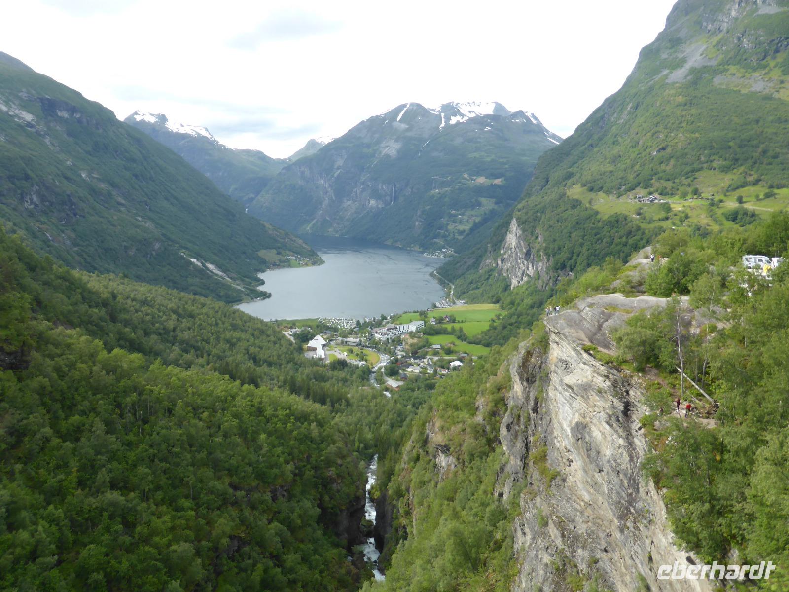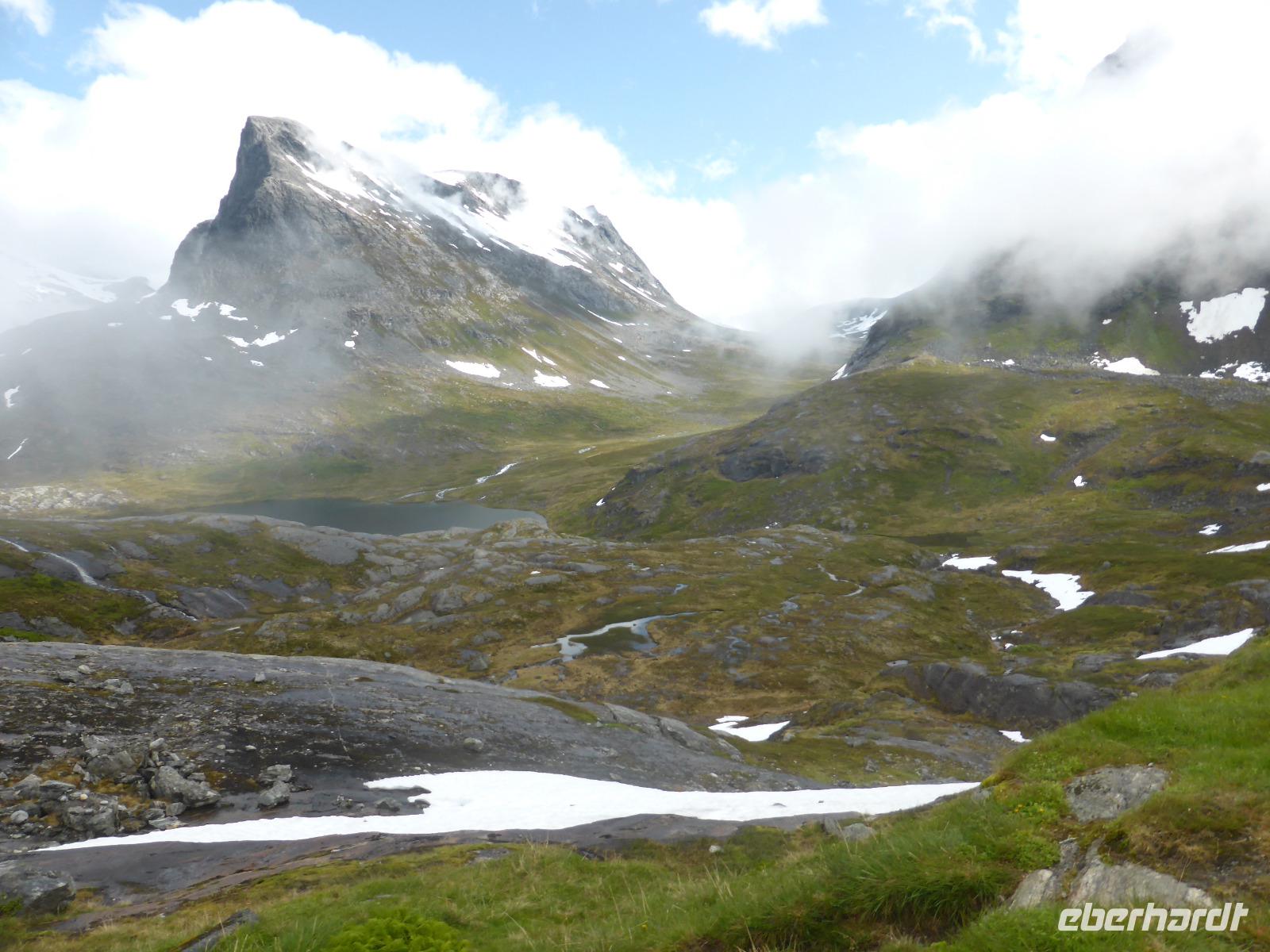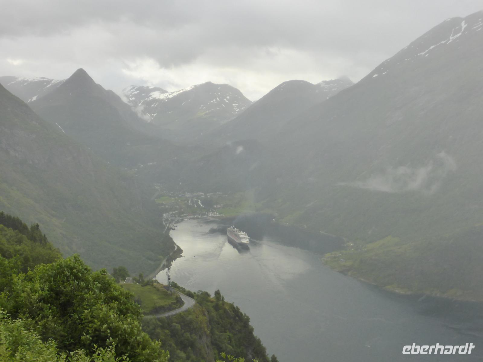 Am Morgen fuhren wir über unzählige Kehren die „Adlerstraße" hinauf bis zum Aussichtspunkt „Oernesvingen". Von da hatten wir einen tollen Blick auf den Geirangerfjord. Leider regnete es und aufziehende Nebelwolken versperrten uns die Sicht. Anschließend ging es nach Eidsdal und von dort mit der Fähre nach Linge. An den Gudbrandsjuvet-Stromschnellen legten wir unseren nächsten Halt ein und auf der Passhöhe an der Grenze der Norddal- zur Rauma-Kommune hielten wir für einen Fotostopp. Es regnete leider immer noch, als wir am Besucherzentrum des Trollstiegen ankamen. Die Sicht war sehr schlecht und erst kurz vor unserer Abfahrt riss die Wolkendecke ein wenig auf.