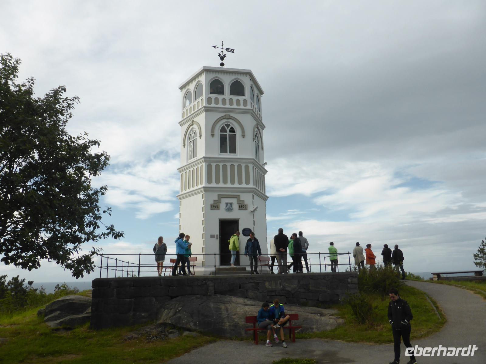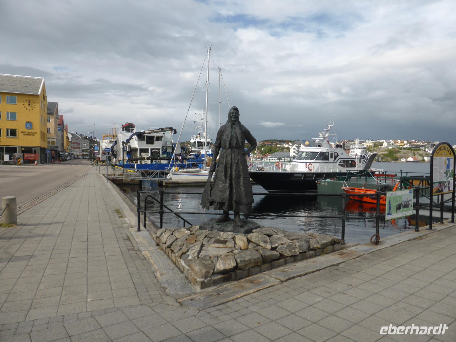Nach der Pause fuhren wir die Serpentinen hinunter und hielten noch einmal unterhalb des Trollstiegen für einen Fotostopp. Unsere Mittagspause legten wir an der fast 1000 m hohen Trollwand ein. Ab und zu konnten wir die Bergspitzen sehen. Über Åndalsnes am Romsdalsfjorden ging es anschließend zum Fähranleger in Afarnes. Von da setzten wir nach Soelsnes über und machten unsere Kaffeepause an der Gjemnesundbrücke. Gegen 17.20 Uhr kamen wir in Kristiansund an. Wir hielten mit dem Bus am Hafen und gingen zur Bronzestatue der „Klippfischfrau". Der Verkauf von Klippfisch und Heringen war über zwei Jahrhunderte der wichtigste Erwerbszweig in Kristiansund, weshalb der „Klippfischfrau" und dem „Heringsjungen" Denkmäler gesetzt wurden. Bevor wir mit dem Bus zum Hotel fuhren, hielten wir unterhalb des Aussichtsturmes Varden. Die meisten von uns spazierten das kleine Stück mit hinauf, um vom Turm den Blick auf die schöne Lage der Stadt zu genießen.