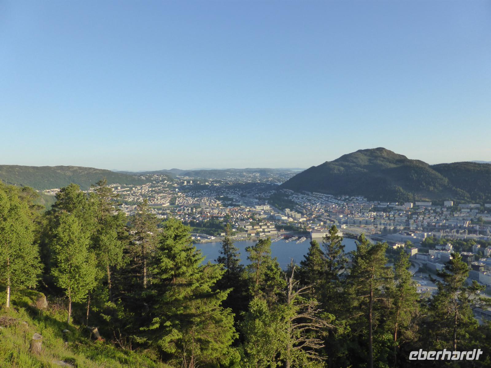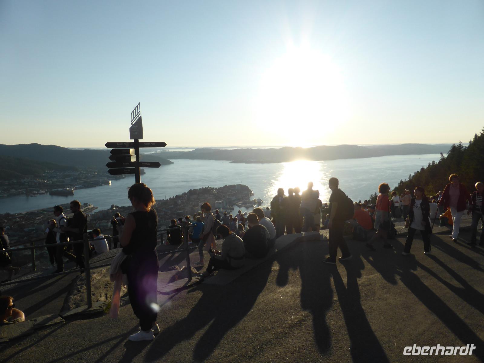 Am frühen Morgen fuhren wir zum Fähranleger der Hurtigrute. Das Wetter war fantastisch! Beeindruckend für uns zu sehen, wie das Hurtigrutenschiff, die M/S Nordnorge, anlegte und sich die Ladeklappen, wie von Geisterhand gesteuert, öffneten. Floroe ist die letzte Station vor Bergen. Diese Etappe dauert sechs Stunden und ist ein einzigartiges Erlebnis. Auf dem Schiff waren die Gäste noch beim Frühstücken, so dass die Stühle auf dem Sonnendeck alle frei waren. Es war eine ruhige und angenehme Panoramafahrt. Nach unserer Ankunft in Bergen wurden wir von unserem örtlichen Stadtführer Werner begrüßt und die Stadtrundfahrt konnte beginnen. Wir hielten am Stadtteil „Bryggen", dem Stadtteil, in dem sich die Kaufmanns- und Lagerhäuser ehemals deutscher Kaufleute befanden. Dort stiegen wir auch aus. Bei einem Spaziergang durch die Hinterhöfe erfuhren wir viel über das Leben der deutschen Kaufleute und sahen, wie ihre Quartiere heute als Souvenir- und Kunstgewerbe-Läden genutzt werden. Nach unserer Stadtbesichtigung war Freizeit und wer wollte, der konnte den Bergener (Fisch)markt besuchen. Es gab alles, sogar Walfleisch. Nach dem Abendessen trafen wir uns wieder, um gemeinsam mit der Standseilbahn auf den Aussichtsberg Floeyen zu fahren. Bei diesem tollen Wetter war die Auffahrt ein unbedingtes Muss! Viele von uns blieben lange auf den Treppen der Aussichtsterrasse sitzen, um die tiefstehende Sonne so lange wie möglich zu genießen.