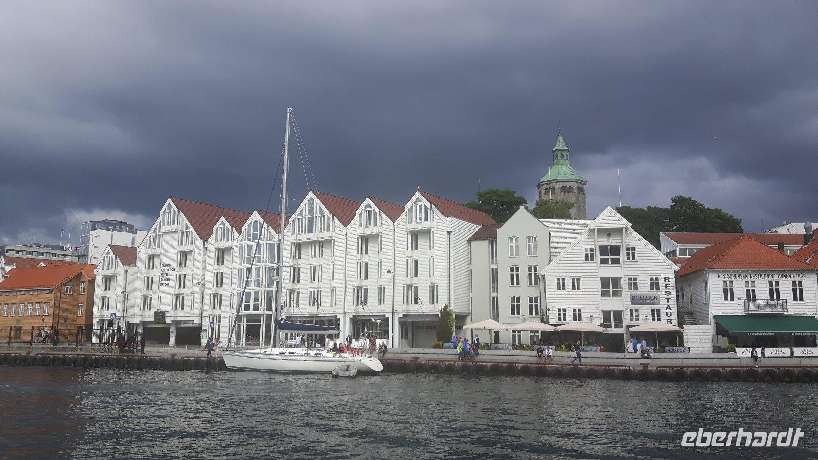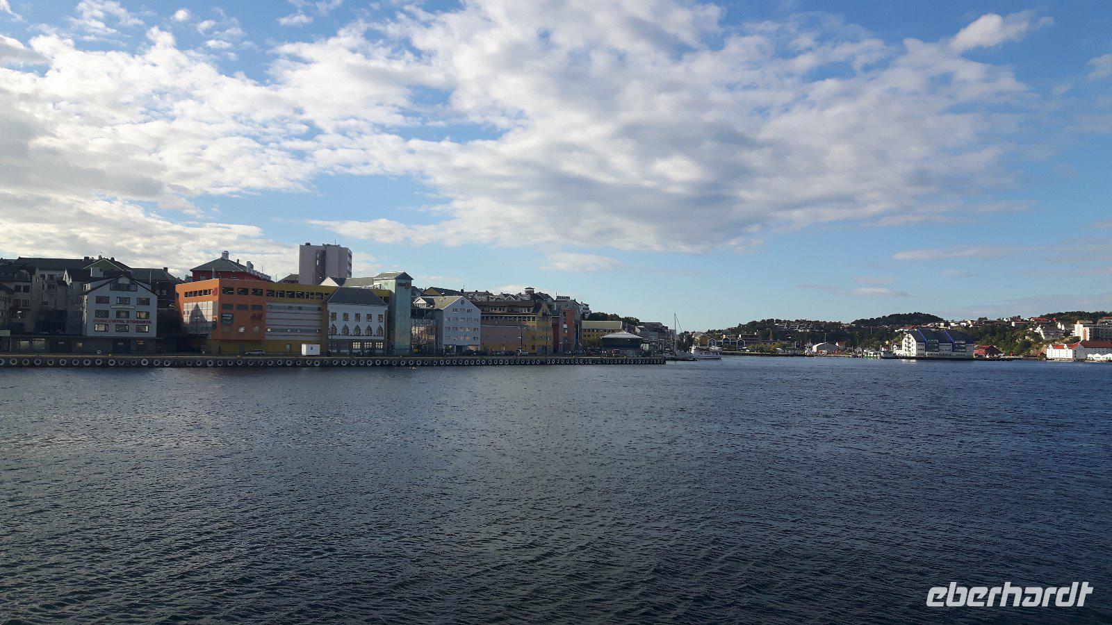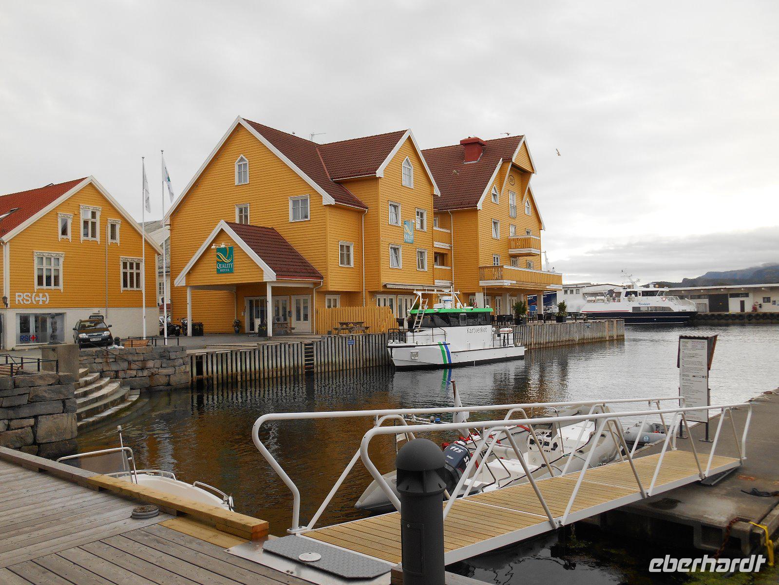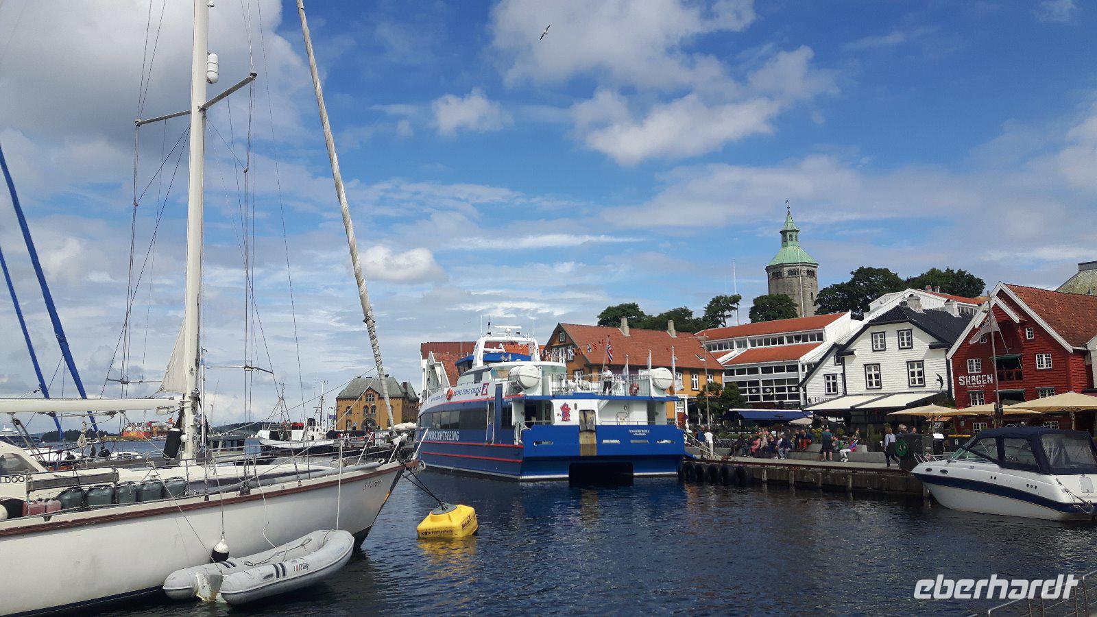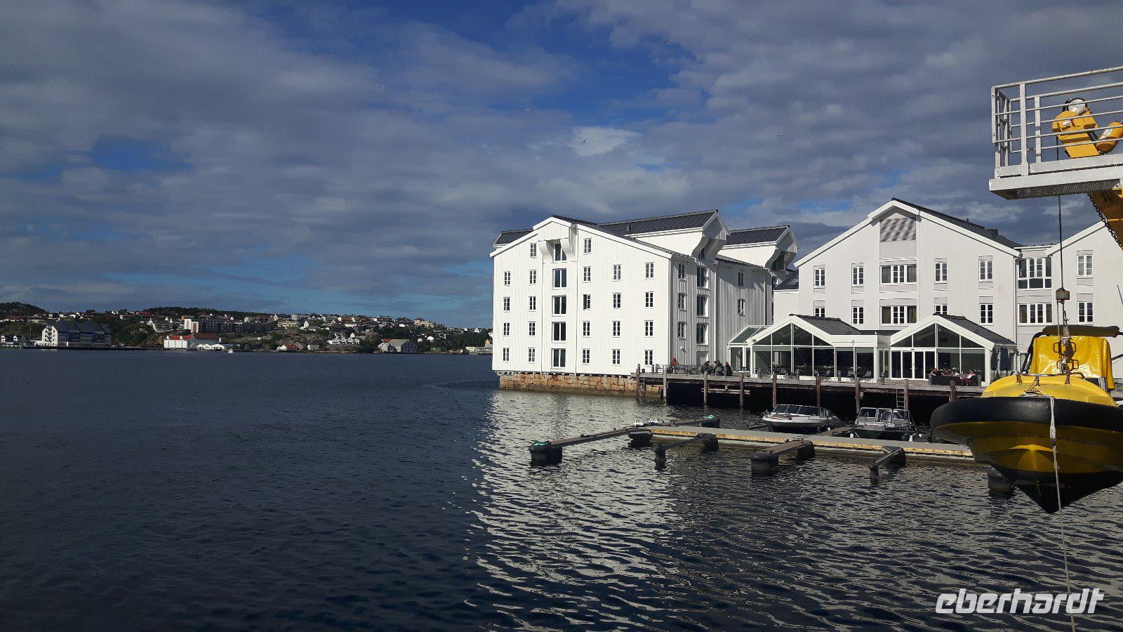 Gegen 8 Uhr brachen wir auf, um dem Ort Flekkefjord einen Besuch abzustatten. Bei unserer Ankunft wurden wir jedoch mit Starkregen überrascht und somit warteten wir geduldig im Bus, bis der Regen nachgelassen hatte. Und siehe da, die Sonne setzte sich sogar durch und einem gemeinsamen Spaziergang durch das schöne kleine Städtchen stand nichts mehr im Wege. Der Ort war im 19. Jahrhundert ein wichtiger Holzexporteur in die Niederlande, woran das Altstadtviertel "Hollenderbyen" - die "Stadt der Holländer" - mit schmalen Gassen, malerischen Bootsschuppen und eben auch im "holländischen" Stil erbauten Holzhäusern bis heute erinnert. Wir schlenderten durch dieses imposante Viertel - ein einzigartiges Architektur-Ensemble aus vergangenen Jahrhunderten! Anschließend fuhren wir in Richtung Stavanger weiter, wo wir gegen Mittag ankamen und sogleich zum Stadthafen Vågen spazierten. Wir unternahmen eine ca. 3-stündige Katamaran-Fahrt durch die Fjorde rund um Stavanger. Höhepunkt war natürlich der grandiose Lysefjord mit der berühmten Felskanzel "Preikestolen", die sich 604 Meter über dem Fjord erhebt. Uns wurde erklärt, dass der Anstieg zum Plateau gut zwei Stunden dauert und das einen, wenn man einmal oben ist, eine geniale Aussicht erwartet - nicht umsonst zieht diese ungewöhnliche Felsebene Jahr für Jahr weit über 200.000 Besucher bzw. Wanderfreunde an! Wir begnügten uns für heute mit dem Blick von unten, denn auch das Wetter hatte mittlerweile umgeschlagen - nicht gerade ideal zum Wandern (das war übrigens auch so für uns nicht vorgesehen)! Bereits am frühen Abend checkten wir in unserem zentral gelegenen Hotel "Scandic Stavanger City" ein. Somit konnte jeder Gast vor dem Abendessen noch einen kleinen individuellen Spaziergang durch diese moderne und multikulturelle Stadt unternehmen.