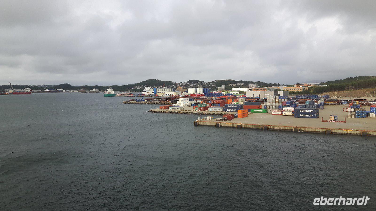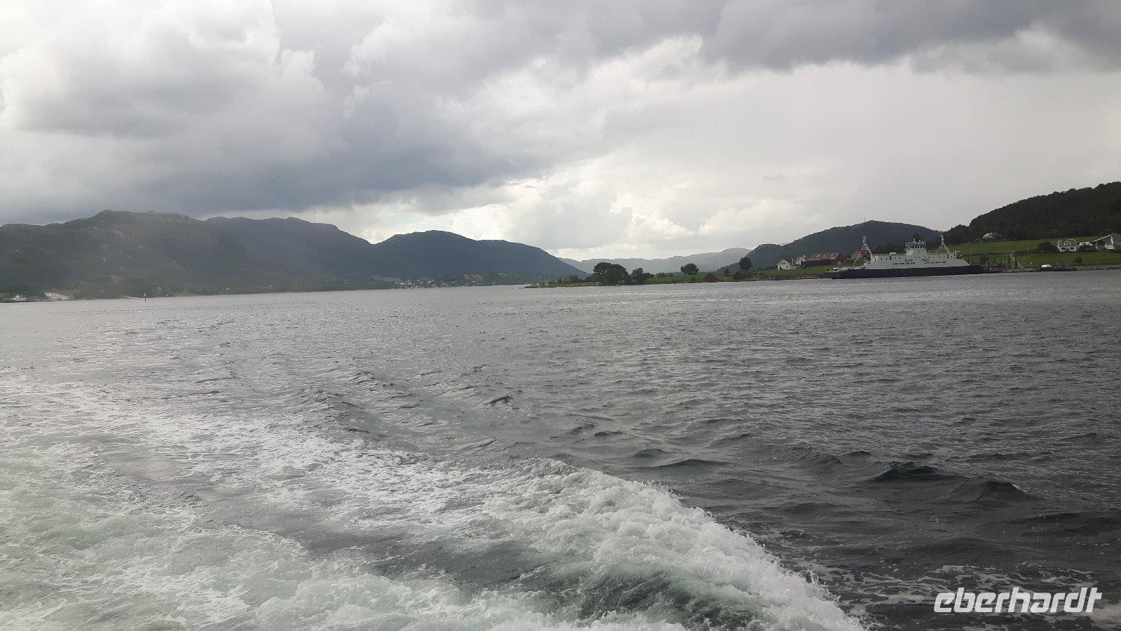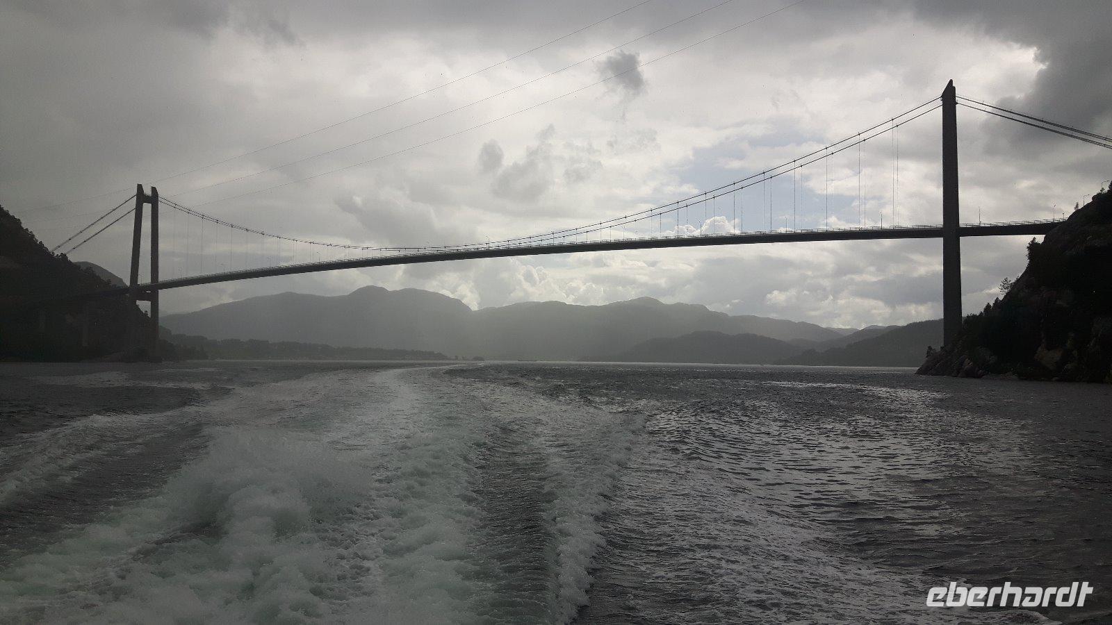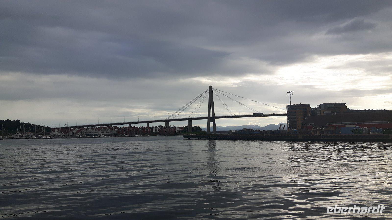 So langsam mussten wir an die Heimreise denken. Nachdem unser Gepäck im Bus verstaut war, fuhren wir immer weiter der Europastraße 39 in Richtung Stavanger folgend. Leider war Regen unser ständiger Begleiter und somit waren heute viele Fotostopps nicht gerade angebracht. Die Strecke ist wunderschön und auch heute standen nochmals drei kurze Fährüberfahrten mit dem Bus an. Ein kurzer Halt an der imposanten Stordabrücke durfte trotz allem nicht fehlen. Wir unterquerten auch nochmals mehrere Unterwassertunnel, so auch den 7,8 Kilometer langen Bømlafjordtunnel, der immerhin bis 262 Meter in die Tiefe führt. Bereits am frühen Nachmittag erreichten wir Stavanger - hier lachte sogar zeitweise die Sonne! Viele Gäste nutzten die Möglichkeit für den Einkauf letzter Mitbringsel oder bummelten nochmals einfach durch die Stadt. Ein letztes Abendessen nahmen wir im "THON Hotel Maritim" in Stavanger ein und gut gestärkt erreichten wir dann am Abend den Hafen in Tenanger. Alles klappte reibungslos und kurz nach 20 Uhr legte die MS "Bergensfjord" ab, um die nächtliche Überfahrt nach Dänemark in Angriff zu nehmen.
