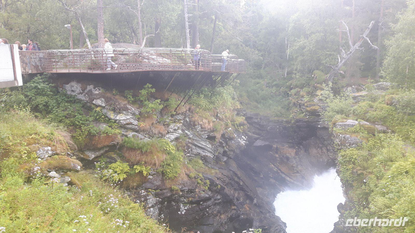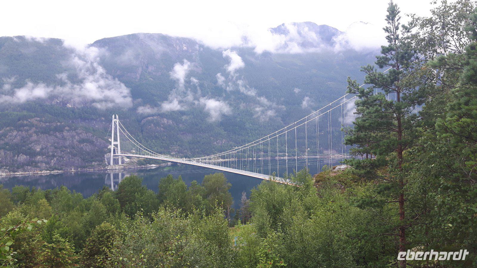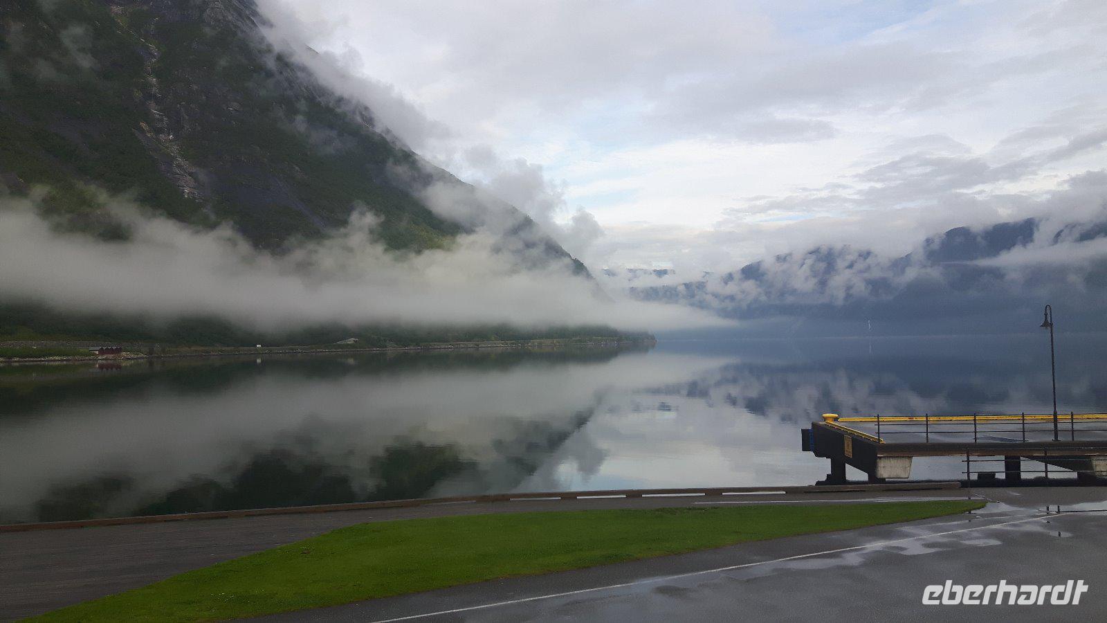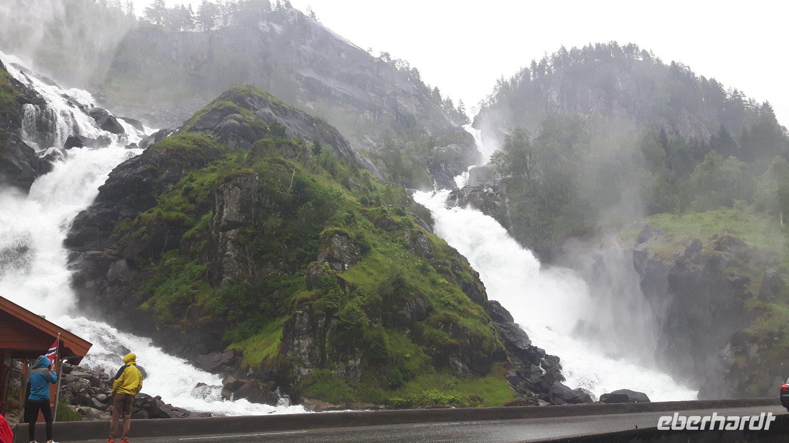 Direkt ab Stavanger stand eine ca. 40-minütige Fährüberfahrt nach Tau an und weiter dem Reichsvegen 13 folgend erreichten wir schließlich kurz darauf Hjemeland, wo wir mit einer weiteren Fähre über den Jøsenfjord nach Nesvik übersetzten. Einen ersten Fotostopp legten wir an der von unserem Buschauffeur Gerald für "hässlich" befundenen Erfjordbrücke, einer für mich durchaus sehenswerten Hängebrücke, ein...! Nun bogen wir von der Hauptstraße ab, denn wir wollten das kontrastreiche Gebiet der Norwegischen Landschaftsroute Ryfylke genauer betrachten. Über die Sandsfjordbrücke gelangten wir weiter zum spektakulären Wasserfall Svandalsfossen - hier konnten wir einige Treppen hinauf steigen und somit die grandiosen Kräfte der Natur am eigenen Körper spüren! Weiter ging es ab Sauda über kleinere bzw. auch teilweise sehr enge Straßen und schließlich trafen wir bei der Fahrt über das abwechslungsreiche Saudafjell auf kahles Hochgebirge, fruchtbare Hügel, steile Berghänge und tiefe Fjorde. Das Saudafjell hat immerhin seine ganz eigene Natur - die Landschaft ist rau und widerspenstig! Hin und wieder fragten wir uns deshalb, weshalb genau an dieser Stelle eine Straße gebaut worden ist. Letztendlich war die Industrie ausschlaggebend für den Verlauf der Straße über das Saudafjell und dies war immerhin auch der kürzeste und schnellste Weg in Richtung Osten. Der Besuch des Wasserfalls Låtefossen rundete die Fahrt auf der Ryfylke-Landschaftsroute ab. Leider regnete es mittlerweile in Strömen und somit konnten wir den Låtefossen mit seiner Fallhöhe von 165 Metern nur in begrenztem Umfang genießen. Schade, denn dieser imposante Zwillings-Wasserfall teilt sich im oberen Bereich in zwei Läufe und bildet einen westlichen Abfluss der Gletscher der Hardangervidda. Entlang des Sørfjordes, einem ca. 38 Kilometer langen Seitenarm des Hardangerfjords, gelangten wir in das "Quality Hotel Vøringfoss" in Eidfjord. Die traumhafte Lage direkt am Fjord begeisterte uns sofort.