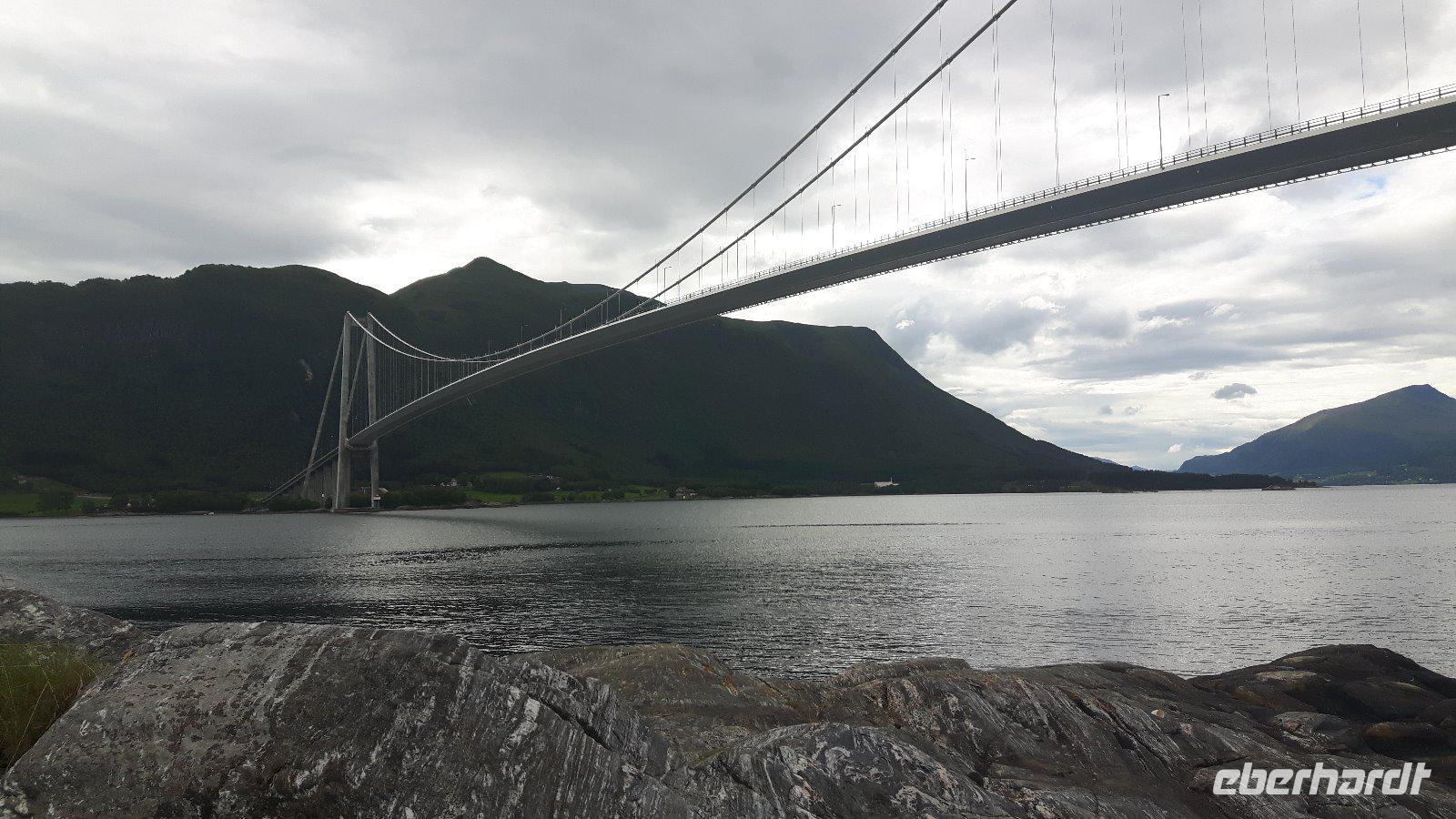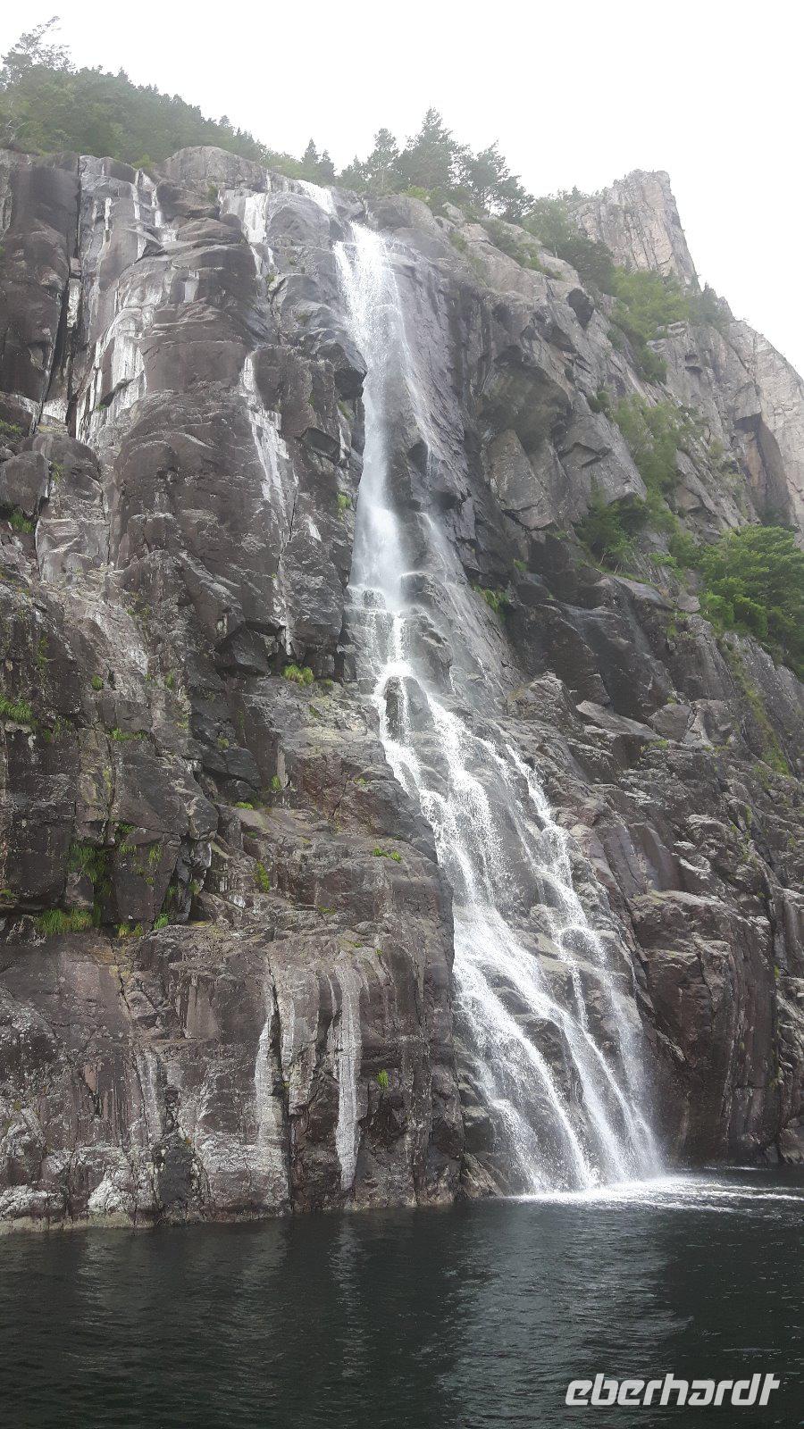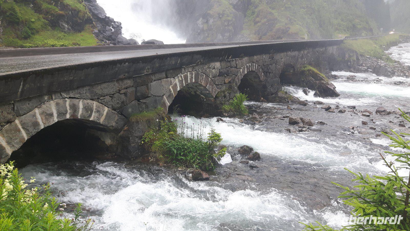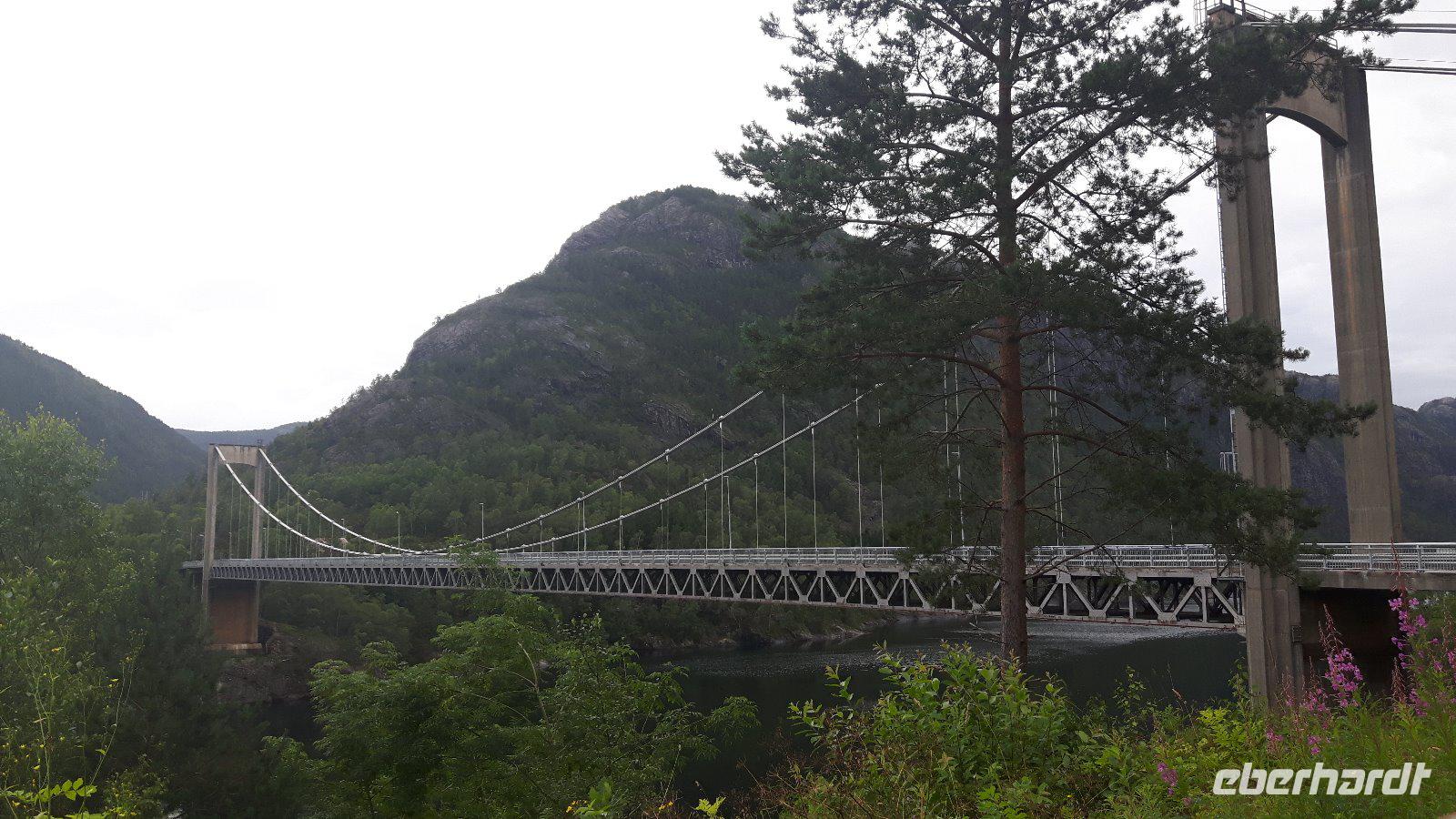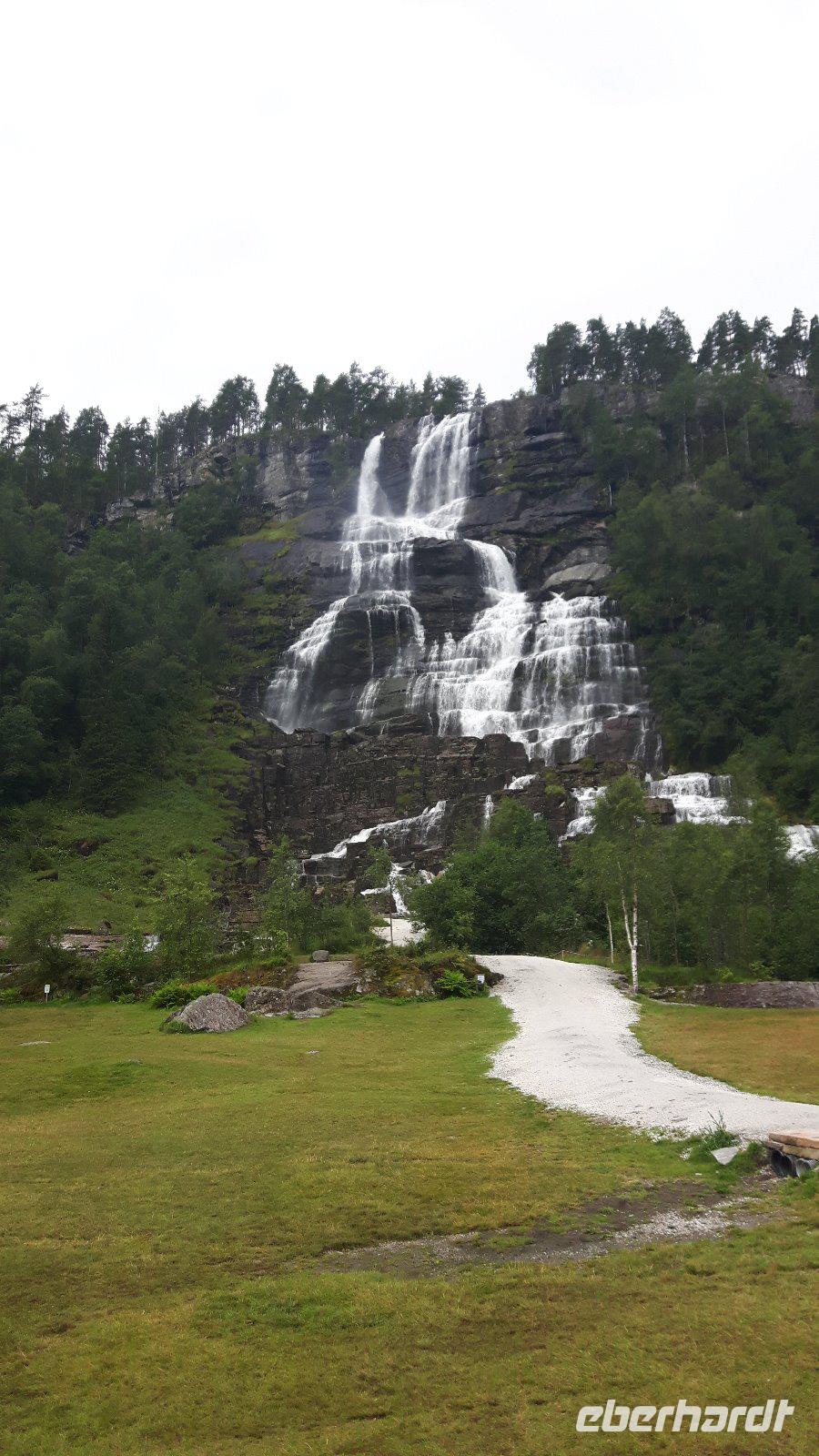 Direkt ab Stavanger stand eine ca. 40-minütige Fährüberfahrt nach Tau an und weiter dem Reichsvegen 13 folgend erreichten wir schließlich kurz darauf Hjemeland, wo wir mit einer weiteren Fähre über den Jøsenfjord nach Nesvik übersetzten. Einen ersten Fotostopp legten wir an der von unserem Buschauffeur Gerald für "hässlich" befundenen Erfjordbrücke, einer für mich durchaus sehenswerten Hängebrücke, ein...! Nun bogen wir von der Hauptstraße ab, denn wir wollten das kontrastreiche Gebiet der Norwegischen Landschaftsroute Ryfylke genauer betrachten. Über die Sandsfjordbrücke gelangten wir weiter zum spektakulären Wasserfall Svandalsfossen - hier konnten wir einige Treppen hinauf steigen und somit die grandiosen Kräfte der Natur am eigenen Körper spüren! Weiter ging es ab Sauda über kleinere bzw. auch teilweise sehr enge Straßen und schließlich trafen wir bei der Fahrt über das abwechslungsreiche Saudafjell auf kahles Hochgebirge, fruchtbare Hügel, steile Berghänge und tiefe Fjorde. Das Saudafjell hat immerhin seine ganz eigene Natur - die Landschaft ist rau und widerspenstig! Hin und wieder fragten wir uns deshalb, weshalb genau an dieser Stelle eine Straße gebaut worden ist. Letztendlich war die Industrie ausschlaggebend für den Verlauf der Straße über das Saudafjell und dies war immerhin auch der kürzeste und schnellste Weg in Richtung Osten. Der Besuch des Wasserfalls Låtefossen rundete die Fahrt auf der Ryfylke-Landschaftsroute ab. Leider regnete es mittlerweile in Strömen und somit konnten wir den Låtefossen mit seiner Fallhöhe von 165 Metern nur in begrenztem Umfang genießen. Schade, denn dieser imposante Zwillings-Wasserfall teilt sich im oberen Bereich in zwei Läufe und bildet einen westlichen Abfluss der Gletscher der Hardangervidda. Entlang des Sørfjordes, einem ca. 38 Kilometer langen Seitenarm des Hardangerfjords, gelangten wir in das "Quality Hotel Vøringfoss" in Eidfjord. Die traumhafte Lage direkt am Fjord begeisterte uns sofort.