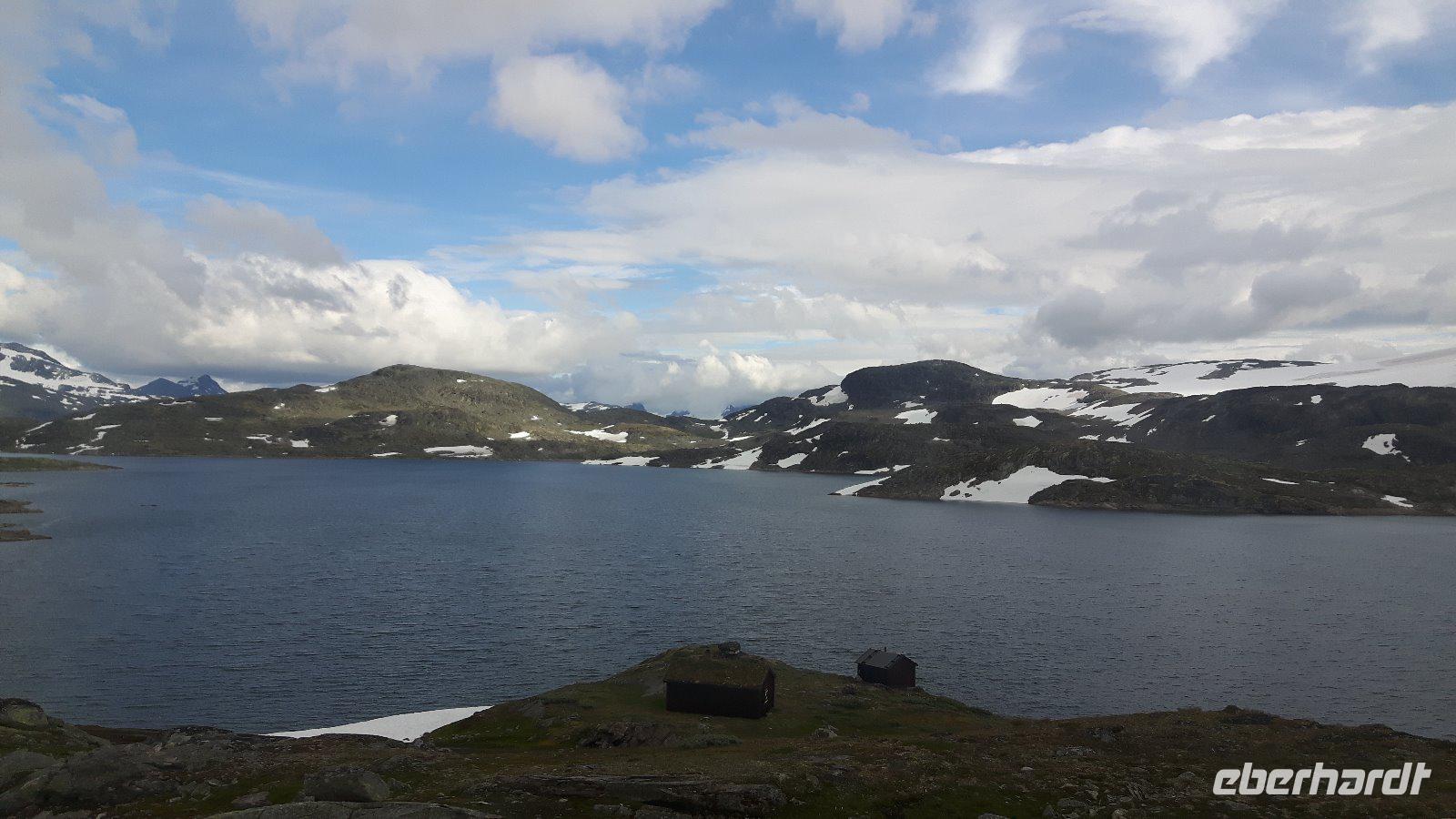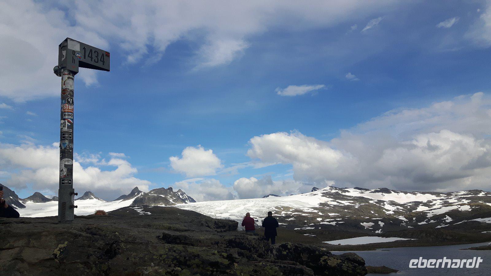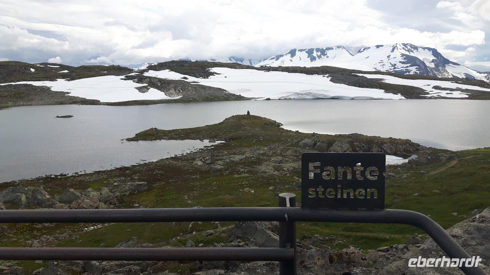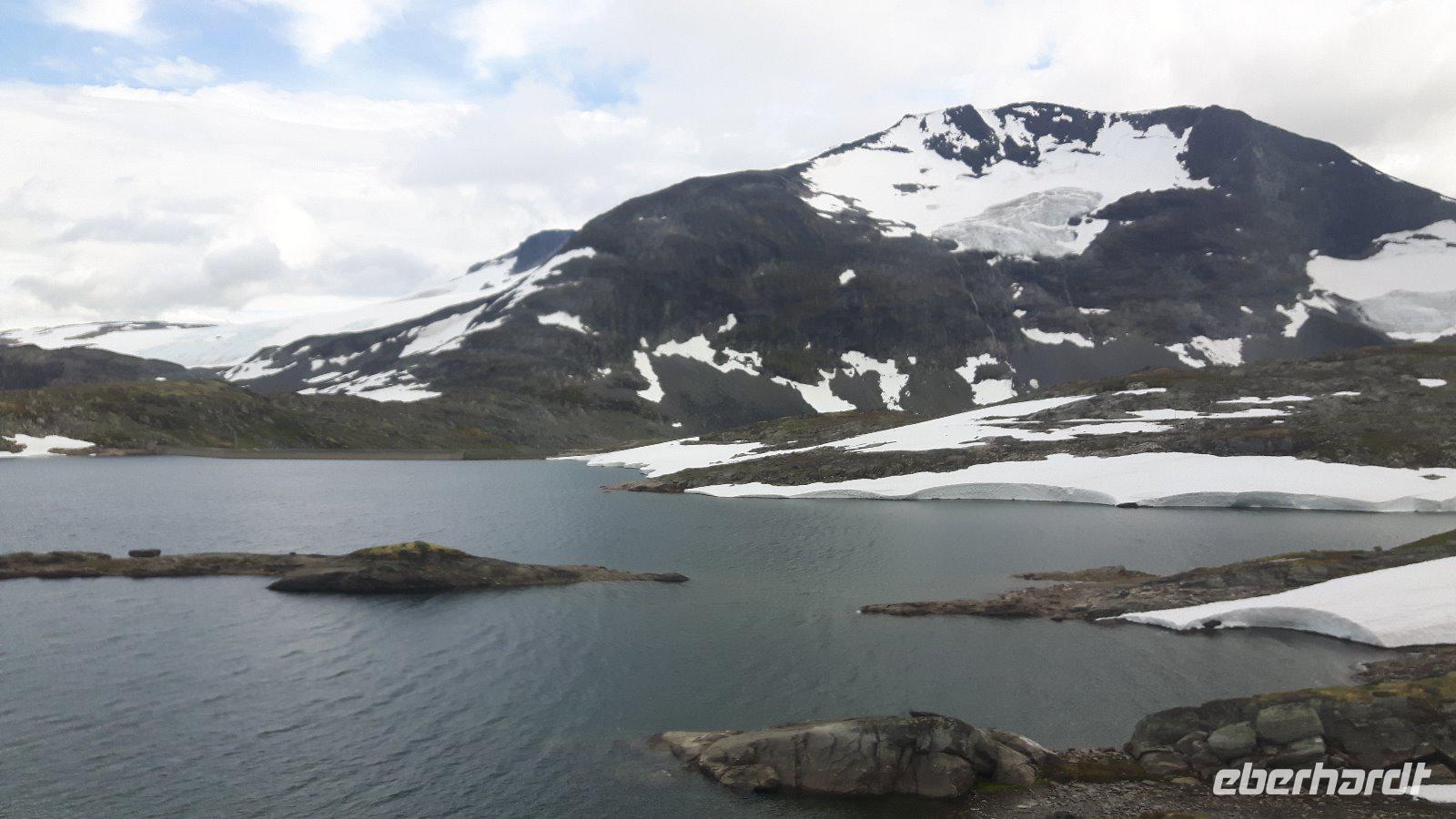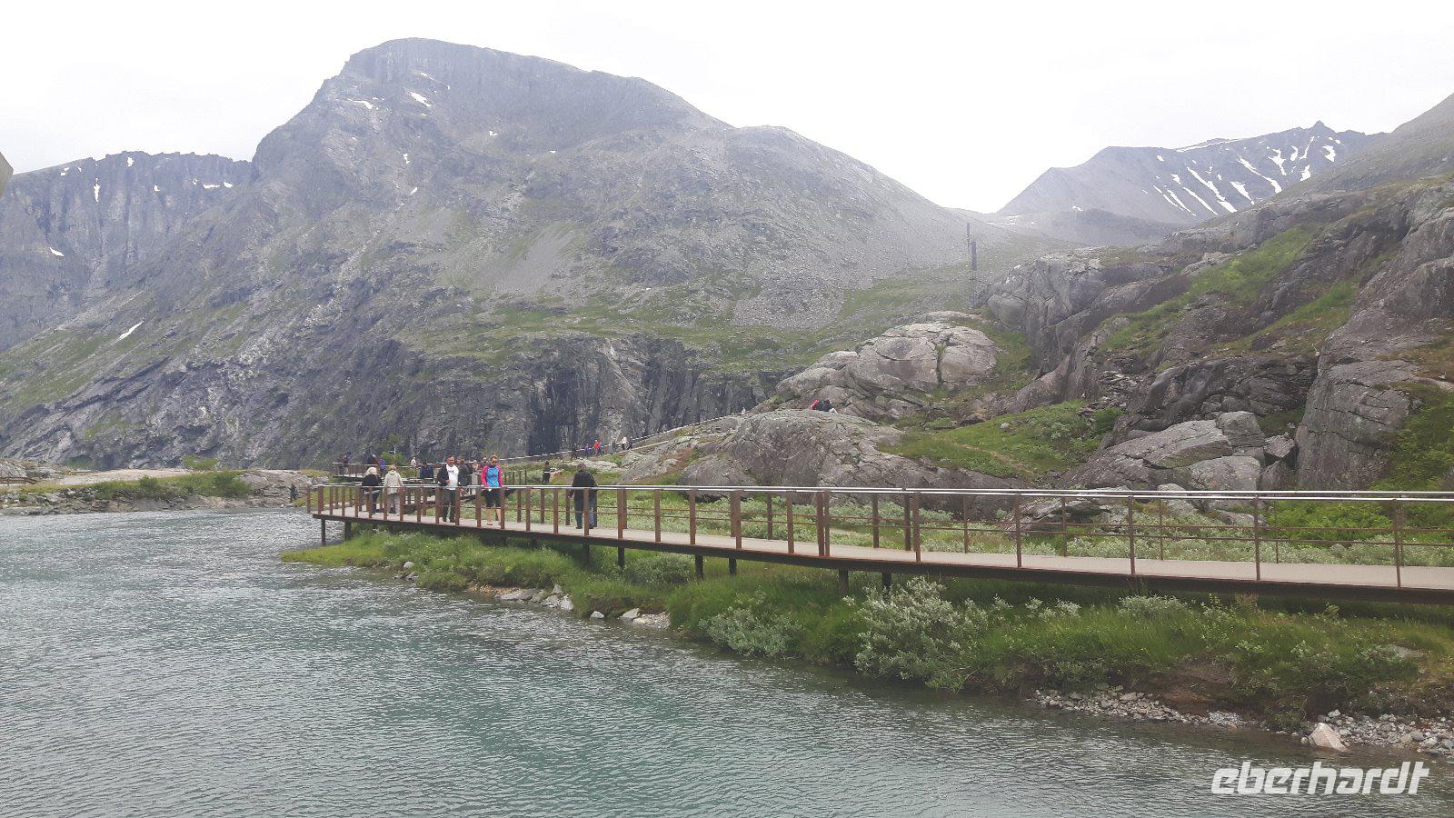 Am heutigen Tag stand zunächst ein Fotostopp an der erst im Jahre 2013 eröffneten Hardanger-Brücke auf dem Programm - diese ist mit 1.380 Metern Länge eine der weltweit längsten Hängebrücken. Über Voss erreichten wir einen meiner persönlichen "Lieblings-Wasserfälle", den Wasserfall Tvindefossen, der sich in mehreren Stufen ins Nærøytal hinunter stürzt. Weiter ging es über Gudvangen und anschließend durch den über 11 Kilometer langen Gudvangen-Tunnel nach Flåm, bekannt durch die spektakuläre Flåmbahn. Wir hatten glücklicherweise etwas Zeit und konnten uns in dem kleinen Ort umschauen oder auch das Flåmbahn-Museum besuchen. Von hier aus fuhren wir über eine der schönsten und abwechslungsreichsten Passstraßen Norwegens, dem sogenannten "Aurlandsvegen", hinüber nach Lærdal. Was uns auf dieser Straße erwarten sollte, war großartig - denn diese 46 Kilometer lange Straße ist eine der 18 Landschaftsrouten Norwegens und übrigens nur im Sommer geöffnet. Der höchste Punkt liegt immerhin bei 1.306 Meter über dem Meeresspiegel. Hier sahen wir auch mitten im Sommers noch etwas Schnee - einfach genial und überwältigend! Nicht zu Unrecht hat diese Route schließlich auch den Beinamen "Schneeweg". Wir erlebten zudem phantastische Aussichtpunkte, unter anderem das Panorama von der neuen Aussichtsplattform "Stegastein" mit einem genialen Blick auf den Aurlandsfjord! Eine kurze Fährüberfahrt über den Sognefjord und schon stand eine erneute Panorama-Fahrt bevor. Entlang der Nordseite des Lustrafjords und mit herrlichen Blicken auf den Fjord und die zahlreichen Wasserfälle ging es zunächst nach Skjolden, am inneren Ende des Sognefjords und etwa 200 Kilometer vom Meer entfernt gelegen. Wir setzten unsere eindrucksvolle Fahrt über die Sognefjellstraße, der Reichsstraße 55, fort. Der mit 1.434 Metern höchstgelegene Gebirgspass Nordeuropas ist seit 1938 für Autos befahrbar. Die Passüberquerung ist eine der ältesten Verbindungswege zwischen West und Ost, sie war die Hauptroute vom gesamten Gudbrandsdal zu den Küstensiedlungen in Sogn und bis nach Bergen. An Waren wurden hier hauptsächlich Salz, Hering und Fisch aus dem Westen und Häute, Butter, und Eisen aus dem Osten transportiert - in beiden Richtungen auf dem eigenen Rücken oder zu Pferd. Unterwegs nutzten wir die reichlichen Möglichkeiten für Fotostopps, obwohl es das Wetter heute zeitweise nicht so gut mit uns meinte. Nichts desto trotz, der nächste Höhepunkt des Tages wartete bereits... Um zu unserem heutigen Quartier zu gelangen, fuhren wir weit ins Leirdalen hinein, übrigens abseits von jeglicher Zivilisation! Aber gerade diese etwas abenteuerliche Situation machte es immer spannender. Voller Erwartungen kamen wir am Abend im Hotel "Leirvassbu Mountain Lodge" an und wir wurden nicht enttäuscht! Kein Handy-Empfang und auch kein TV - warum auch? Die Lodge liegt am Ufer des Sees Leirvatnet, einer atemberaubenden Berglandschaft auf ca. 1.400 Metern Höhe und was will man da mehr? Es war unbeschreiblich schön hier! Das ganze Anwesen ist wie eine altnorwegische Götter-Wohnstätte gestaltet, und jeder Raum trägt einen Namen aus der nordischen Mythologie.