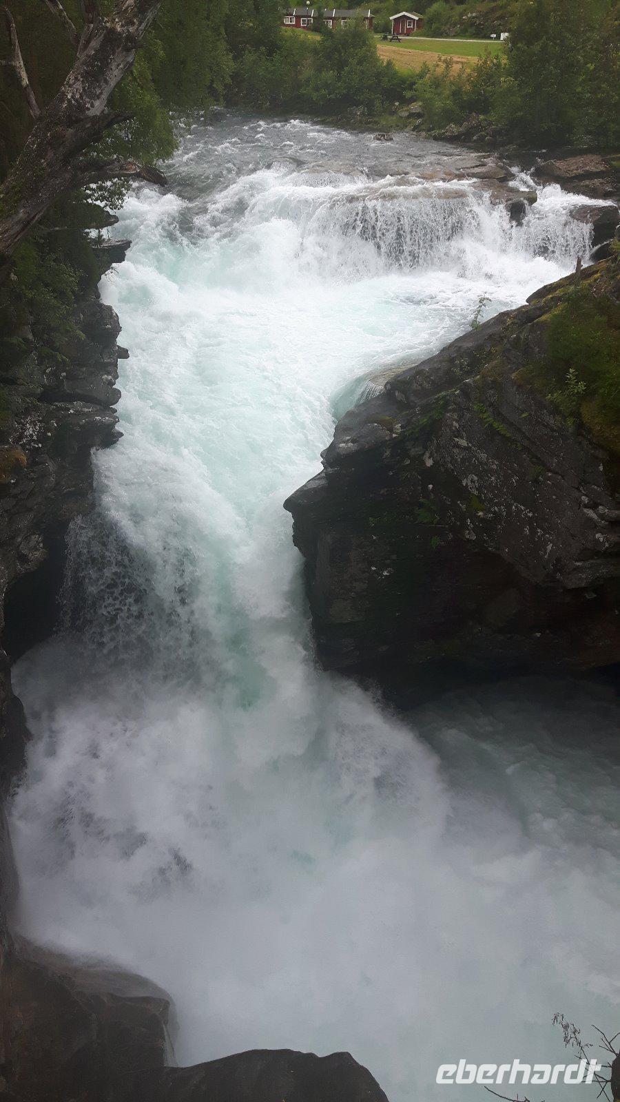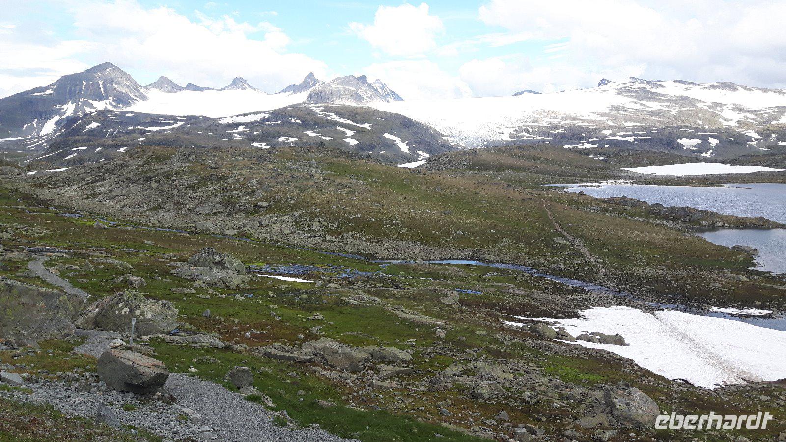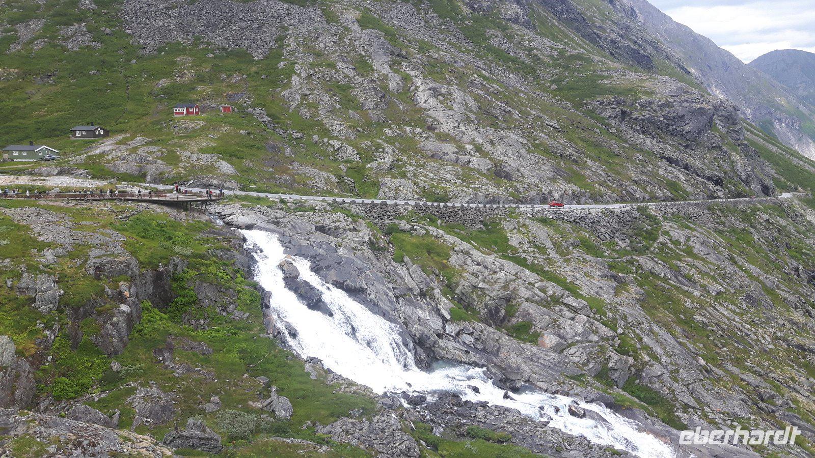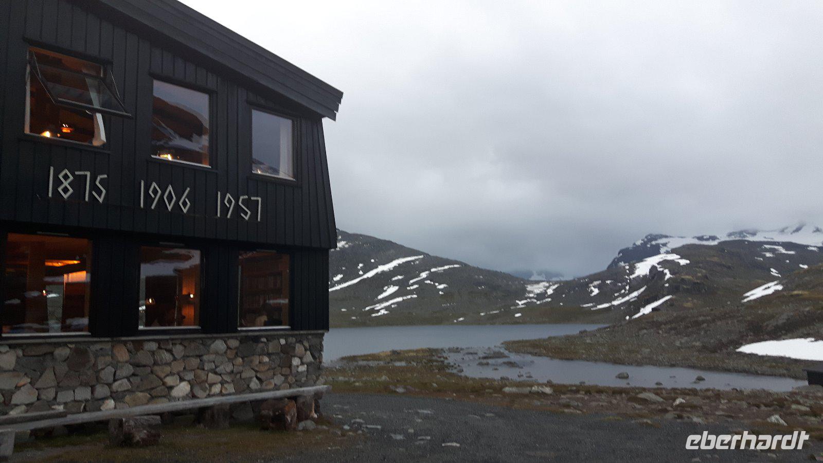 Am heutigen Tag stand zunächst ein Fotostopp an der erst im Jahre 2013 eröffneten Hardanger-Brücke auf dem Programm - diese ist mit 1.380 Metern Länge eine der weltweit längsten Hängebrücken. Über Voss erreichten wir einen meiner persönlichen "Lieblings-Wasserfälle", den Wasserfall Tvindefossen, der sich in mehreren Stufen ins Nærøytal hinunter stürzt. Weiter ging es über Gudvangen und anschließend durch den über 11 Kilometer langen Gudvangen-Tunnel nach Flåm, bekannt durch die spektakuläre Flåmbahn. Wir hatten glücklicherweise etwas Zeit und konnten uns in dem kleinen Ort umschauen oder auch das Flåmbahn-Museum besuchen. Von hier aus fuhren wir über eine der schönsten und abwechslungsreichsten Passstraßen Norwegens, dem sogenannten "Aurlandsvegen", hinüber nach Lærdal. Was uns auf dieser Straße erwarten sollte, war großartig - denn diese 46 Kilometer lange Straße ist eine der 18 Landschaftsrouten Norwegens und übrigens nur im Sommer geöffnet. Der höchste Punkt liegt immerhin bei 1.306 Meter über dem Meeresspiegel. Hier sahen wir auch mitten im Sommers noch etwas Schnee - einfach genial und überwältigend! Nicht zu Unrecht hat diese Route schließlich auch den Beinamen "Schneeweg". Wir erlebten zudem phantastische Aussichtpunkte, unter anderem das Panorama von der neuen Aussichtsplattform "Stegastein" mit einem genialen Blick auf den Aurlandsfjord! Eine kurze Fährüberfahrt über den Sognefjord und schon stand eine erneute Panorama-Fahrt bevor. Entlang der Nordseite des Lustrafjords und mit herrlichen Blicken auf den Fjord und die zahlreichen Wasserfälle ging es zunächst nach Skjolden, am inneren Ende des Sognefjords und etwa 200 Kilometer vom Meer entfernt gelegen. Wir setzten unsere eindrucksvolle Fahrt über die Sognefjellstraße, der Reichsstraße 55, fort. Der mit 1.434 Metern höchstgelegene Gebirgspass Nordeuropas ist seit 1938 für Autos befahrbar. Die Passüberquerung ist eine der ältesten Verbindungswege zwischen West und Ost, sie war die Hauptroute vom gesamten Gudbrandsdal zu den Küstensiedlungen in Sogn und bis nach Bergen. An Waren wurden hier hauptsächlich Salz, Hering und Fisch aus dem Westen und Häute, Butter, und Eisen aus dem Osten transportiert - in beiden Richtungen auf dem eigenen Rücken oder zu Pferd. Unterwegs nutzten wir die reichlichen Möglichkeiten für Fotostopps, obwohl es das Wetter heute zeitweise nicht so gut mit uns meinte. Nichts desto trotz, der nächste Höhepunkt des Tages wartete bereits... Um zu unserem heutigen Quartier zu gelangen, fuhren wir weit ins Leirdalen hinein, übrigens abseits von jeglicher Zivilisation! Aber gerade diese etwas abenteuerliche Situation machte es immer spannender. Voller Erwartungen kamen wir am Abend im Hotel "Leirvassbu Mountain Lodge" an und wir wurden nicht enttäuscht! Kein Handy-Empfang und auch kein TV - warum auch? Die Lodge liegt am Ufer des Sees Leirvatnet, einer atemberaubenden Berglandschaft auf ca. 1.400 Metern Höhe und was will man da mehr? Es war unbeschreiblich schön hier! Das ganze Anwesen ist wie eine altnorwegische Götter-Wohnstätte gestaltet, und jeder Raum trägt einen Namen aus der nordischen Mythologie.