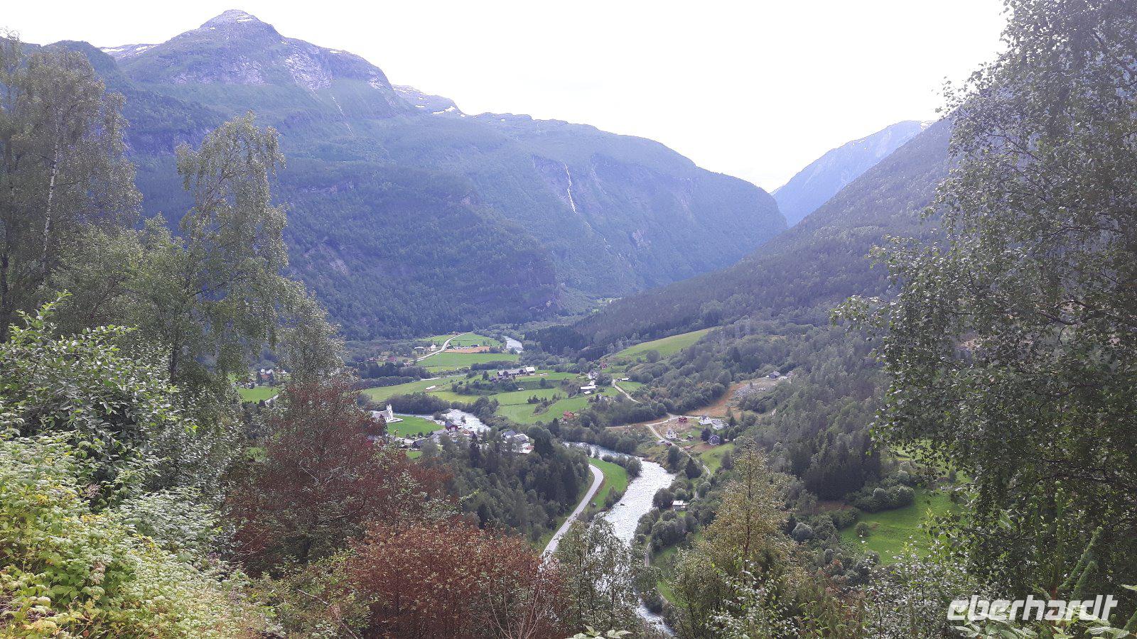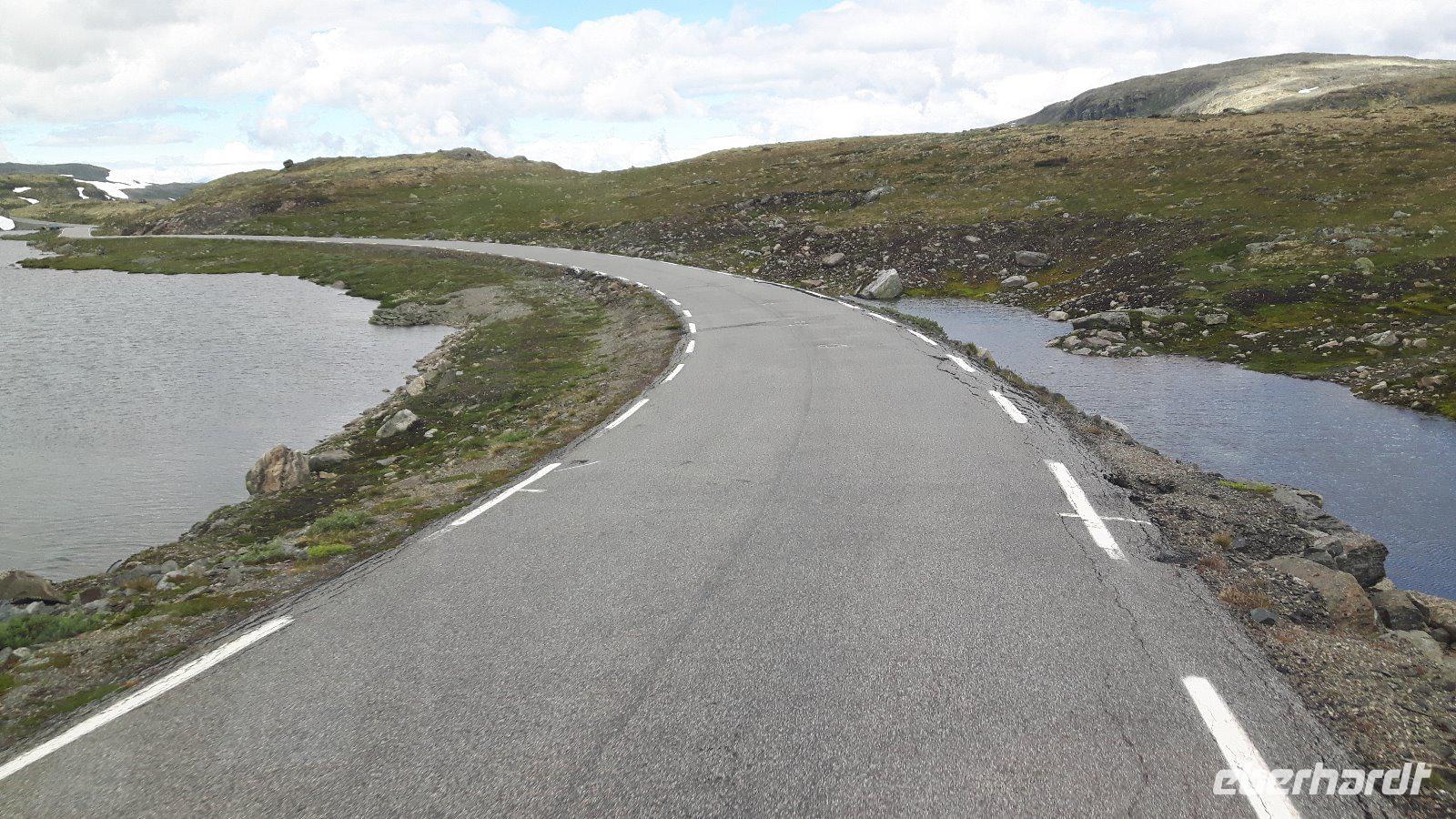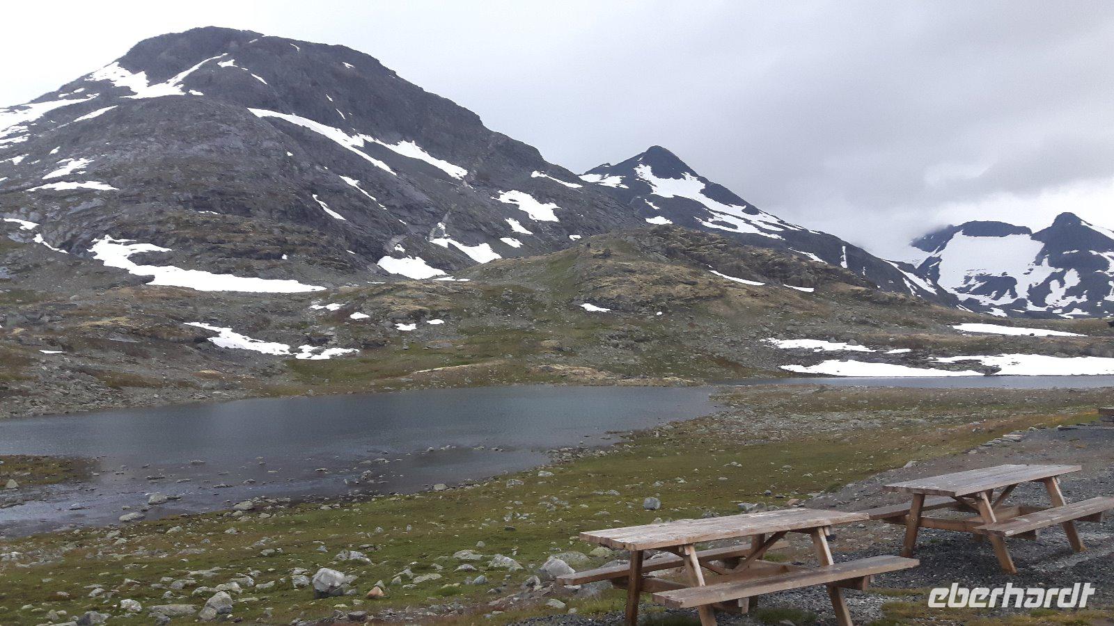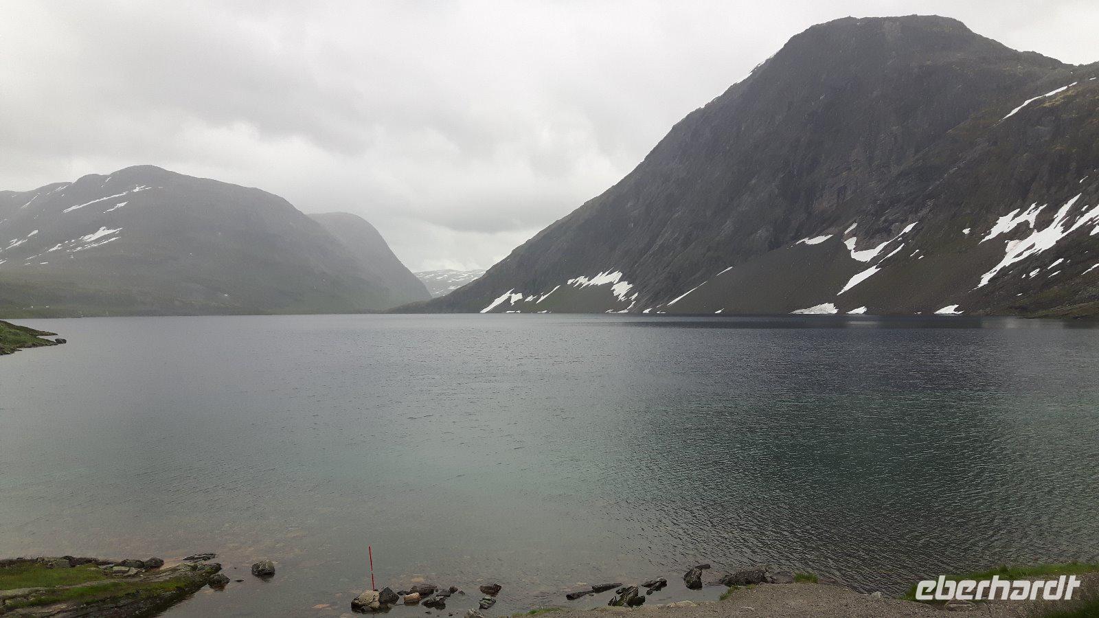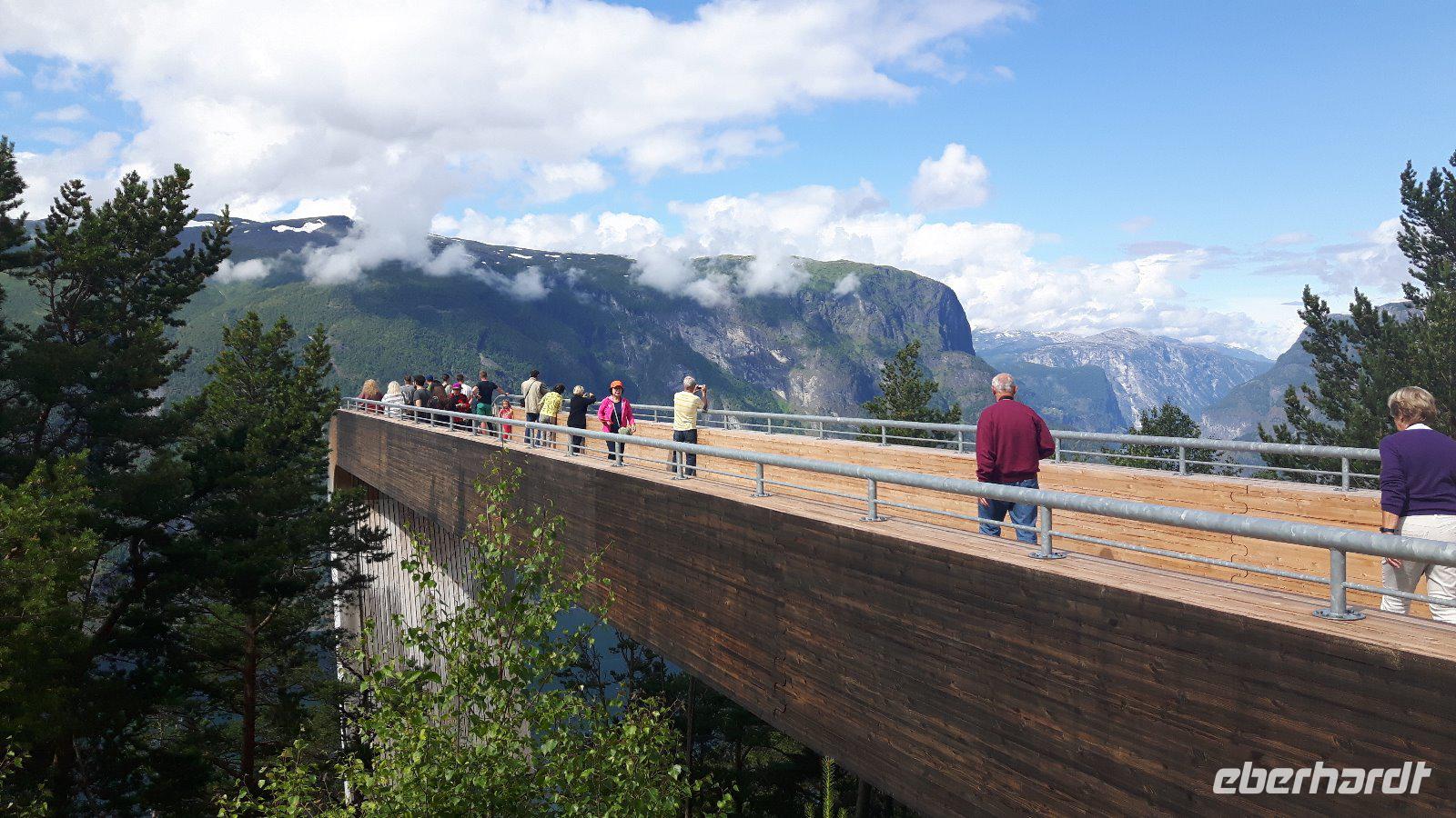 Am heutigen Tag stand zunächst ein Fotostopp an der erst im Jahre 2013 eröffneten Hardanger-Brücke auf dem Programm - diese ist mit 1.380 Metern Länge eine der weltweit längsten Hängebrücken. Über Voss erreichten wir einen meiner persönlichen "Lieblings-Wasserfälle", den Wasserfall Tvindefossen, der sich in mehreren Stufen ins Nærøytal hinunter stürzt. Weiter ging es über Gudvangen und anschließend durch den über 11 Kilometer langen Gudvangen-Tunnel nach Flåm, bekannt durch die spektakuläre Flåmbahn. Wir hatten glücklicherweise etwas Zeit und konnten uns in dem kleinen Ort umschauen oder auch das Flåmbahn-Museum besuchen. Von hier aus fuhren wir über eine der schönsten und abwechslungsreichsten Passstraßen Norwegens, dem sogenannten "Aurlandsvegen", hinüber nach Lærdal. Was uns auf dieser Straße erwarten sollte, war großartig - denn diese 46 Kilometer lange Straße ist eine der 18 Landschaftsrouten Norwegens und übrigens nur im Sommer geöffnet. Der höchste Punkt liegt immerhin bei 1.306 Meter über dem Meeresspiegel. Hier sahen wir auch mitten im Sommers noch etwas Schnee - einfach genial und überwältigend! Nicht zu Unrecht hat diese Route schließlich auch den Beinamen "Schneeweg". Wir erlebten zudem phantastische Aussichtpunkte, unter anderem das Panorama von der neuen Aussichtsplattform "Stegastein" mit einem genialen Blick auf den Aurlandsfjord! Eine kurze Fährüberfahrt über den Sognefjord und schon stand eine erneute Panorama-Fahrt bevor. Entlang der Nordseite des Lustrafjords und mit herrlichen Blicken auf den Fjord und die zahlreichen Wasserfälle ging es zunächst nach Skjolden, am inneren Ende des Sognefjords und etwa 200 Kilometer vom Meer entfernt gelegen. Wir setzten unsere eindrucksvolle Fahrt über die Sognefjellstraße, der Reichsstraße 55, fort. Der mit 1.434 Metern höchstgelegene Gebirgspass Nordeuropas ist seit 1938 für Autos befahrbar. Die Passüberquerung ist eine der ältesten Verbindungswege zwischen West und Ost, sie war die Hauptroute vom gesamten Gudbrandsdal zu den Küstensiedlungen in Sogn und bis nach Bergen. An Waren wurden hier hauptsächlich Salz, Hering und Fisch aus dem Westen und Häute, Butter, und Eisen aus dem Osten transportiert - in beiden Richtungen auf dem eigenen Rücken oder zu Pferd. Unterwegs nutzten wir die reichlichen Möglichkeiten für Fotostopps, obwohl es das Wetter heute zeitweise nicht so gut mit uns meinte. Nichts desto trotz, der nächste Höhepunkt des Tages wartete bereits... Um zu unserem heutigen Quartier zu gelangen, fuhren wir weit ins Leirdalen hinein, übrigens abseits von jeglicher Zivilisation! Aber gerade diese etwas abenteuerliche Situation machte es immer spannender. Voller Erwartungen kamen wir am Abend im Hotel "Leirvassbu Mountain Lodge" an und wir wurden nicht enttäuscht! Kein Handy-Empfang und auch kein TV - warum auch? Die Lodge liegt am Ufer des Sees Leirvatnet, einer atemberaubenden Berglandschaft auf ca. 1.400 Metern Höhe und was will man da mehr? Es war unbeschreiblich schön hier! Das ganze Anwesen ist wie eine altnorwegische Götter-Wohnstätte gestaltet, und jeder Raum trägt einen Namen aus der nordischen Mythologie.