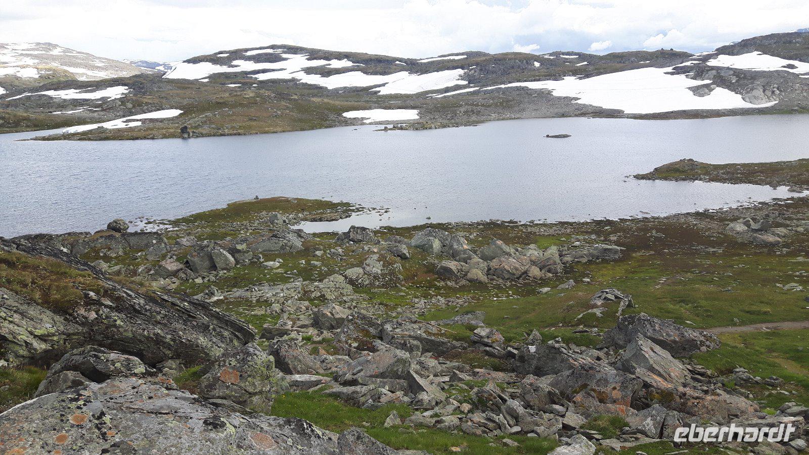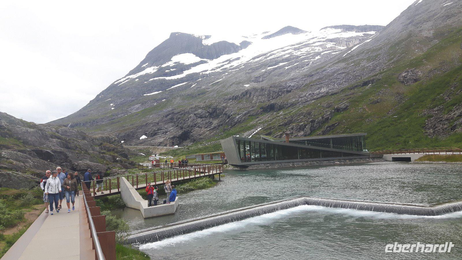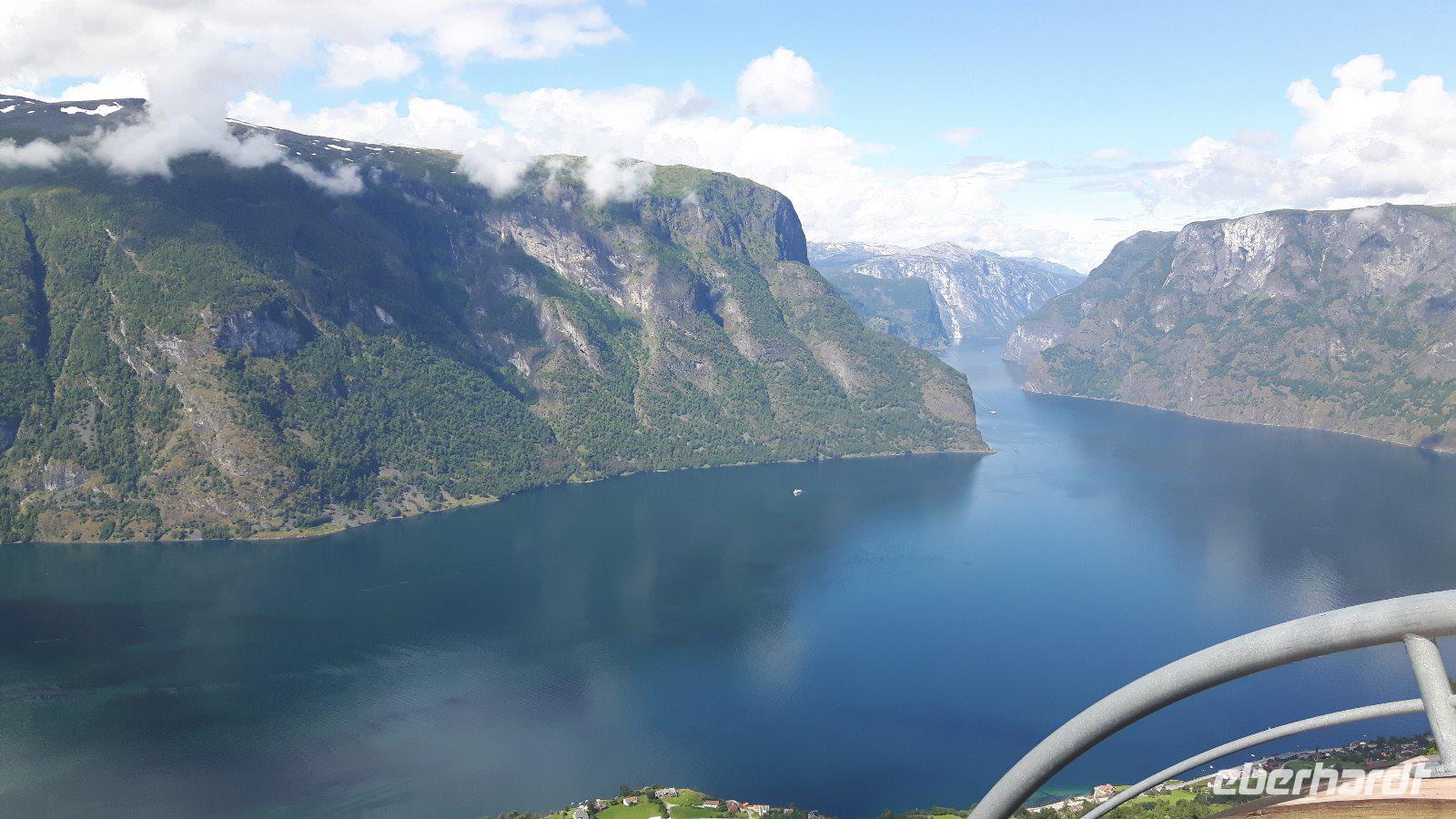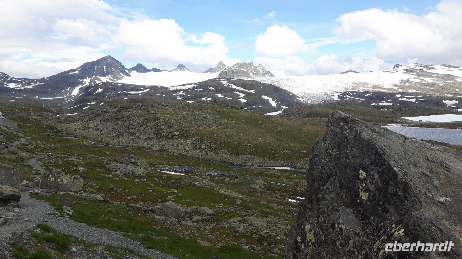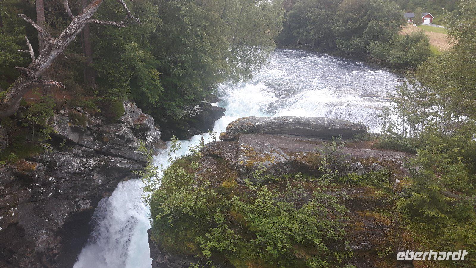 Am heutigen Tag stand zunächst ein Fotostopp an der erst im Jahre 2013 eröffneten Hardanger-Brücke auf dem Programm - diese ist mit 1.380 Metern Länge eine der weltweit längsten Hängebrücken. Über Voss erreichten wir einen meiner persönlichen "Lieblings-Wasserfälle", den Wasserfall Tvindefossen, der sich in mehreren Stufen ins Nærøytal hinunter stürzt. Weiter ging es über Gudvangen und anschließend durch den über 11 Kilometer langen Gudvangen-Tunnel nach Flåm, bekannt durch die spektakuläre Flåmbahn. Wir hatten glücklicherweise etwas Zeit und konnten uns in dem kleinen Ort umschauen oder auch das Flåmbahn-Museum besuchen. Von hier aus fuhren wir über eine der schönsten und abwechslungsreichsten Passstraßen Norwegens, dem sogenannten "Aurlandsvegen", hinüber nach Lærdal. Was uns auf dieser Straße erwarten sollte, war großartig - denn diese 46 Kilometer lange Straße ist eine der 18 Landschaftsrouten Norwegens und übrigens nur im Sommer geöffnet. Der höchste Punkt liegt immerhin bei 1.306 Meter über dem Meeresspiegel. Hier sahen wir auch mitten im Sommers noch etwas Schnee - einfach genial und überwältigend! Nicht zu Unrecht hat diese Route schließlich auch den Beinamen "Schneeweg". Wir erlebten zudem phantastische Aussichtpunkte, unter anderem das Panorama von der neuen Aussichtsplattform "Stegastein" mit einem genialen Blick auf den Aurlandsfjord! Eine kurze Fährüberfahrt über den Sognefjord und schon stand eine erneute Panorama-Fahrt bevor. Entlang der Nordseite des Lustrafjords und mit herrlichen Blicken auf den Fjord und die zahlreichen Wasserfälle ging es zunächst nach Skjolden, am inneren Ende des Sognefjords und etwa 200 Kilometer vom Meer entfernt gelegen. Wir setzten unsere eindrucksvolle Fahrt über die Sognefjellstraße, der Reichsstraße 55, fort. Der mit 1.434 Metern höchstgelegene Gebirgspass Nordeuropas ist seit 1938 für Autos befahrbar. Die Passüberquerung ist eine der ältesten Verbindungswege zwischen West und Ost, sie war die Hauptroute vom gesamten Gudbrandsdal zu den Küstensiedlungen in Sogn und bis nach Bergen. An Waren wurden hier hauptsächlich Salz, Hering und Fisch aus dem Westen und Häute, Butter, und Eisen aus dem Osten transportiert - in beiden Richtungen auf dem eigenen Rücken oder zu Pferd. Unterwegs nutzten wir die reichlichen Möglichkeiten für Fotostopps, obwohl es das Wetter heute zeitweise nicht so gut mit uns meinte. Nichts desto trotz, der nächste Höhepunkt des Tages wartete bereits... Um zu unserem heutigen Quartier zu gelangen, fuhren wir weit ins Leirdalen hinein, übrigens abseits von jeglicher Zivilisation! Aber gerade diese etwas abenteuerliche Situation machte es immer spannender. Voller Erwartungen kamen wir am Abend im Hotel "Leirvassbu Mountain Lodge" an und wir wurden nicht enttäuscht! Kein Handy-Empfang und auch kein TV - warum auch? Die Lodge liegt am Ufer des Sees Leirvatnet, einer atemberaubenden Berglandschaft auf ca. 1.400 Metern Höhe und was will man da mehr? Es war unbeschreiblich schön hier! Das ganze Anwesen ist wie eine altnorwegische Götter-Wohnstätte gestaltet, und jeder Raum trägt einen Namen aus der nordischen Mythologie.