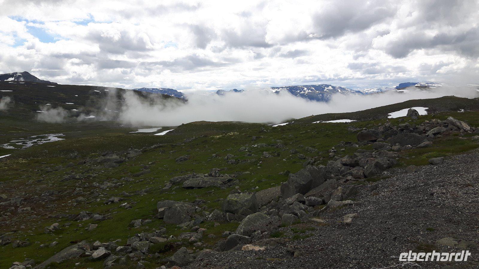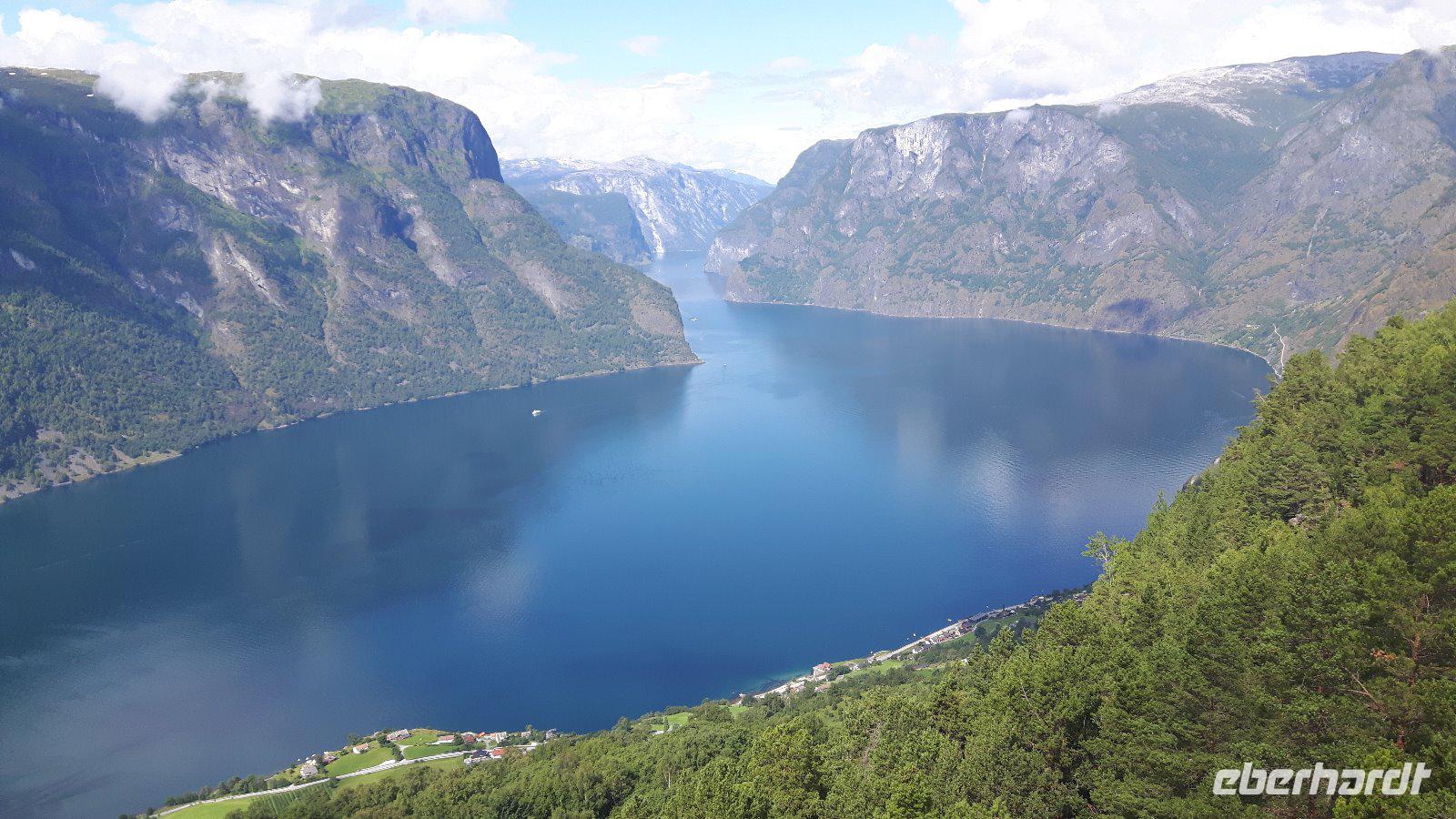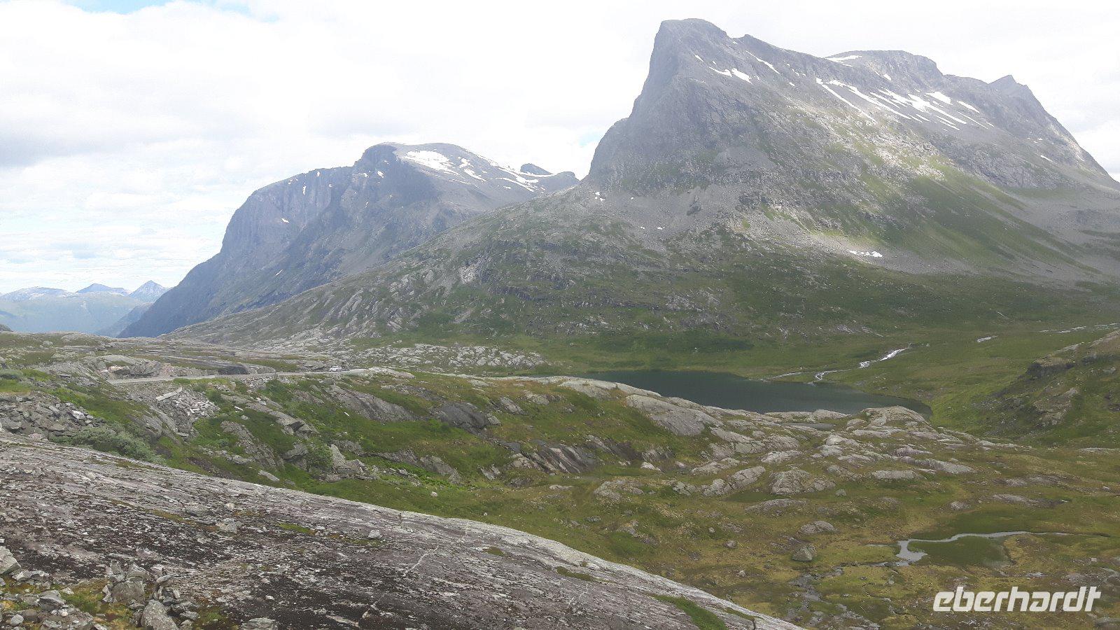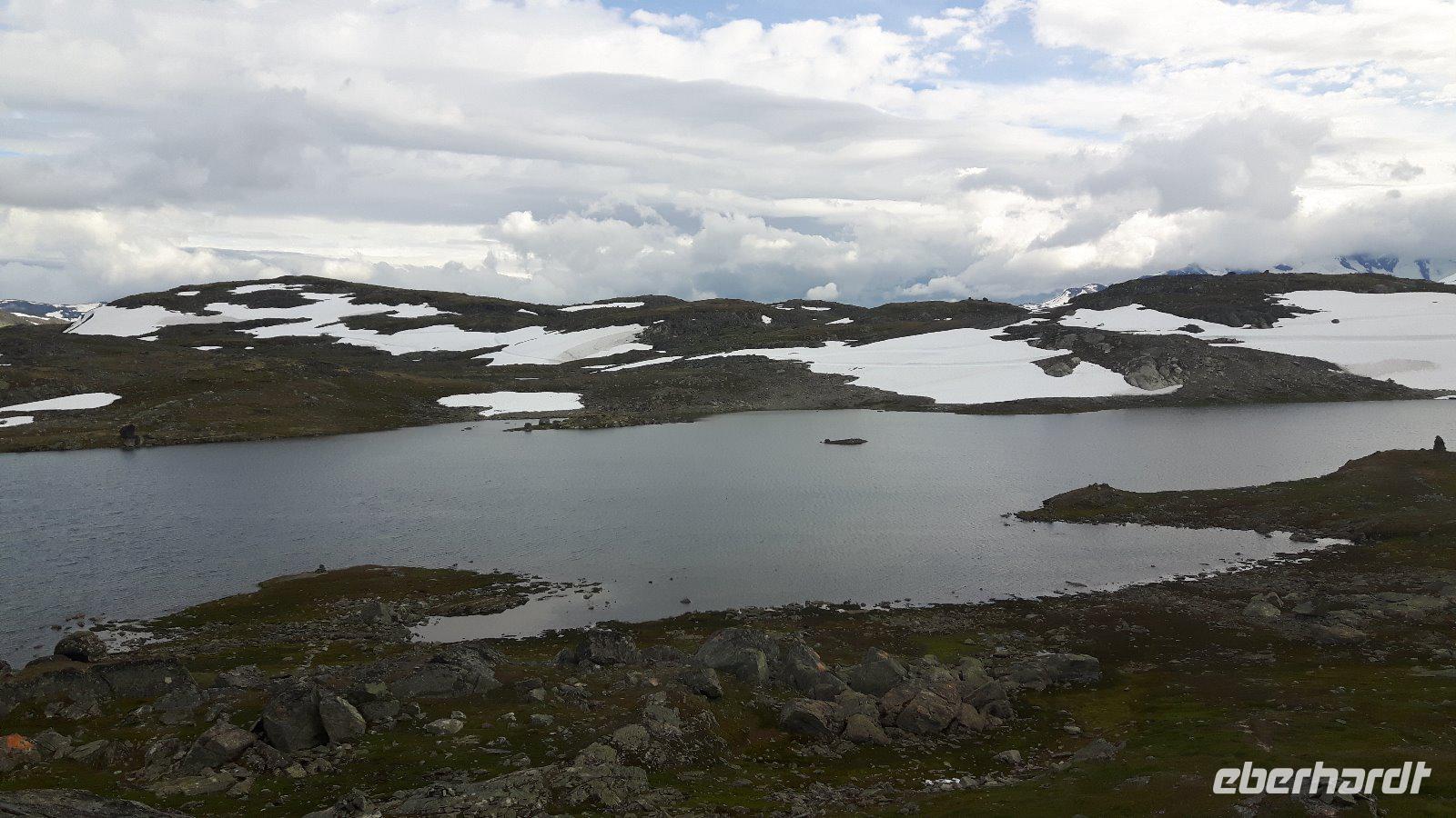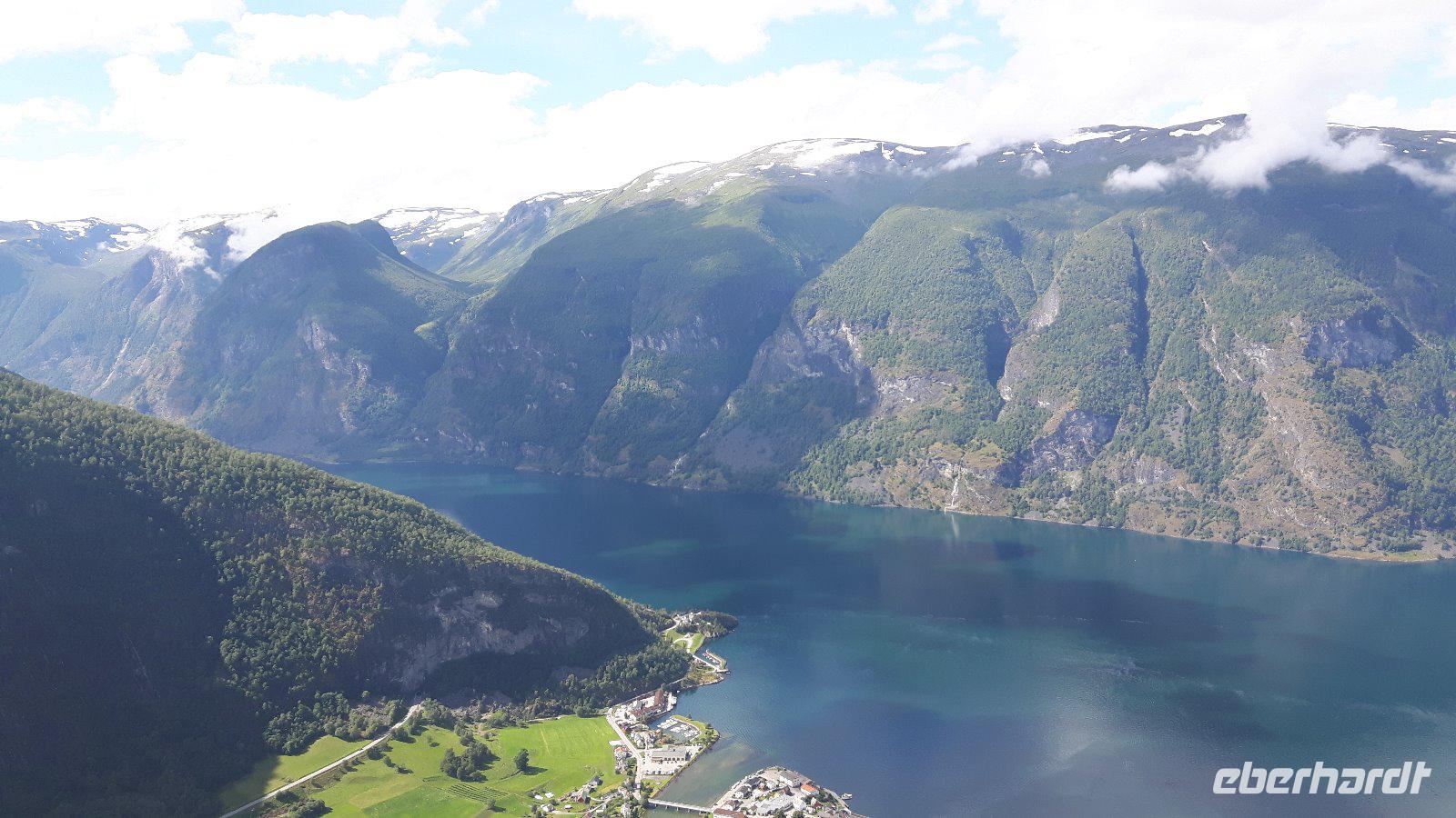Am heutigen Tag stand zunächst ein Fotostopp an der erst im Jahre 2013 eröffneten Hardanger-Brücke auf dem Programm - diese ist mit 1.380 Metern Länge eine der weltweit längsten Hängebrücken. Über Voss erreichten wir einen meiner persönlichen "Lieblings-Wasserfälle", den Wasserfall Tvindefossen, der sich in mehreren Stufen ins Nærøytal hinunter stürzt. Weiter ging es über Gudvangen und anschließend durch den über 11 Kilometer langen Gudvangen-Tunnel nach Flåm, bekannt durch die spektakuläre Flåmbahn. Wir hatten glücklicherweise etwas Zeit und konnten uns in dem kleinen Ort umschauen oder auch das Flåmbahn-Museum besuchen. Von hier aus fuhren wir über eine der schönsten und abwechslungsreichsten Passstraßen Norwegens, dem sogenannten "Aurlandsvegen", hinüber nach Lærdal. Was uns auf dieser Straße erwarten sollte, war großartig - denn diese 46 Kilometer lange Straße ist eine der 18 Landschaftsrouten Norwegens und übrigens nur im Sommer geöffnet. Der höchste Punkt liegt immerhin bei 1.306 Meter über dem Meeresspiegel. Hier sahen wir auch mitten im Sommers noch etwas Schnee - einfach genial und überwältigend! Nicht zu Unrecht hat diese Route schließlich auch den Beinamen "Schneeweg". Wir erlebten zudem phantastische Aussichtpunkte, unter anderem das Panorama von der neuen Aussichtsplattform "Stegastein" mit einem genialen Blick auf den Aurlandsfjord! Eine kurze Fährüberfahrt über den Sognefjord und schon stand eine erneute Panorama-Fahrt bevor. Entlang der Nordseite des Lustrafjords und mit herrlichen Blicken auf den Fjord und die zahlreichen Wasserfälle ging es zunächst nach Skjolden, am inneren Ende des Sognefjords und etwa 200 Kilometer vom Meer entfernt gelegen. Wir setzten unsere eindrucksvolle Fahrt über die Sognefjellstraße, der Reichsstraße 55, fort. Der mit 1.434 Metern höchstgelegene Gebirgspass Nordeuropas ist seit 1938 für Autos befahrbar. Die Passüberquerung ist eine der ältesten Verbindungswege zwischen West und Ost, sie war die Hauptroute vom gesamten Gudbrandsdal zu den Küstensiedlungen in Sogn und bis nach Bergen. An Waren wurden hier hauptsächlich Salz, Hering und Fisch aus dem Westen und Häute, Butter, und Eisen aus dem Osten transportiert - in beiden Richtungen auf dem eigenen Rücken oder zu Pferd. Unterwegs nutzten wir die reichlichen Möglichkeiten für Fotostopps, obwohl es das Wetter heute zeitweise nicht so gut mit uns meinte. Nichts desto trotz, der nächste Höhepunkt des Tages wartete bereits... Um zu unserem heutigen Quartier zu gelangen, fuhren wir weit ins Leirdalen hinein, übrigens abseits von jeglicher Zivilisation! Aber gerade diese etwas abenteuerliche Situation machte es immer spannender. Voller Erwartungen kamen wir am Abend im Hotel "Leirvassbu Mountain Lodge" an und wir wurden nicht enttäuscht! Kein Handy-Empfang und auch kein TV - warum auch? Die Lodge liegt am Ufer des Sees Leirvatnet, einer atemberaubenden Berglandschaft auf ca. 1.400 Metern Höhe und was will man da mehr? Es war unbeschreiblich schön hier! Das ganze Anwesen ist wie eine altnorwegische Götter-Wohnstätte gestaltet, und jeder Raum trägt einen Namen aus der nordischen Mythologie.
