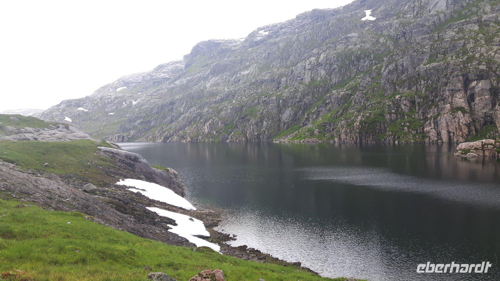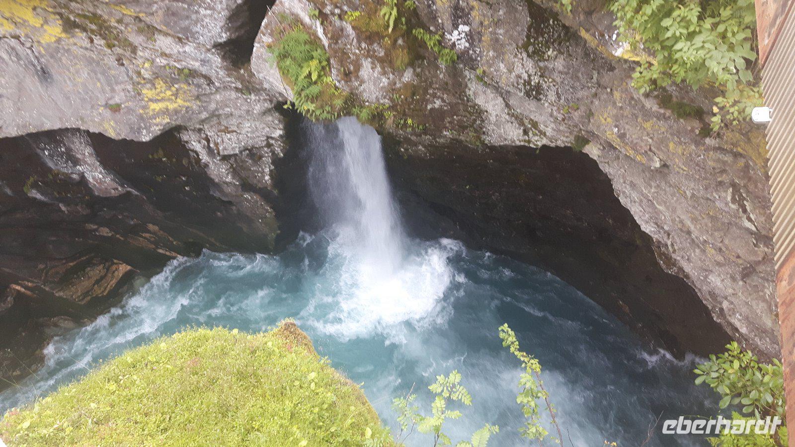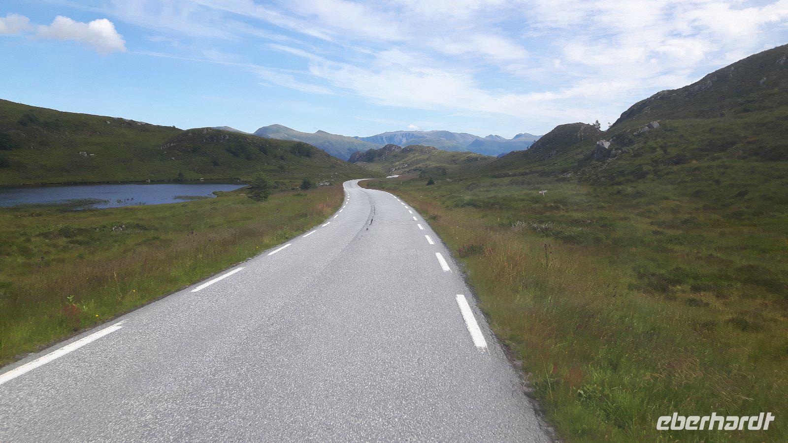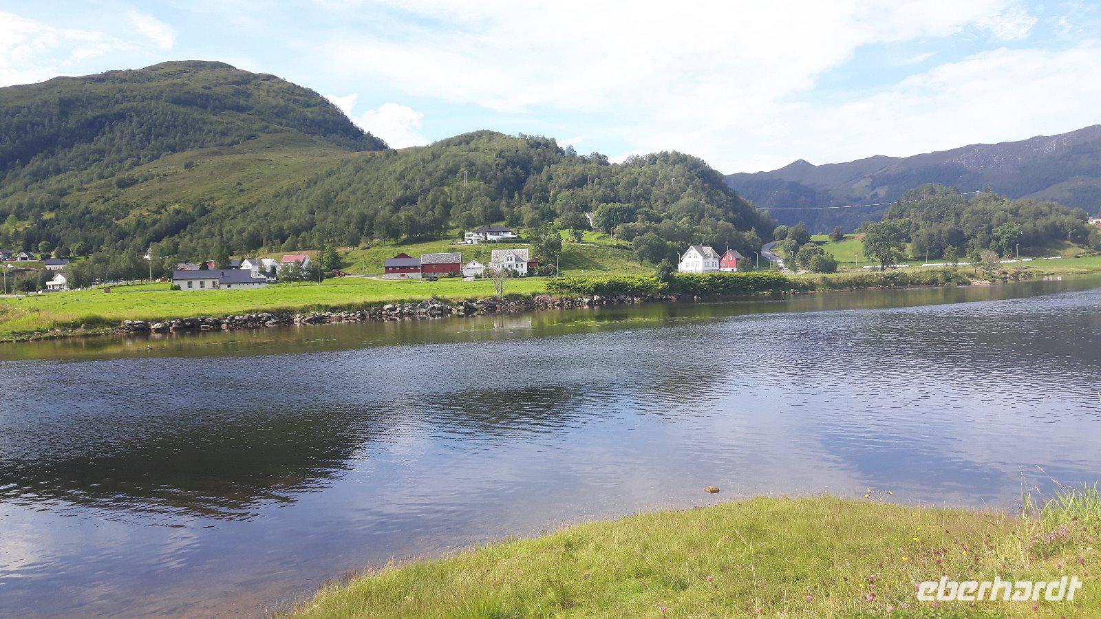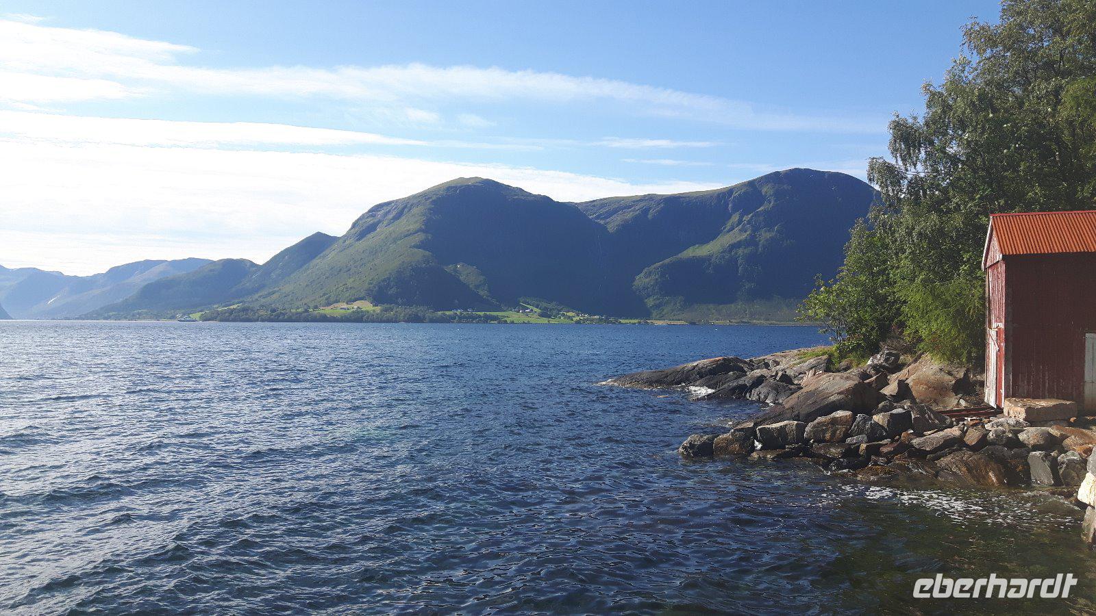 Am heutigen Tag stand zunächst ein Fotostopp an der erst im Jahre 2013 eröffneten Hardanger-Brücke auf dem Programm - diese ist mit 1.380 Metern Länge eine der weltweit längsten Hängebrücken. Über Voss erreichten wir einen meiner persönlichen "Lieblings-Wasserfälle", den Wasserfall Tvindefossen, der sich in mehreren Stufen ins Nærøytal hinunter stürzt. Weiter ging es über Gudvangen und anschließend durch den über 11 Kilometer langen Gudvangen-Tunnel nach Flåm, bekannt durch die spektakuläre Flåmbahn. Wir hatten glücklicherweise etwas Zeit und konnten uns in dem kleinen Ort umschauen oder auch das Flåmbahn-Museum besuchen. Von hier aus fuhren wir über eine der schönsten und abwechslungsreichsten Passstraßen Norwegens, dem sogenannten "Aurlandsvegen", hinüber nach Lærdal. Was uns auf dieser Straße erwarten sollte, war großartig - denn diese 46 Kilometer lange Straße ist eine der 18 Landschaftsrouten Norwegens und übrigens nur im Sommer geöffnet. Der höchste Punkt liegt immerhin bei 1.306 Meter über dem Meeresspiegel. Hier sahen wir auch mitten im Sommers noch etwas Schnee - einfach genial und überwältigend! Nicht zu Unrecht hat diese Route schließlich auch den Beinamen "Schneeweg". Wir erlebten zudem phantastische Aussichtpunkte, unter anderem das Panorama von der neuen Aussichtsplattform "Stegastein" mit einem genialen Blick auf den Aurlandsfjord! Eine kurze Fährüberfahrt über den Sognefjord und schon stand eine erneute Panorama-Fahrt bevor. Entlang der Nordseite des Lustrafjords und mit herrlichen Blicken auf den Fjord und die zahlreichen Wasserfälle ging es zunächst nach Skjolden, am inneren Ende des Sognefjords und etwa 200 Kilometer vom Meer entfernt gelegen. Wir setzten unsere eindrucksvolle Fahrt über die Sognefjellstraße, der Reichsstraße 55, fort. Der mit 1.434 Metern höchstgelegene Gebirgspass Nordeuropas ist seit 1938 für Autos befahrbar. Die Passüberquerung ist eine der ältesten Verbindungswege zwischen West und Ost, sie war die Hauptroute vom gesamten Gudbrandsdal zu den Küstensiedlungen in Sogn und bis nach Bergen. An Waren wurden hier hauptsächlich Salz, Hering und Fisch aus dem Westen und Häute, Butter, und Eisen aus dem Osten transportiert - in beiden Richtungen auf dem eigenen Rücken oder zu Pferd. Unterwegs nutzten wir die reichlichen Möglichkeiten für Fotostopps, obwohl es das Wetter heute zeitweise nicht so gut mit uns meinte. Nichts desto trotz, der nächste Höhepunkt des Tages wartete bereits... Um zu unserem heutigen Quartier zu gelangen, fuhren wir weit ins Leirdalen hinein, übrigens abseits von jeglicher Zivilisation! Aber gerade diese etwas abenteuerliche Situation machte es immer spannender. Voller Erwartungen kamen wir am Abend im Hotel "Leirvassbu Mountain Lodge" an und wir wurden nicht enttäuscht! Kein Handy-Empfang und auch kein TV - warum auch? Die Lodge liegt am Ufer des Sees Leirvatnet, einer atemberaubenden Berglandschaft auf ca. 1.400 Metern Höhe und was will man da mehr? Es war unbeschreiblich schön hier! Das ganze Anwesen ist wie eine altnorwegische Götter-Wohnstätte gestaltet, und jeder Raum trägt einen Namen aus der nordischen Mythologie.