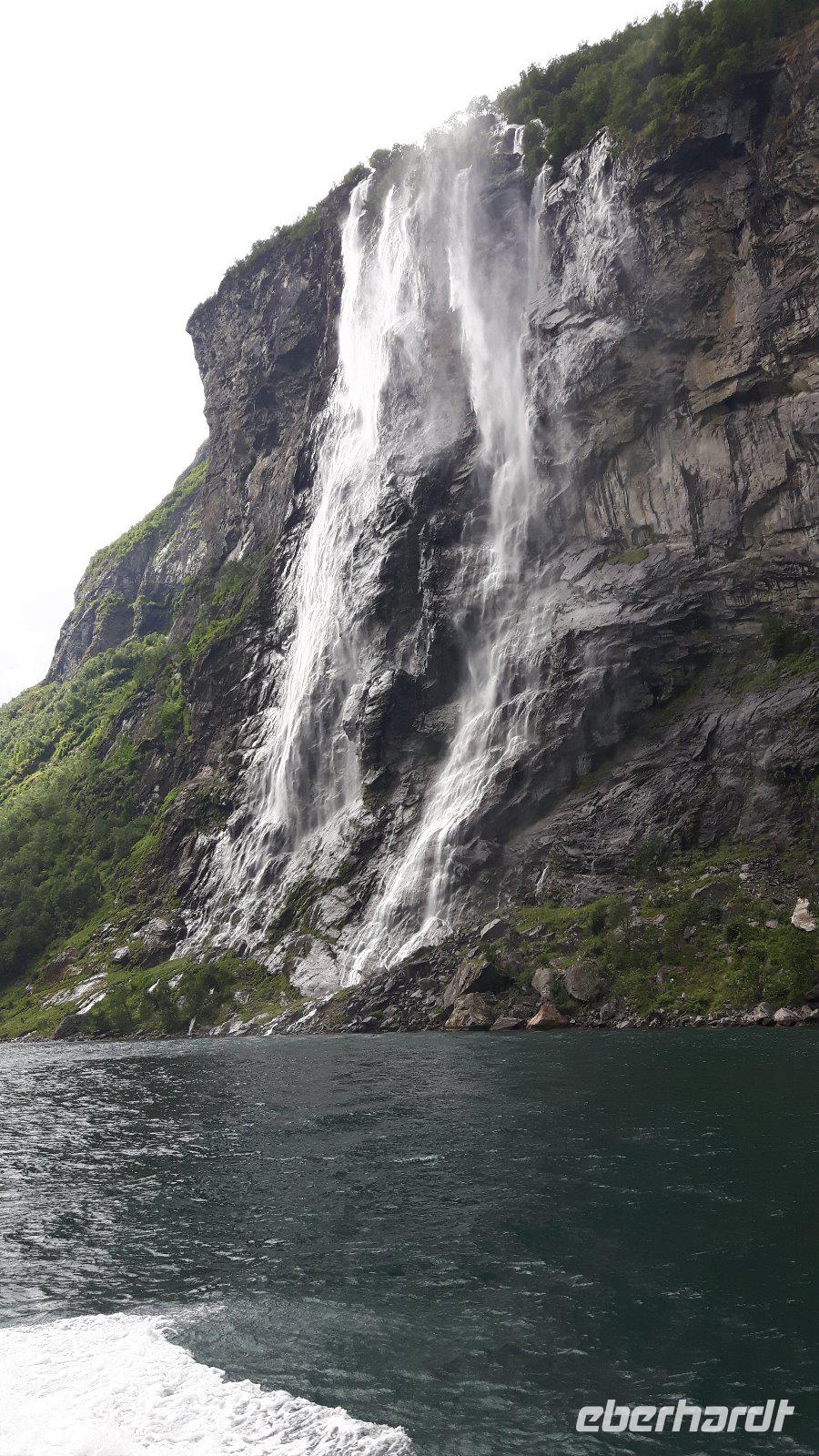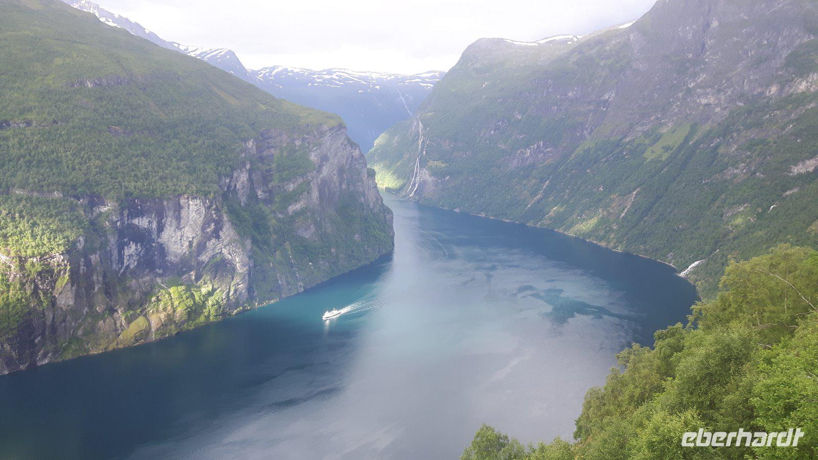 Am Vormittag fuhren wir nach Bøverdalen, wo wir zunächst das "Elveseter Hotel" ansteuerten. "Elveseter" (700 m ü. d. M.) ist ein alter Erbhof, den man in ein modernes Hotel umgewandelt hat und dessen Kulturschätze aus vergangenen Zeiten pietätvoll bewahrt wurden. Er ist dank seinen von den Besitzern selbst geschaffenen Holzschnitzereien eines der originellsten Hotels in Norwegen. Seit fünf Generationen ist der Hof im Besitz der Familie Elveseter. Wie bei einem alten Bauerngehöft im Gudbrandsdaler Stil sind die Häuser um einen schönen Platz gruppiert. Auf dem hiesigen Anwesen steht übrigens auch seit 1992 die 33 Meter hohe geschichtsträchtige Saga-Säule, die einen Querschnitt durch die norwegische Geschichte zeigt - beginnend mit dem ersten vereinigten Reich 872 bis zur Reichsversammlung 1814. Entworfen wurde die Säule vom Bildhauer Rasmussen bereits vor dem Zweiten Weltkrieg und sollte ursprünglich vor dem Parlament in Oslo platziert werden. Anschließend gelangten wir hinunter ins Ottatal und weiter nach Lom. Hier besichtigten wir eine der bedeutendsten noch existierenden Stabkirchen Norwegens. Wer ist nicht fasziniert, wenn er vor einer alten, völlig aus Holz gebauten Stabkirche steht, deren Giebeldächer steil übereinander geschichtet sind. Aus den Giebeln weisen oft stilisierte Drachenköpfe, die eher an Asien erinnern, in alle Himmelsrichtungen. Von den einst angeblich fast 1.000 Stabkirchen sind keine dreißig mehr erhalten. Noch Mitte des 19. Jahrhunderts fehlte den Gemeinden in Norwegen jedes Verständnis über den Wert der alten Gebäude, die in großer Zahl abgerissen wurden, zumal sie auch zu klein geworden waren. Durch das obere Ottatal und über den reichlich 1.000 Meter hohen Djuppvass-Pass erreichten wir den berühmten Geirangerfjord, das Aushängeschild des norwegischen Tourismus schlechthin. Wir unternahmen vom kleinen Dorf Geiranger aus eine ca. 90-minütige Fjord-Kreuzfahrt und vom Schiff aus sahen wir dann auch die berühmten Wasserfälle "Die Sieben Schwestern", "Brautschleier" und "Freier" - diese Fahrt war einzigartig, denn auch das Wetter spielte glücklicherweise einigermaßen mit! Mutter Natur meinte es wirklich gut mit diesem Abschnitt von Norwegen, der folgerichtig von der UNESCO als Weltnaturerbe eingestuft wurde. Kaum ein anderer Fjord führt soweit ins Landesinnere wie der Geirangerfjord und genau diese abgeschiedene Lage macht ihn so besonders. Am späten Nachmittag wurden wir dann im Hotel "Union" in Geiranger erwartet und ein reichhaltiges und schmackhaftes Abendessen rundete diesen erlebnisreichen Tag ab.
