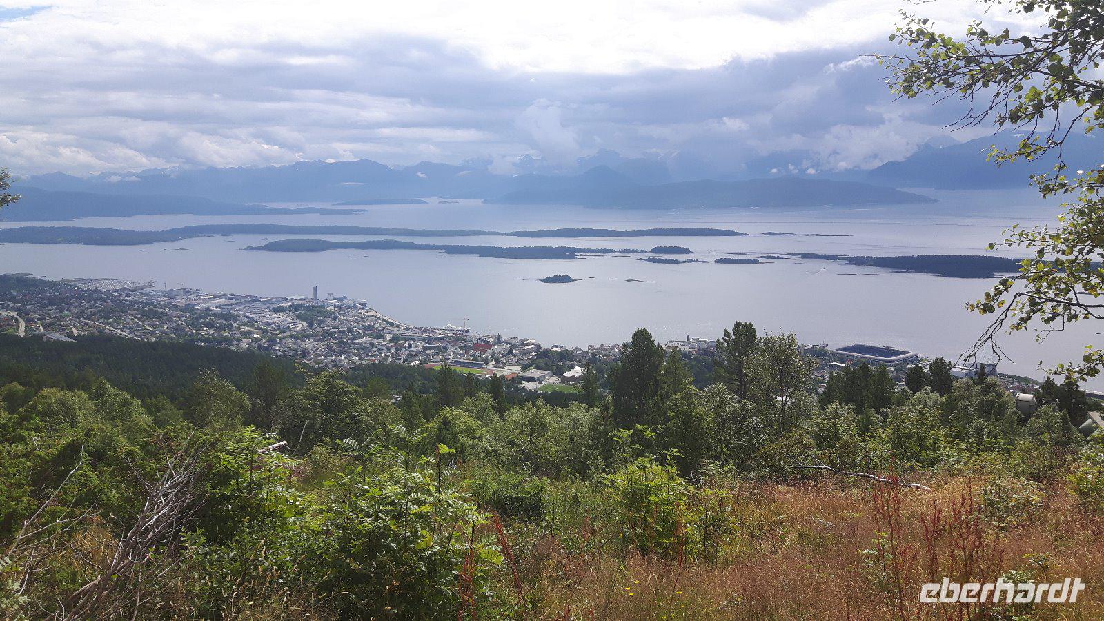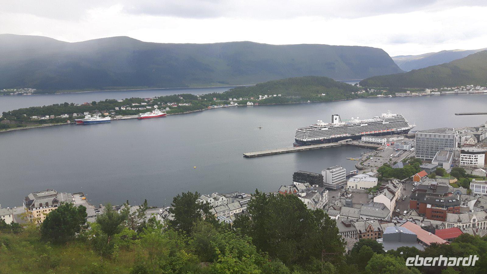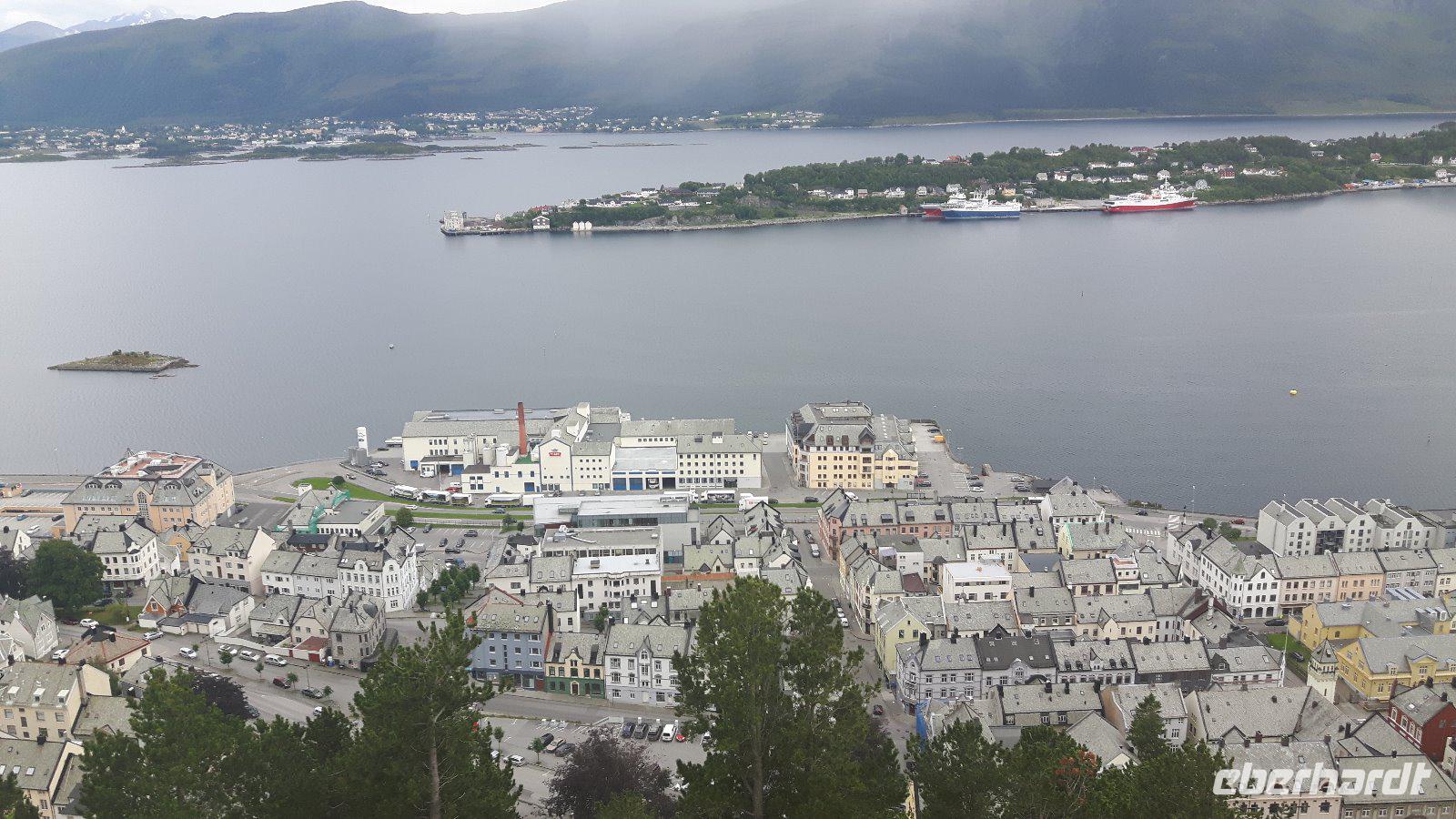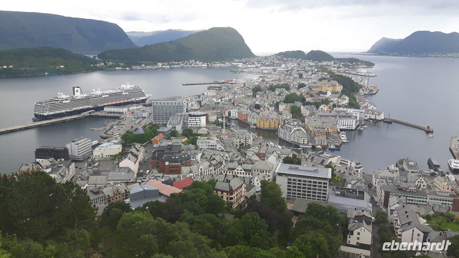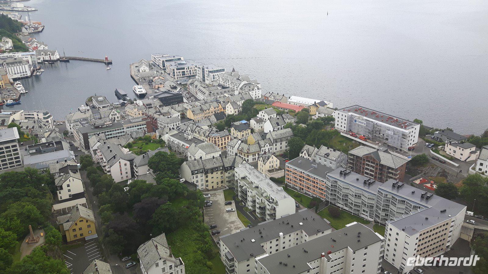 Gleich nach dem Frühstück starteten wir. Es ging durch den Atlantiktunnel, einem im Dezember 2009 eröffneten und 5.469 Meter langen unterseeischen Straßentunnel (größte Tiefe 243 Meter!), um auf die Insel Averøy zu gelangen. Averøy ist eine der größten Fischereigemeinden Norwegens in einer traumhaft schönen Lage am Meer. Die Küste ist von unzähligen Inseln, Holmen und Schären geprägt. Erwartungsvoll sahen wir einem weiteren Höhepunkt unserer Reise entgegen - die Fahrt auf der Atlantikstraße! Die Strecke wurde 2005 zum "Bauwerk des Jahrhunderts" in Norwegen gekürt. Dies ist eine einzigartige Straße, die uns bis ans offene Meer führte. Die etwa 8 Kilometer lange Strecke mit gigantischen Brücken und zahlreichen Dämmen wurde 1989 eröffnet und verbindet die Insel Averøy mit dem Festland. Wir erreichten später den südlichen Zipfel der Hustadbucht und hier das charmante Fischerdorf Bud, wo wir dann leider von einem intensiven Regenguss überrascht wurden. Der Regen hielt uns allerdings nicht davon ab, einen Spaziergang zu unternehmen. Bud wurde immerhin auch bekannt durch die Festung Erkan/Ergan der deutschen Wehrmacht, einem Teil des berühmten Atlantikwalls. Das Wetter besserte sich zu-sehens und so entschlossen wir uns, zum Varden, dem 407 Meter hohen Hausberg von Molde, zu fahren. Hier oben konnten wir das bekannte "Moldepanorama" genießen, denn man hat einen außerordentlich herrlichen Blick über den Fjord und auf die schneebedeckten Gipfel der Romsdaler Alpen! Ein kurzer Aufenthalt im modernen Stadtzentrum rundete den Besuch der Stadt Molde ab - die zahlreichen üppigen und blühenden Rosengärten haben dieser liebenswerten Stadt am Fjord auch den Beinamen „Stadt der Rosen" eingebracht. Vom Fähranleger in Molde und einer ca. 45-minütigen Überfahrt mit dem Schiff über den Romdalsfjord nach Vestnes bzw. immer weiter der Europastraße 39 folgend erreichten wir Ålesund und fuhren erst einmal hinauf auf den 189 Meter hohen Hausberg der Stadt - den Aksla! Der Blick von hier über die Stadt war einmalig! Die Stadt Ålesund ist mit ihren zahlreichen Türmen, Turmspitzen und reich verzierten Häusern weltweit für ihre außergewöhnlich schöne Jugendstil-Architektur bekannt. Nach einem verheerenden Brand im Jahre 1904 wurde die Stadt im Jugendstil, der damals vorherrschenden Stilrichtung, wieder neu aufgebaut. Bereits am späten Nachmittag checkten wir in unserem "Scandic Parken Hotel" in Ålesund ein. Durch die wiederum zentrale Lage des Hotels bot es sich an, die verbleibende Zeit bis zum Abendessen für weitere Entdeckungstouren zu nutzen.