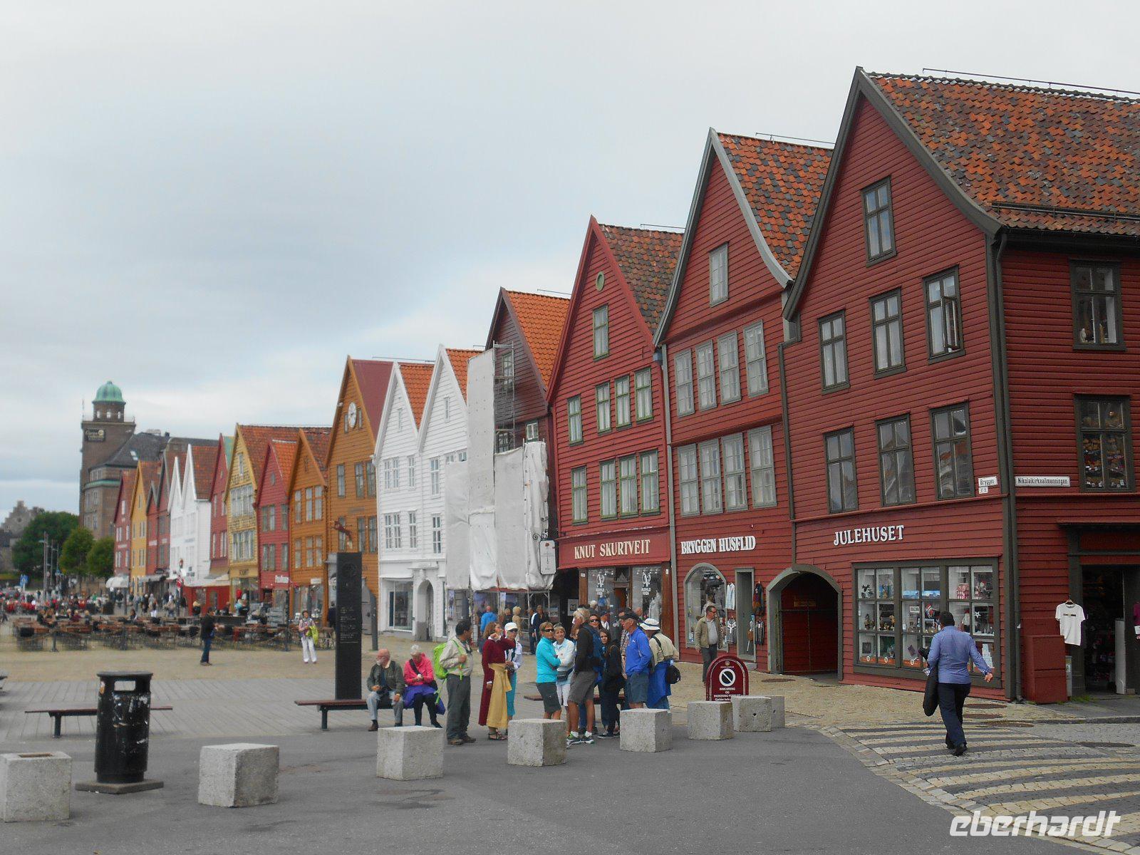 Nach einem ausgiebigen und geschmackvollen Frühstücksbuffet in unserem "Quality Hotel" in Florø und der Verabschiedung von unserem Buschauffeur Gerald, der sich mitsamt unserem Gepäck auf dem Landweg nach Bergen aufmachte, spazierten wir gemeinsam zum benachbarten Hurtigruten-Kai, dem Ausgangspunkt unserer Mini-Kreuzfahrt auf einem der Postschiffe! Wir erwarteten hier die Ankunft des Hurtigruten-Schiffes MS "Nordlys" und dieses lief dann auch leicht verspätet um kurz nach 8 Uhr morgens ein. Florø ist übrigens auch der letzte Hafen, der von einem Hurtigruten-Schiff auf der südgehenden Route angelaufen wird. Inmitten eines ausgedehnten Schären-Archipels liegt die Stadt, deswegen sieht man hier immer wieder kleine interessante Leuchtfeuer entdecken. Da die Gegend sehr stark befahren und zudem gefährlich und schwierig zu navigieren ist, dienen die Leuchtfeuer den Kapitänen noch heute als Warnsignal vor großen Hindernissen. Unser Schiff, die MS "Nordlys", fährt seit 1994 in der Hurtigruten-Flotte und wurde in Stralsund gebaut. Wer Norwegen hautnah erleben will, der sollte unbedingt die Hurtigruten kennenlernen. Es handelt sich dabei um die traditionelle norwegische Postschifflinie, über die seit Ende des 19. Jahrhunderts die Ortschaften der westlichen Küste Norwegens, die etwa 2.700 Kilometer umfasst, miteinander verbunden werden. Zwischen Bergen und Kirkenes kreuzen hier Passagier-, Fracht- und Kreuzfahrtschiffe. Diese Strecke bietet somit eine einmalige Gelegenheit, die gesamte Westküste Norwegens mit all ihren Naturschönheiten kennenzulernen. Fjorde, raue und liebliche Landschaften und die Gastfreundschaft der Menschen machen Hurtigruten heute zu einer echten Touristenattraktion und was einst aus der Not heraus geboren wurde, nämlich auch abgelegene nördliche Landesteile mit dem klimatisch begünstigten Süden zu verbinden, ist inzwischen eine Sehenswürdigkeit. Natürlich erlebten wir auf unserer knapp 6-stündigen Fahrt nur eine kleine Etappe dieser eigentlich 12-tägigen Reise, aber immerhin hat man dadurch einen Eindruck von der sogenannten "Schönsten Seereise der Welt". Am frühen Nachmittag erwarteten uns unser Buschauffeur Gerald sowie die Stadtführerin Angela in Bergen, um direkt eine Stadtrundfahrt durch die zweitgrößte Stadt Norwegens zu unternehmen. Seit König Olaf Kyrre im 11. Jahrhundert mit seinen Wikingerschiffen in der Hafenbucht Vågen anlegte und Bergen dort gründete, zieht die Stadt Menschen aus aller Welt an. Viele Besucher kamen und gingen, andere ließen sich in der norwegischen Hafenstadt nieder. Viele Einheimische verließen ihre traute Umgebung und lernten während ihrer Wanderjahre andere Länder, Leute und Sitten kennen, ehe sie zurückkamen. So konnte sich Bergen zu einem Schmelztiegel verschiedener Kulturen und zu Norwegens internationalster Stadt" entwickeln. Bergen wuchs um den Hafen herum nach und nach zu einer Stadt heran. Handel, Schifffahrt und Handwerk waren ihre Existenzgrundlage. Schon früh wurde Bergen die größte Stadt des Nordens und Norwegens erste Haupt- und Residenzstadt des Königs. Bereits im 14. Jahrhundert war die Stadt so bedeutend geworden, dass die Hanseaten auf Bryggen ein Kontor gründeten, das noch heute zu sehen ist. Nachdem wir interessante Informationen über diese Stadt erhalten hatten, bezogen wir unsere Zimmer im Hotel "Scandic Neptun" in Bergen. Das Hotel liegt nur wenige Gehminuten vom berühmten Fischmarkt entfernt und somit stand ein individueller Besuch für viele Gäste noch vor dem Abendessen auf dem Programm. Bergen machte übrigens heute seinem Ruf als regenreichste Großstadt alle Ehre, denn hier soll es an etwa 250 Tagen im Jahr regnen - wir durften übrigens einen "teilweise" regenfreien Tag verbringen!