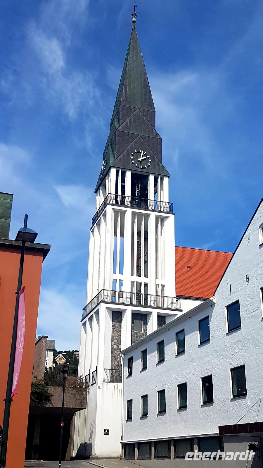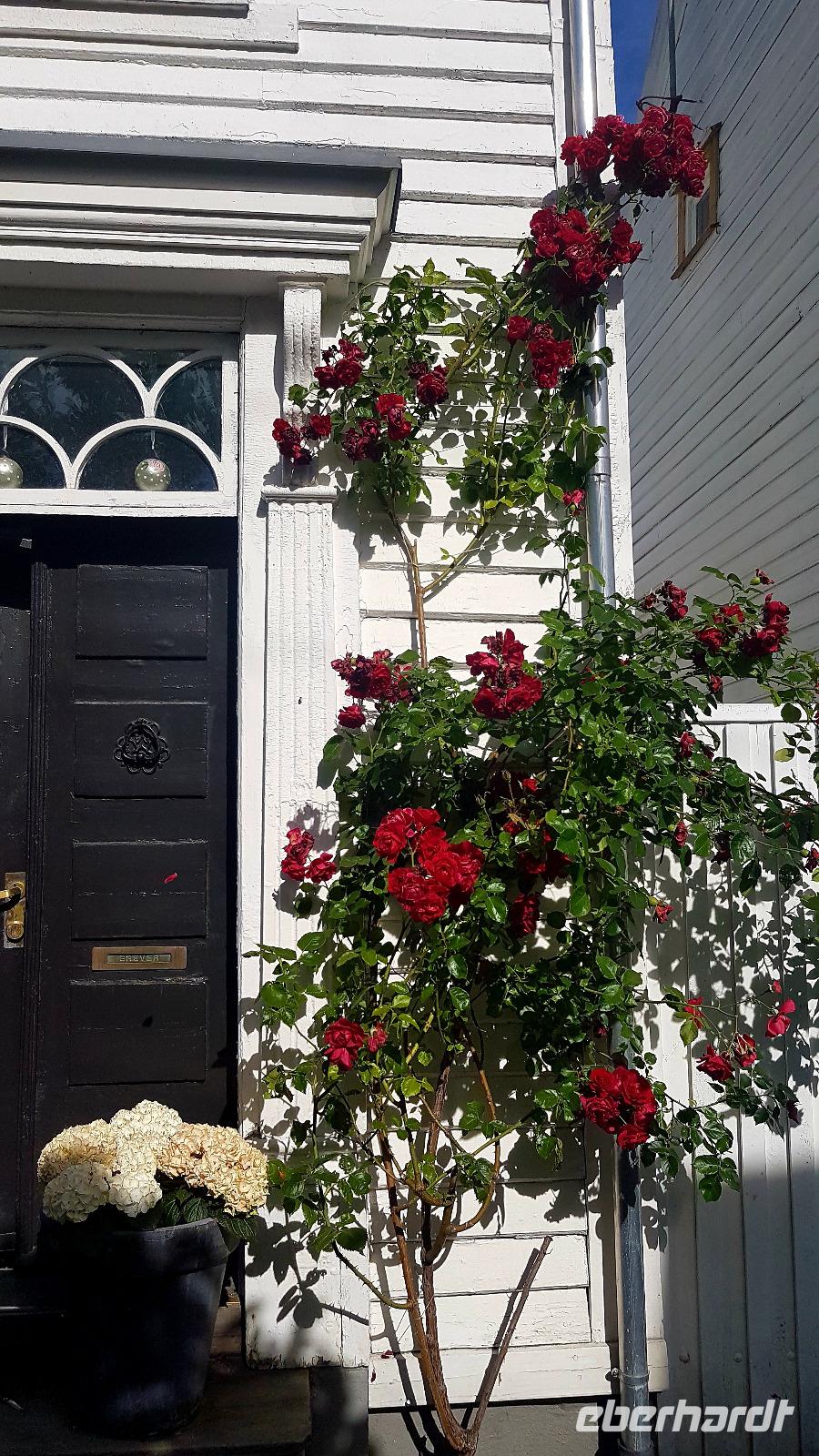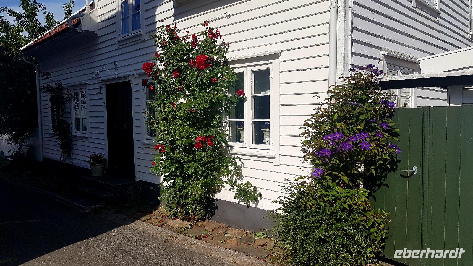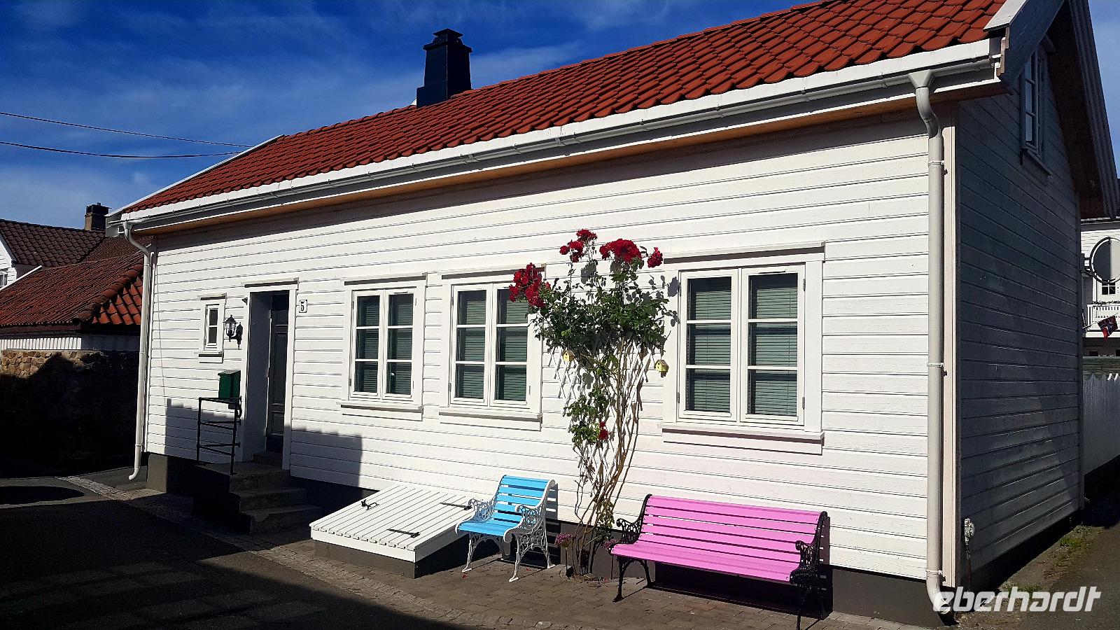 Unser erstes Ziel an diesem Tag ist das Holländerstädtchen Flekkefjord. Durch enge Straßen, vorbei an weißen Holzhäusern mit liebevollen Details, wie bunten Bänken vor den Häusern und rankenden Rosenbüschen, kommen wir an den, den Ort durchfließenden Fluß Danneviga und zum Yachthafen. Die Kirche in der Ortsmitte ist heute leider geschlossen.