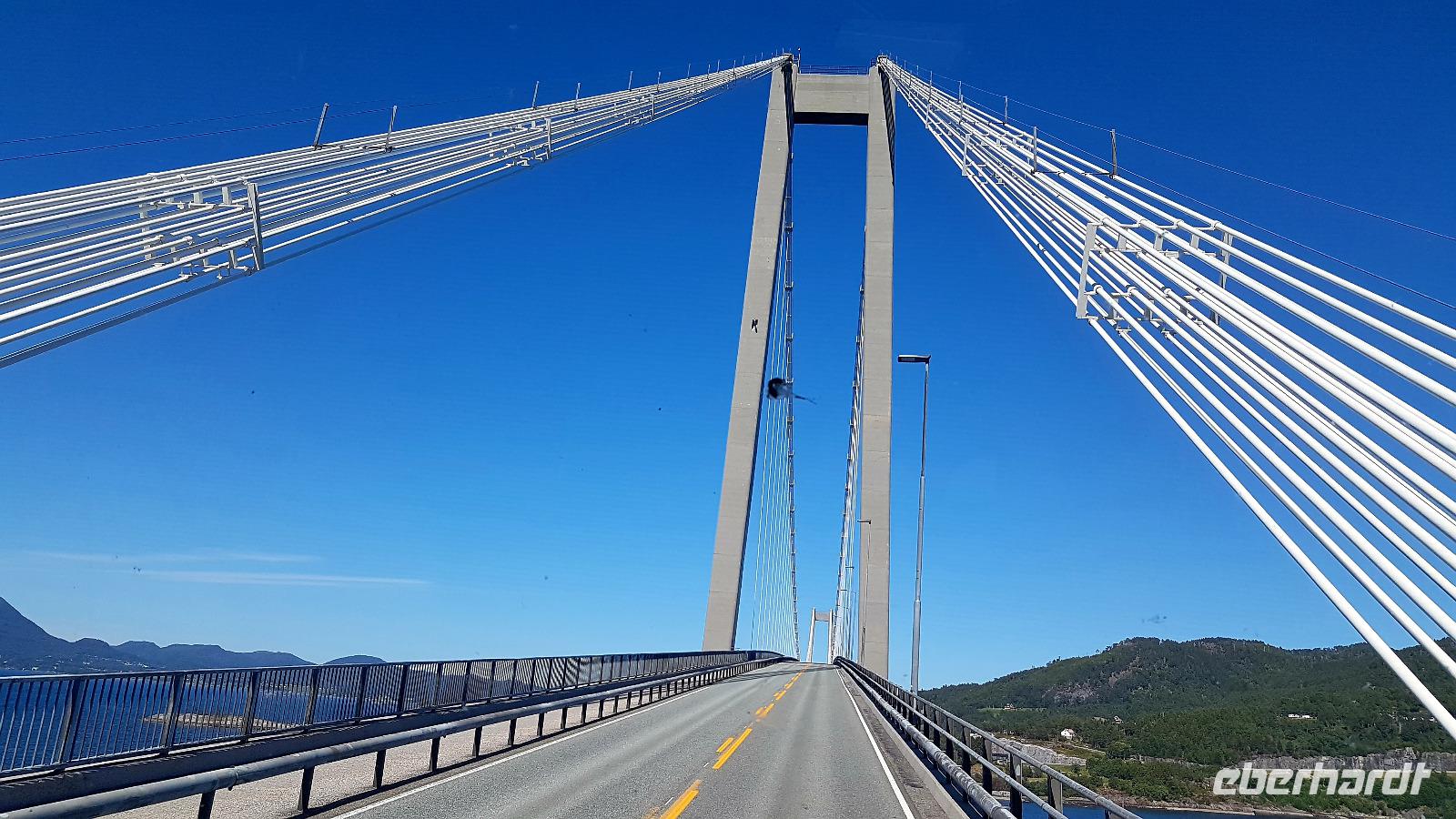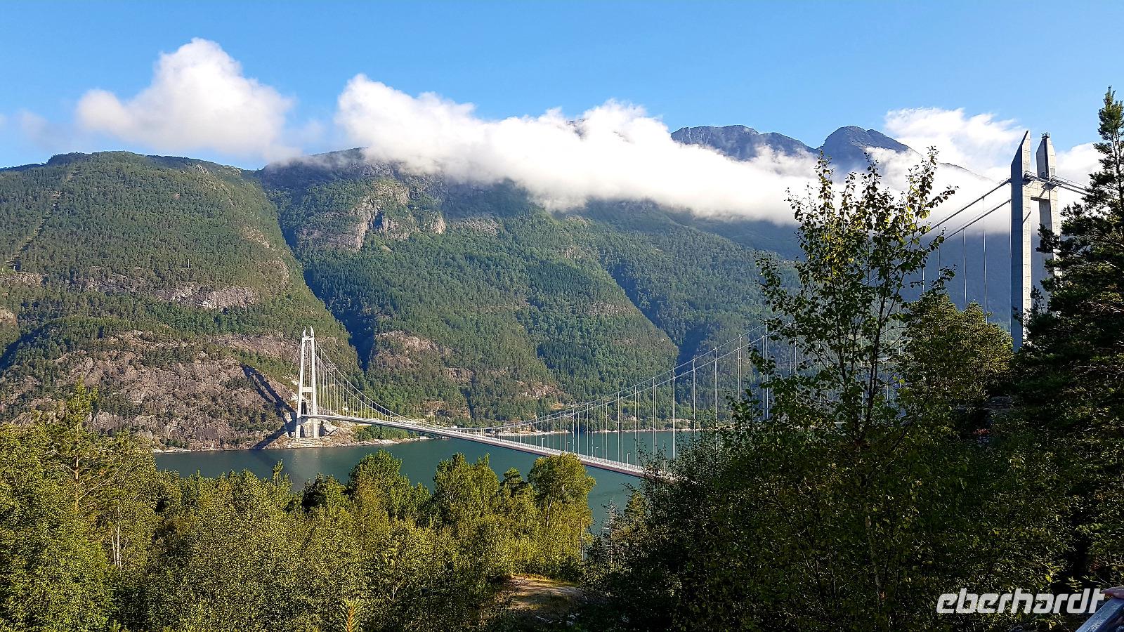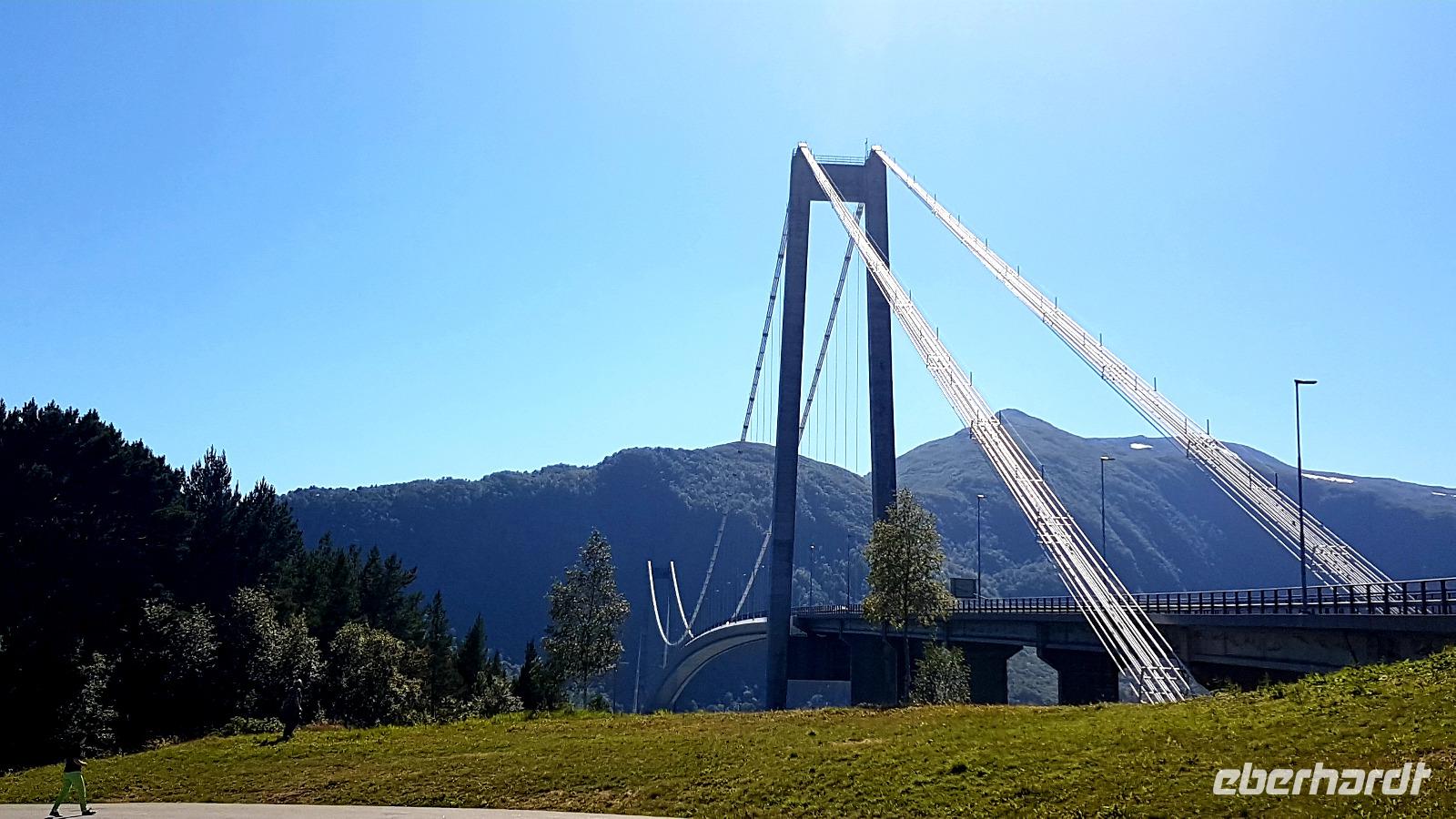 Über das Hardangerfjord führt eine 1.380 m lange Hängebrücke über die wir unseren Weg fortsetzen, nachdem wir dort einen Fotostopp eingelegt haben. Tunneldurchfahrten gibt es auch wieder viele. Wer wird sie zählen? Der nächste Wasserfall, der Tvindefossen, wartet auch als nächstes Fotomotiv.