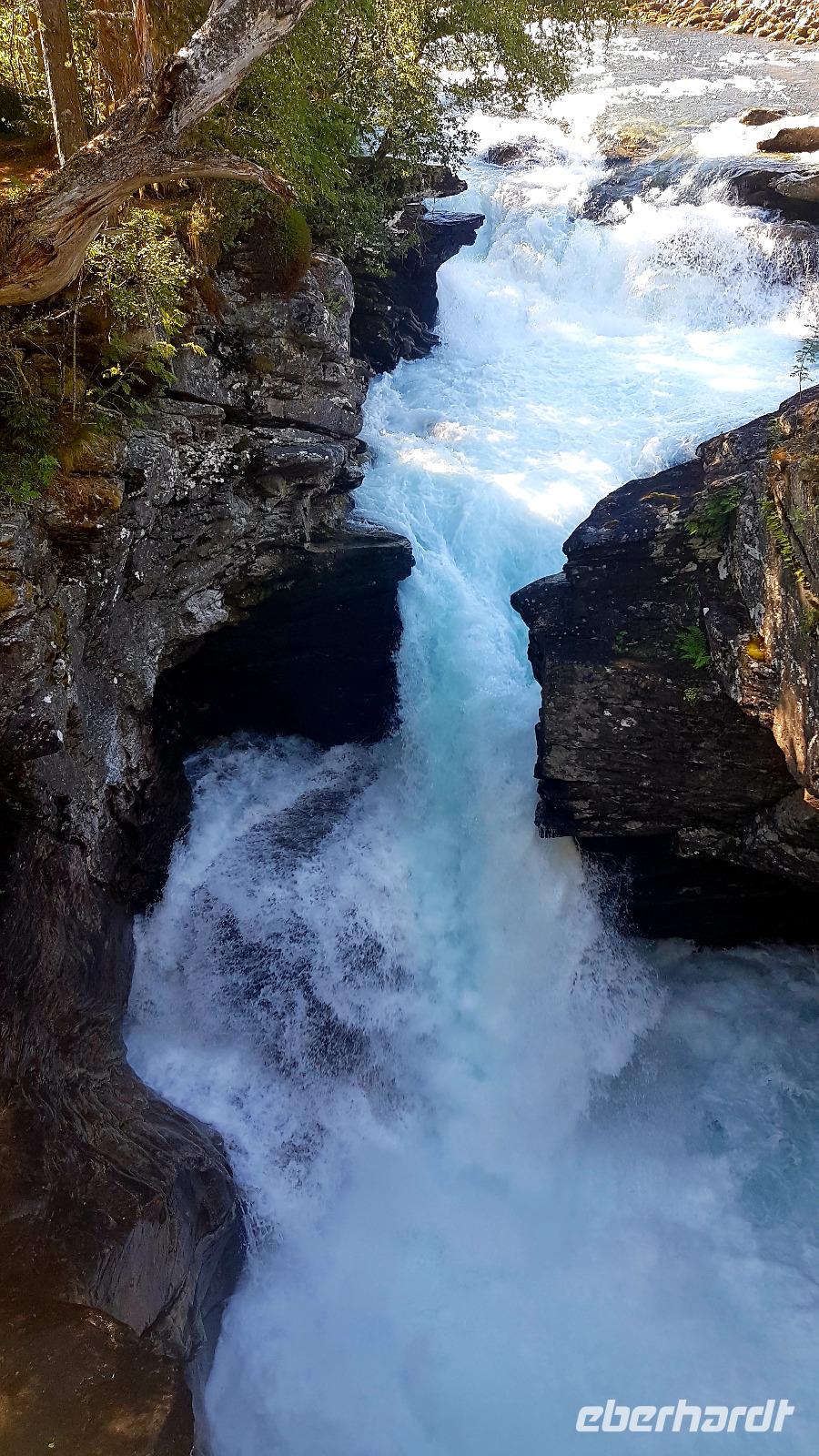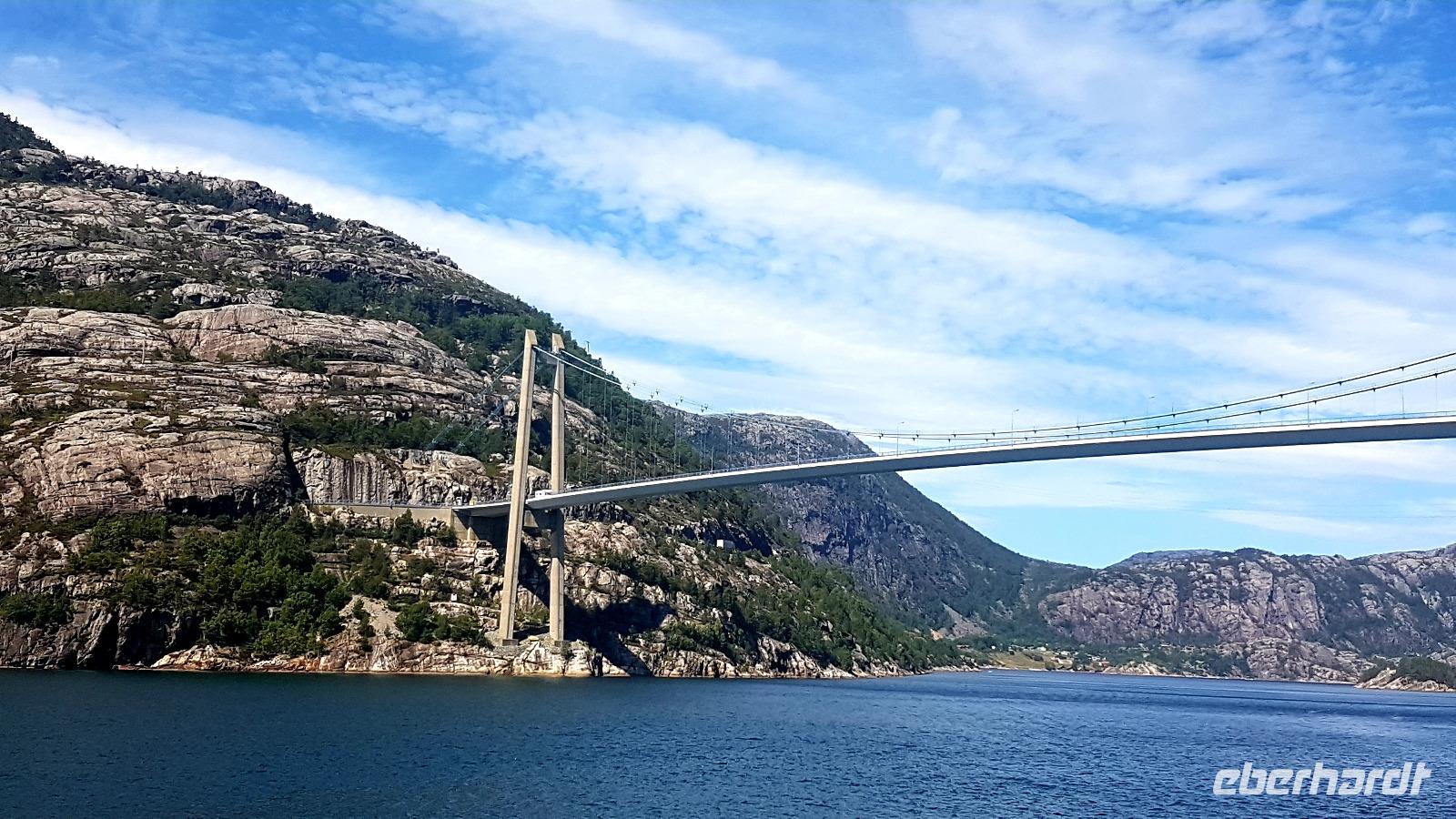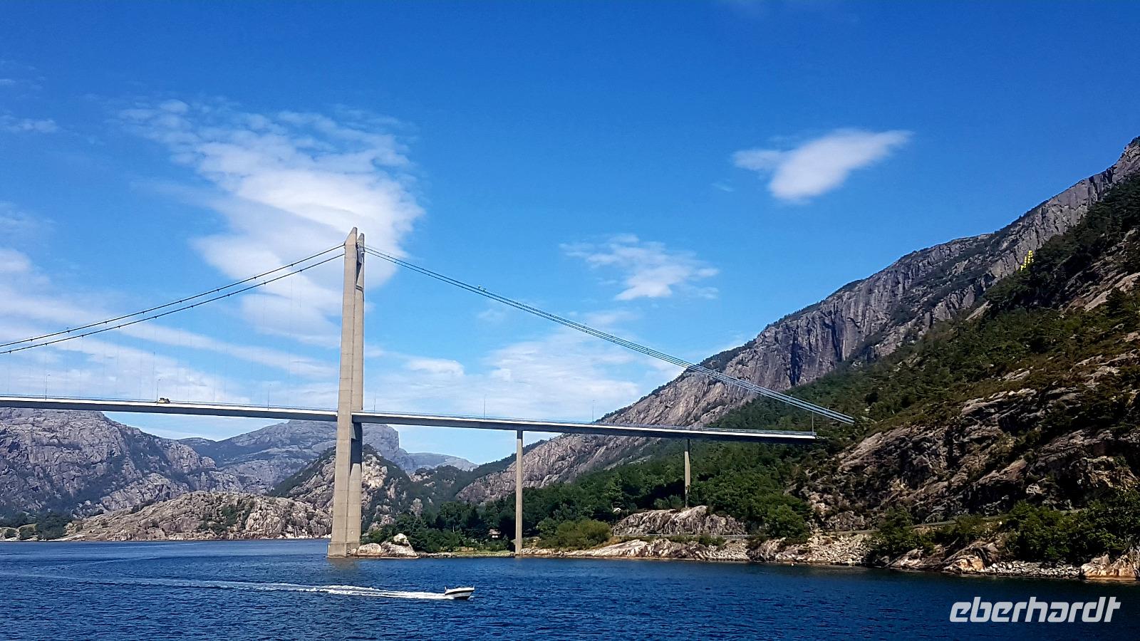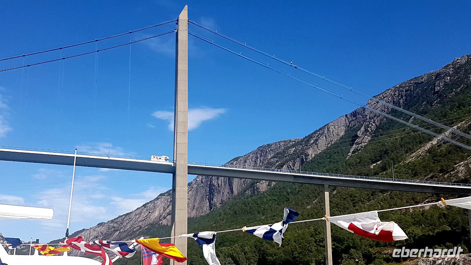 Über das Hardangerfjord führt eine 1.380 m lange Hängebrücke über die wir unseren Weg fortsetzen, nachdem wir dort einen Fotostopp eingelegt haben. Tunneldurchfahrten gibt es auch wieder viele. Wer wird sie zählen? Der nächste Wasserfall, der Tvindefossen, wartet auch als nächstes Fotomotiv.