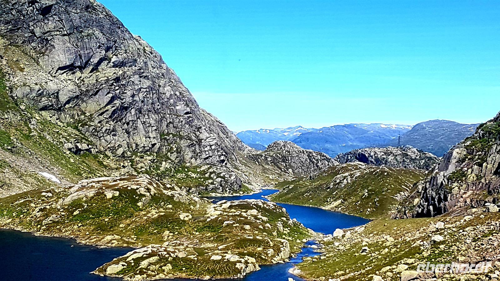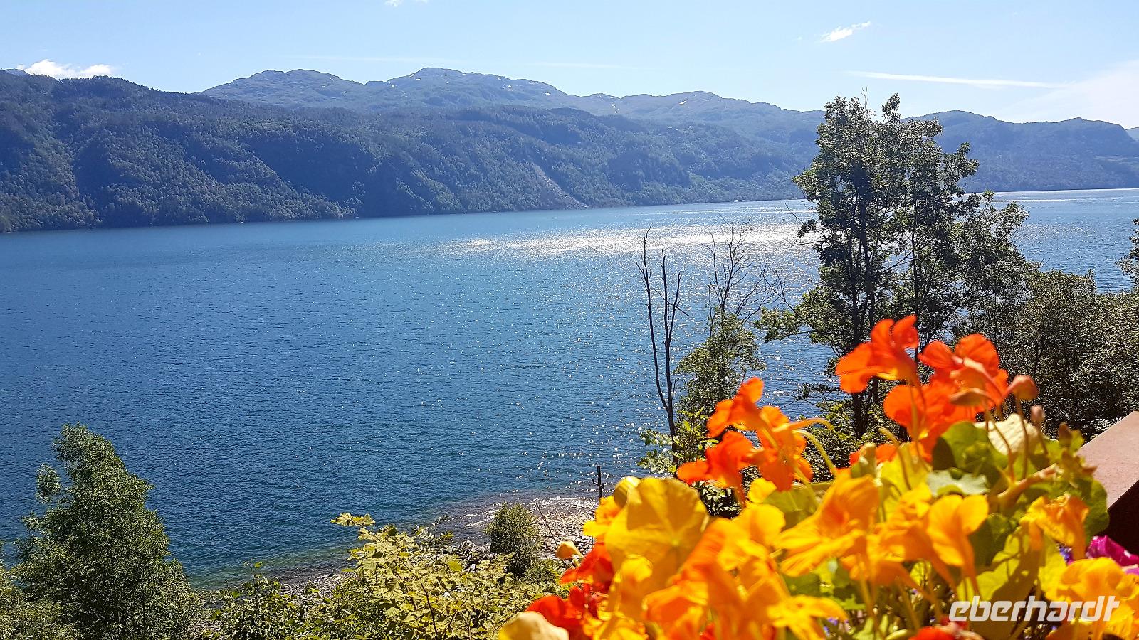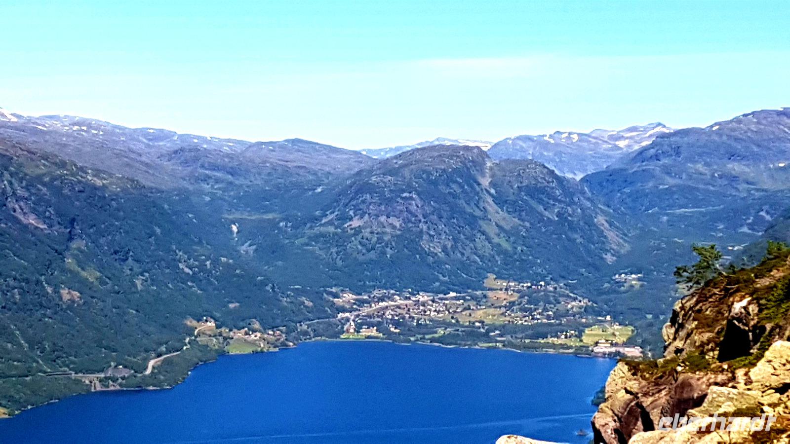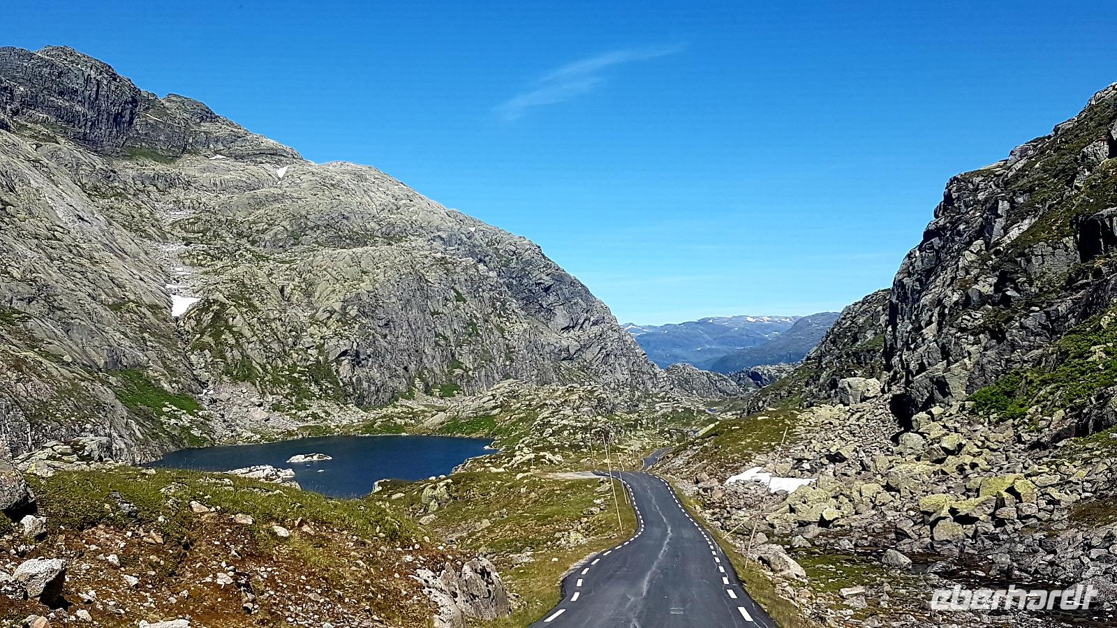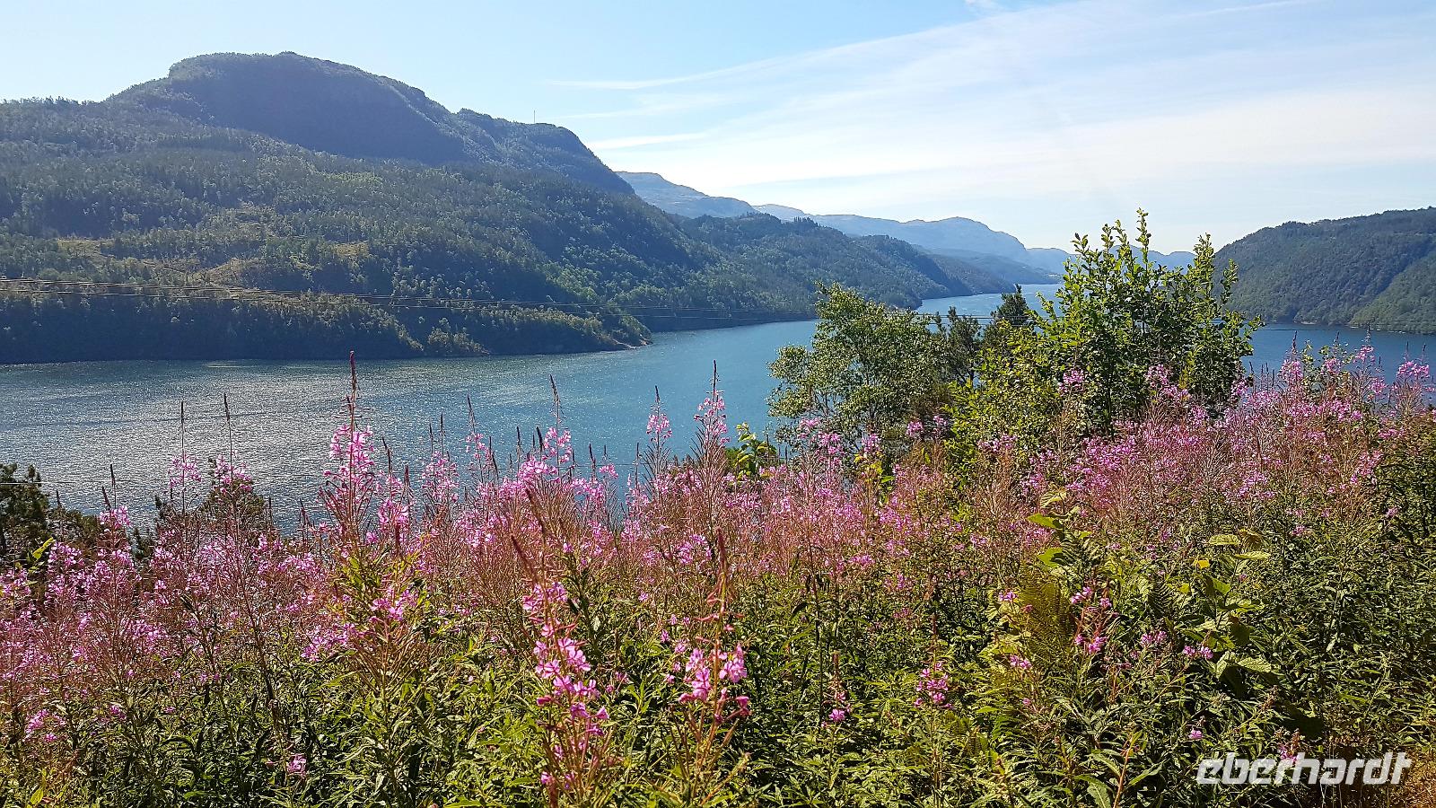 Nach zwei Fährüberfahrten von Stavanger nach Tau und von Hjelmeland nach Nesvik. Weiter geht es am Fjord entlang und eine erste Fahrt über eine Hochebene, das Saudafjell, lässt uns neugierig werden. Wir erreichen die Baumgrenze, nachdem wir eine kurvenreiche Strecke zurückgelegt haben. Reste von Schnee liegt auf einigen der Berggipfel. Die liebliche Landschaft erstrahlt im Sonnenschein und das Wasser in den Seen glitzert. An odda vorbei geht es durch das Oddatal zum Wasserfall Latefossen. Hinunter geht es zum Eidfjord, einem Teil des Hardangerfjords.