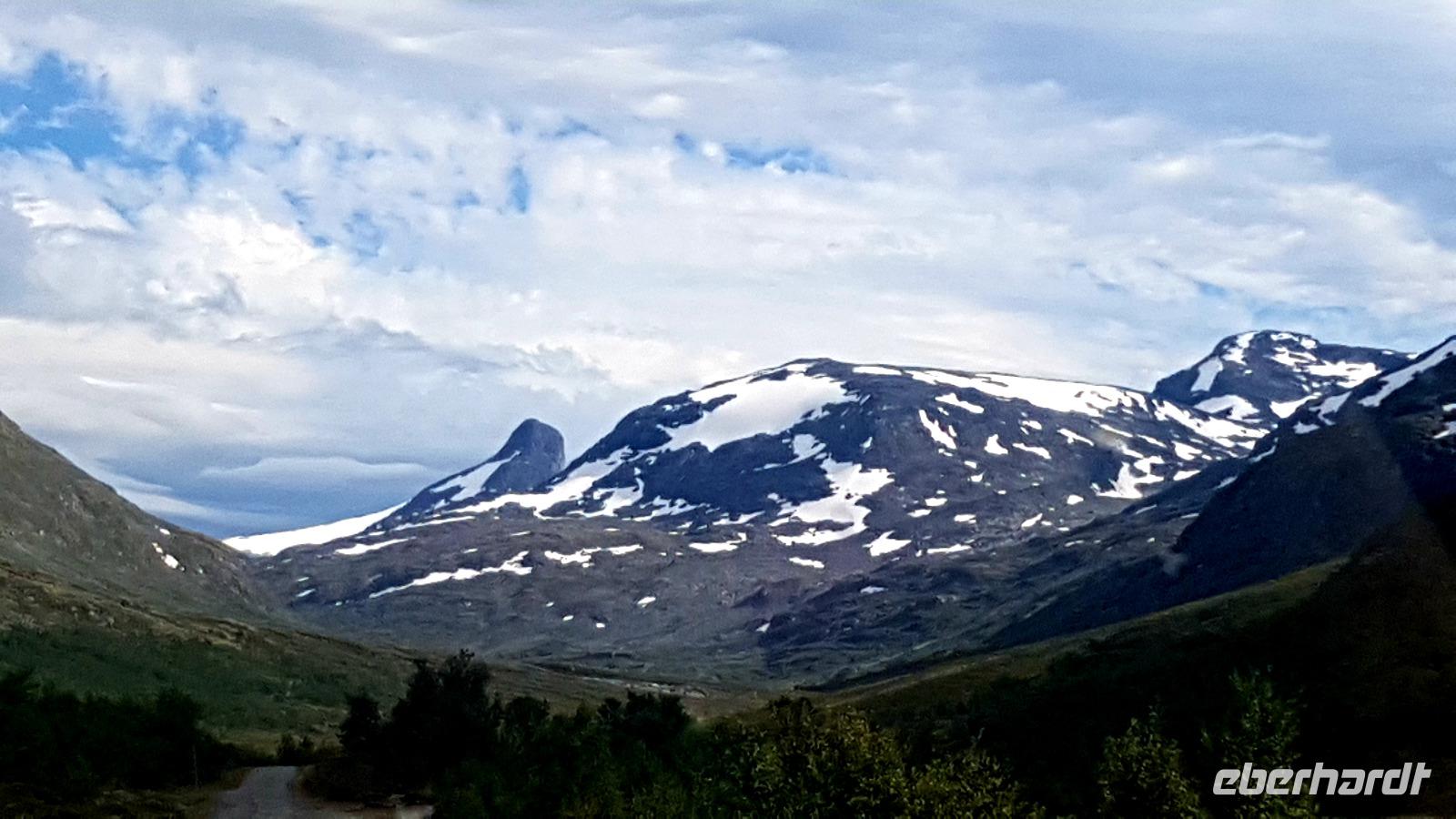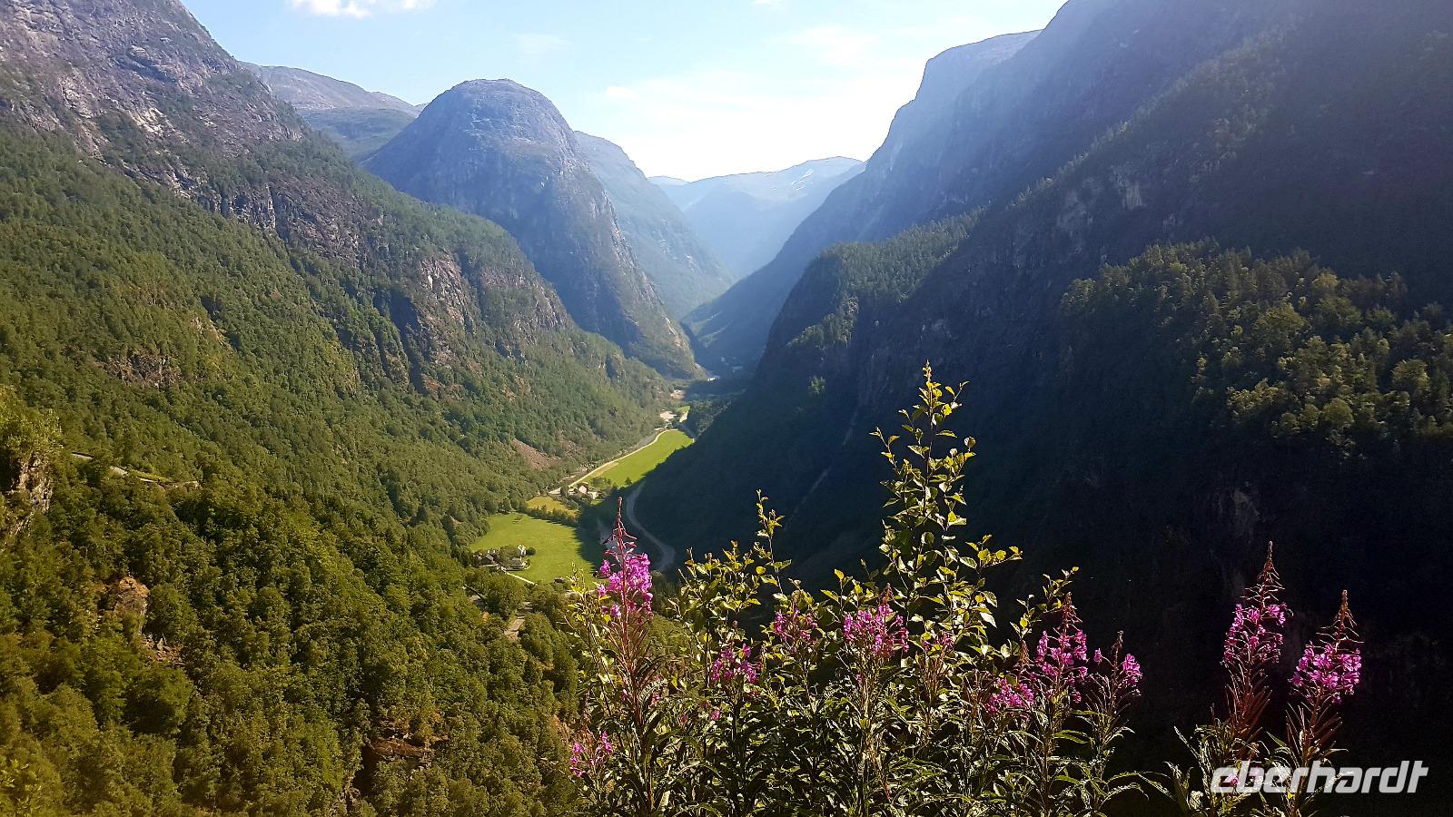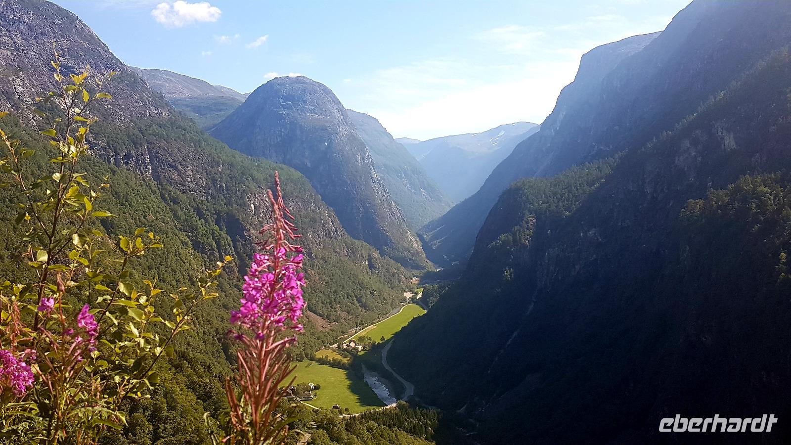 Da wir mit unserem, über 13 m langen Bus nicht zum Aussichtspunkt, Stegastein, die Serpentinen hinauf fahren dürfen, geht es nun zum Hotel Stahlheim. Von der Terrasse des Hotels haben wir einen atemberaubenden Blick ins enge Tal. Bei Kaffee und Kuchen gibt es einen reichen Erfahrungsaustausch. Wie alle Gäste feststellen, ein tolles Highlight und Ersatz für die Aussicht vom Stegastein. Serpentinen geht es hinunter, an Gutvagen vorbei, durch Tunnel nach Flåm. Hier am Auerlandsfjord liegt ein Kreuzfahrtschiff vor Anker. Der Ort ist bekannt als Ausgangspunkt für eine wunderschöne Bahn fährt nach Myrdal, wo sicher auch gerade die Kreuzfahrtgäste unterwegs sind. Wir machen hier eine längere Mittagspause, bevor es durch den längste Tunnel Norwegens den Lærdalsrunnel(24,51 km) zur nächsten Fähre fahren. Wir setzen unsere Reise am Sognefjord über Kaupanger und Sogndal fort, hin zur Auffahrt auf das Sognefjell. Hier liegt ein Sommerskigebiet und richtig, wir können die Sportler beim Langlauf beobachten. An interessanten Ausblicken, legen wir immer wieder Fotostopps ein.