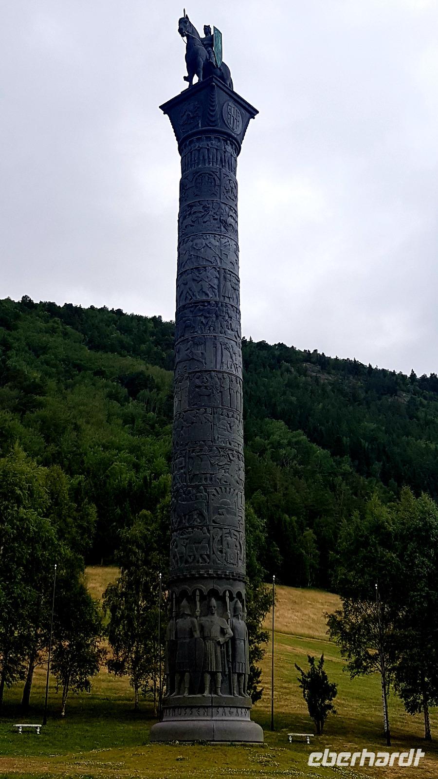 Wehmütig nehmen wir Abschied von diesem herzlichen Stückchen Erde und fahren die 15 km zur Hauptstraße zurück.Es warten ja weitere Highlights auf uns. Am Hotel „Elveseter" steht die Saga-Säule die auf 34 m Höhe die Geschichte Norwegens wieder spiegelt.