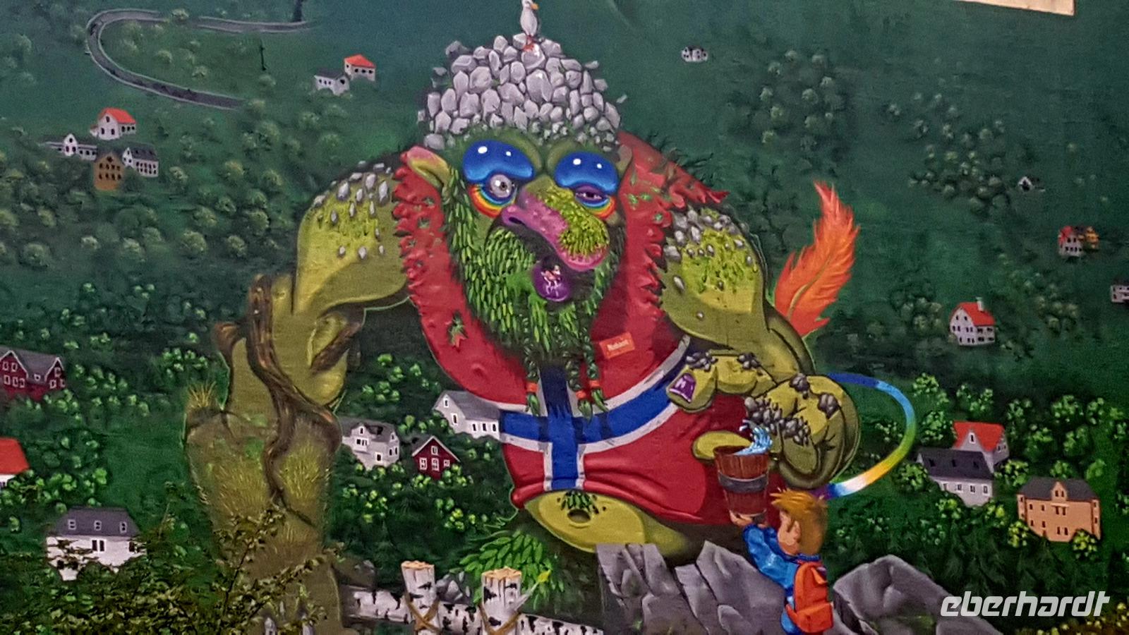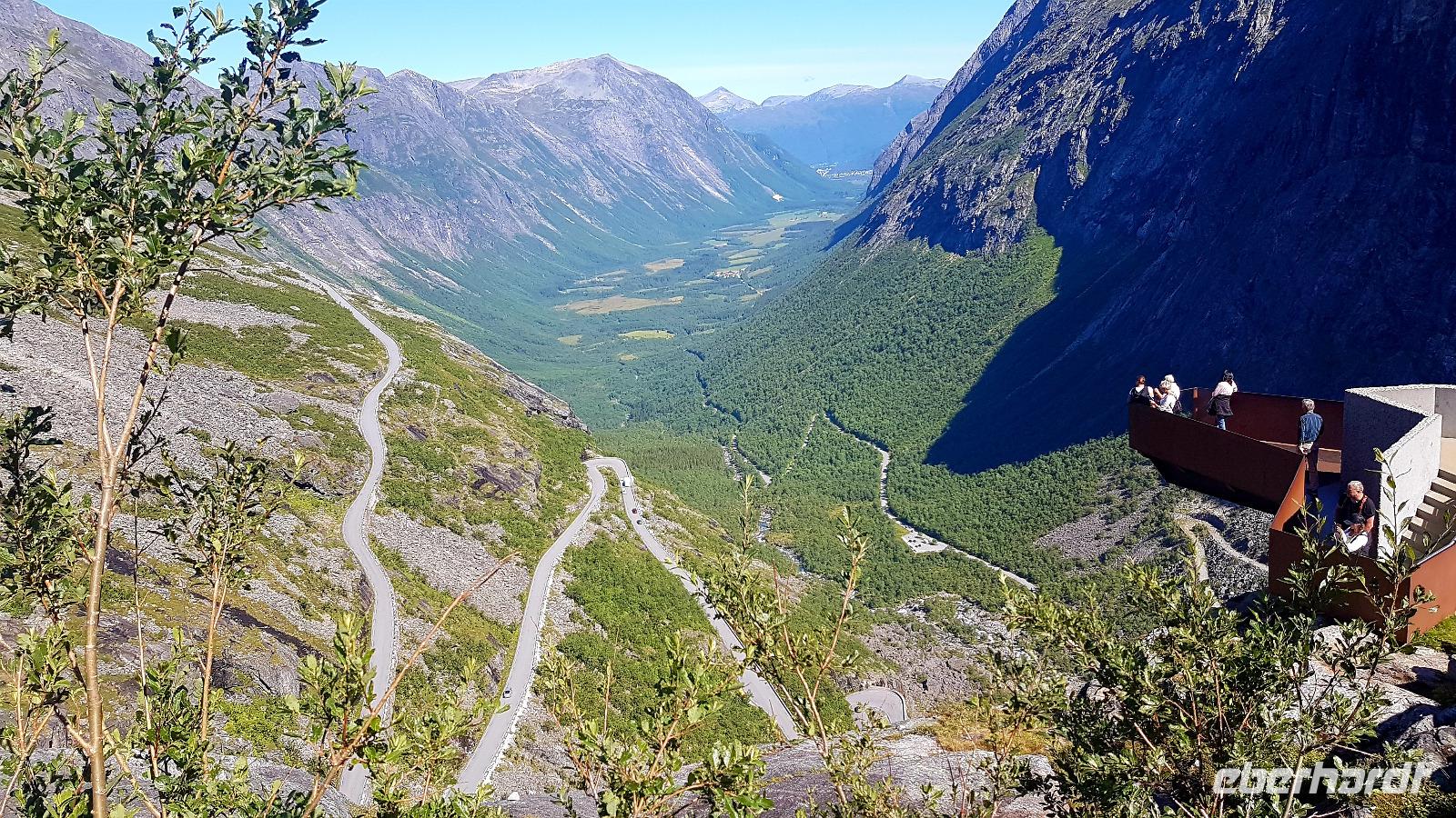Nun können wir schon einmal einen Blick auf die 11 Kehren werfen, die wir dann ins Tal hinunter fahren. Es sieht von oben spektakulär aus, aber für unseren Fahrer Andreas kein Problem. Nun geht es zu der über 1.000 m hohen Trollwand. Man kann die Höhe kaum abschätzen. Fleißig werden im Geschäft Trolle als Souvenirs gekauft.