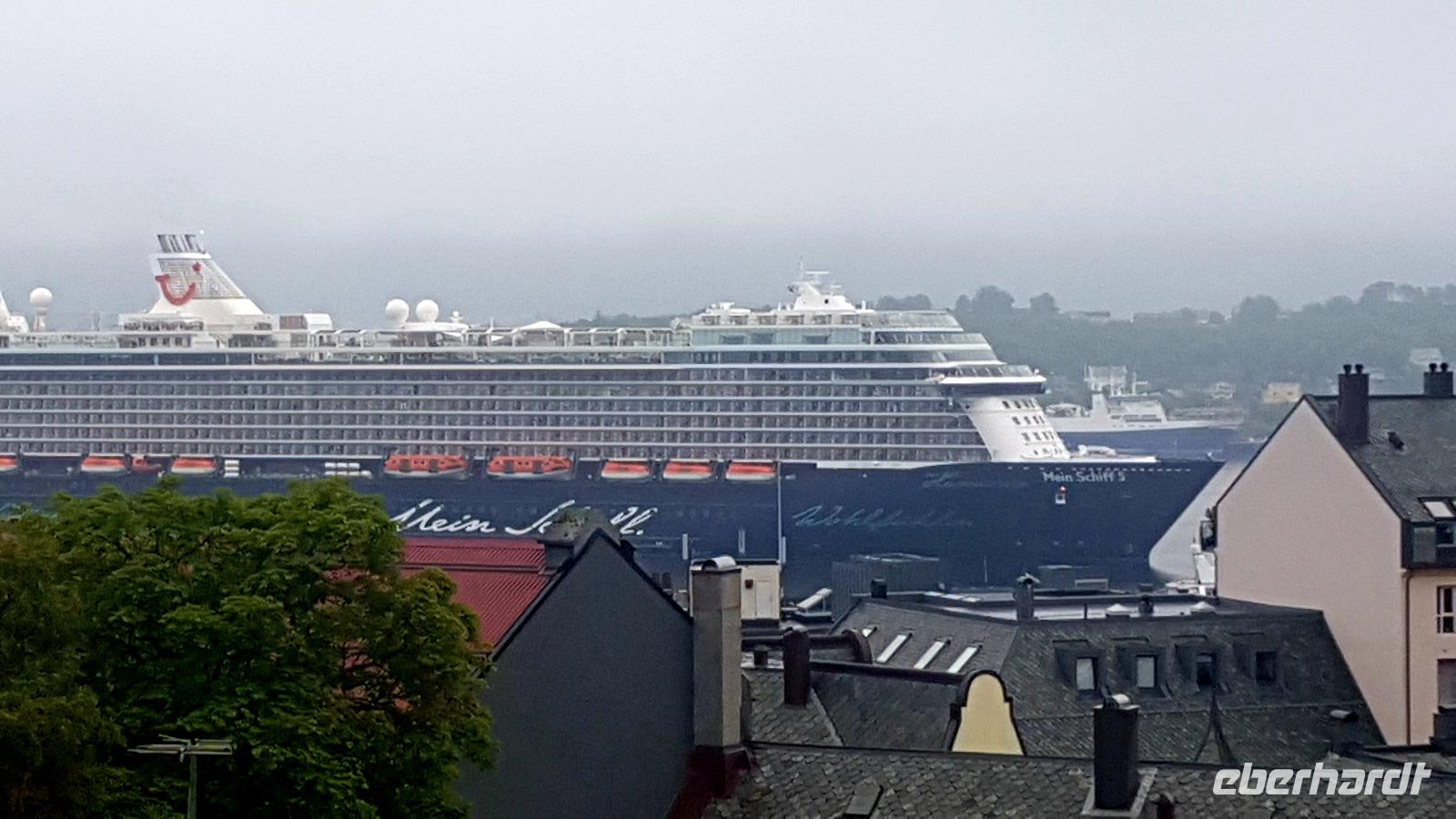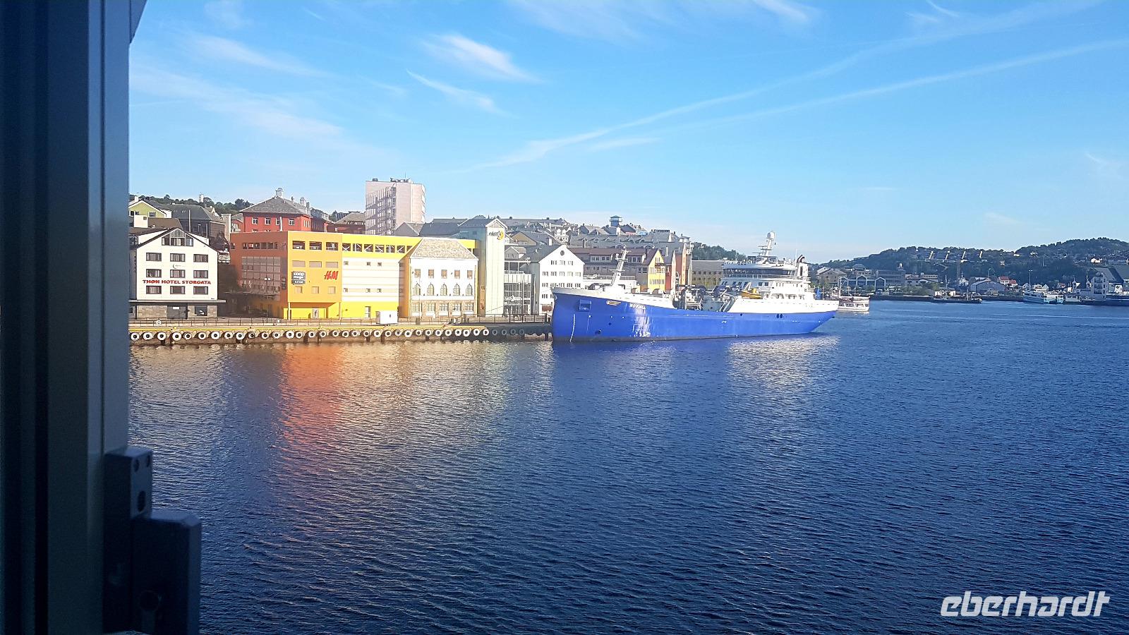 Beim Aufwachen hat sich unser Blick auf Kristiansund verändert. Schiffe liegen im Hafen.