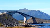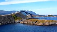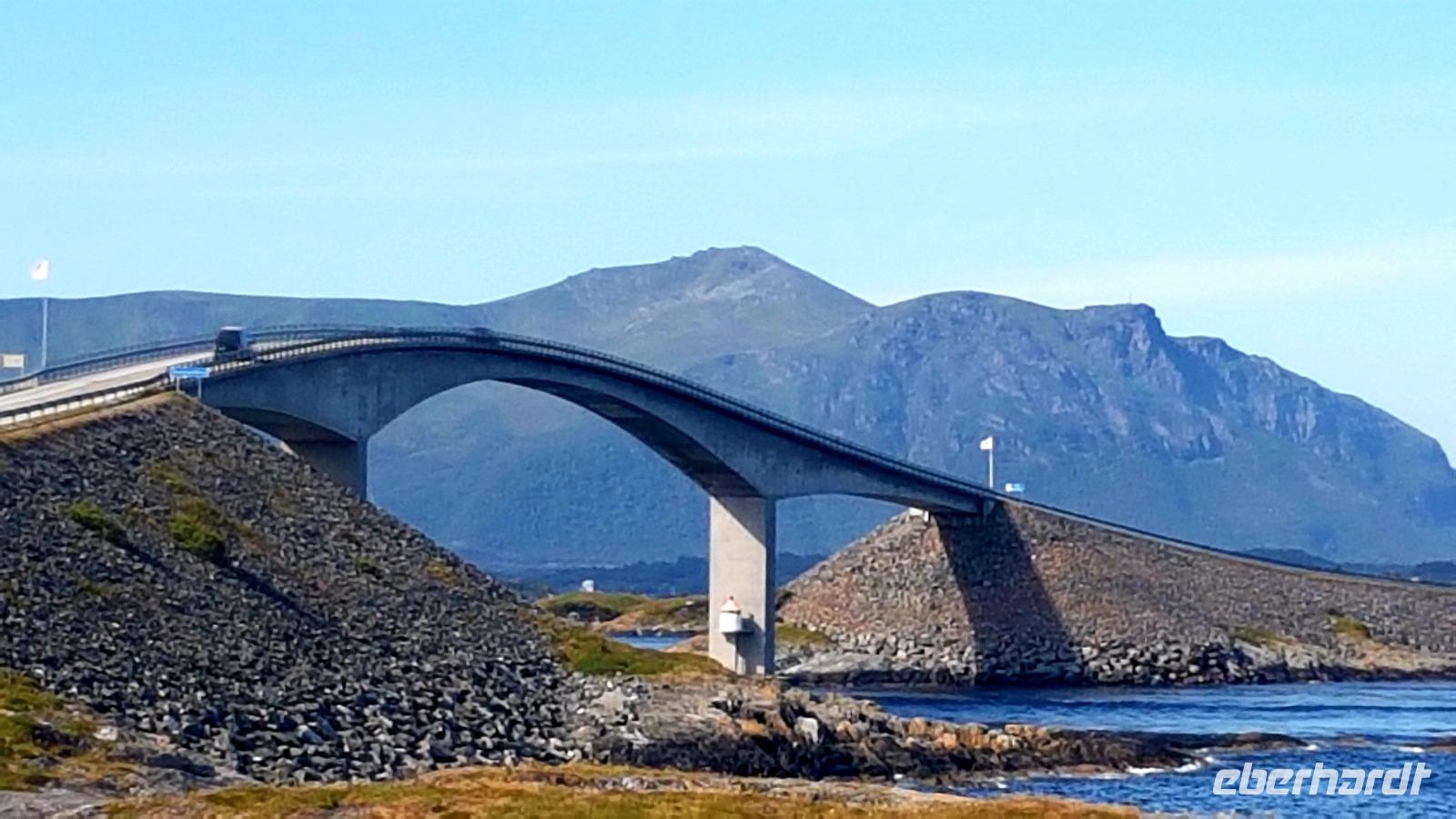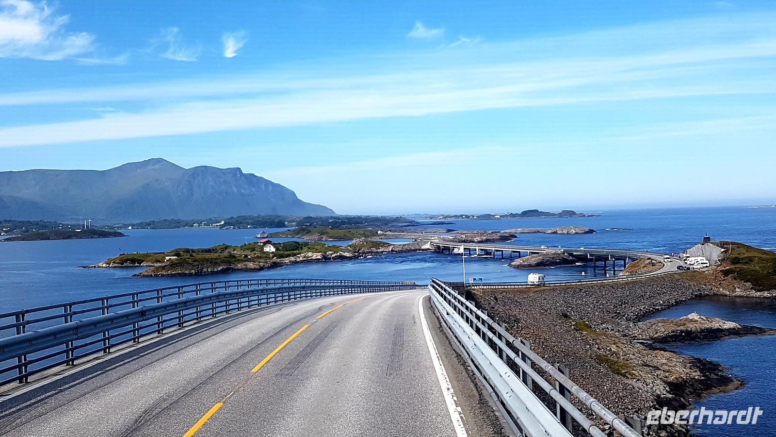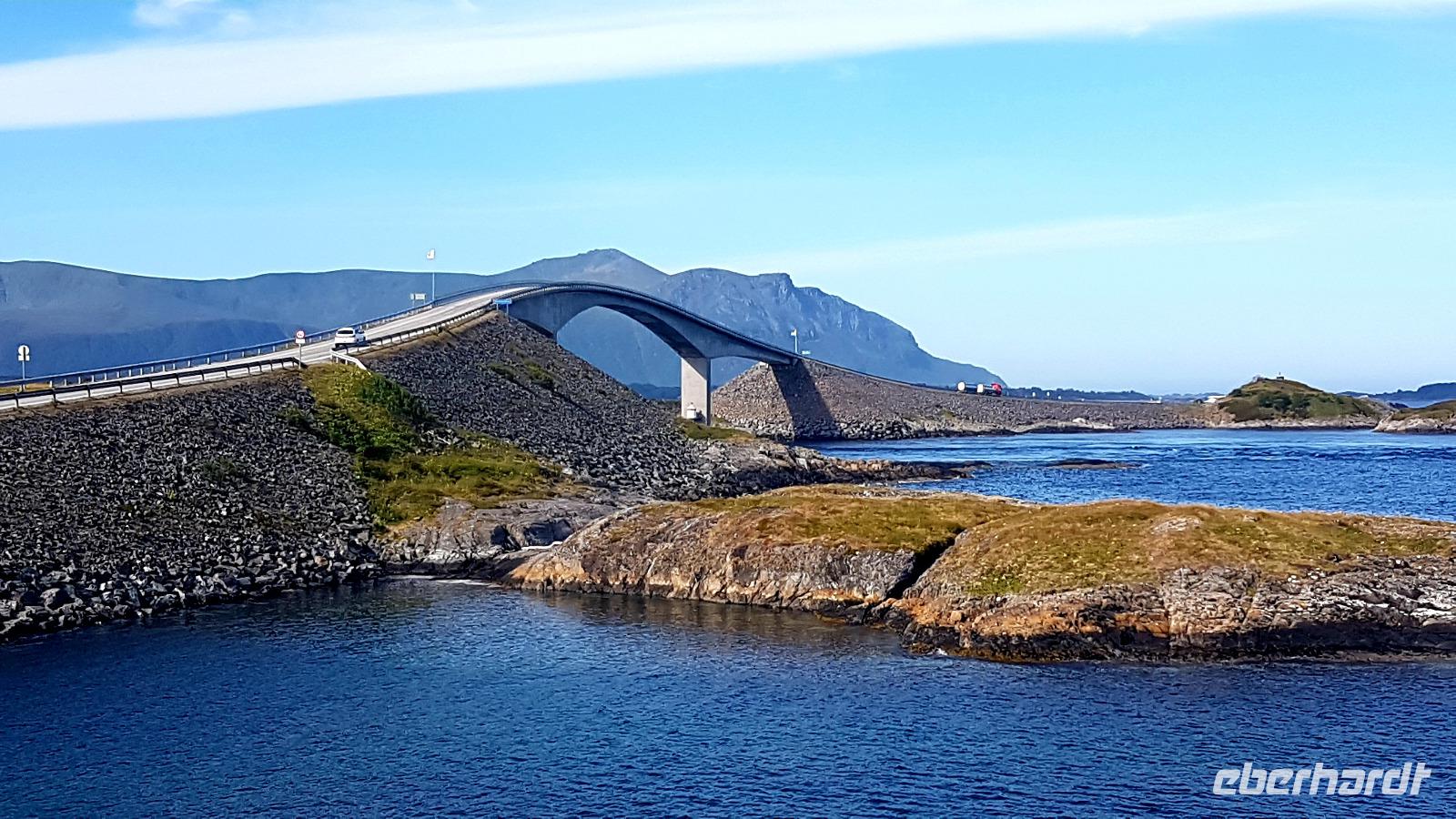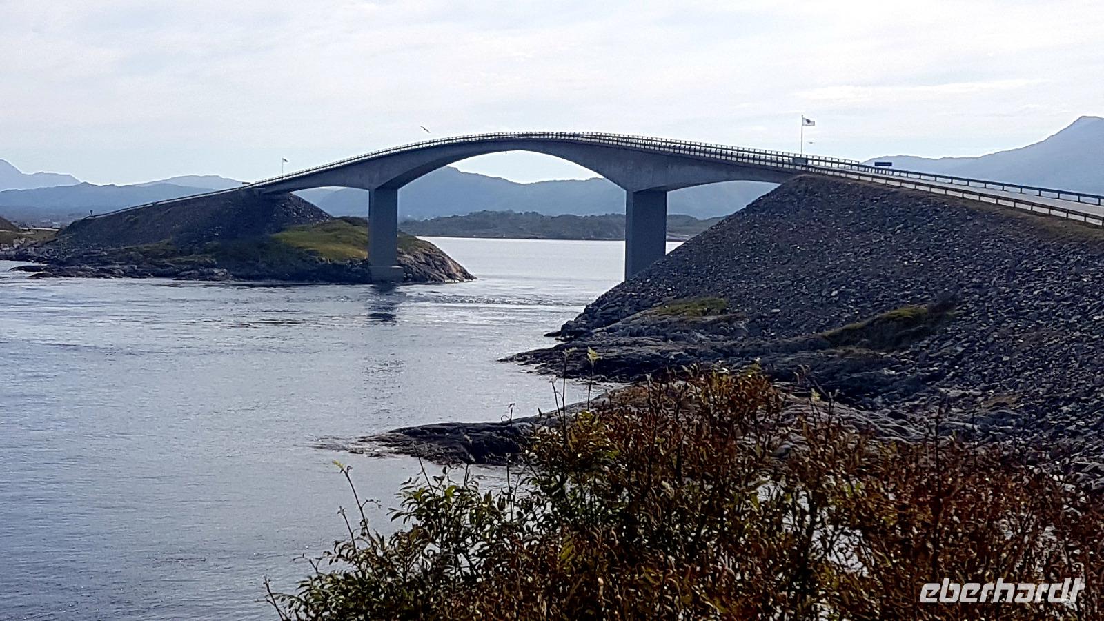 Mehrere Inseln sind mit Brücken verbunden. Bevor wir über die schönste der Brücken, die "Storseisubdbrua" fahren, welche zum Wahrzeichen der Atlantikstraße geworden ist, machdn wir Fotostopps. So spazieren wir auf der Insel Eidhusøya über einen schwebenden Weg einmal um die Insel, die uns viele Fotomotive bietet.