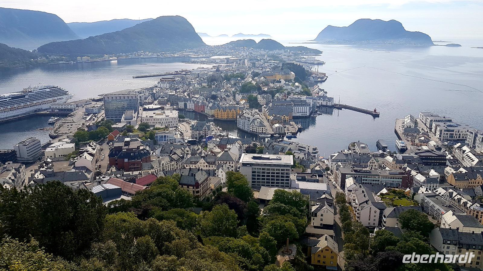 Mit der Fähre setzen wir von Molde in 35 min nach Furneset über, um nach Ålesund zu fahren. Auch hier werfen wir zuerst vom Hausberg, dem Aksla, einen Blick hinunter auf die Stadt, die im 19. Jahrhundert nach einem Stadtrand neu aufgebaut wurde. Die Jugendstilhäuser werden wir uns bei einem Spaziergang noch näher anschauen. Im Hotel „Scandic-Parken" betten wir heute unser müdes Haupt nieder.2