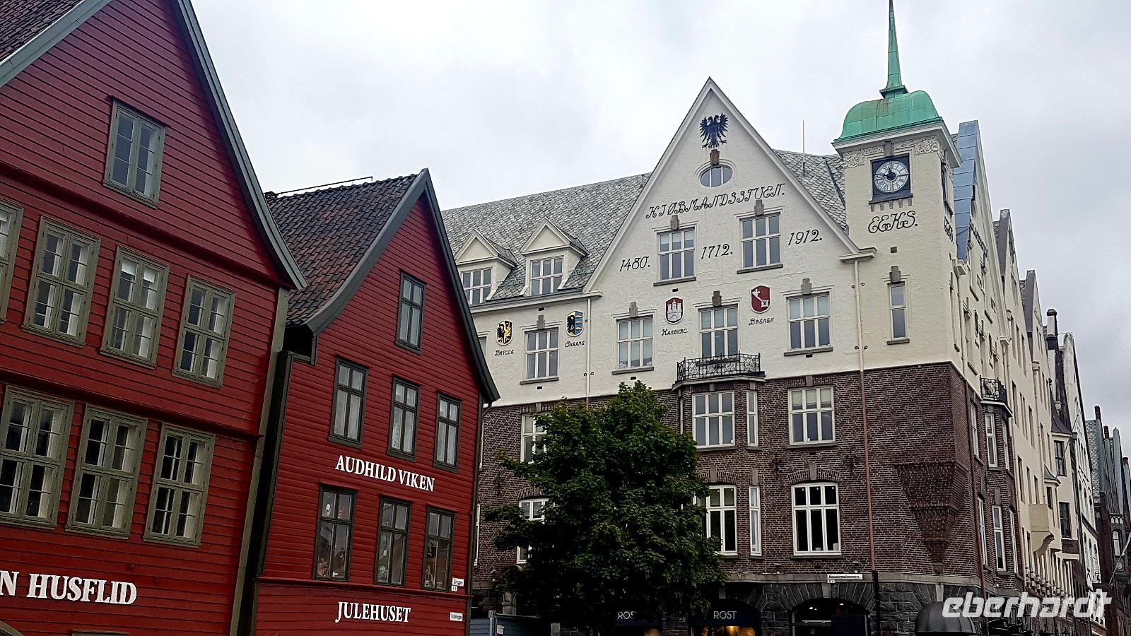 In Bergen angekommen wartet schon unsere Stadtfüherin, Angelika, auf uns. Sie zeigt uns die Sehenswürdigkeiten Bergens, wie das Hanseviertel Bryggen, das
