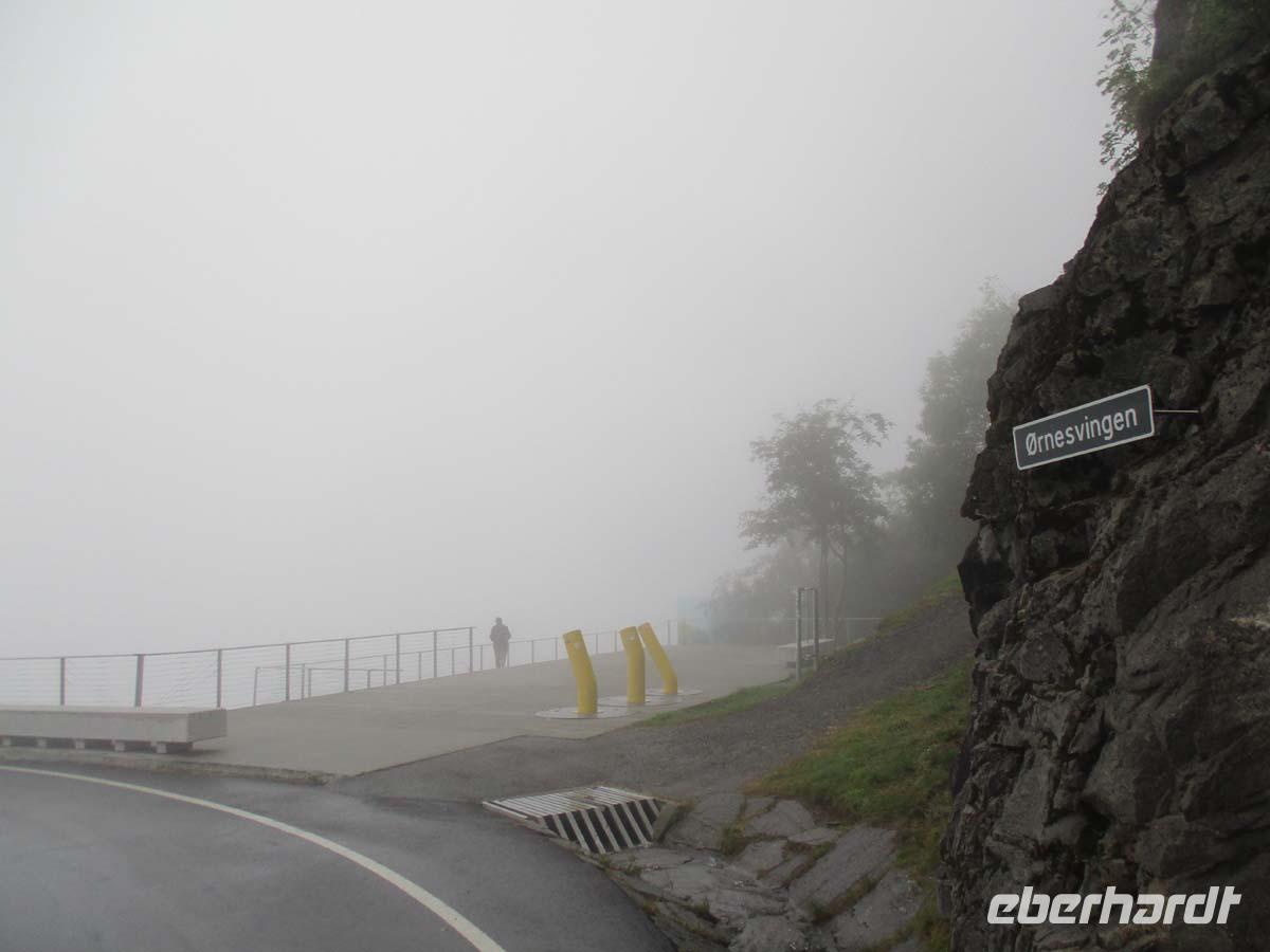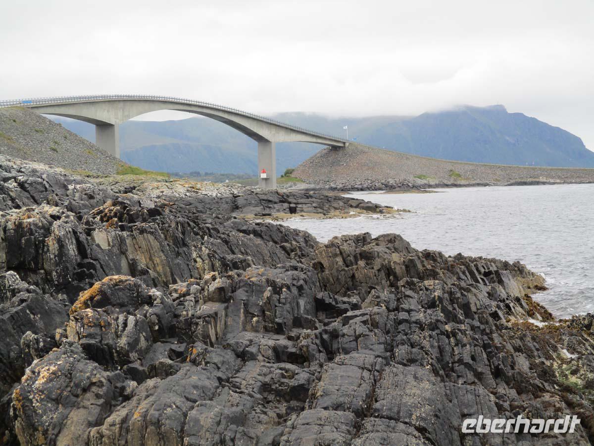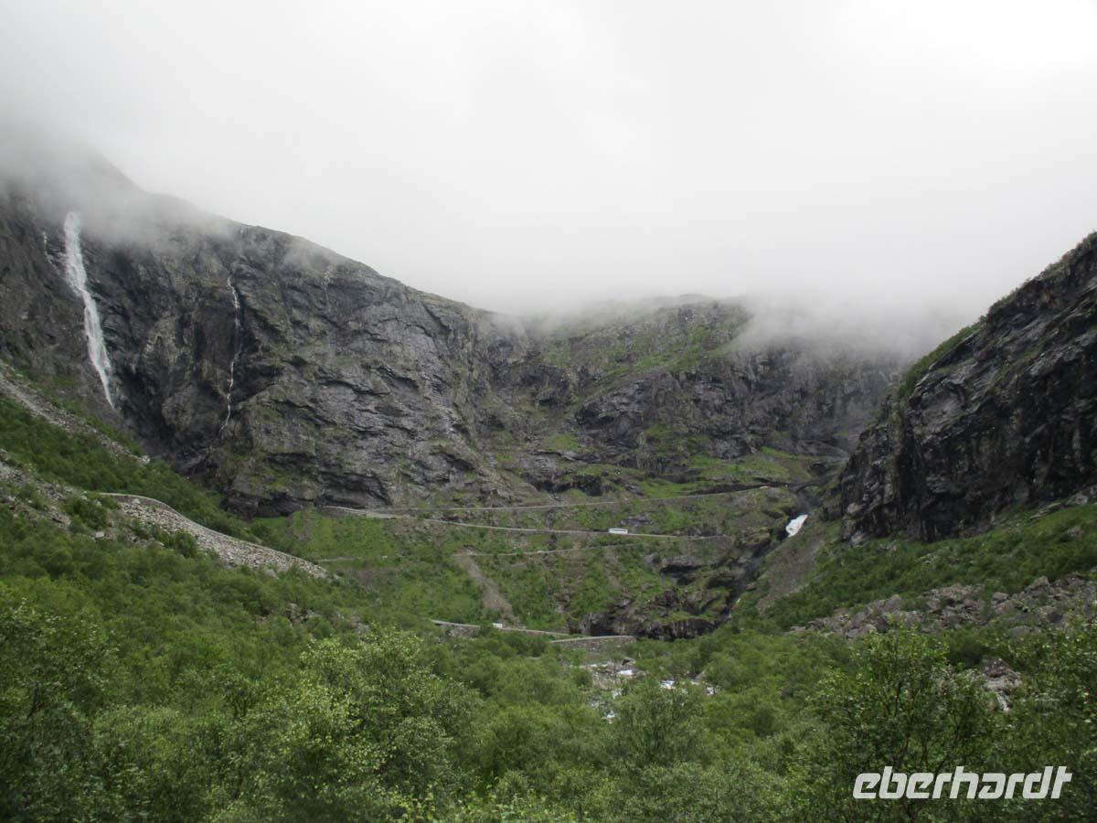 Gleich nach unserer Abfahrt stoppen wir an der Adlerstraße. Vom Aussichtspunkt Oernesvingen hätte man einen phantastischen Blick auf den Fjord nach allen Seiten gehabt, wenn wir nicht mitten in die teif hängenden Wolken gefahren wären. Wasser satt gibt es für uns auch am Grudbrandsjuvet. Es ist eine Klamm, deren Strudel sich bis 25 m tief in den Felsen eingeschliffen haben. Nun ist jedoch der Besuch des Trollstigen angesagt. Doch auch hier umfängt uns dichtester Nebel, der sich auch trotz längeren Aufenthaltes nicht auflösen will. Von der dortigen Aussichtsplattform blicken wir ins Nichts. Das 8 weitere Reisegruppen und unzählige Individualtourísten unser Schicksal teilen, ist da nur ein schwacher Trost. Erst beim Hinabfahren lichten sich die Wolken und geben den Blick auf die engen Serpentinen frei, die noch vor uns liegen. Klar, dass wir auch unten noch einmal einen Stop machen um zu bestaunen, welche Strecke wir gerade bewältigt haben, mit Gefälle bis zu 12 %. Unser Mittag nehmen wir unterhalb der Trollwand ein. Bis zu 1000 m erstreckt sich diese höchste Steilwand Europas teilweise senkrecht nach oben. Von Seilschaften ist sie an einem Tag nicht mehr zu bewältigen und diese müssen in der Wand übernachten. An jene, die es nicht geschafft haben, erinnert ein Denkmal auf dem Parkplatz. Die Spitzen der Wand stellen übrigens die Mützen der Trolle dar, die von einer Hochzeit zu spät nach Hause gingen und von der Sonne getroffen zu Stein erstarrten. Nach einer Pause an der gewaltigen Gjemnesundbrücke erreichen wir am späten Nachmittag Kristiansund. Der Name sagt schon dass sie von dem Dänenkönig Christian (IV) gegründet wurde. Reich wurde sie durch den Klippfisch, der bis in den Mittelmeerraum exportiert wurde und z. B. in Portugal unter dem Namen Bacalao bekannt ist. Das Salzen und Trocknen war reine Frauenarbeit und so hat man diesen im Zentrum der Stadt ein Denkmal gesetzt: Die Klippfischfrau. Unser Hotel liegt direkt am Wasser und fast alle Zimmer haben direkten Blick darauf. Es sind modern umgestaltete alten Hafenspeicher. Hier lässt es sich gut wohnen und vor allem das gute Abendessen genießen.