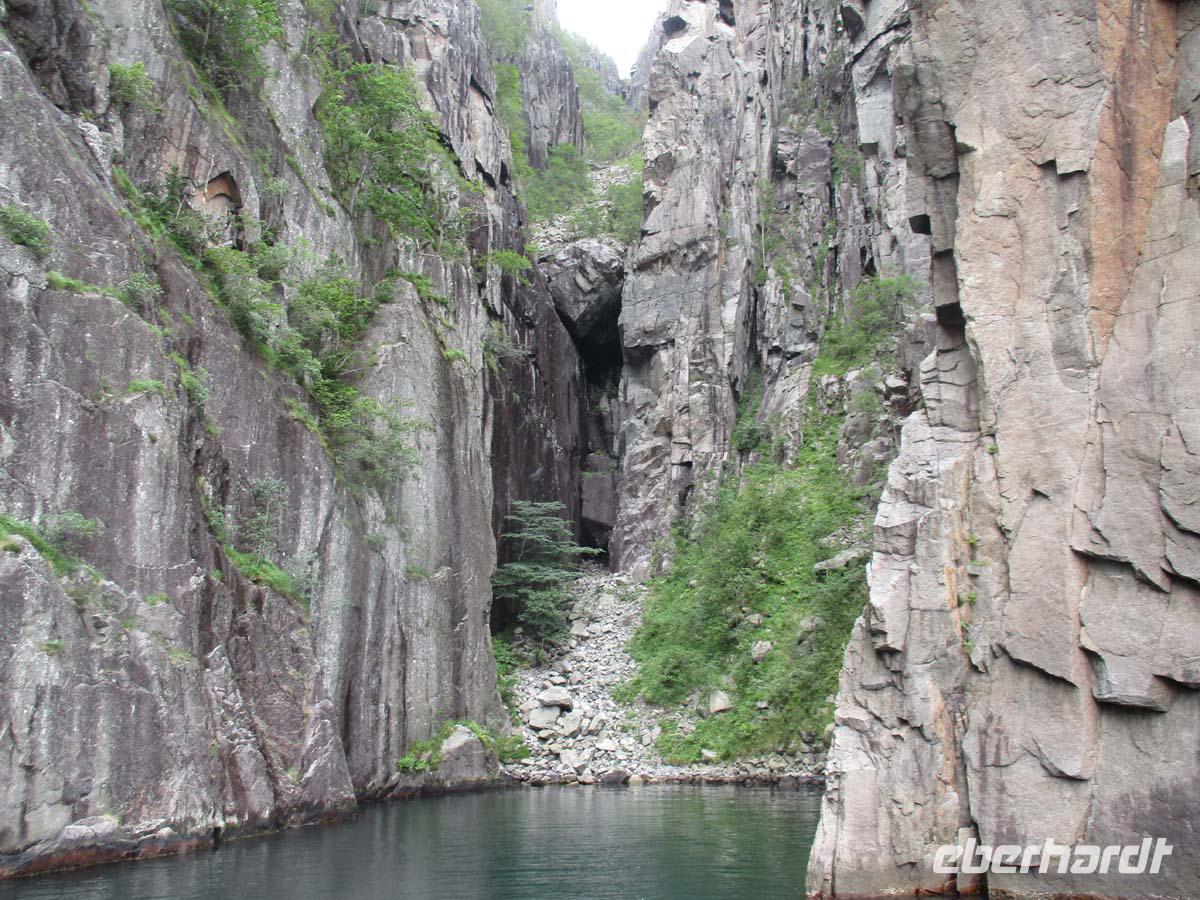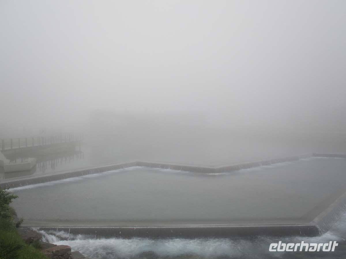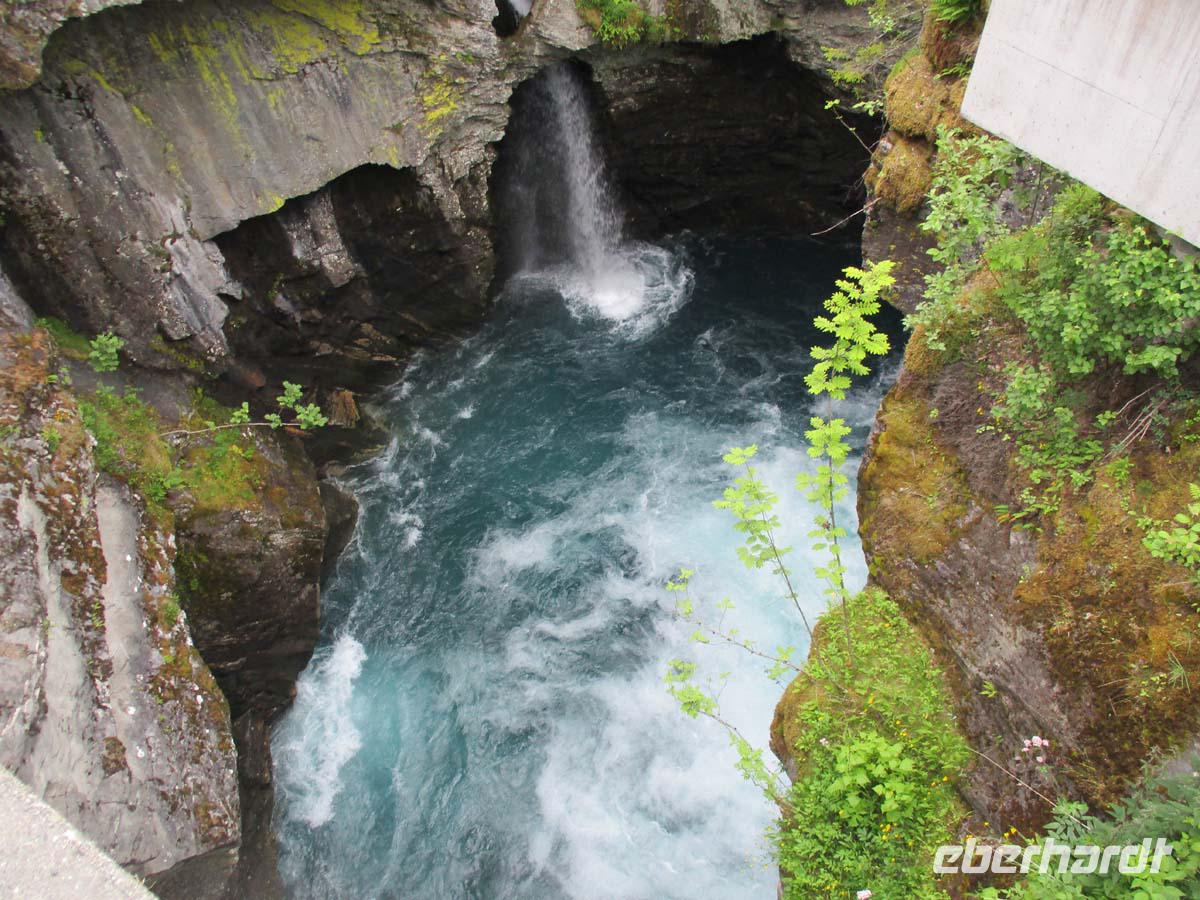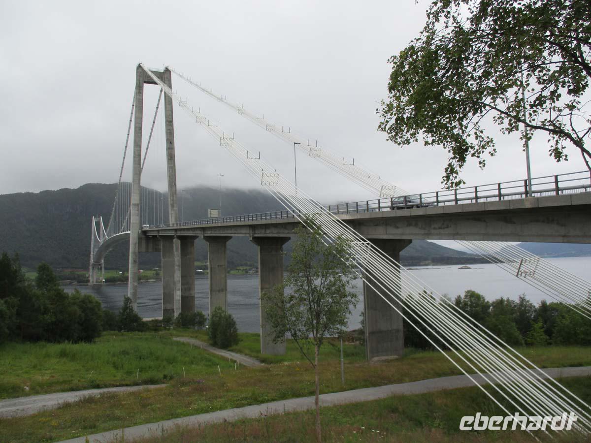 Gleich nach unserer Abfahrt stoppen wir an der Adlerstraße. Vom Aussichtspunkt Oernesvingen hätte man einen phantastischen Blick auf den Fjord nach allen Seiten gehabt, wenn wir nicht mitten in die teif hängenden Wolken gefahren wären. Wasser satt gibt es für uns auch am Grudbrandsjuvet. Es ist eine Klamm, deren Strudel sich bis 25 m tief in den Felsen eingeschliffen haben. Nun ist jedoch der Besuch des Trollstigen angesagt. Doch auch hier umfängt uns dichtester Nebel, der sich auch trotz längeren Aufenthaltes nicht auflösen will. Von der dortigen Aussichtsplattform blicken wir ins Nichts. Das 8 weitere Reisegruppen und unzählige Individualtourísten unser Schicksal teilen, ist da nur ein schwacher Trost. Erst beim Hinabfahren lichten sich die Wolken und geben den Blick auf die engen Serpentinen frei, die noch vor uns liegen. Klar, dass wir auch unten noch einmal einen Stop machen um zu bestaunen, welche Strecke wir gerade bewältigt haben, mit Gefälle bis zu 12 %. Unser Mittag nehmen wir unterhalb der Trollwand ein. Bis zu 1000 m erstreckt sich diese höchste Steilwand Europas teilweise senkrecht nach oben. Von Seilschaften ist sie an einem Tag nicht mehr zu bewältigen und diese müssen in der Wand übernachten. An jene, die es nicht geschafft haben, erinnert ein Denkmal auf dem Parkplatz. Die Spitzen der Wand stellen übrigens die Mützen der Trolle dar, die von einer Hochzeit zu spät nach Hause gingen und von der Sonne getroffen zu Stein erstarrten. Nach einer Pause an der gewaltigen Gjemnesundbrücke erreichen wir am späten Nachmittag Kristiansund. Der Name sagt schon dass sie von dem Dänenkönig Christian (IV) gegründet wurde. Reich wurde sie durch den Klippfisch, der bis in den Mittelmeerraum exportiert wurde und z. B. in Portugal unter dem Namen Bacalao bekannt ist. Das Salzen und Trocknen war reine Frauenarbeit und so hat man diesen im Zentrum der Stadt ein Denkmal gesetzt: Die Klippfischfrau. Unser Hotel liegt direkt am Wasser und fast alle Zimmer haben direkten Blick darauf. Es sind modern umgestaltete alten Hafenspeicher. Hier lässt es sich gut wohnen und vor allem das gute Abendessen genießen.