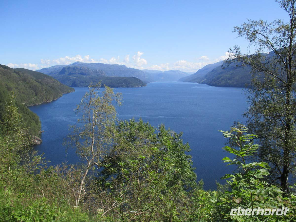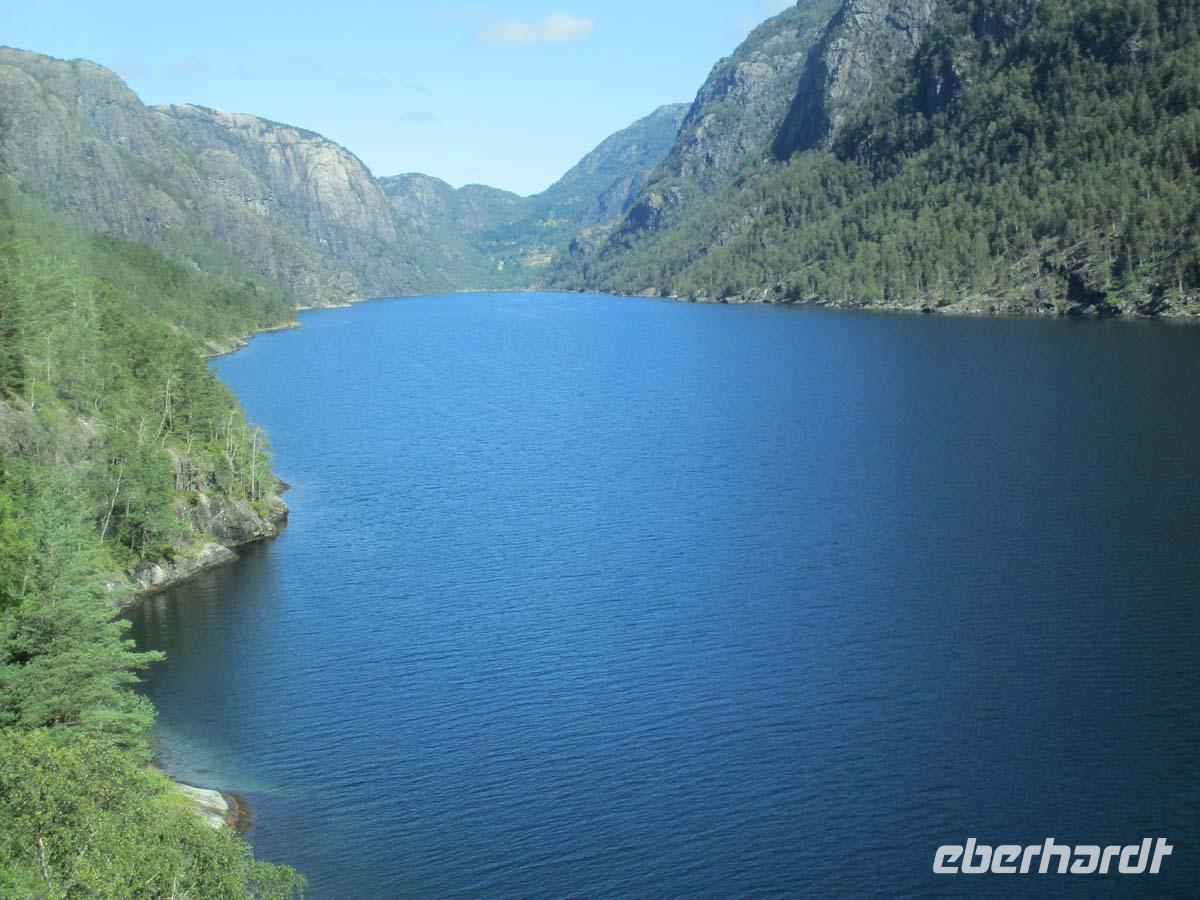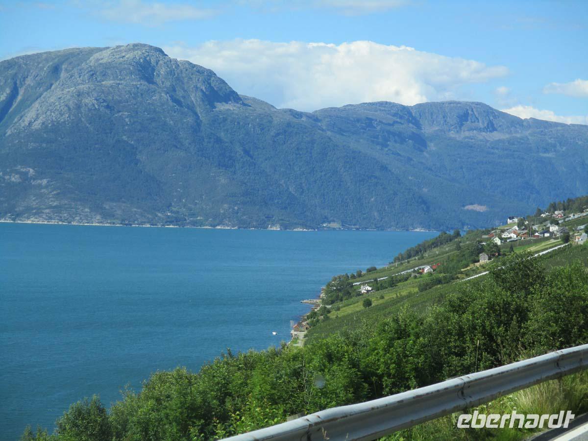 Nach dem Frühstück setzen wir mit der Fähre nach Tau über, das schon in der Landschaft Ryfylke liegt und zur Region Rogaland gehört. Kurze Zeit später überqueren wir mit einer weiteren Fähre den Jösenfjord um unsere Reise auf der Landschaftsroute Ryfylke fortzusetzen. Diese Landschaftsstraße wurde 2011 als touristisches Projekt geschaffen, wegen der vielfältigen Naturschönheiten und Landschaften, welche sie durchquert. Sie gehört nun zu den insgesamt 18 „grünen Straßen" Norwegens, die touristisch gut erschlossen und landschaftlich wunderschön sind. Einen ersten Stop legen wir an der Erfjordbrücke am gleichnamigen Fjord ein und einen zweiten gleich danach beim berühmten Dreifjordeblick gegenüber von Sand. Hier können wir gleich drei Fjorde erblicken. Den Sand-, den Hyls- und den Saudafjord. Ein paar Minuten weiter erwartet uns dann der mächtige Wasserfall Svandalsfossen. 180 m stürzt er in die Tiefe und nässt die Straße mit seiner mächtigen Gischt ein. Wir bleiben heute jedoch trocken. Hinter Sauda erklimmen wir das Saudafjjell, also die Hochebene. Hier liegen noch Schneefelder auf den über 1200 m hohen Gipfeln. Die Straße erreicht an Ihrer höchsten Stelle 978m. Auf der Weiterreise machen wir Halt am Latefoss, einem mächtigen Zwillingswasserfall. Hier ist mächtig was los, denn er liegt genau neben der Nationalstraße 13Hernach passieren wir Odda, die heimliche Hauptstadt der Landschaft Hardanger. Kaiser Wilhelm II hat sich hier ab 1891 sehr gerne und jedes Jahr aufgehalten. Odda liegt am Ende des Sörfjords, der wiederum ein Seitenarm des mächtigen Hardangerfjords ist. An den Südhängen des Sörfjords wird sehr viel Obst angebaut und überall kann man nun Erdbeeren kaufen. Mit den vielen Apfel- und Kirschbäumen an steilen Hängen, dem azurblauen Fjordwasser und den Schnee bedeckten Gipfeln fühlt man sich fast an Tirol oder den Gardasee erinnert. Sodann erreichen wir unser Hotel in Kinsarvik. Dieser Ort wartet mit einer besonderen Sehenswürdigkeit auf: Einer Steinkirche, die zwischen 1150 und 1160 errichtet wurde und im Innern noch Fresken dem Mittelalter zeigt, die bei Restaurierungen freigelegt wurden. Wer möchte, kann nach dem Abendmenü auch noch baden gehen, denn eine Badestelle befindet sich direkt gegenüber des Hotels. Ein Fjordspaziergang in der lauen Abendsonne tut es aber auch.