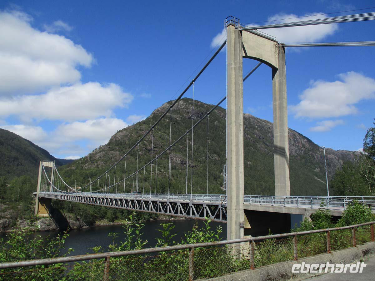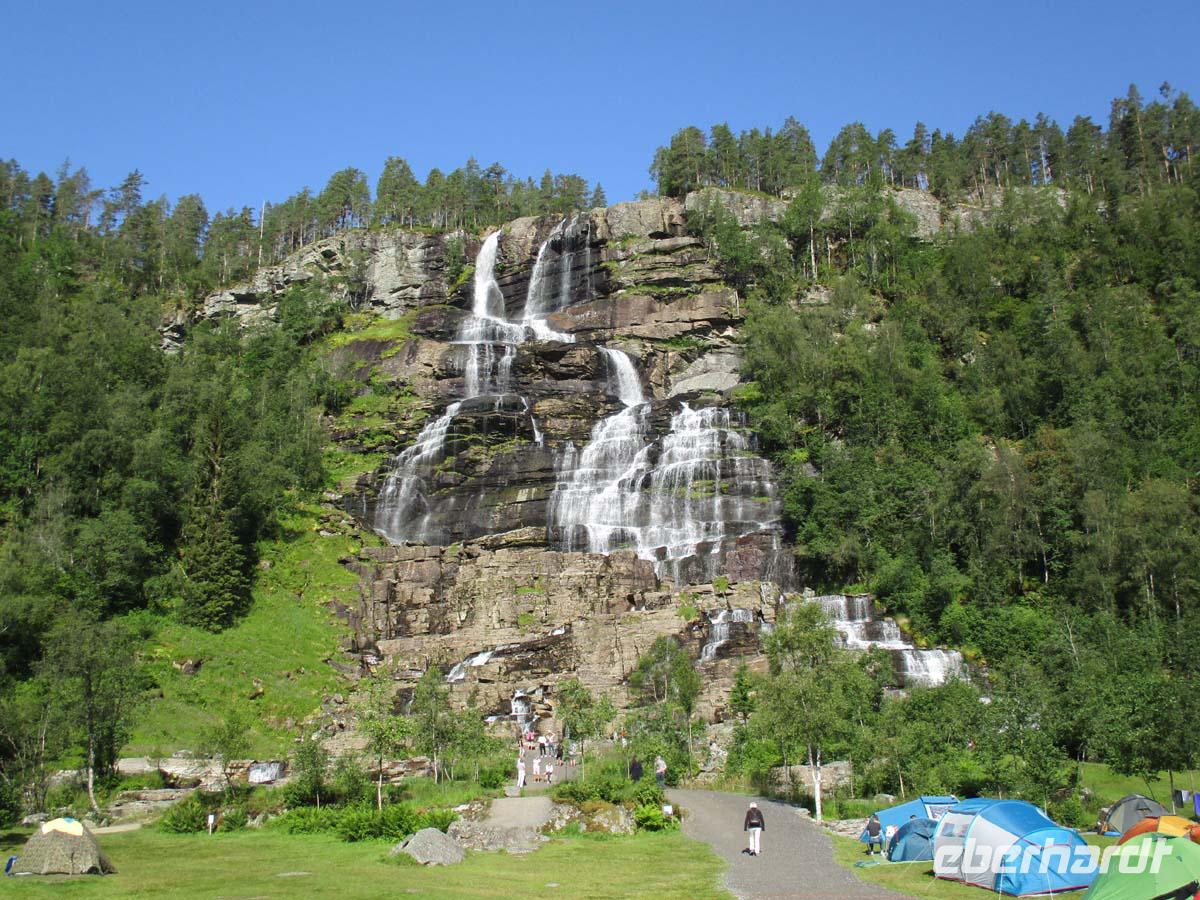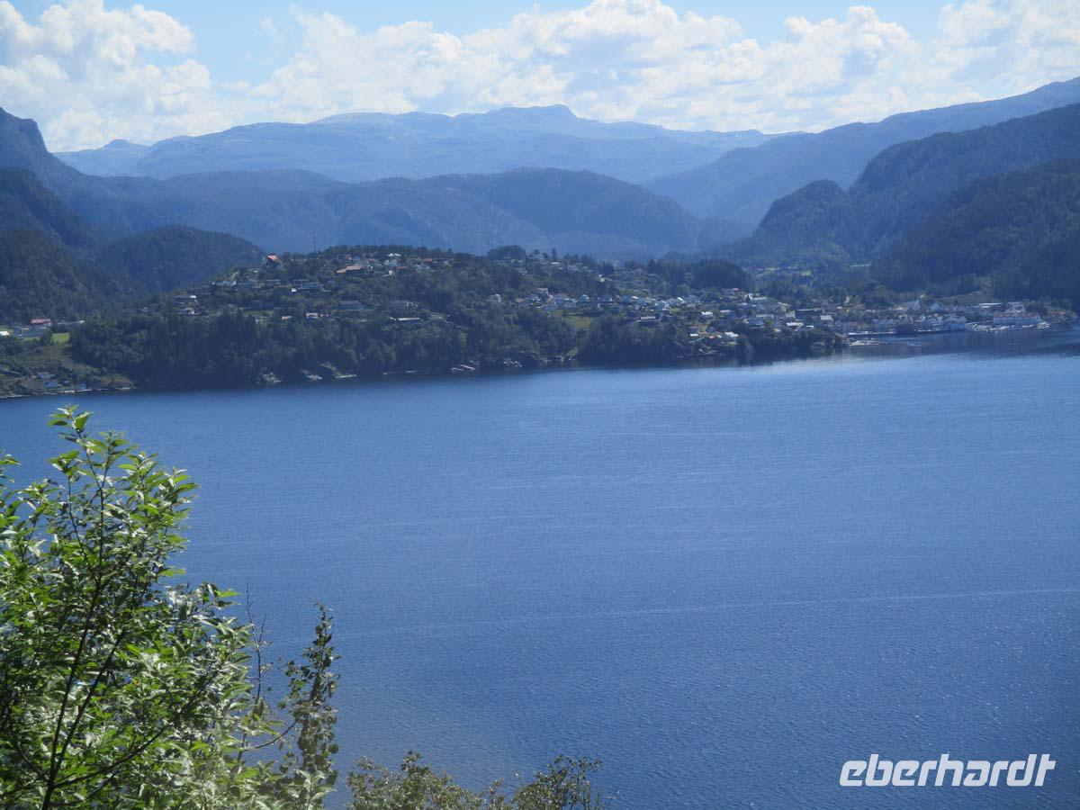 Nach dem Frühstück setzen wir mit der Fähre nach Tau über, das schon in der Landschaft Ryfylke liegt und zur Region Rogaland gehört. Kurze Zeit später überqueren wir mit einer weiteren Fähre den Jösenfjord um unsere Reise auf der Landschaftsroute Ryfylke fortzusetzen. Diese Landschaftsstraße wurde 2011 als touristisches Projekt geschaffen, wegen der vielfältigen Naturschönheiten und Landschaften, welche sie durchquert. Sie gehört nun zu den insgesamt 18 „grünen Straßen" Norwegens, die touristisch gut erschlossen und landschaftlich wunderschön sind. Einen ersten Stop legen wir an der Erfjordbrücke am gleichnamigen Fjord ein und einen zweiten gleich danach beim berühmten Dreifjordeblick gegenüber von Sand. Hier können wir gleich drei Fjorde erblicken. Den Sand-, den Hyls- und den Saudafjord. Ein paar Minuten weiter erwartet uns dann der mächtige Wasserfall Svandalsfossen. 180 m stürzt er in die Tiefe und nässt die Straße mit seiner mächtigen Gischt ein. Wir bleiben heute jedoch trocken. Hinter Sauda erklimmen wir das Saudafjjell, also die Hochebene. Hier liegen noch Schneefelder auf den über 1200 m hohen Gipfeln. Die Straße erreicht an Ihrer höchsten Stelle 978m. Auf der Weiterreise machen wir Halt am Latefoss, einem mächtigen Zwillingswasserfall. Hier ist mächtig was los, denn er liegt genau neben der Nationalstraße 13Hernach passieren wir Odda, die heimliche Hauptstadt der Landschaft Hardanger. Kaiser Wilhelm II hat sich hier ab 1891 sehr gerne und jedes Jahr aufgehalten. Odda liegt am Ende des Sörfjords, der wiederum ein Seitenarm des mächtigen Hardangerfjords ist. An den Südhängen des Sörfjords wird sehr viel Obst angebaut und überall kann man nun Erdbeeren kaufen. Mit den vielen Apfel- und Kirschbäumen an steilen Hängen, dem azurblauen Fjordwasser und den Schnee bedeckten Gipfeln fühlt man sich fast an Tirol oder den Gardasee erinnert. Sodann erreichen wir unser Hotel in Kinsarvik. Dieser Ort wartet mit einer besonderen Sehenswürdigkeit auf: Einer Steinkirche, die zwischen 1150 und 1160 errichtet wurde und im Innern noch Fresken dem Mittelalter zeigt, die bei Restaurierungen freigelegt wurden. Wer möchte, kann nach dem Abendmenü auch noch baden gehen, denn eine Badestelle befindet sich direkt gegenüber des Hotels. Ein Fjordspaziergang in der lauen Abendsonne tut es aber auch.