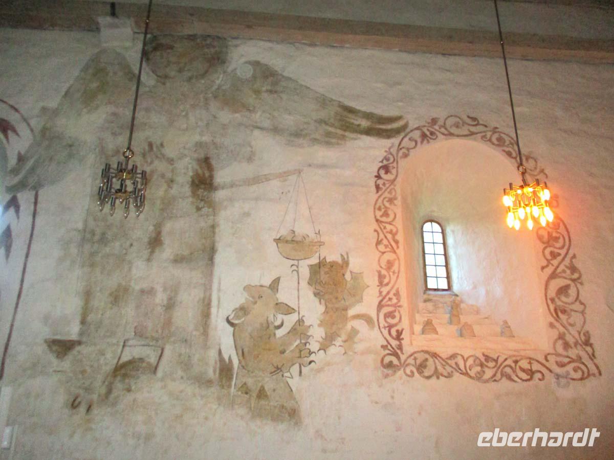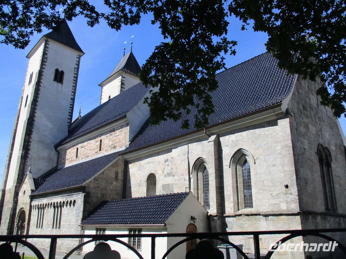 Nach einer Fährfahrt von Halheim nach Sandvik halten wir uns in Haugesund auf. Hier befindet sich das vermeintliche Grab des Reichsgründers Harald Schönhaar, der 972 die südlichen Kleinkönigreiche unterwarf und so die Basis für die mittelalterliche Reichsgründung Norwegens schuf. Der riesige Grabhügel wurde zur 1000 Jahrfeier der Schlacht am Hafrsfjord mit einem großen Obelisken verziert. Drum herum stehen Steine aus allen 29 historischen Provinzen Norwegens. Jedes norwegische Schulkind von Oslo bis Trondheim wird hier hingeschleppt. Es kennen also (fast) alle. An die Wirren der Religionsveränderung vom germanischen Glauben an das neue Christentum zeugt ein frühchristliches Kreuz auf einem Hügel nebenan. Der Königshof befindet sich nur einige Kilometerweiter in Avaldsnes. Nur die Kirche ist hier noch gut erhalten. Jedoch sind in der Landschaft noch Reste mächtiger Wälle zu erkennen. Neben der Kirche befindet sich ein Bautastein, der sich mit über 6 m Höhe gefährlich nah zur Kirchenwand neigt. Man sagt, dass Norwegen untergeht, wenn er die Kirchenwand berührt. Vielleicht ist deshalb schon ab und zu etwas von seiner Spitze abgeschlagen worden. Scherzhaft wird er auch die Nähnadel Mariens genannt. Uns bleibt leider der Blick wegen Renovierungsarbeiten versperrt. Aber als Eratz zieh ich noch ein Überraschungsei aus dem Ärmel: Das Kloster Utstein. Am Nachmittag erreichen wir wieder Stavanger, wo wir unsere Fluggäste herzlich verabschieden. Nach einem frühen Abendessen reisen wir nunmehr mit geringerer Anzahl nach Tananger, wo wir unsere Nachtfähre nach Dänemark besteigen.
