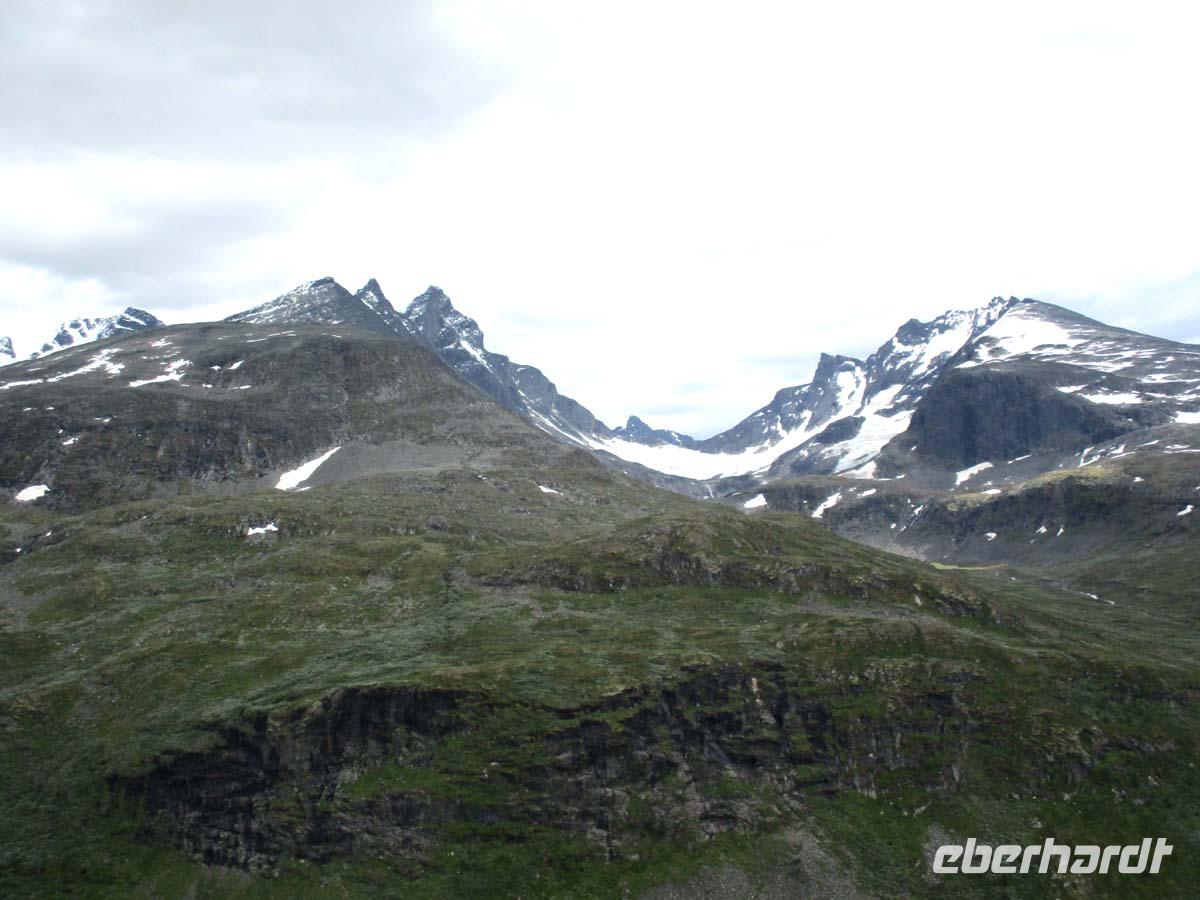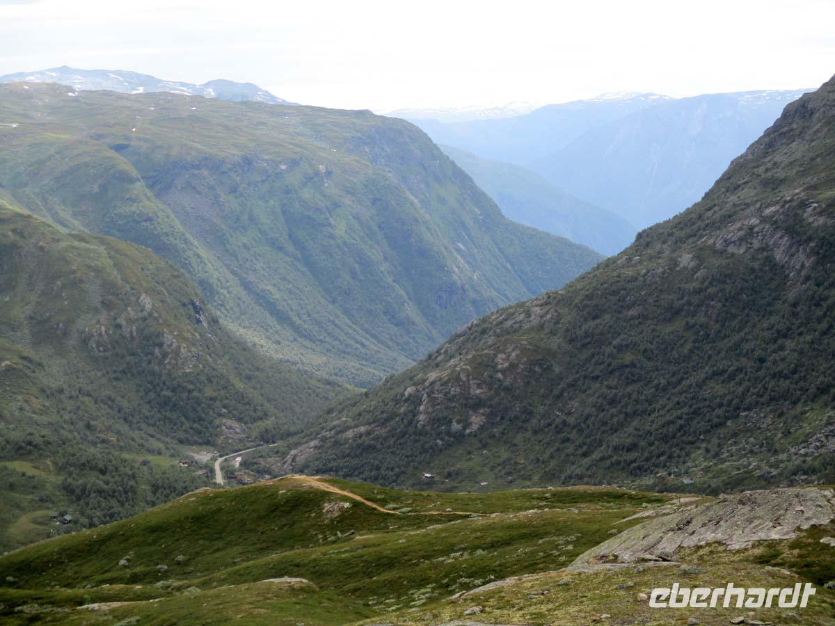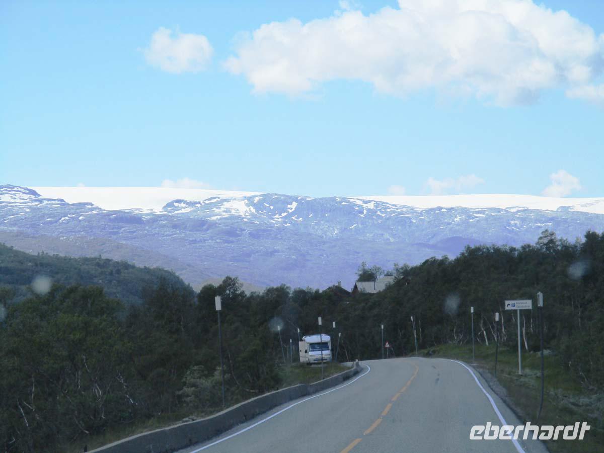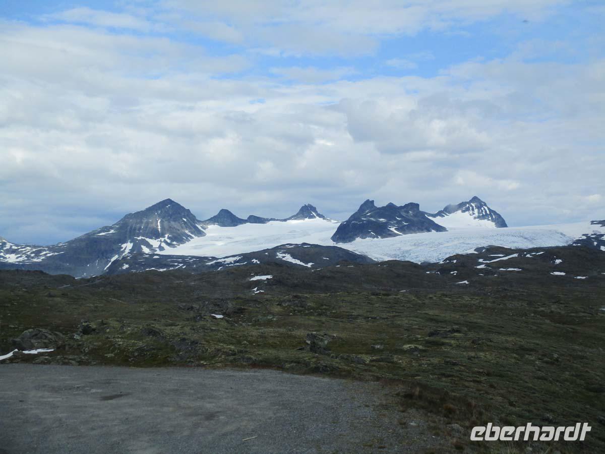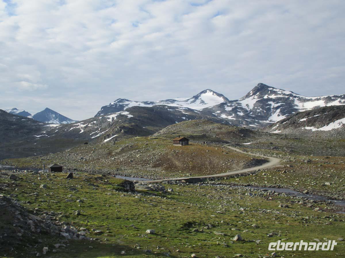 Ein erster Stop an der Hardangerbrücke ist Pflicht. Die größte Brücke Norwegens und die zehntlängste Hängebrücke der Welt besticht durch ihre über 202 m hohen Pylone. Erreichen kann man sie nur durch einen Tunnel, in welchem sich die Reichsstraße 16 mit einer weiteren in einem futuristisch lila angestrahlten Kreisel unter Tage trifft. Am Tvinnefossen halten wir nach einem Tankstop in Voss ein drittes Mal. Dass sein Wasser gut gegen Potenzstörungen sei, glauben vor allem Besucher aus Japan und Russland und füllen sich gerne Flaschen mit diesem Nass ab. Nach einem weiteren Halt in Flam am Auerlandsfjord erklimmen wir die steilen Serpentinen zum 670 m hohen Aussichtspunkt Stegasteinen. Tatsächlich ist die Sicht von hier oben spektakulär. Wir fahren weiter auf der so genannten Schneestraße über das Auerlandsfjell. Tatsächlich kann hier im Juni noch meterhoch Schnee neben der Straße liegen. Wir aber haben strahlenden Sonnenschein im Juli und allzuviel Schnee liegt auch nicht mehr. Trotzdem ist die Landschaft sehr arktisch anmutend. Wir packen den Tisch raus und lassen und zum Picknick Norwegisches Brot, Butter und dick Moltebeermarmelade schmecken. Hinter Gaupne erklimmen wir das noch recht verschneite Sognefjell mit seiner kargen, nur von Steinen, Moosen und Flechten überzogenen Landschaft. An einem Aussichtspunkt liegen uns majestätisch die schroffen Gipfel von Jotunheimen gegenüber. Bald biegen wir ab ins Leirdalen. Hier führt eine schmale Piste, teils nur aus Schotter zu unserem urtümlichen Hotel, eher eine luxuriöse Wanderhütte, direkt unter dem Massiv des Galdhöppigen, dem höchsten Berg Skandinaviens. Urwüchsige Natur pur umfängt uns. Sämtliche Zivilisationsgeräusche sind verschwunden. Nur die Geräusche von Wind und rauschendem Wasser hört man des Nachts. Ein Erlebnis, das sehr selten geworden ist. Nach dem sättigenden Abendmenue zwischen viel Wandervolk ist es ein schönes Erlebnis, einfach die Natur und Stille zwischen den schneebedeckten Gipfeln der 2000er um uns herum auf sich wirken zu lassen.
