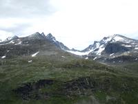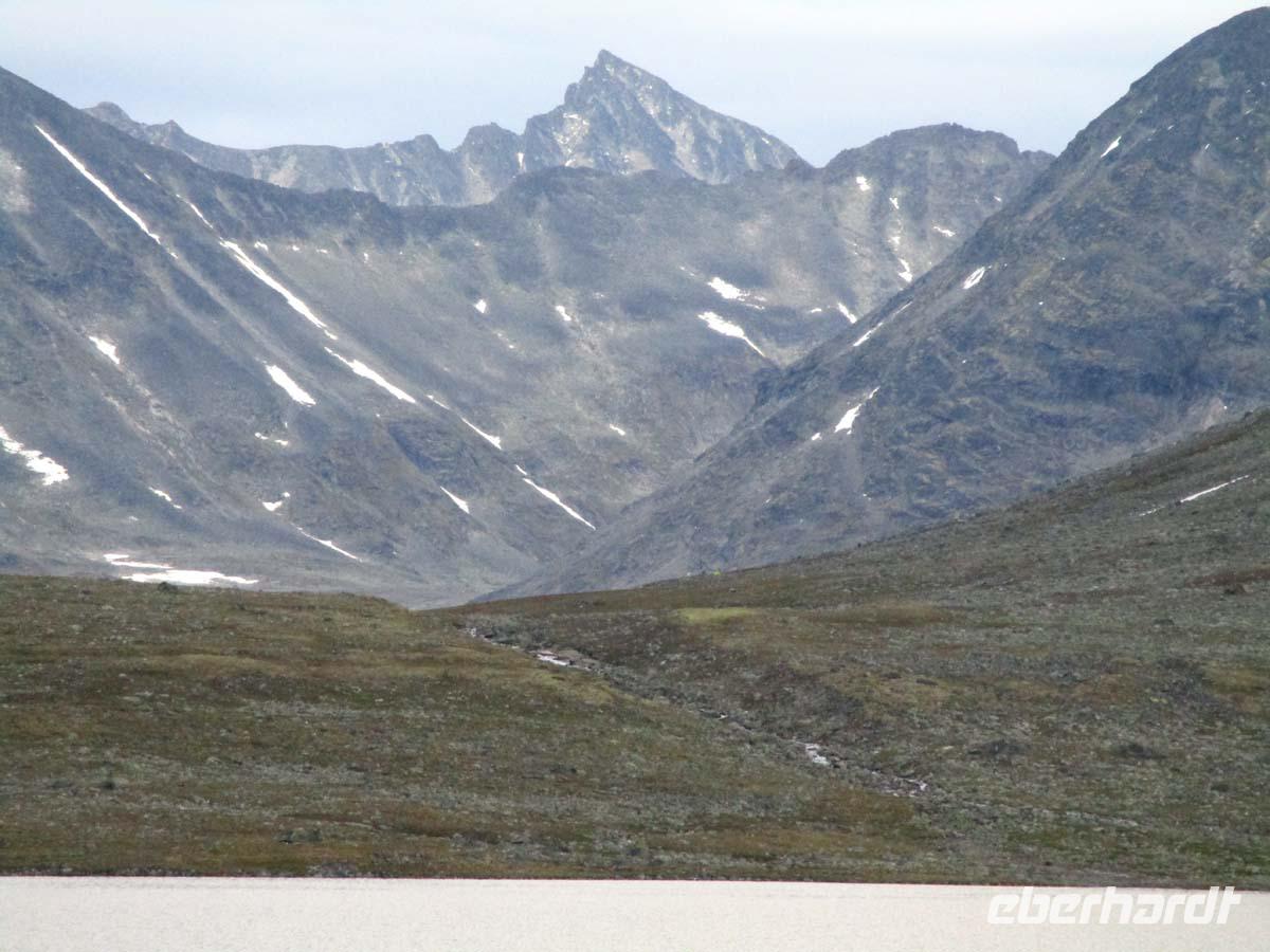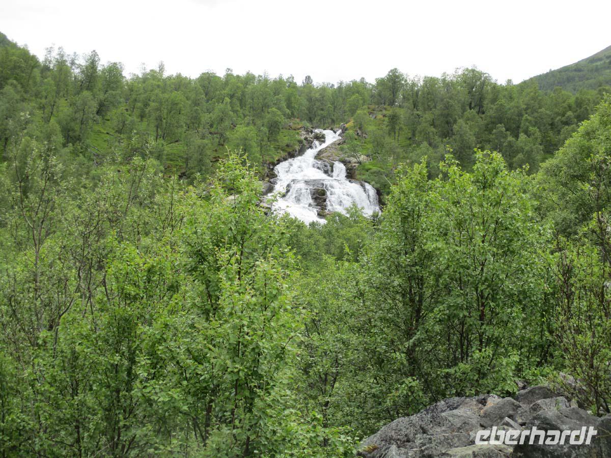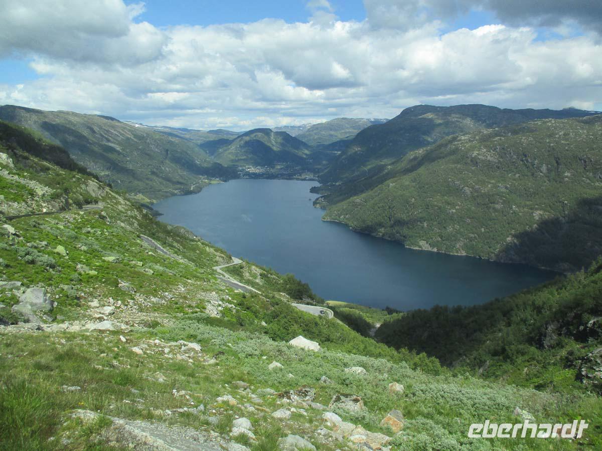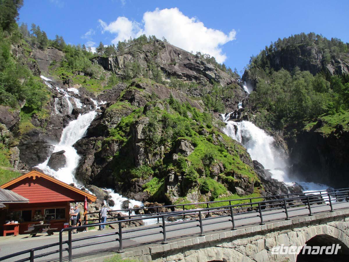Ein erster Stop an der Hardangerbrücke ist Pflicht. Die größte Brücke Norwegens und die zehntlängste Hängebrücke der Welt besticht durch ihre über 202 m hohen Pylone. Erreichen kann man sie nur durch einen Tunnel, in welchem sich die Reichsstraße 16 mit einer weiteren in einem futuristisch lila angestrahlten Kreisel unter Tage trifft. Am Tvinnefossen halten wir nach einem Tankstop in Voss ein drittes Mal. Dass sein Wasser gut gegen Potenzstörungen sei, glauben vor allem Besucher aus Japan und Russland und füllen sich gerne Flaschen mit diesem Nass ab. Nach einem weiteren Halt in Flam am Auerlandsfjord erklimmen wir die steilen Serpentinen zum 670 m hohen Aussichtspunkt Stegasteinen. Tatsächlich ist die Sicht von hier oben spektakulär. Wir fahren weiter auf der so genannten Schneestraße über das Auerlandsfjell. Tatsächlich kann hier im Juni noch meterhoch Schnee neben der Straße liegen. Wir aber haben strahlenden Sonnenschein im Juli und allzuviel Schnee liegt auch nicht mehr. Trotzdem ist die Landschaft sehr arktisch anmutend. Wir packen den Tisch raus und lassen und zum Picknick Norwegisches Brot, Butter und dick Moltebeermarmelade schmecken. Hinter Gaupne erklimmen wir das noch recht verschneite Sognefjell mit seiner kargen, nur von Steinen, Moosen und Flechten überzogenen Landschaft. An einem Aussichtspunkt liegen uns majestätisch die schroffen Gipfel von Jotunheimen gegenüber. Bald biegen wir ab ins Leirdalen. Hier führt eine schmale Piste, teils nur aus Schotter zu unserem urtümlichen Hotel, eher eine luxuriöse Wanderhütte, direkt unter dem Massiv des Galdhöppigen, dem höchsten Berg Skandinaviens. Urwüchsige Natur pur umfängt uns. Sämtliche Zivilisationsgeräusche sind verschwunden. Nur die Geräusche von Wind und rauschendem Wasser hört man des Nachts. Ein Erlebnis, das sehr selten geworden ist. Nach dem sättigenden Abendmenue zwischen viel Wandervolk ist es ein schönes Erlebnis, einfach die Natur und Stille zwischen den schneebedeckten Gipfeln der 2000er um uns herum auf sich wirken zu lassen.