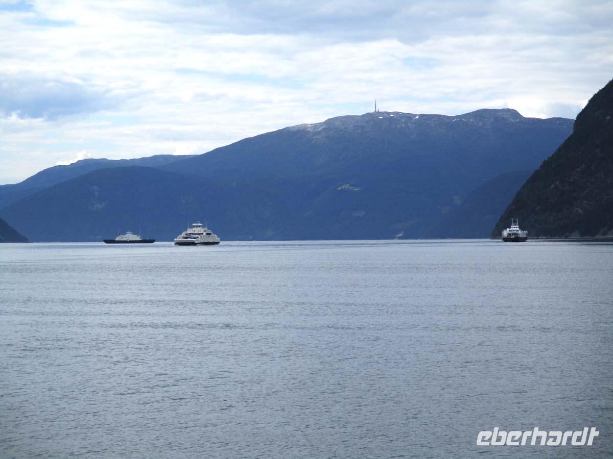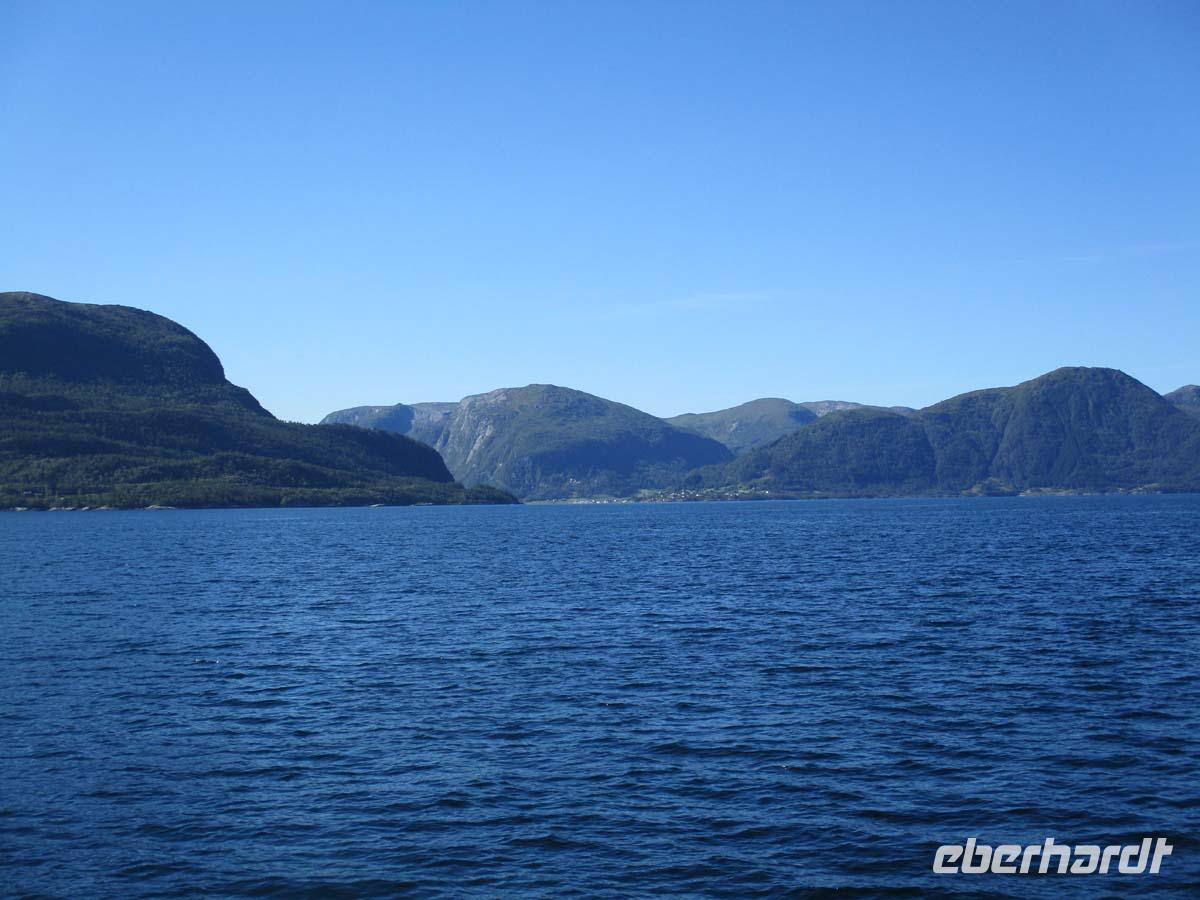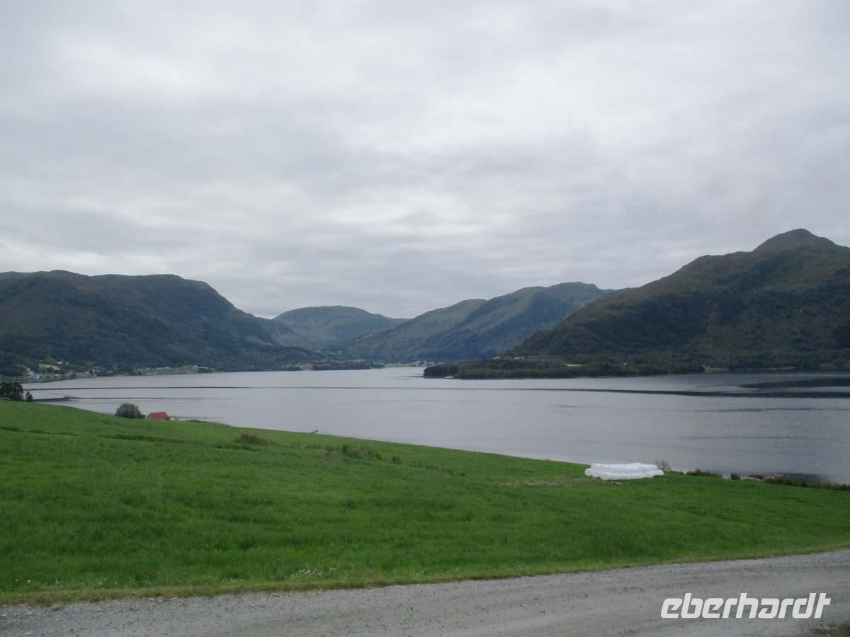 Nachdem wir auf unserer Reise nach Süden mit Fähren den Solafjord und den Rövdalfjord überquert haben, legen wir am Vanlysfjord zunächst eine kurze Pause ein, und können hier schon einen Blick auf die Halbinsel Stadlandet werfen, an deren Ende sich das Vestkap befindet. Auf dem Weg dorthin besuchen wir den kleinen Ort Selje, gegenüber dessen die Insel Selja mit der gleichnamigen Klosterruine liegt. Mit Selje, das sogar einen Sandstrand besitzt, ist eng die heilige Sunniva verbunden, die Schutzheilige von ganz Westnorwegen. Die Sonne scheint und die Landschaft ist lieblich. Wiesen wechseln sich mit hohen Fichtenbeständen ab. Zum Kap geht es steil bergauf und oben pfeift ein guter Wind. Plötzlich finden wir uns mitten in den Wolken wieder und die Sicht ist gleich Null. So beschließen wir spontan, wieder abwärts zu fahren und finden über dem Dorf Arvik einen Platz, wo wir unser Mittag einnehmen, und freien Blick auf Meer und Fjord haben, sowie auf das in den Wolken hängende Vestkap. Der Name Vestkap stimmt nicht so ganz. Man wollte mit dieser Titulierung mehr Touristen in die Gegend locken. Wir fahren auf dem Weg nach Förde ein Stück am 109 km langen Nordfjord mit Mittelgebirgscharakter entlang, bevor wir selbigen auf der Fähre von Starheim nach Isane überqueren. Nach einer Pause am Eickefjord erreichen wir am frühen Abend unser Hotel. Das gute Abendbueffet und das schöne Wetter verlangen geradezu noch nach einem Abendspaziergang, oder dem Genießen auf den Balkonen.