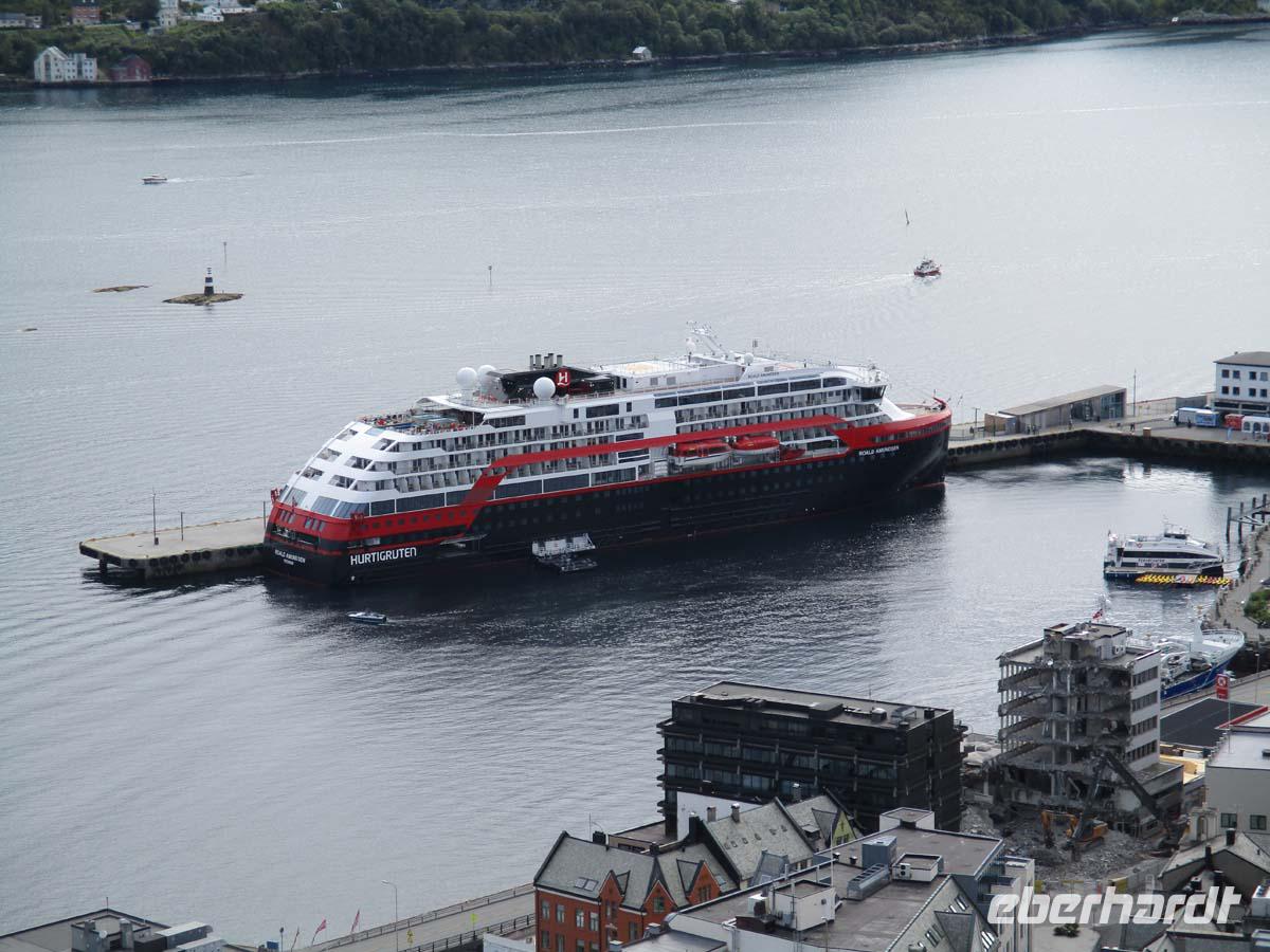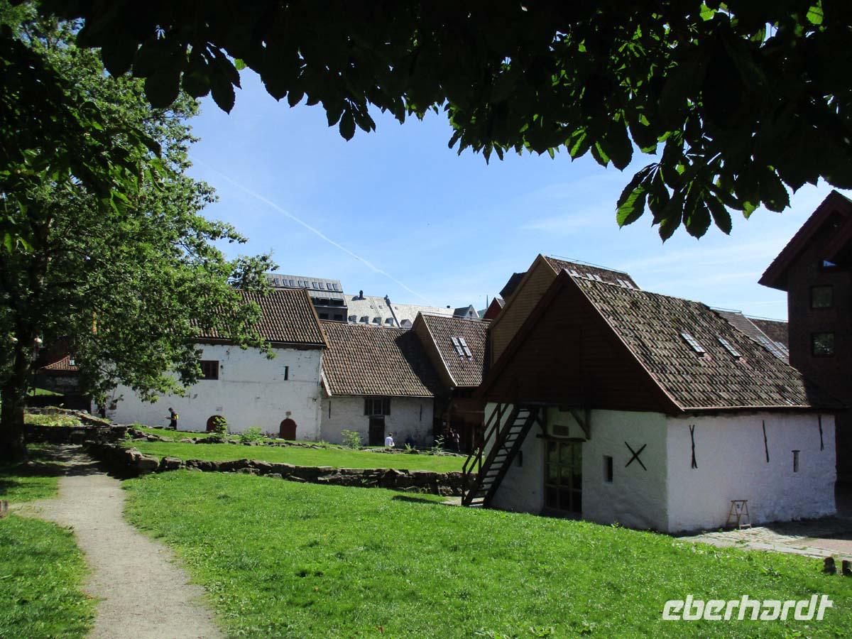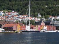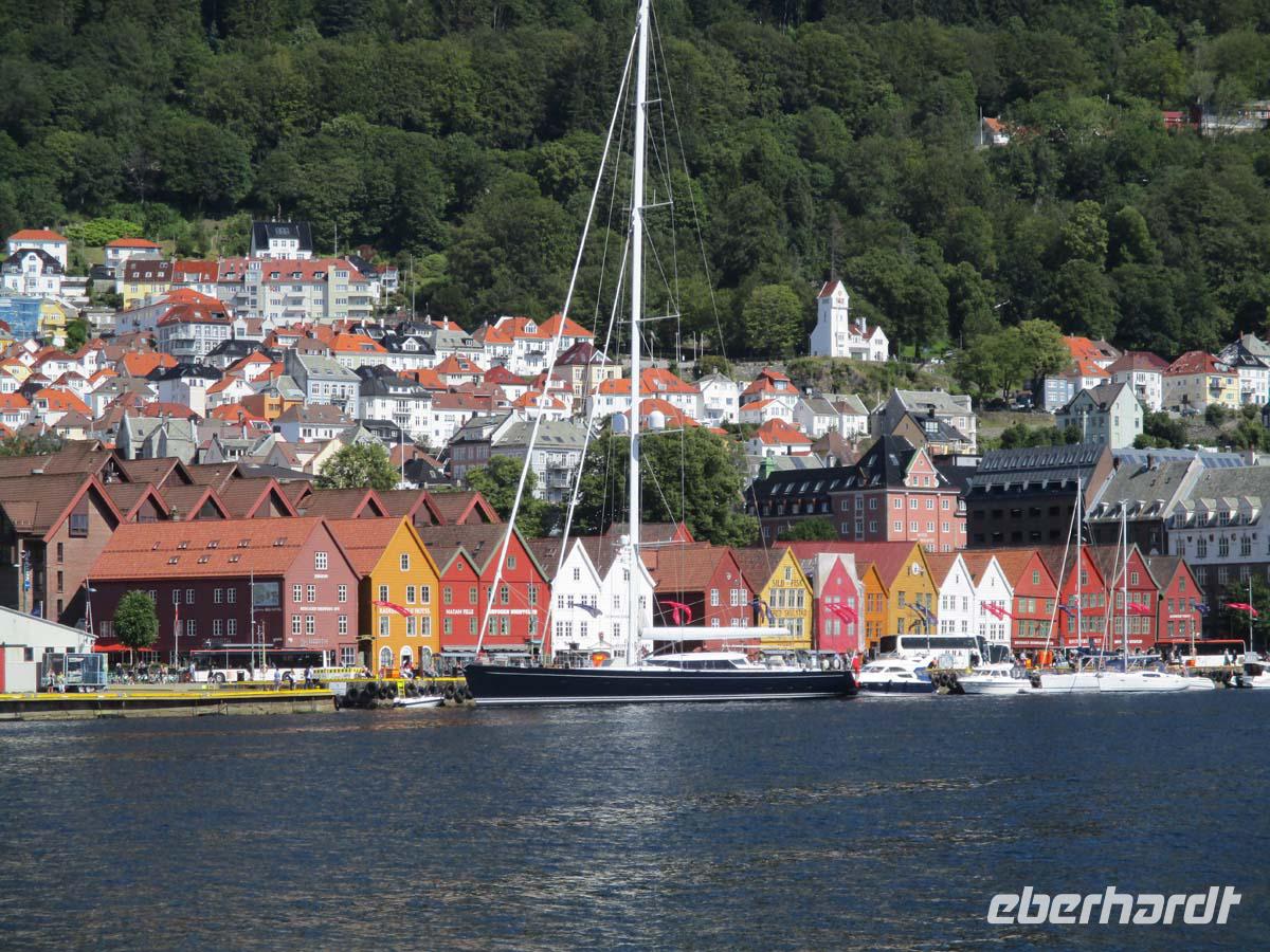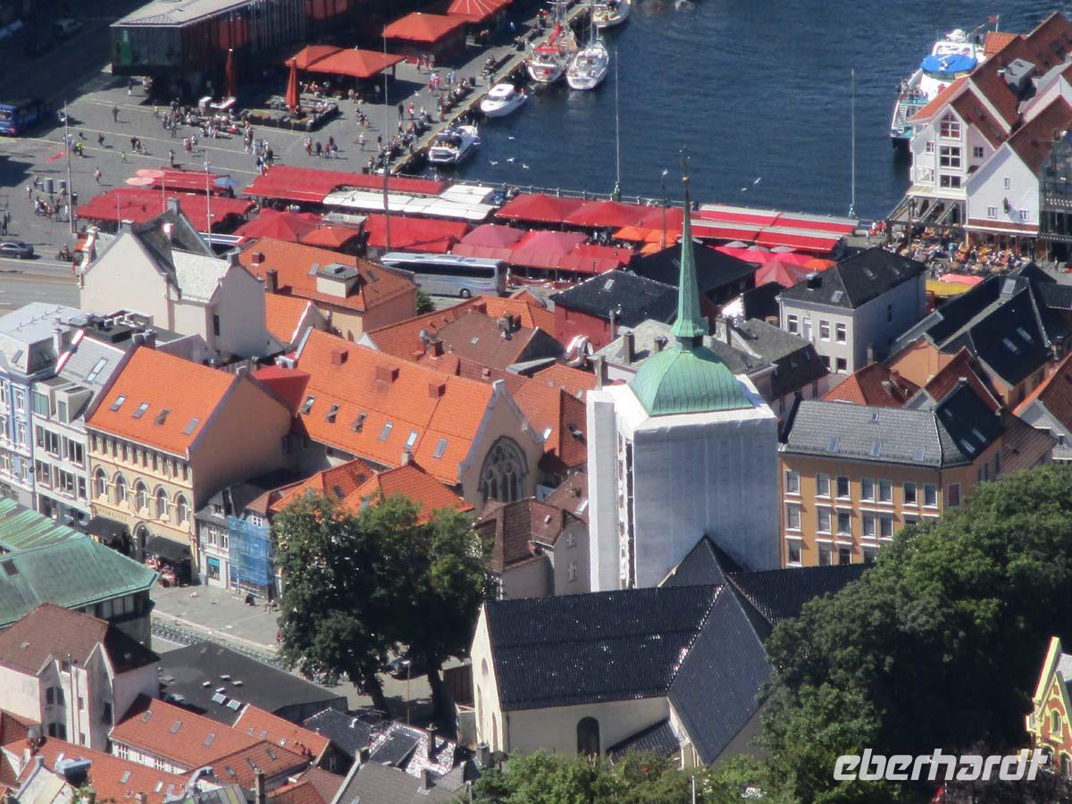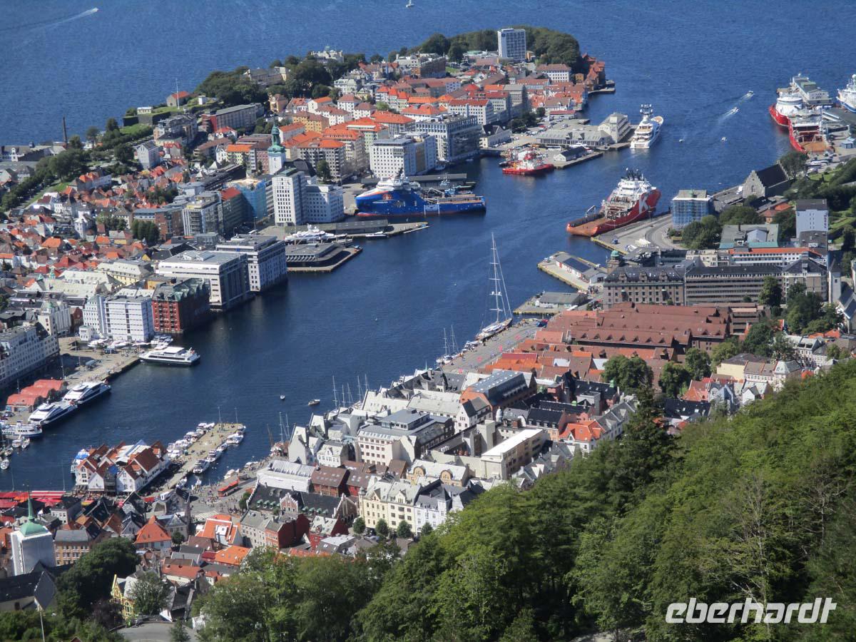 Unser erstes Ziel ist heute die Querung des riesigen Sognefjods. Er ist mit 203 km der längste und mit 1304 m auch der tiefste Fjord Norwegens. Wegen seiner milden Witterung vor allem an den nach Süden ausgerichteten Hängen wird hier sehr viel Obst angebaut. Nach einem weiteren Stop am Osterfjord mit Blick auf einen Bautastein reisen wir durch eine leibliche Mittelgebirgslandschaft nach Bergen. In der alten Hauptstadt angekommen, begeben sich einige von uns sofort mit der Stadtseilbahn auf den Hausberg Flöyen. Leider müssen wir sehr lange anstehen, weil wieder einmal ein Kreuzfahrtriese die Stadt sprengt. 5! Kreuzfahrtschiffe fallen heute wie Heuschrecken in Bergen ein, und die Bergener haben echt die Nase voll davon, berichtet uns unsere Gästeführerin. Die Aussicht vom Flöyen ist einfach bombastisch und wir haben in der regenreichsten Stadt Europas echtes Bilderbuchwetter erwischt. Andere statten schon einmal dem Fischmarkt, oder den vielen Geschäften einen Besuch ab. Kaum wieder unten beginnen wir die Stadtrundfahrt mit Angela. Kreuz und quer durchreisen wir mit unserer Gästeführerin die Stadt und stoppen sowohl am Wohnhaus des Königs, wie auch am Hafen. Wir sehen die alten und neuen Häuser, die neue Kirche, den Dom, den Fischmarkt, den Eingang zur Flöyenbahn und enden an der Tysken Brygge, dem alten Hansekontor, das auf der Unesco Welterbeliste steht. Dahinter befindet sich die Marienkirche, die älteste Kirche der Stadt und gleichzeitig jene der deutschen Kaufleute, und daneben gleich die Königshalle der norwegischen Könige. Nach dem Besuch der Brygge begeben wir uns zum sehr zentral gelegenen Hotel. Das alte Hafenbecken, der Vagen mit dem Fischmarkt ist nur ein Häuserblock entfernt. Nach dem Bezug unseres Hotels, gibt es sowohl vor als nach dem Abendessen noch viel Gelegenheit, die Stadt zu erkunden.