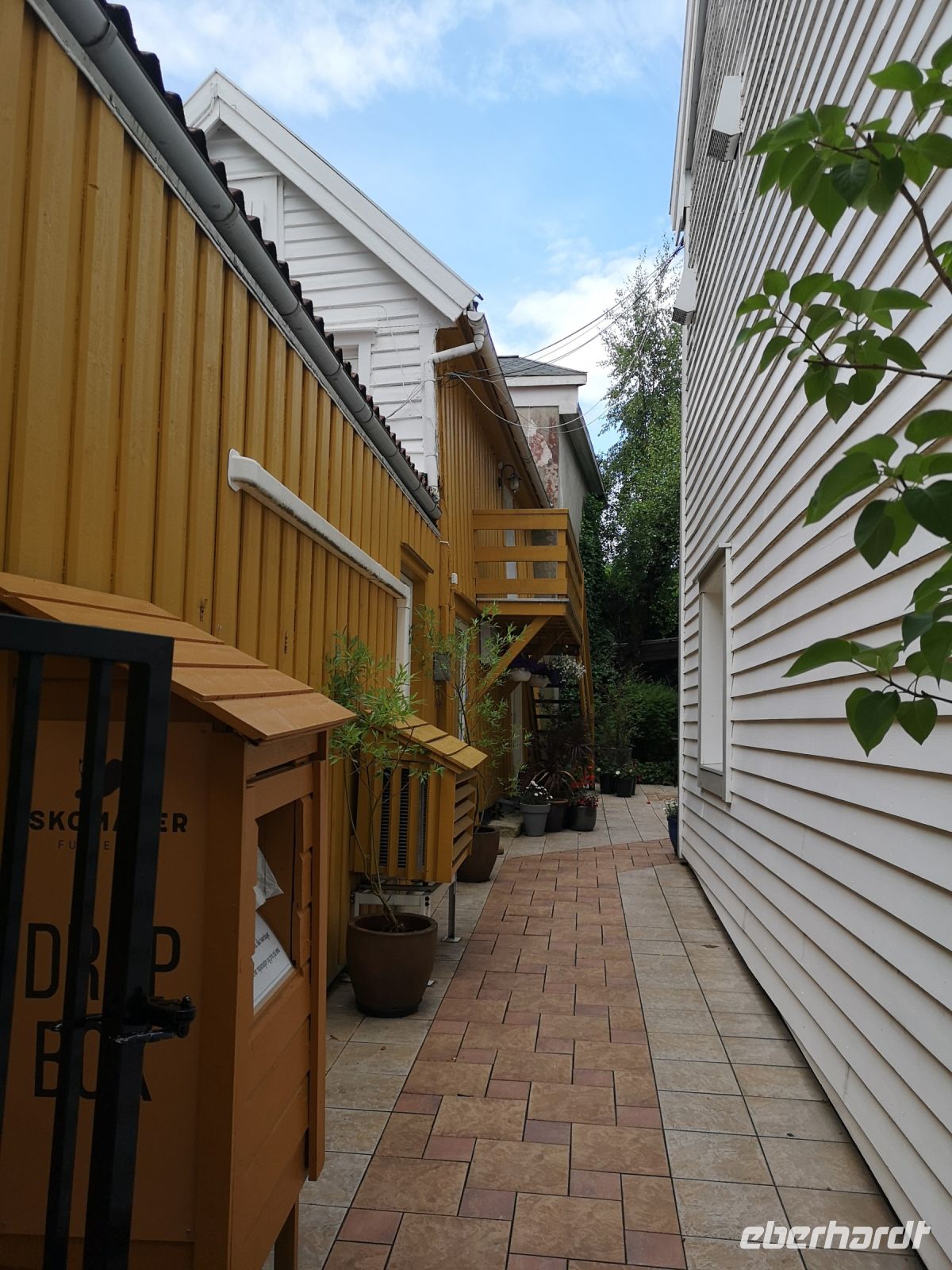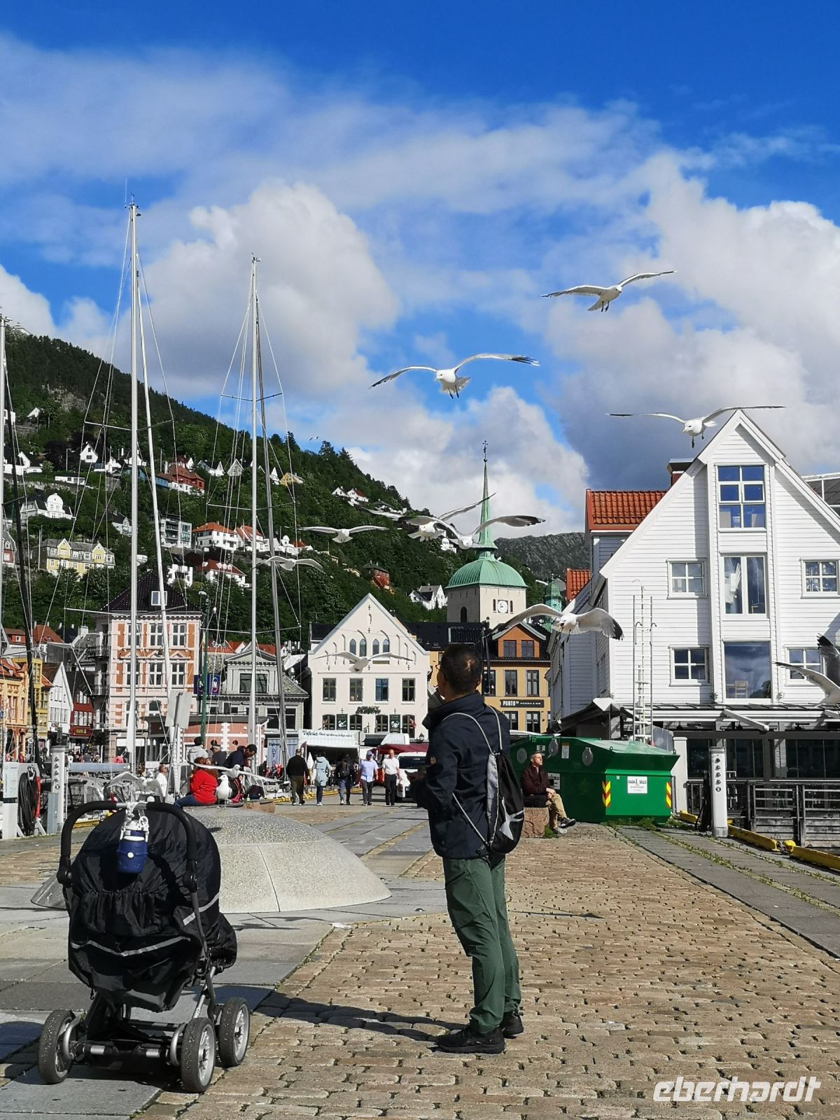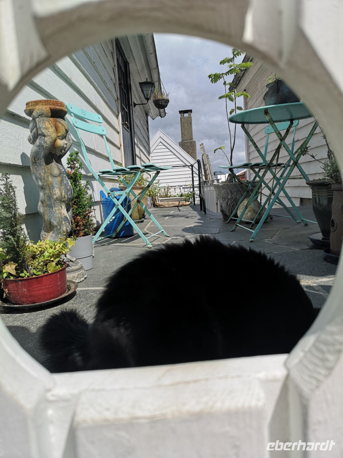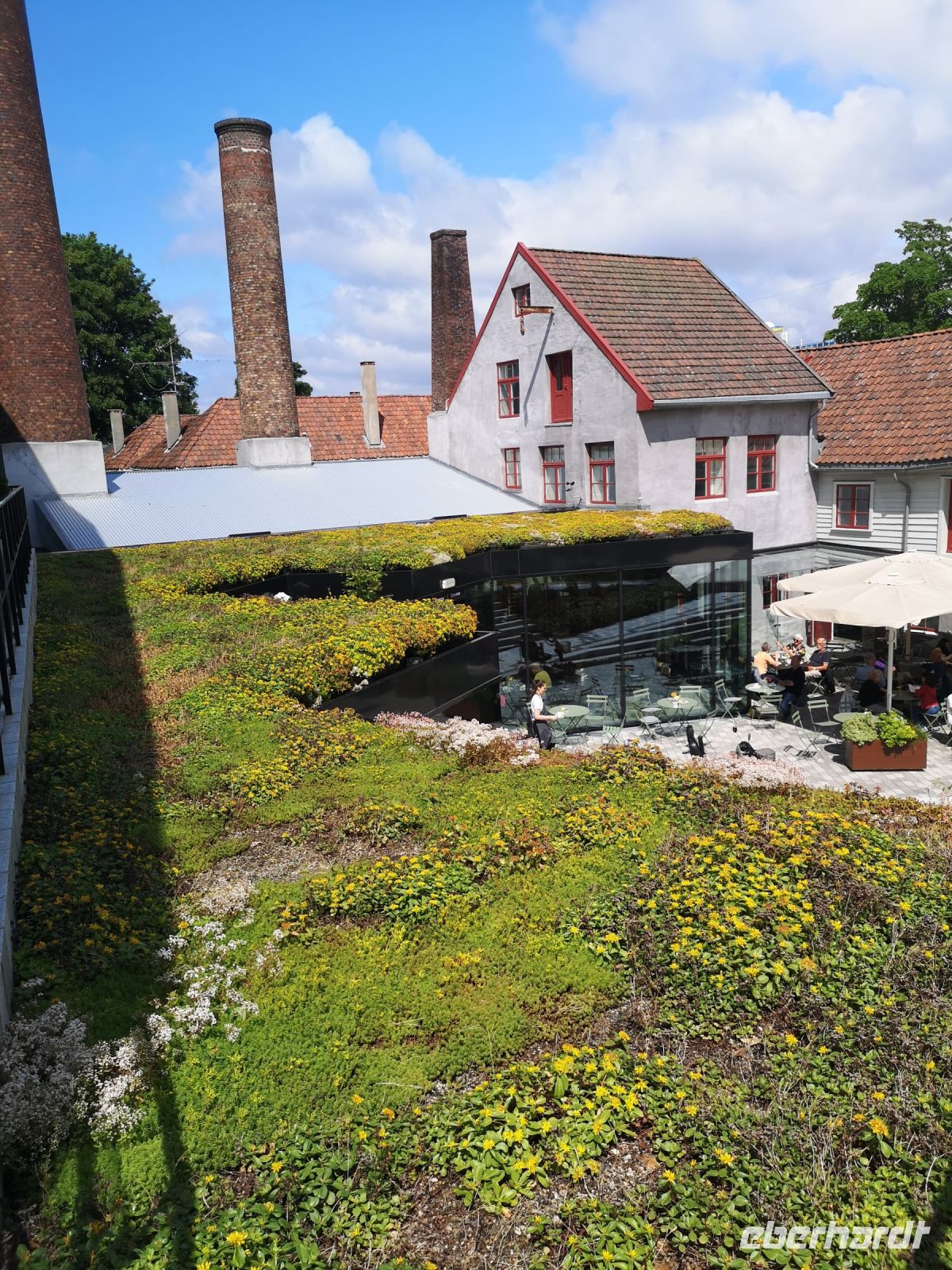 In Stavanger gab es noch etwas Zeit die Bunte Straße zu besuchen. Und ich wollte Norwegen nicht verlassen, ohne eine einzige Zimtschnecke vertilgt zu haben. Ein schönes Kaffee wurde ausfindig gemacht, Schnecke bestellt und geviertelt, weil ich sie mit meinen Damen aus dem Bus solidarisch teilen wollte – kam aber anders: eine Möwe teilte die Schnecke mit mir. Von mir nicht gewollt und von der Möwe gar nicht gefragt. Da habe ich erkannt, warum alle Einheimischen im Kaffee sitzen und draußen nur die Touris.