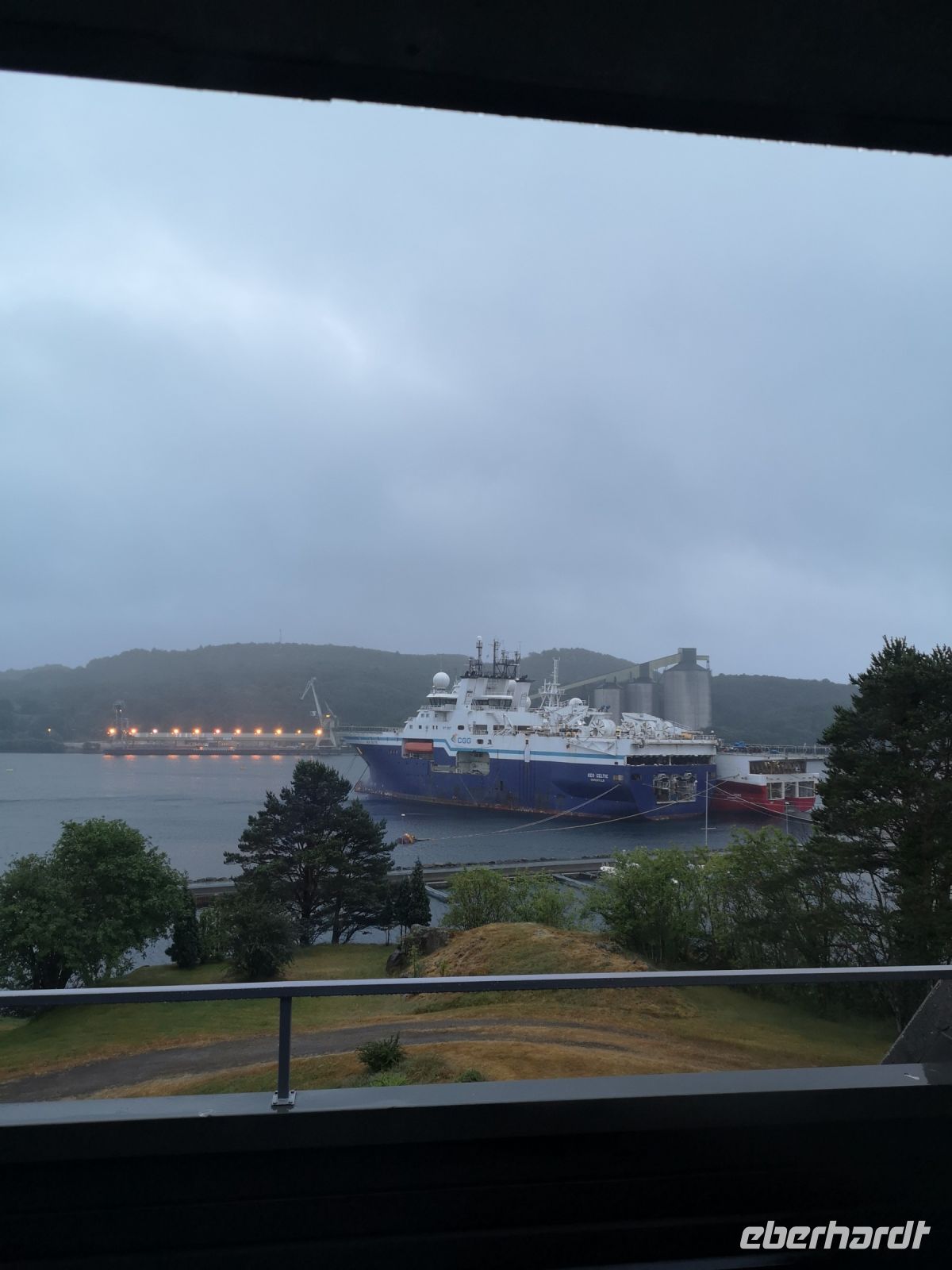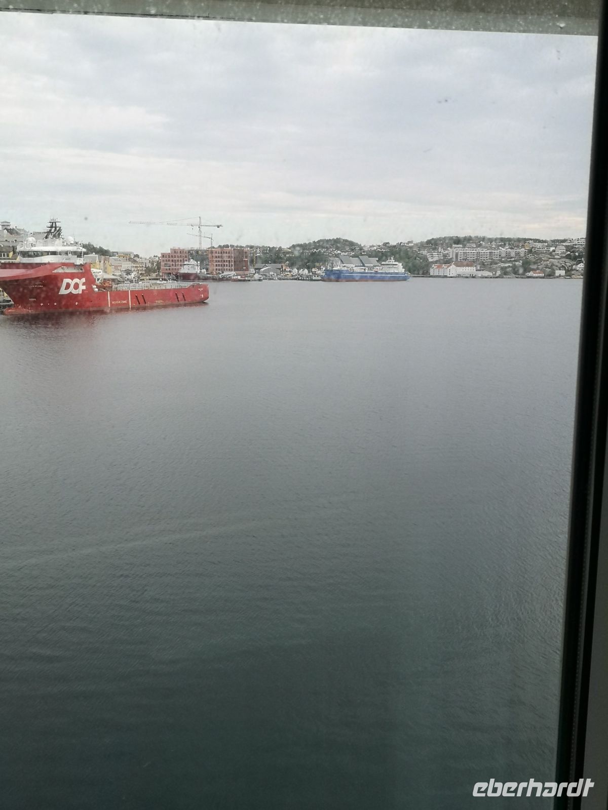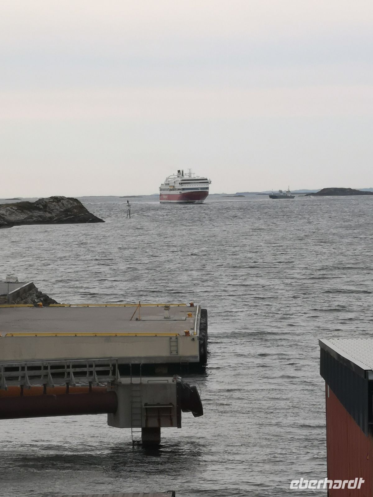 „Was ist das für ein Lärm, der mich aus dem Schlaf reißt?“ Etwas verwirrt machte ich den Vorhang auf und vor meinem Fenster fuhr auf Augenhöhe langsam ein Schiff der Reederei Hurtigrute vorbei. Fast konnte ich in die Kojen reinschauen, so nah fuhr es vorbei. Aber um Foto zu machen war ich etwas zu langsam. Ja, viele Momente im Leben müssen wir einfach im Herzen bewahren………