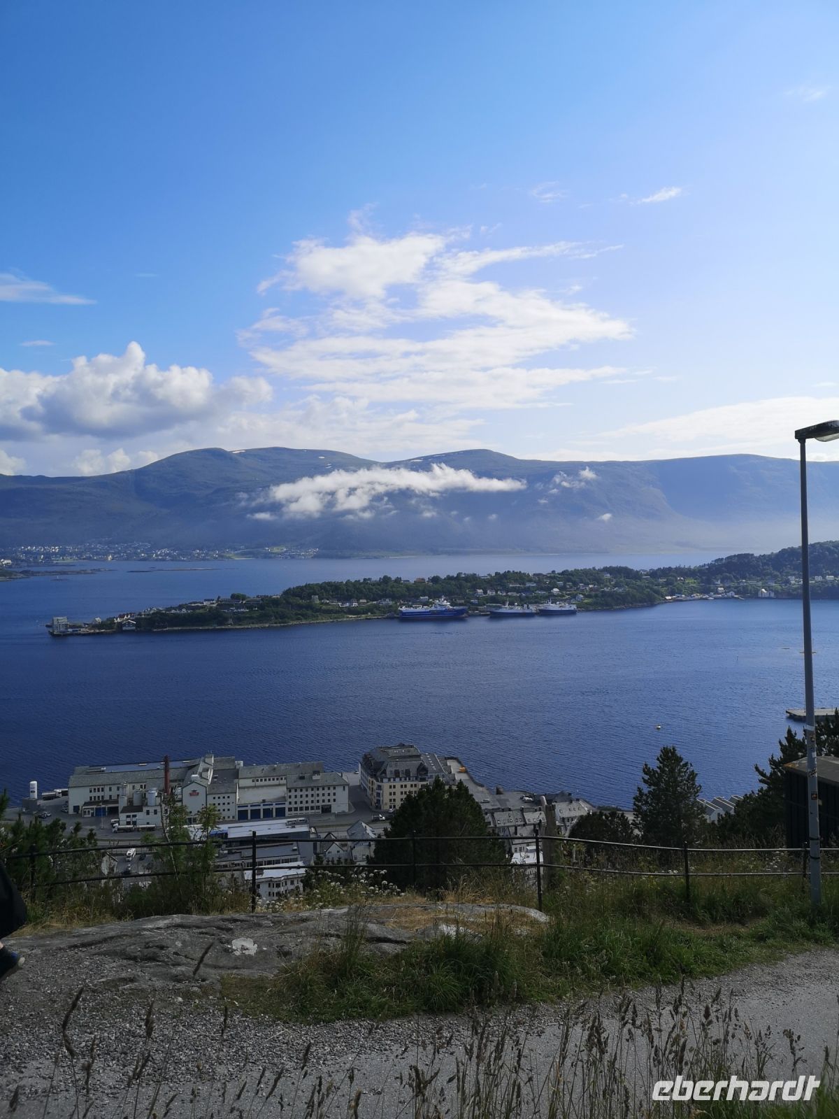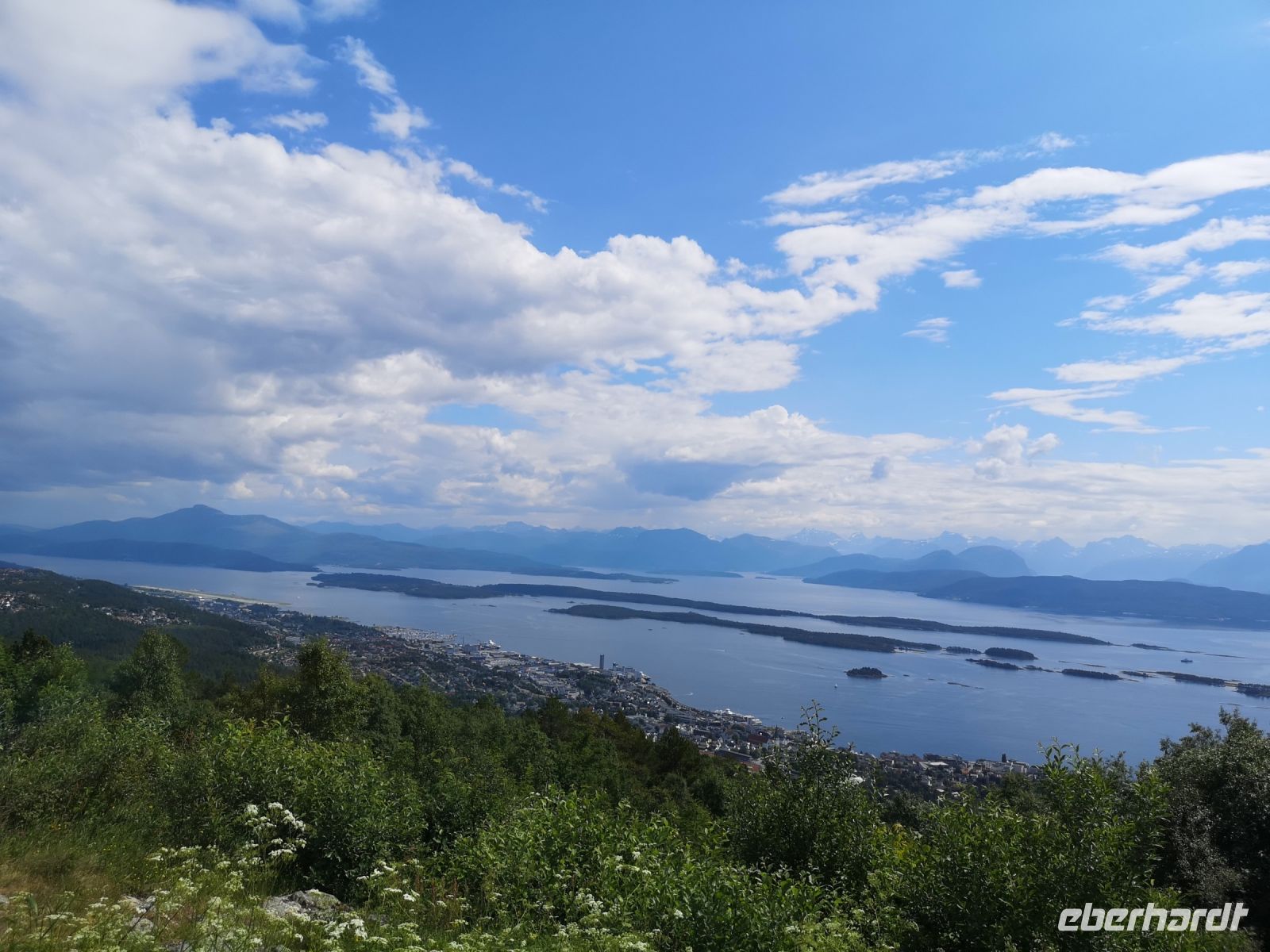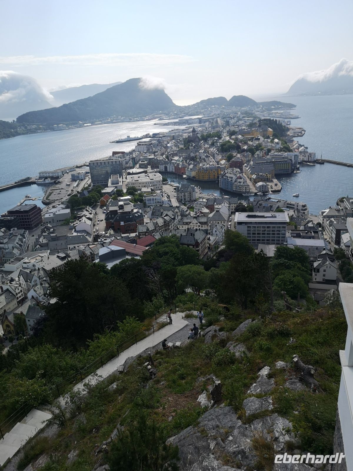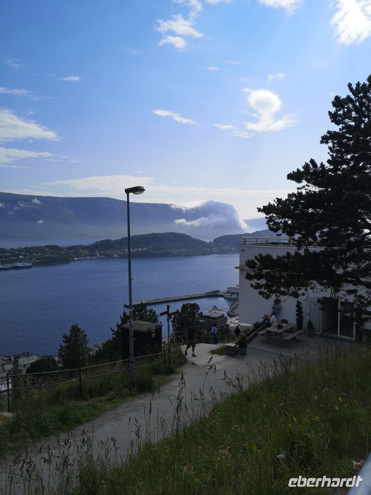 Für unsere Mittagspause wählten wir einen außergewöhnlichen Platz: gute 400 m über Molde, der Hafen- und Verwaltungsstadt von More og Romsdal, den Hausberg und Aussichtspunkt Varden. Vor der Kulisse von 222 Berggipfel im Hintergrund, zu unseren Füssen Molde am Romsdalsfjord. Später noch eine schnelle Stadtbesichtigung und ein Fotostopp auf dem Dach vom Rathaus, wo hunderte von Rosen gepflanzt sind. Danach noch ein heiliger Platz für alle Fußballfans: Aker, die Fußballarena und schon verlassen wir die Stadt. Zwei Stunden später erreichten wir Alesund