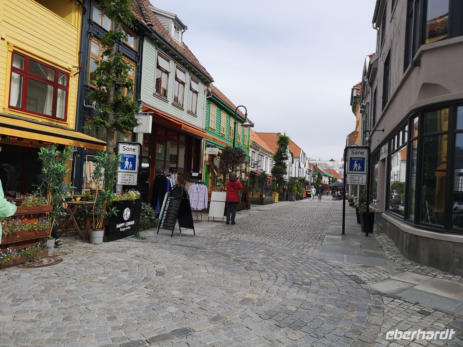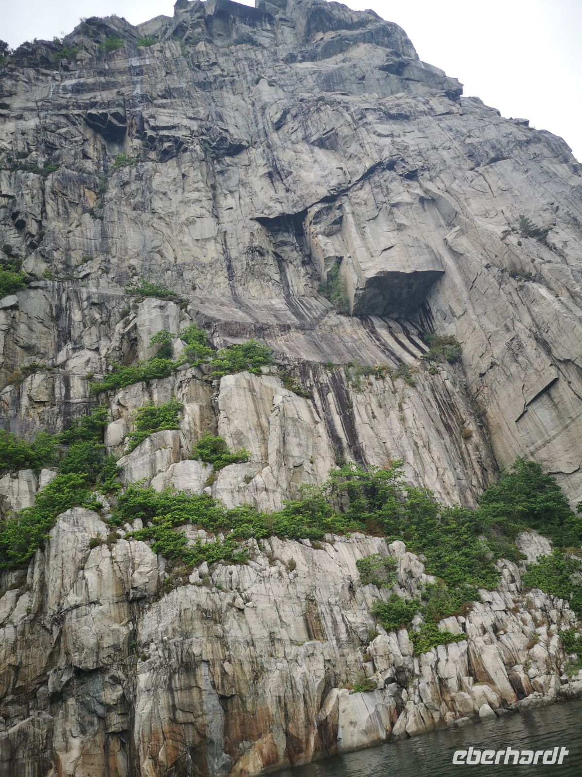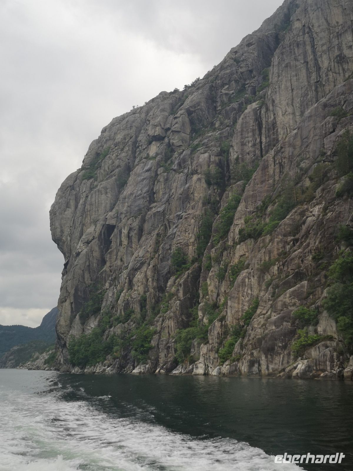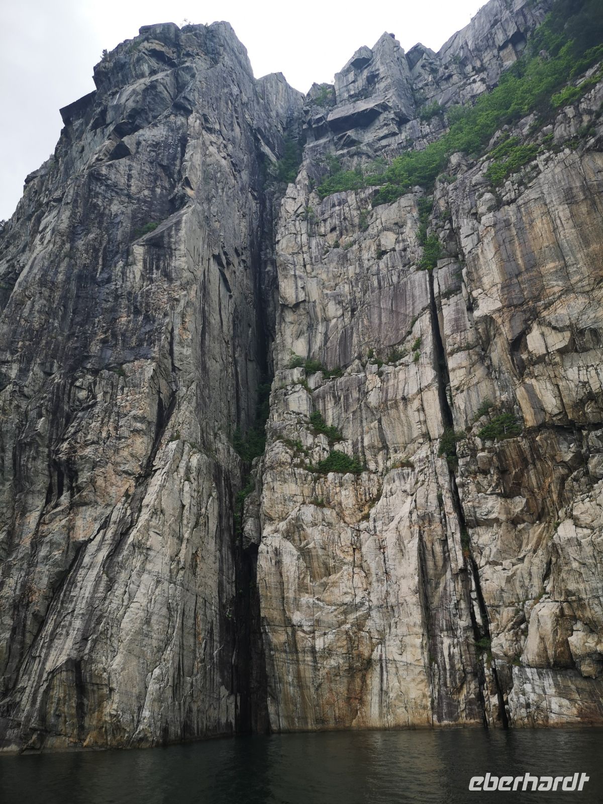 Unser Kreuzfahrtschiff, oder doch besser gesagt - Ausflugsdampfer – wo 17 Stück davon ihre Touren rund um Stavanger und Umgebung fahren, nahm uns mit auf die Fahrt hinein in den Lysefjord. Bis dahin hatten wir genug Zeit Gamle Stavanger (den ältesten Teil Stavangers, der unter Denkmalschutz steht) zu erforschen. Liegt sowieso gleich gegenüber dem Kai. Gern hätte ich ein paar Fotos ohne Menschenmenge gemacht, aber ein Costa Schiff mit der Kapazität von 5000 Passagieren ließ gefühlt eine genauso große Menge von Menschen ans Land. Ich denke, Gamle Stavanger hat in der Vergangenheit schon anderen Belagerungen gesehen und erlebt. Trotzdem war das Schlendern durch die schmalen, teilweise steilen Gassen ein besonderes Erlebnis. Genauso ein Erlebnis par exzellent war unsere Fahrt auf dem Lysefjord, eingebettet zwischen emporsteigenden Bergwänden, rauschenden Wasserfällen, die sich wie weiße Bänder von ganz oben bis zur Wasserlinie fallend überall erstreckten. Und als Krönung: Preikestolen: 604 m über uns, ein Plateau, wo man schwindelfrei sein muss, um über den Rand hinunter zum Fjord zu schauen, geschweige die schwindelerregenden Szenen aus Mission Impossible mit Tom Cruise. Ganz ehrlich gesagt, mir war meine Mission Possible von unten lieber, vom Schiff aus. Und ich denke, ich war nicht die einzige mit solch Gedankengut.