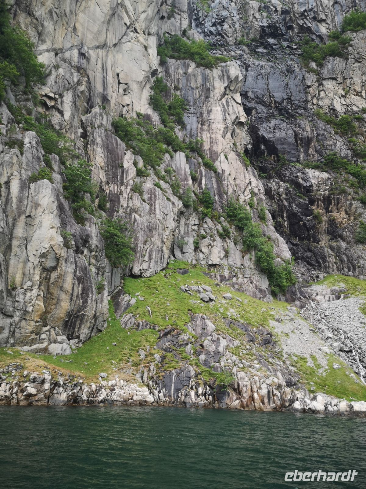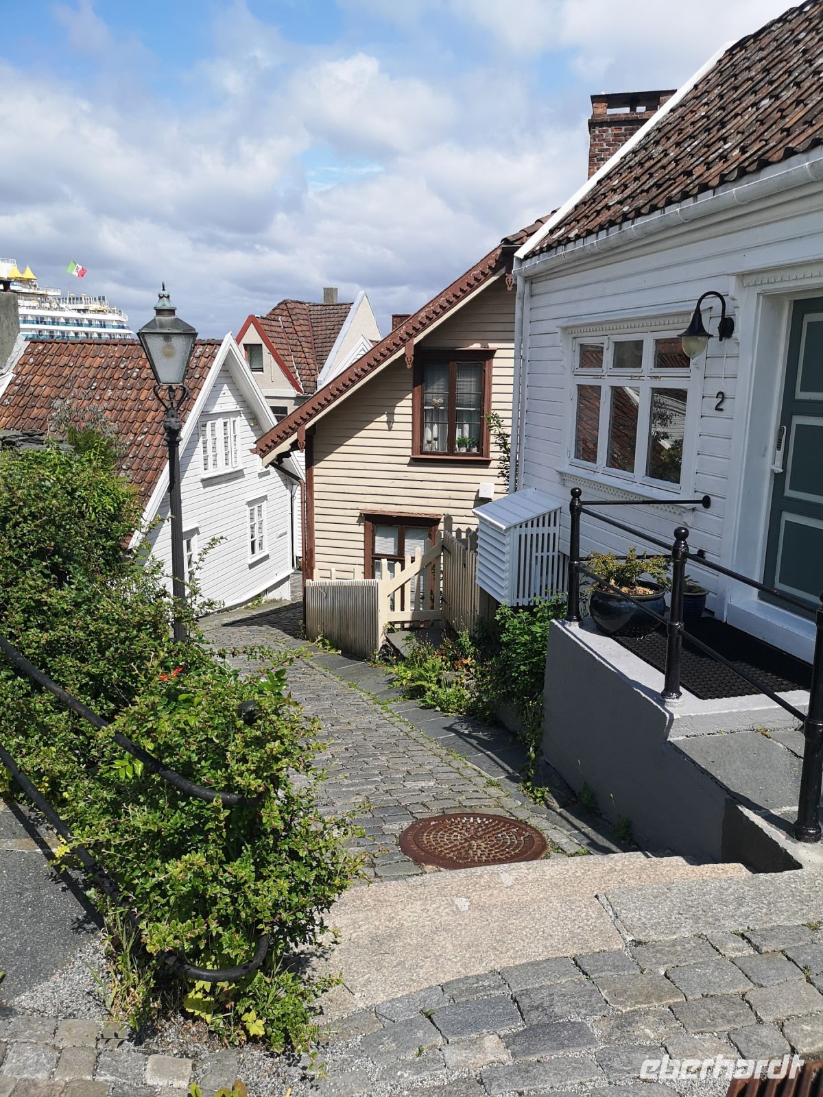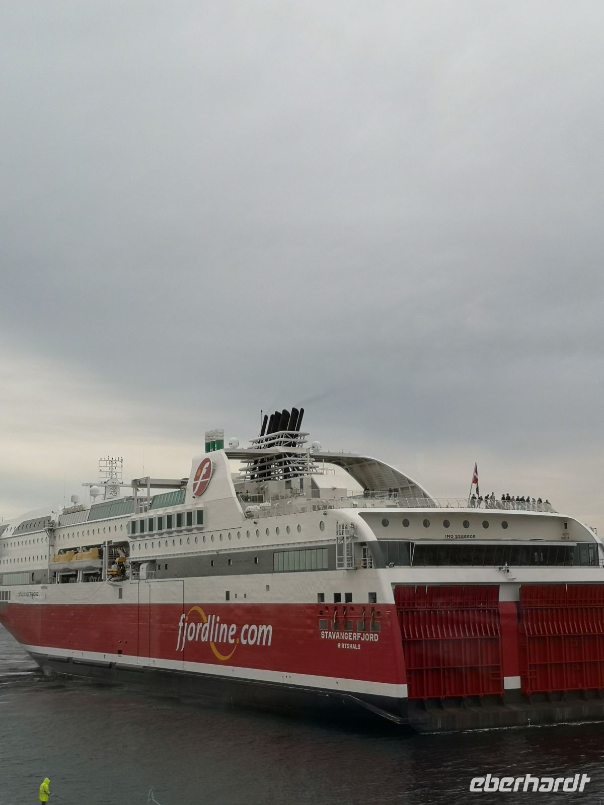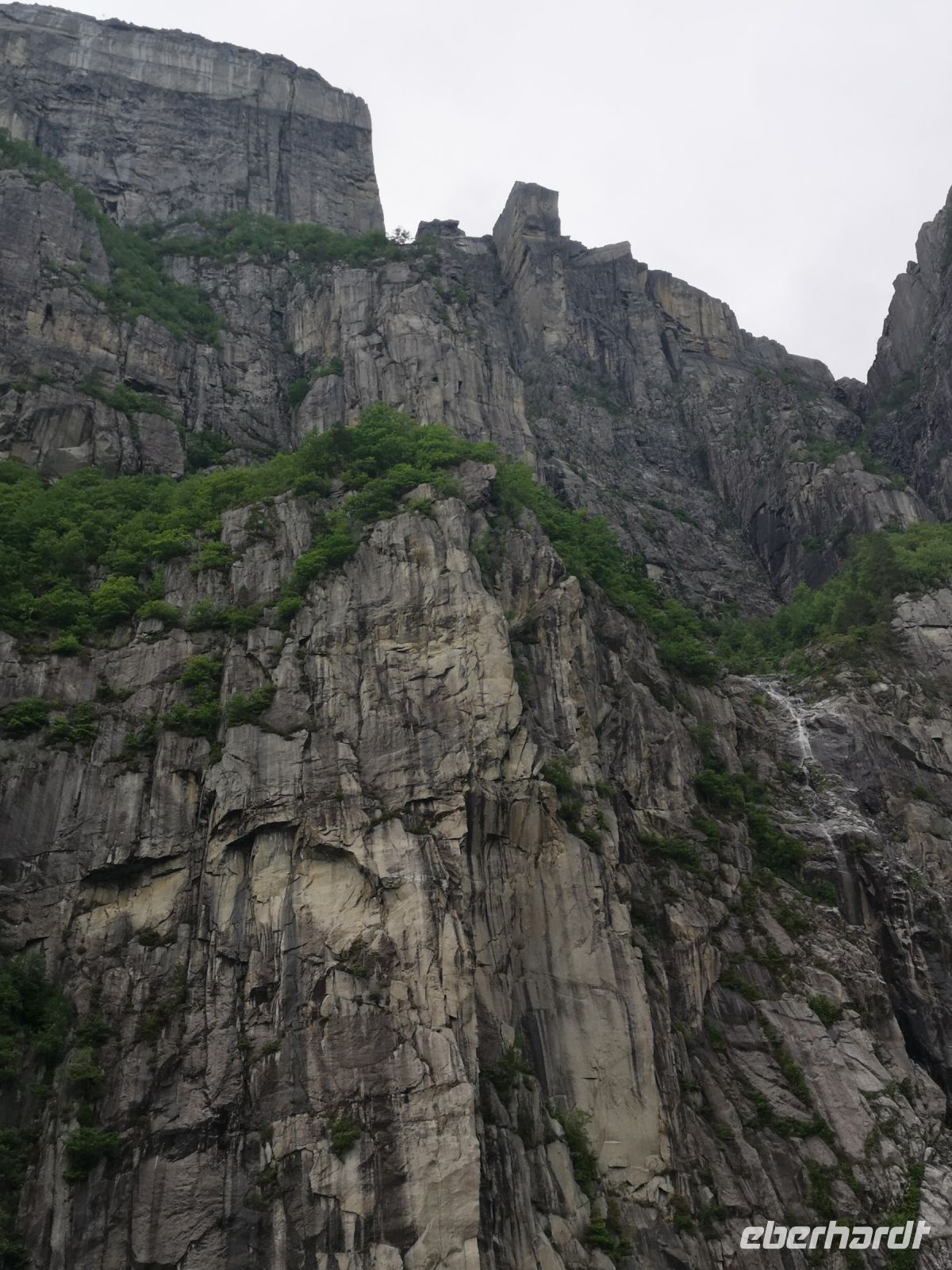 Unser Kreuzfahrtschiff, oder doch besser gesagt - Ausflugsdampfer – wo 17 Stück davon ihre Touren rund um Stavanger und Umgebung fahren, nahm uns mit auf die Fahrt hinein in den Lysefjord. Bis dahin hatten wir genug Zeit Gamle Stavanger (den ältesten Teil Stavangers, der unter Denkmalschutz steht) zu erforschen. Liegt sowieso gleich gegenüber dem Kai. Gern hätte ich ein paar Fotos ohne Menschenmenge gemacht, aber ein Costa Schiff mit der Kapazität von 5000 Passagieren ließ gefühlt eine genauso große Menge von Menschen ans Land. Ich denke, Gamle Stavanger hat in der Vergangenheit schon anderen Belagerungen gesehen und erlebt. Trotzdem war das Schlendern durch die schmalen, teilweise steilen Gassen ein besonderes Erlebnis. Genauso ein Erlebnis par exzellent war unsere Fahrt auf dem Lysefjord, eingebettet zwischen emporsteigenden Bergwänden, rauschenden Wasserfällen, die sich wie weiße Bänder von ganz oben bis zur Wasserlinie fallend überall erstreckten. Und als Krönung: Preikestolen: 604 m über uns, ein Plateau, wo man schwindelfrei sein muss, um über den Rand hinunter zum Fjord zu schauen, geschweige die schwindelerregenden Szenen aus Mission Impossible mit Tom Cruise. Ganz ehrlich gesagt, mir war meine Mission Possible von unten lieber, vom Schiff aus. Und ich denke, ich war nicht die einzige mit solch Gedankengut.