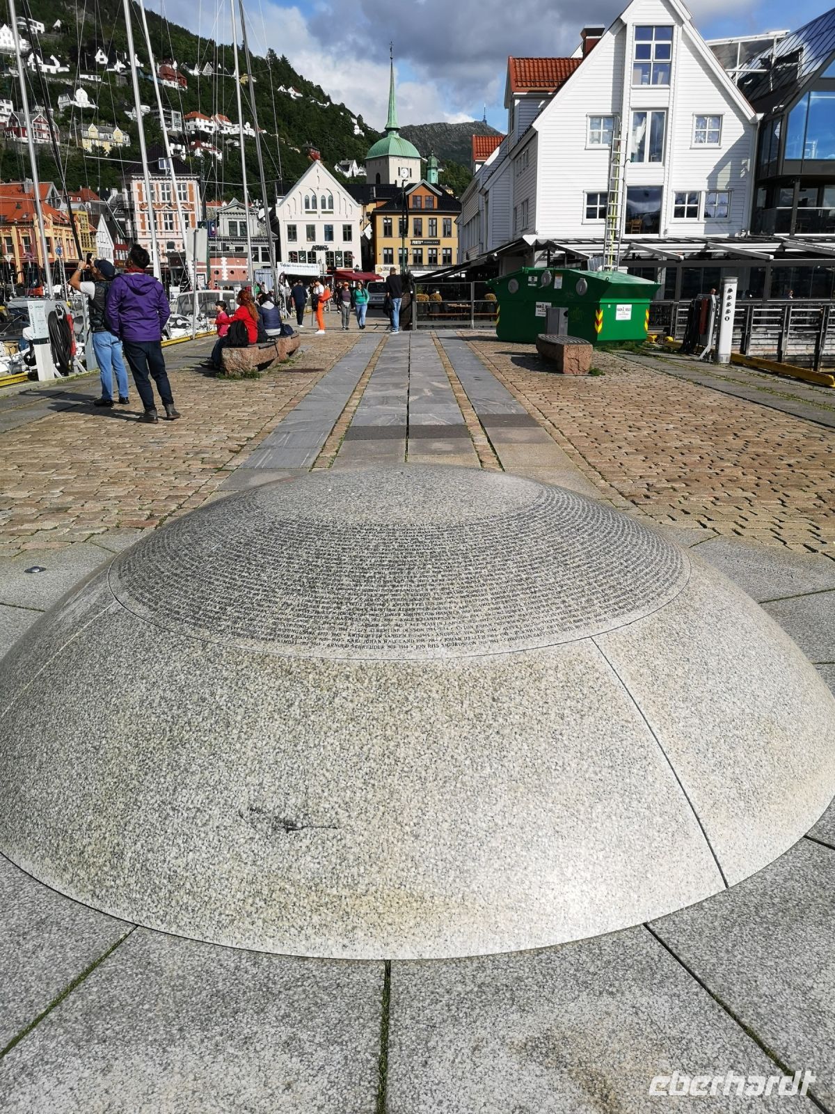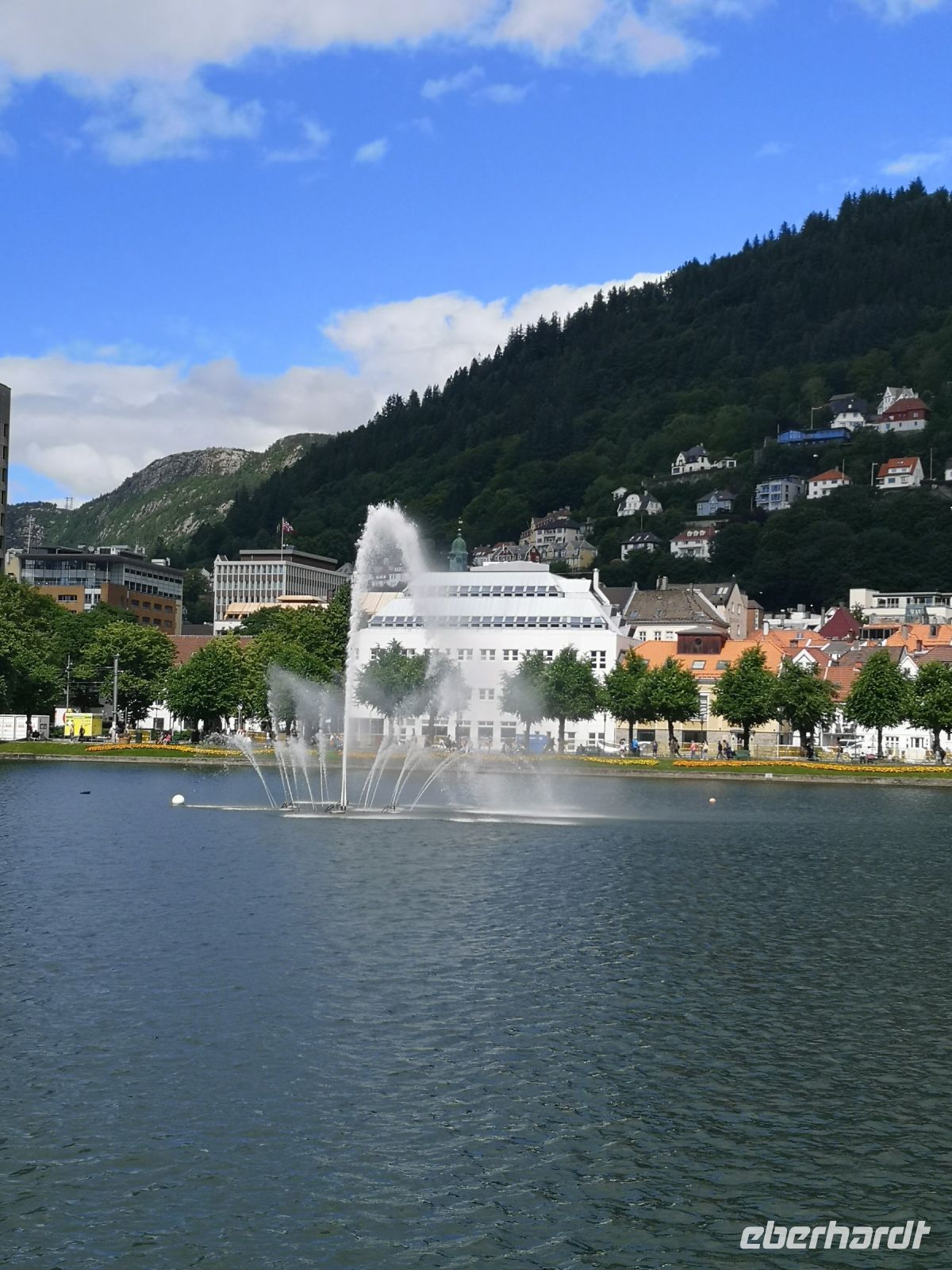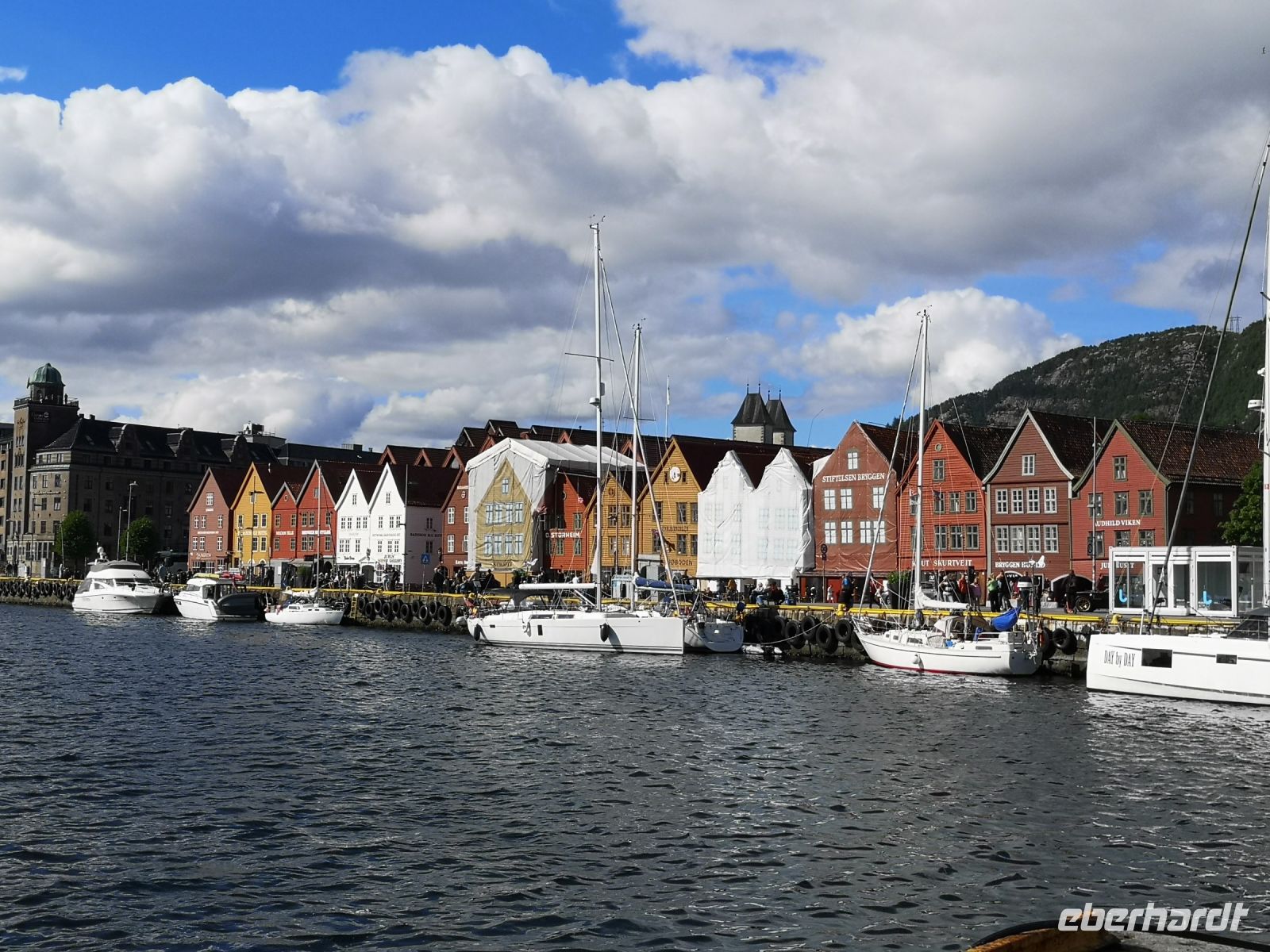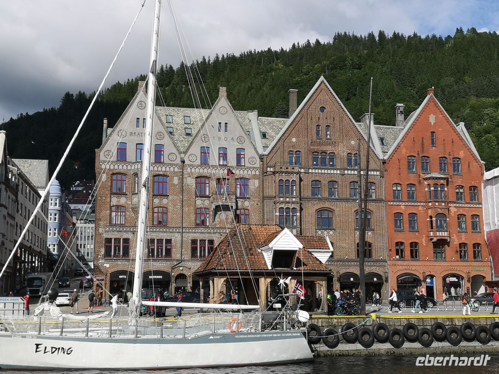 Genau vor 5 Tagen waren wir in diesem Gebiet unterwegs: Kaupanger, Laerdal, Aurlandsvangen … . Nur dieses Mal war unser Ziel Bergen und deswegen nahmen wir die schnellste Verbindung und nur ab und zu waren uns die Landesabschnitte schon bekannt. Und weil wir uns schon so auf die Rekorde abgesehen hatten, fuhren wir noch durch Laerdaltunnel: mit 24,1 km der längste der Welt. Flam war uns auch schon bekannt, aber für eine sehr kurze Pause hat sich der Ort direkt angeboten. Und ich denke, ich war nicht die Einzige, die Flam als alten Bekannten und als guten Freund gegrüßt hatte. Weiter über Voss und Dale (Wollprodukte Dale of Norway !!!), Indre Arna vorbei und schon haben wir Bergen erreicht. So weit so gut. Mit eine halben Stunde Vorsprung und mit einer der besten Stadtführerin Angela durchstreiften wir Bergen und machten das Beste aus der Zeit, die uns zur Verfügung stand. Und es blieb uns noch genug zur freien Verfügung. Ein Besuch des Fischmarktes, eine Fahrt mit der Bergbahn hinauf zum Floyen, Einkaufsbummel in den Kaufhäusern, die bis 22.00 offen waren. Oder einfach mal so chillen – letztendlich war unser Programm immer ziemlich voll und man hatte nicht immer viele Möglichkeiten für eigene Aktivitäten. Übrigens: als Hauptspeise zum Abendbrot wurde uns u.a. Renntierbraten serviert.