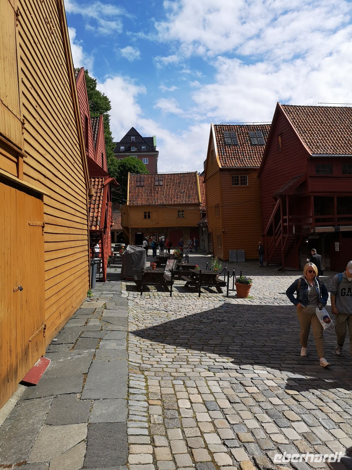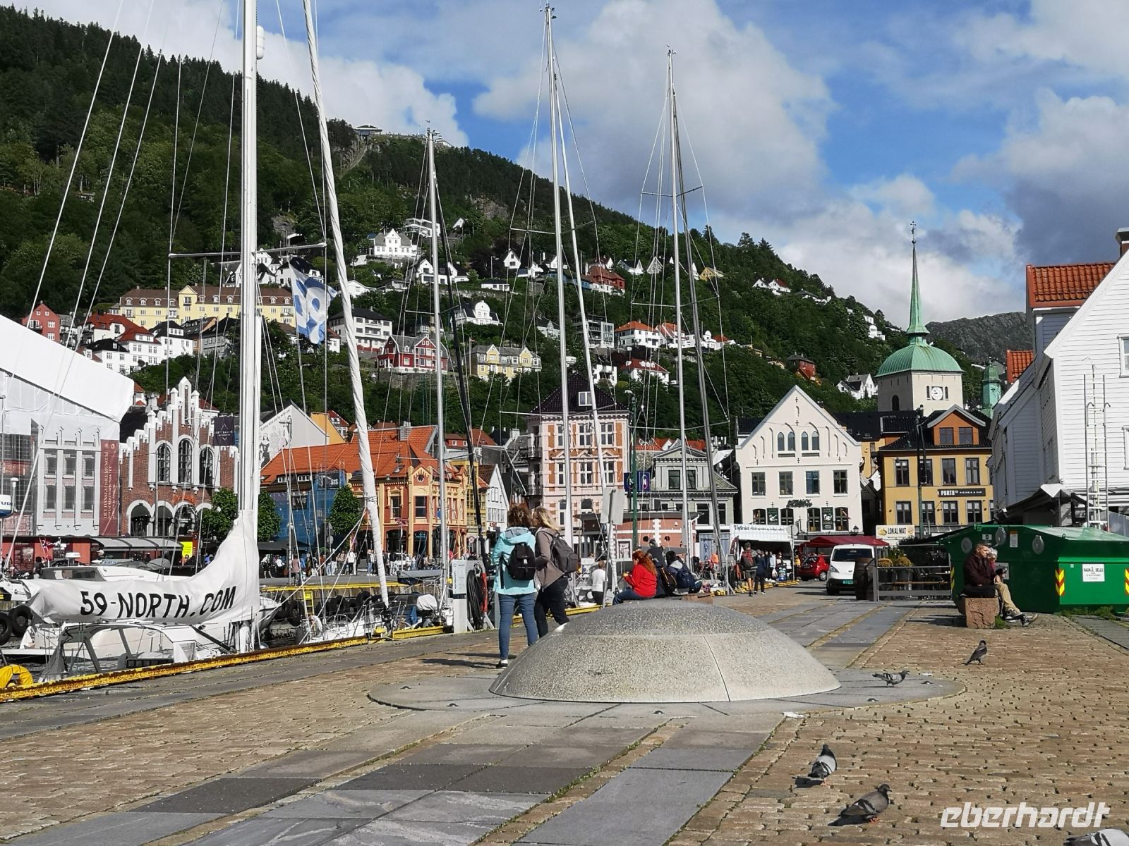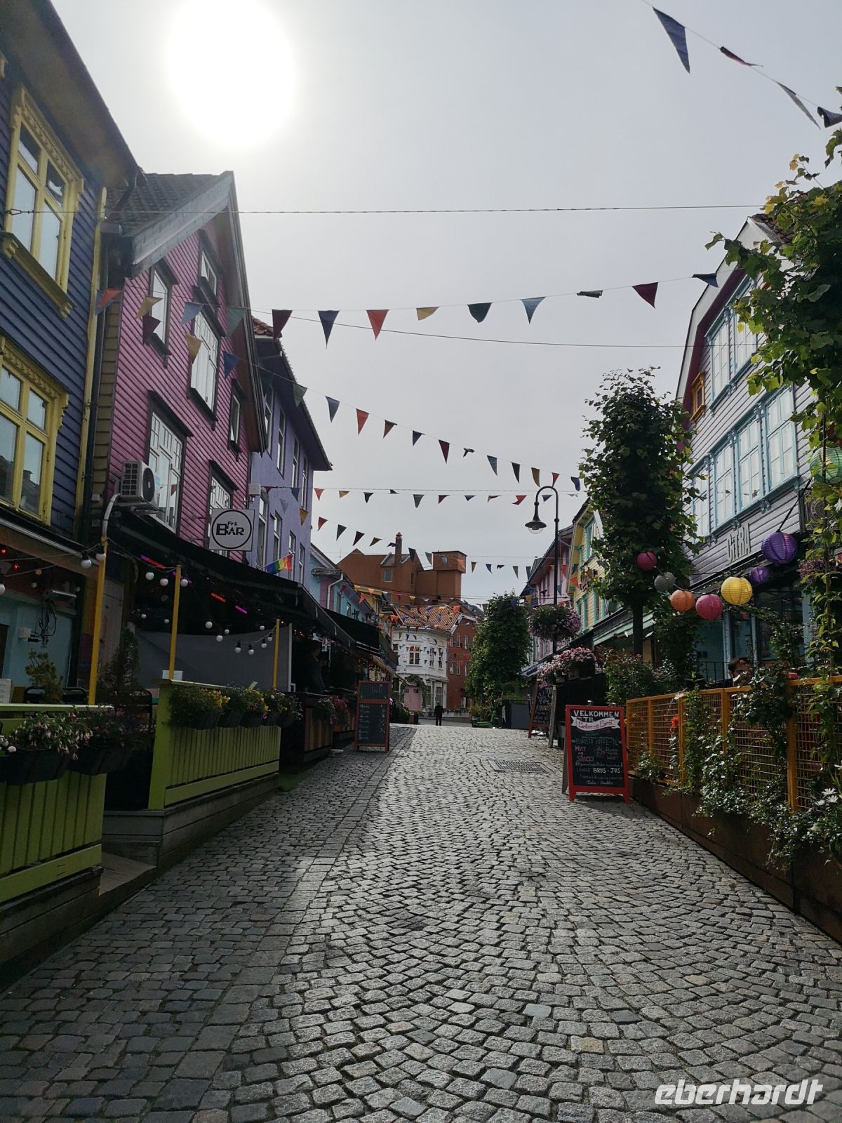 Genau vor 5 Tagen waren wir in diesem Gebiet unterwegs: Kaupanger, Laerdal, Aurlandsvangen … . Nur dieses Mal war unser Ziel Bergen und deswegen nahmen wir die schnellste Verbindung und nur ab und zu waren uns die Landesabschnitte schon bekannt. Und weil wir uns schon so auf die Rekorde abgesehen hatten, fuhren wir noch durch Laerdaltunnel: mit 24,1 km der längste der Welt. Flam war uns auch schon bekannt, aber für eine sehr kurze Pause hat sich der Ort direkt angeboten. Und ich denke, ich war nicht die Einzige, die Flam als alten Bekannten und als guten Freund gegrüßt hatte. Weiter über Voss und Dale (Wollprodukte Dale of Norway !!!), Indre Arna vorbei und schon haben wir Bergen erreicht. So weit so gut. Mit eine halben Stunde Vorsprung und mit einer der besten Stadtführerin Angela durchstreiften wir Bergen und machten das Beste aus der Zeit, die uns zur Verfügung stand. Und es blieb uns noch genug zur freien Verfügung. Ein Besuch des Fischmarktes, eine Fahrt mit der Bergbahn hinauf zum Floyen, Einkaufsbummel in den Kaufhäusern, die bis 22.00 offen waren. Oder einfach mal so chillen – letztendlich war unser Programm immer ziemlich voll und man hatte nicht immer viele Möglichkeiten für eigene Aktivitäten. Übrigens: als Hauptspeise zum Abendbrot wurde uns u.a. Renntierbraten serviert.