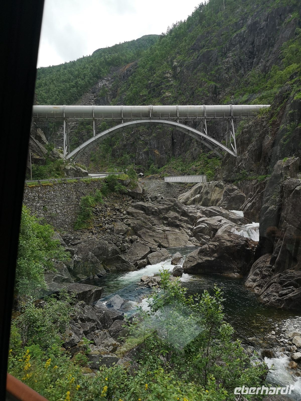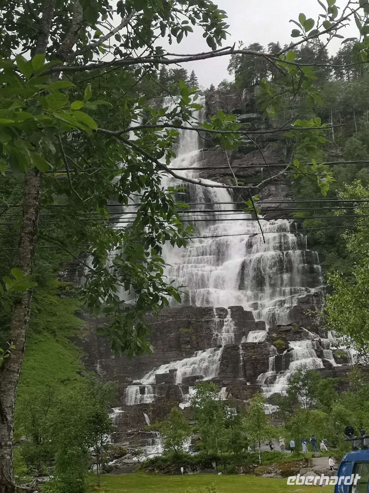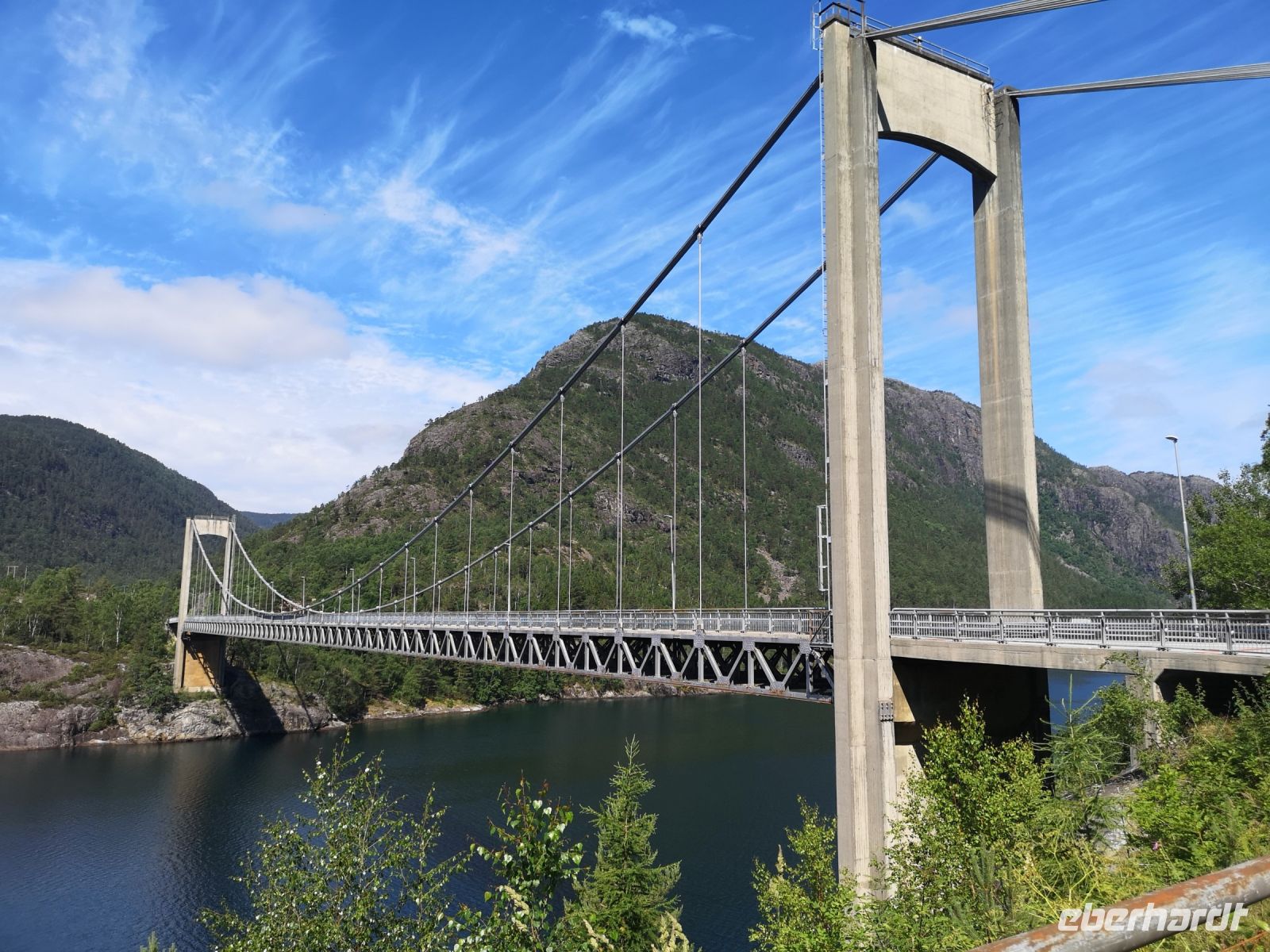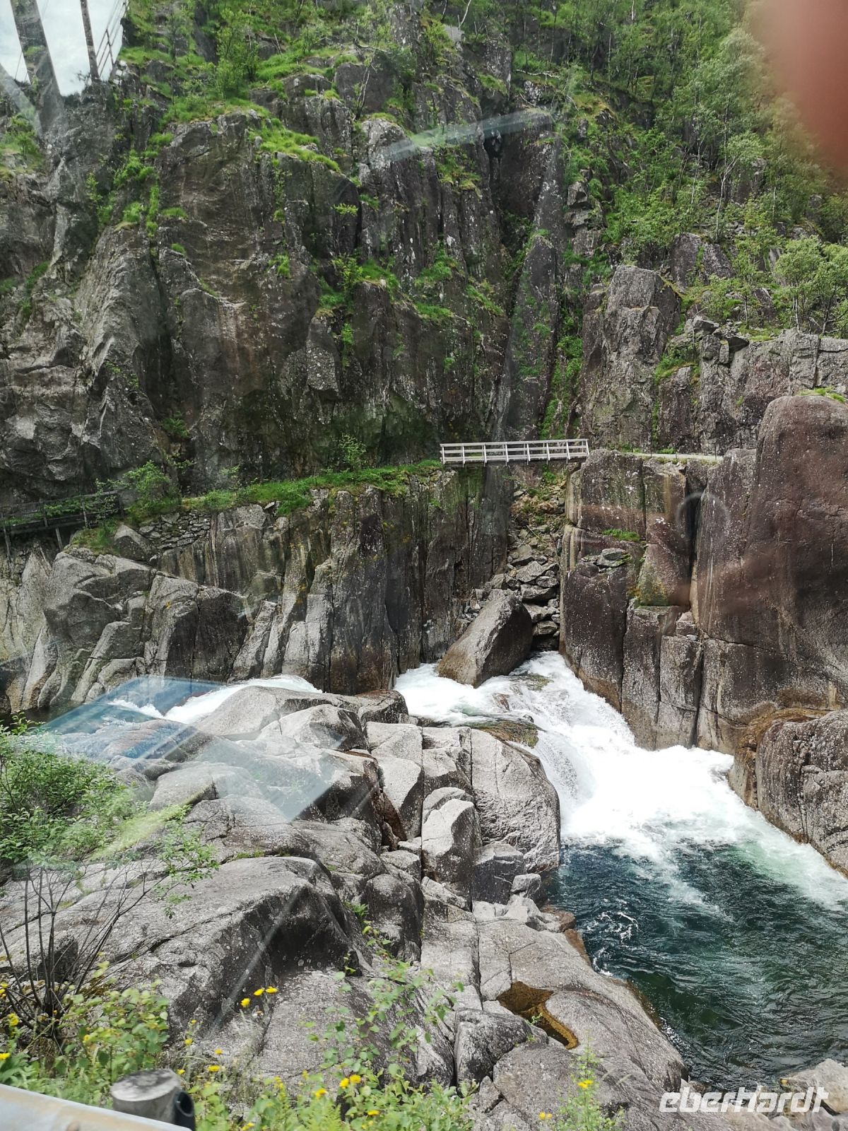 Wenn schon, denn schon. Nach dem längsten Unterwassertunnel der Welt fuhren wir an dem Tag über die Hardangerbrua, einer der längsten Hängebrücken der Welt. Imposant, fast 1400 m lang und insgesamt über 200 m hoch ist sie eine der Wunderwerke der norwegischen Infrastrukturbau.