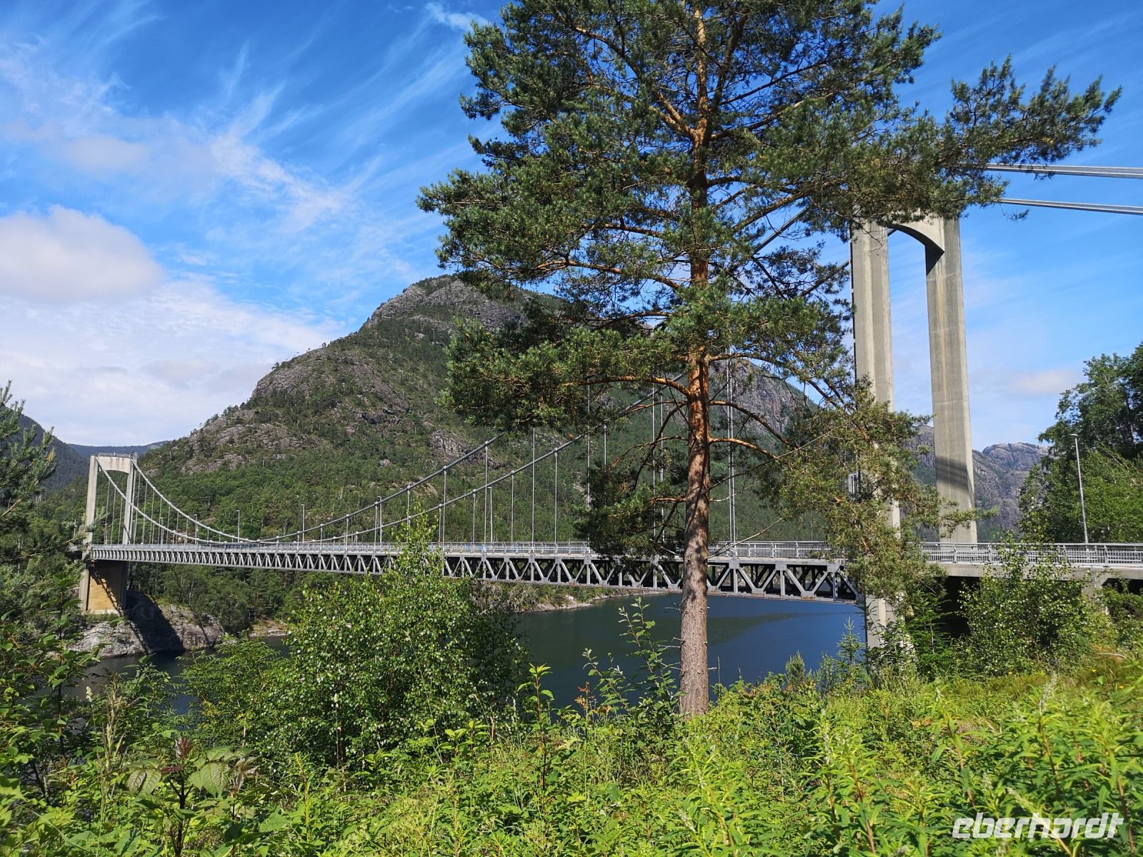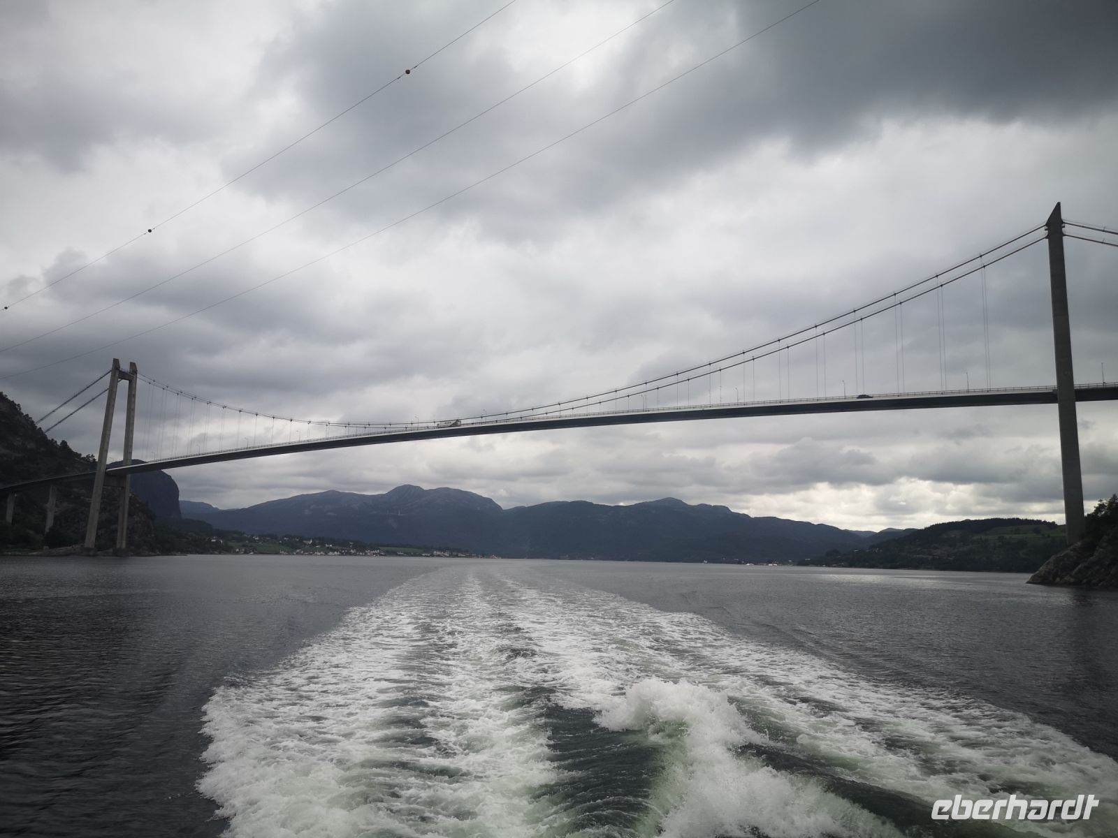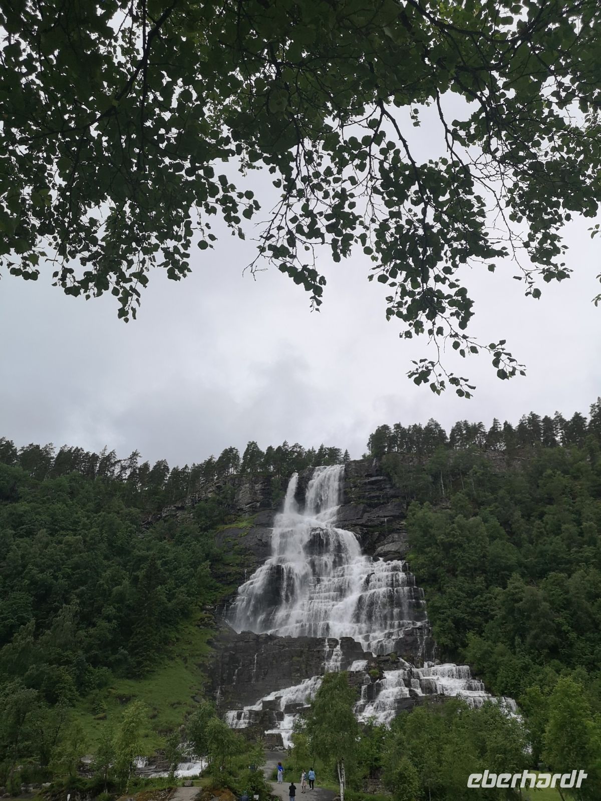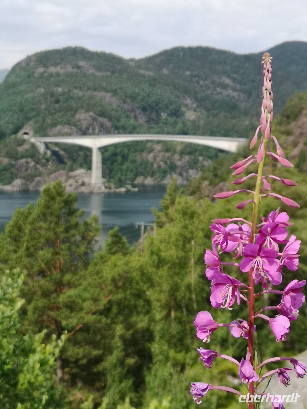 Wenn schon, denn schon. Nach dem längsten Unterwassertunnel der Welt fuhren wir an dem Tag über die Hardangerbrua, einer der längsten Hängebrücken der Welt. Imposant, fast 1400 m lang und insgesamt über 200 m hoch ist sie eine der Wunderwerke der norwegischen Infrastrukturbau.
