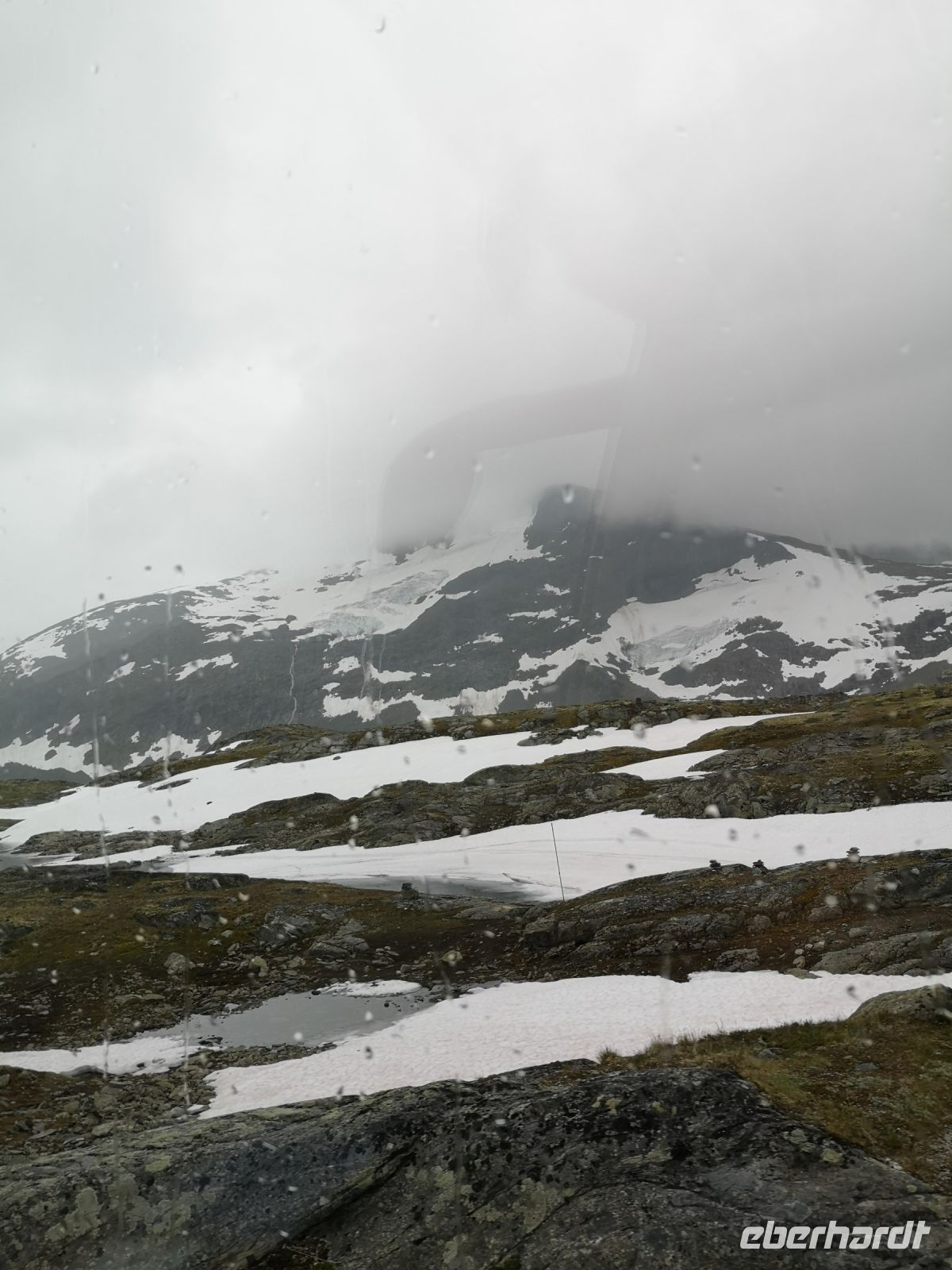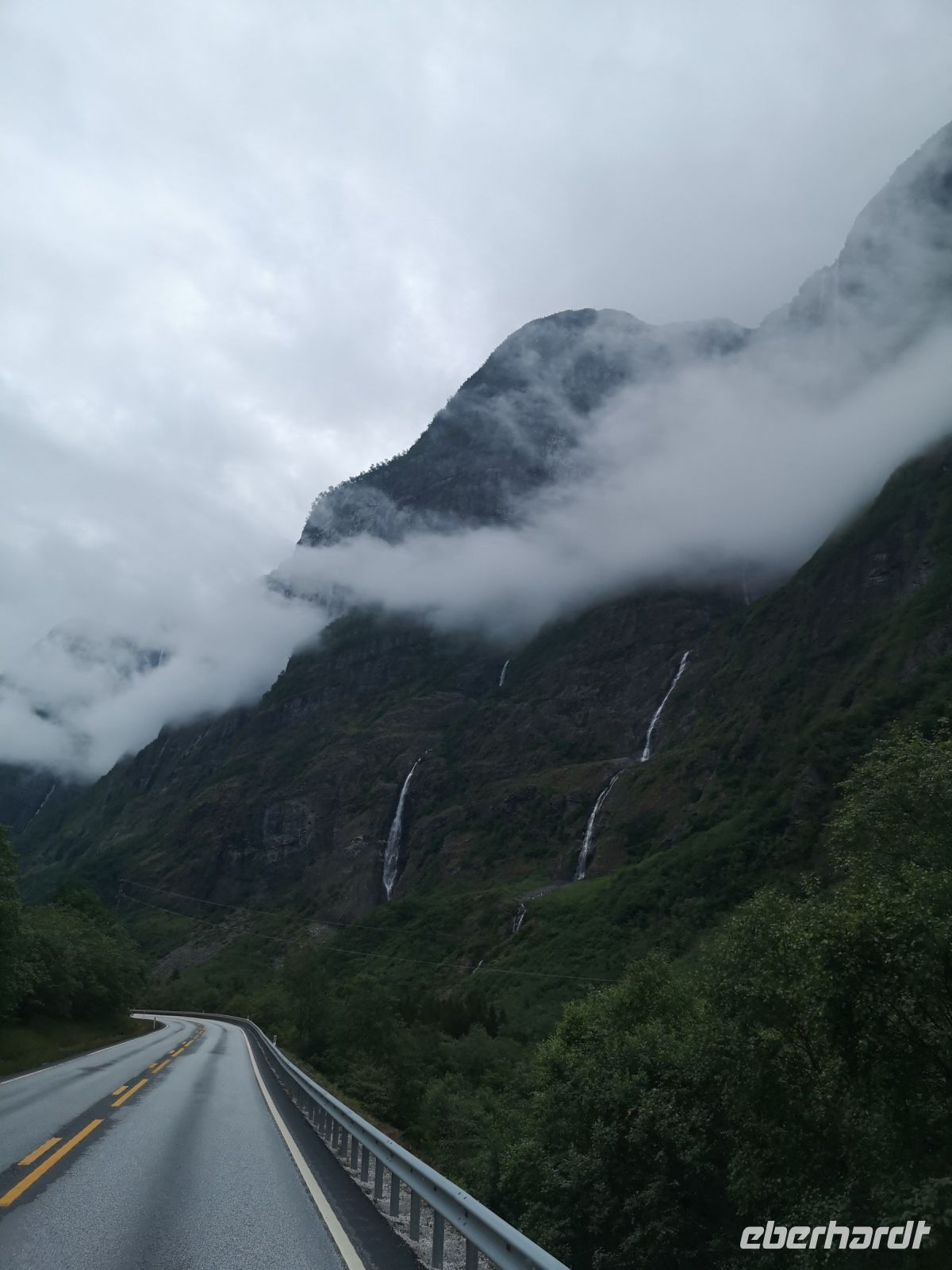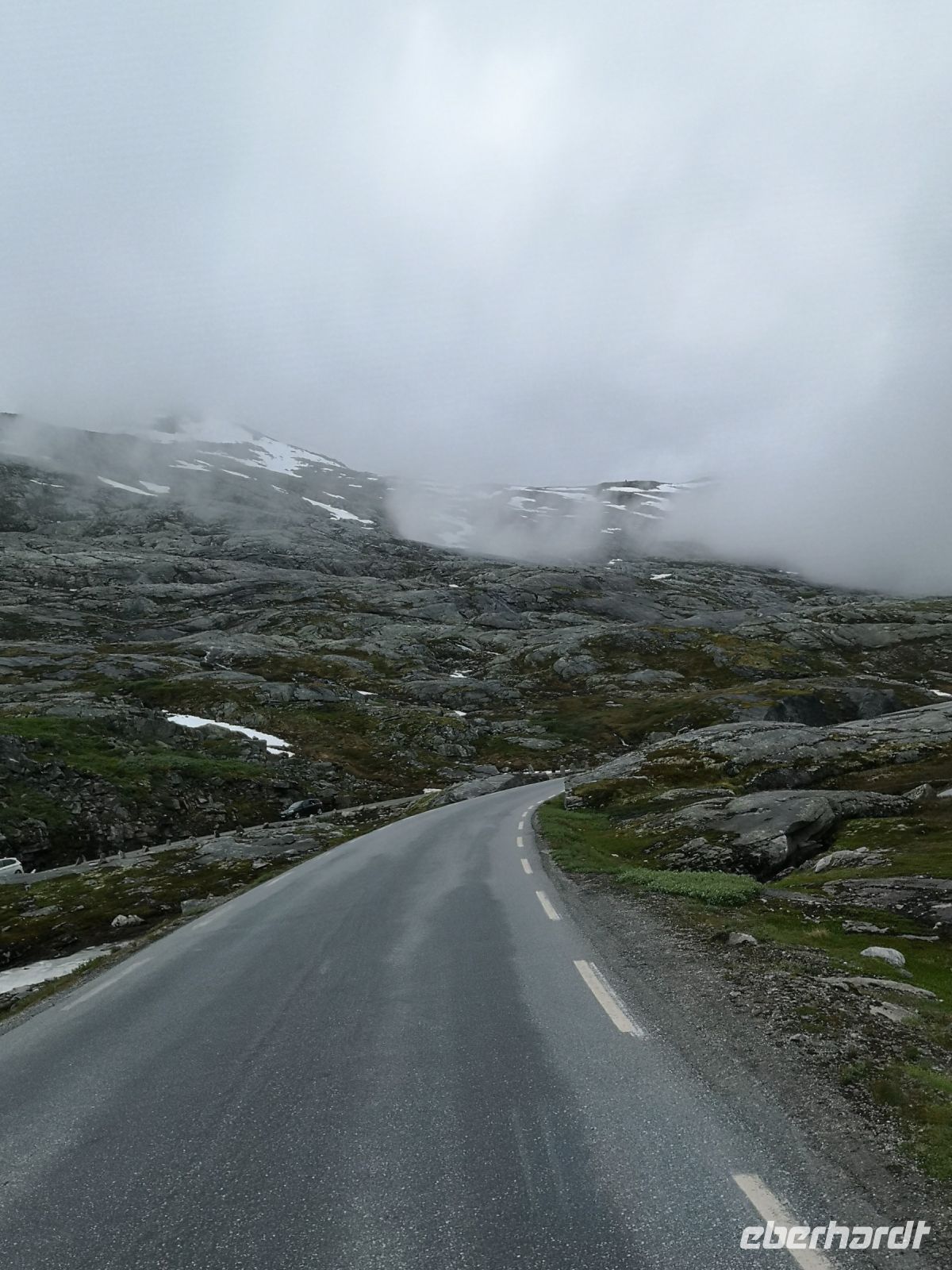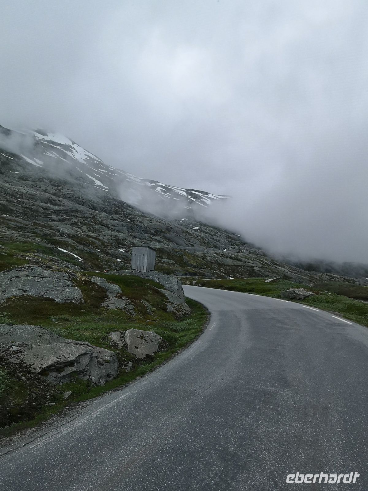 Und wieder die nächsten 11 Haarnadelkurven – diesmal die Trollstigen bergrunter. Die Bergwelt hüllte sich teilweise in Nebel, von den 3 Gipfeln König, Königin und Bischof zeigt sich nur der letzte in voller Pracht.