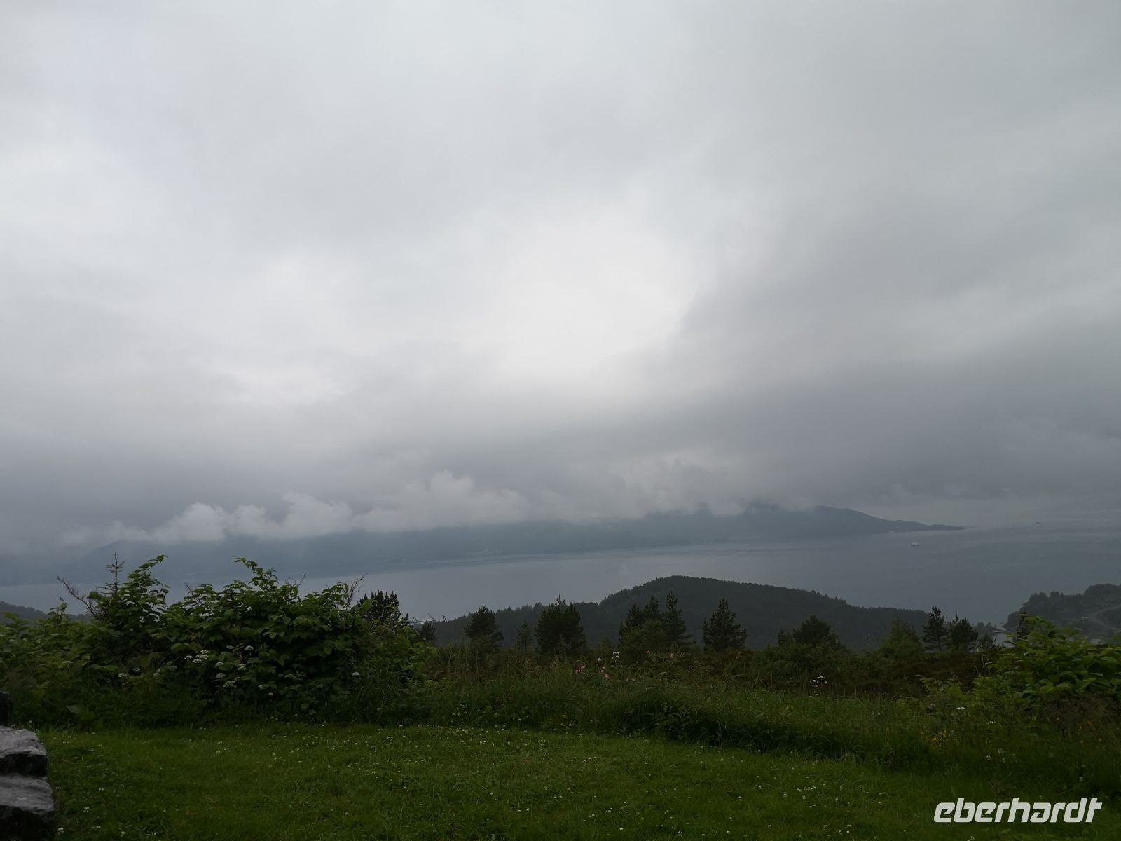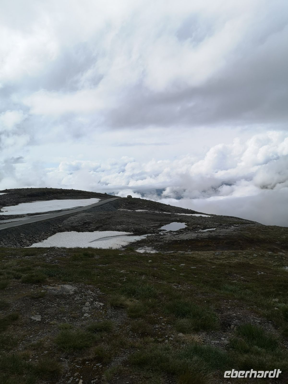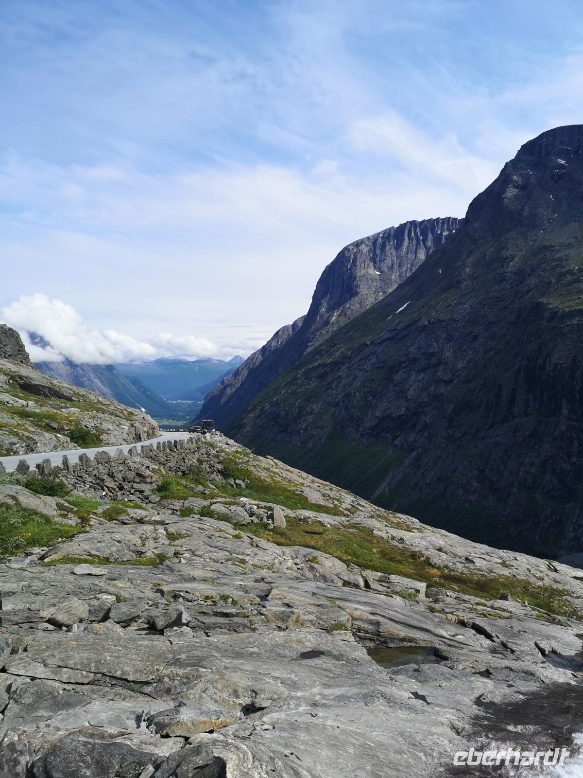 Und wieder die nächsten 11 Haarnadelkurven – diesmal die Trollstigen bergrunter. Die Bergwelt hüllte sich teilweise in Nebel, von den 3 Gipfeln König, Königin und Bischof zeigt sich nur der letzte in voller Pracht.